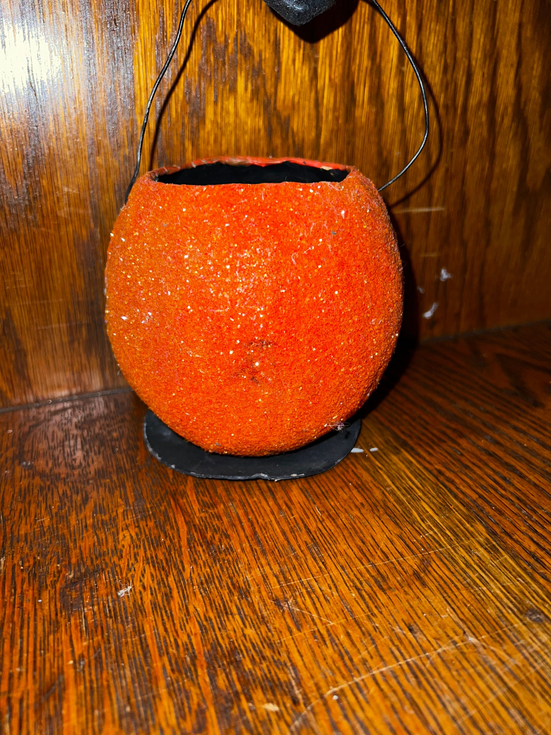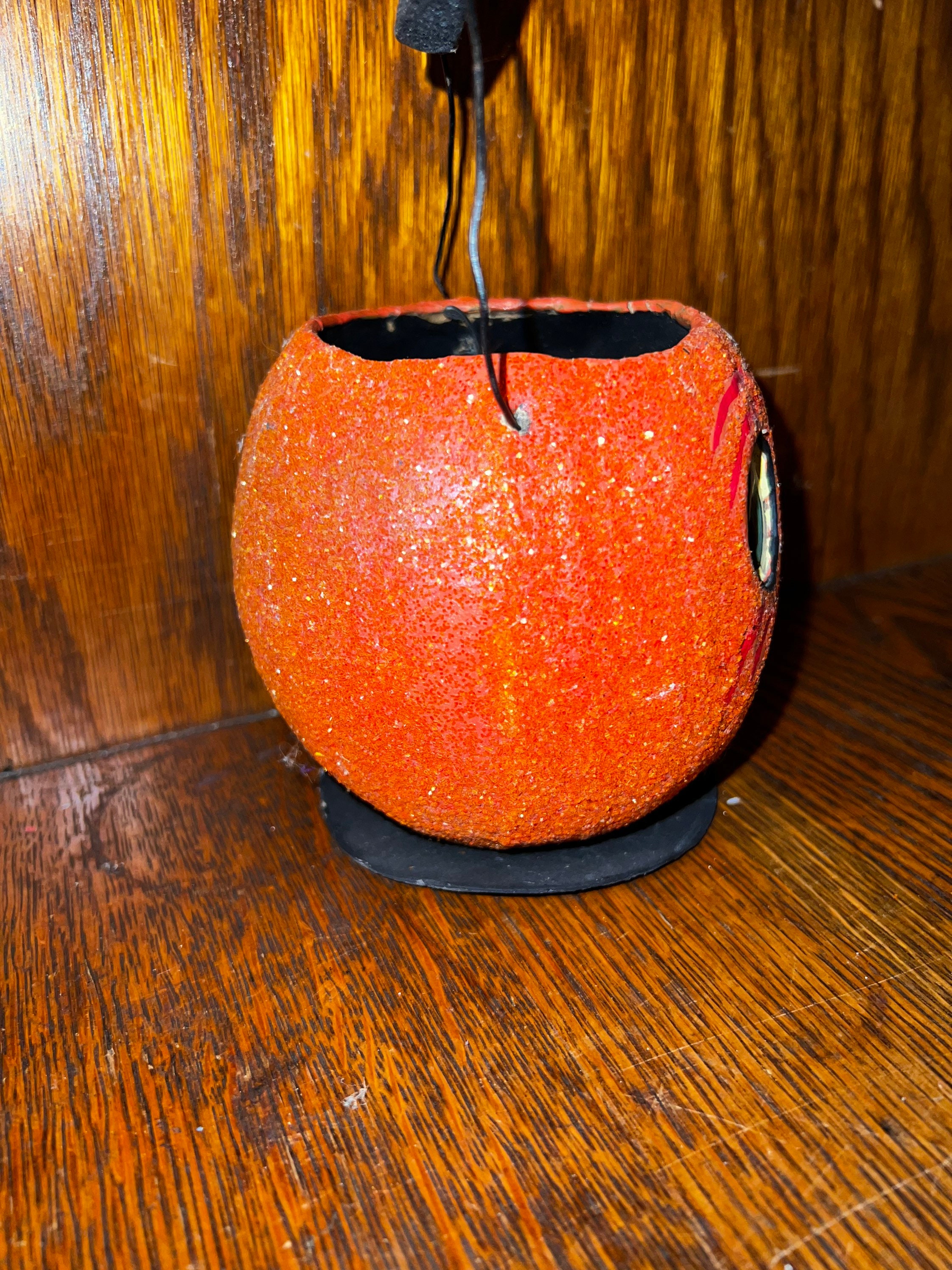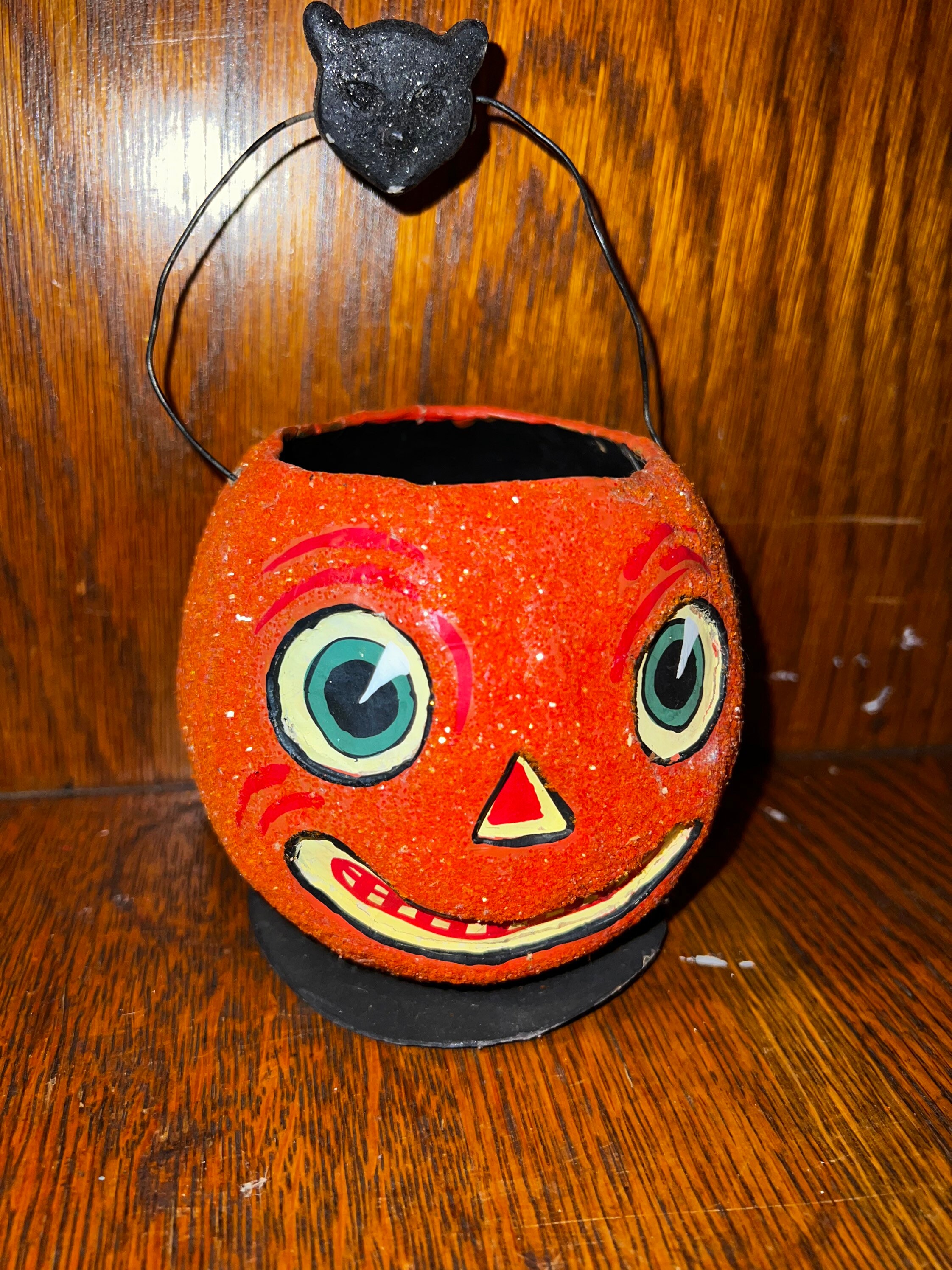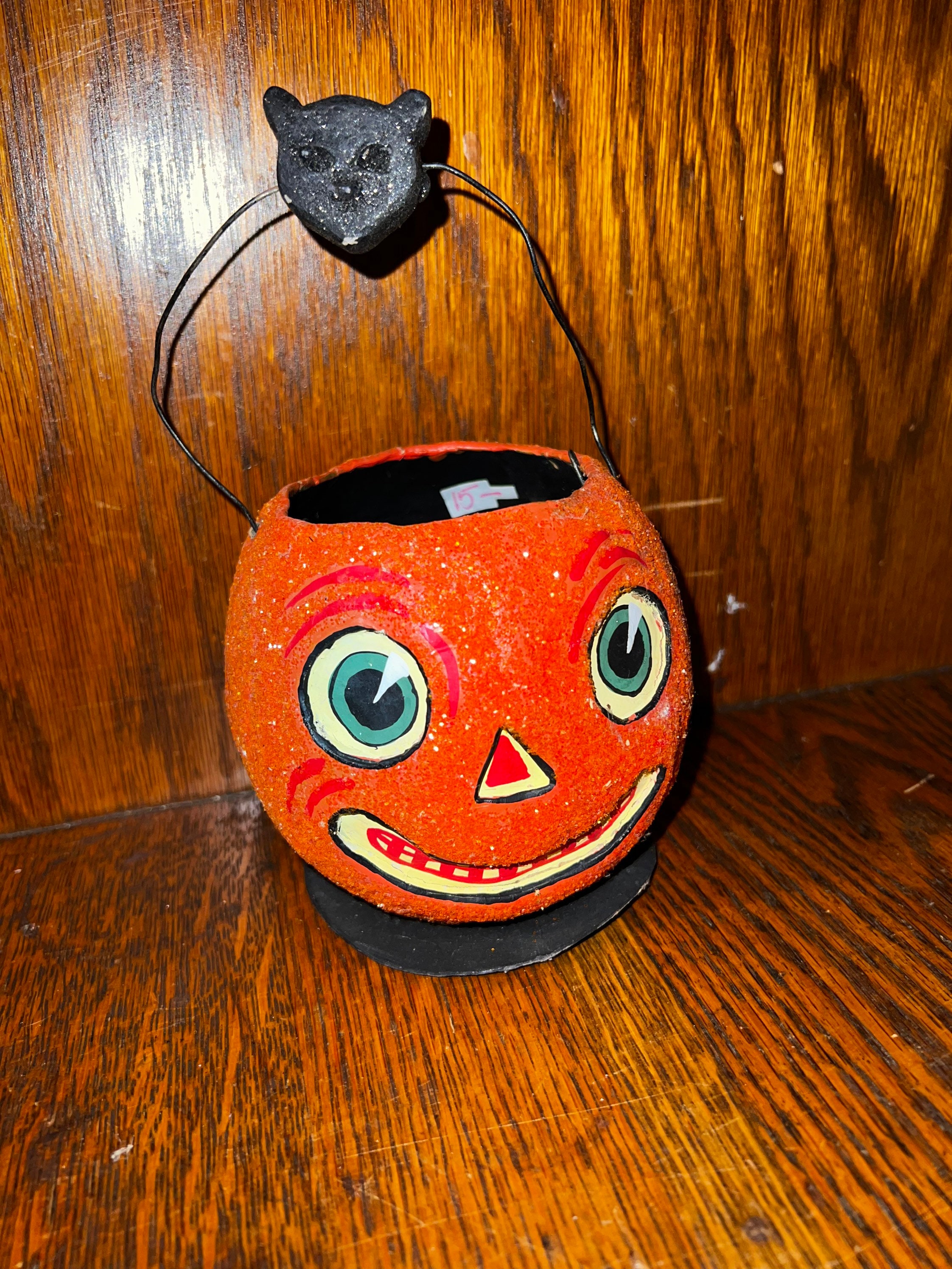 Awesome Jack O Lantern bucket by Dept 56 in the late 90’s or early 2000’s. It’s paper mache and glitter-ized. It’s in good vintage condition with minimal wear and tear. candle.