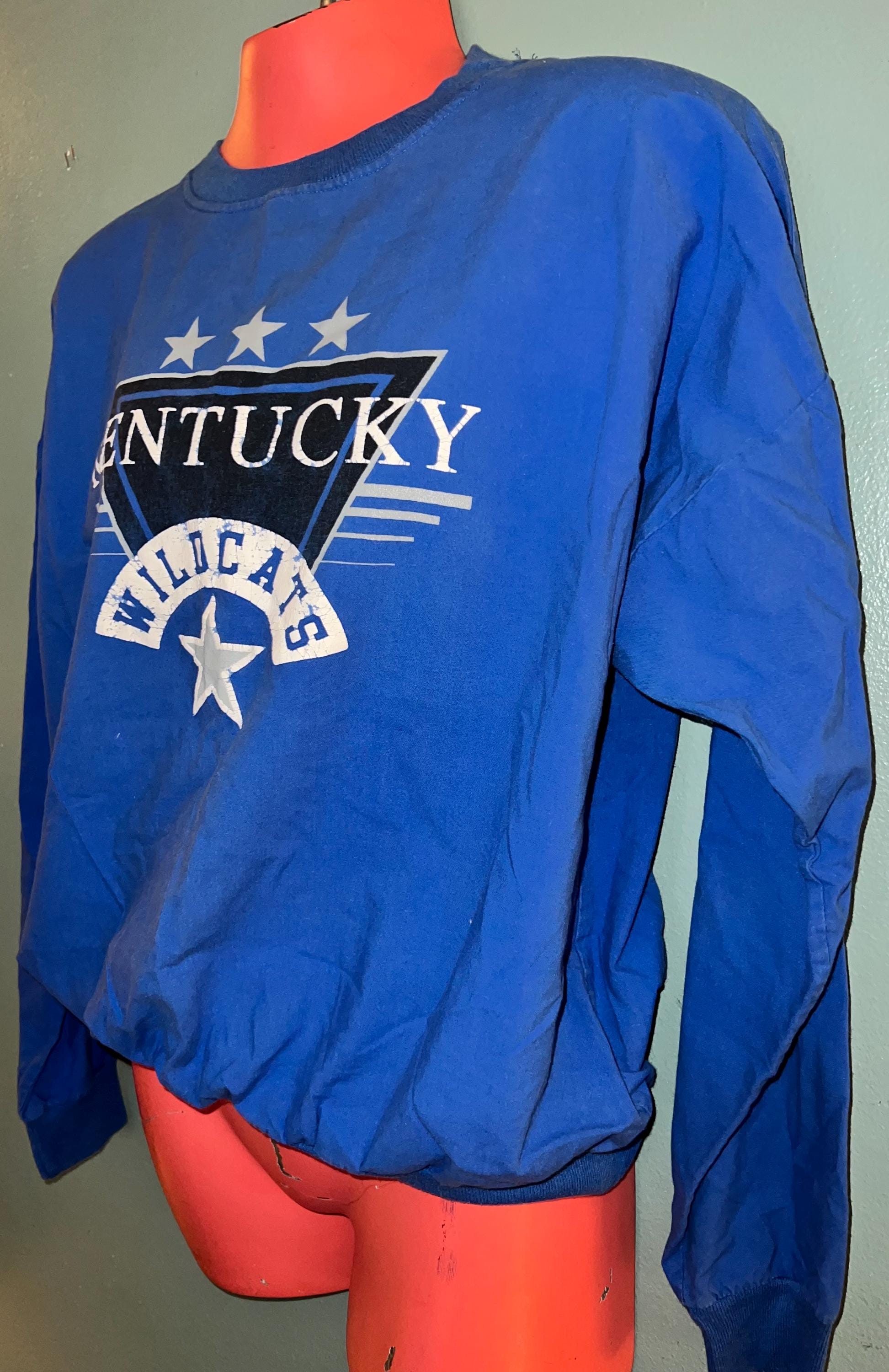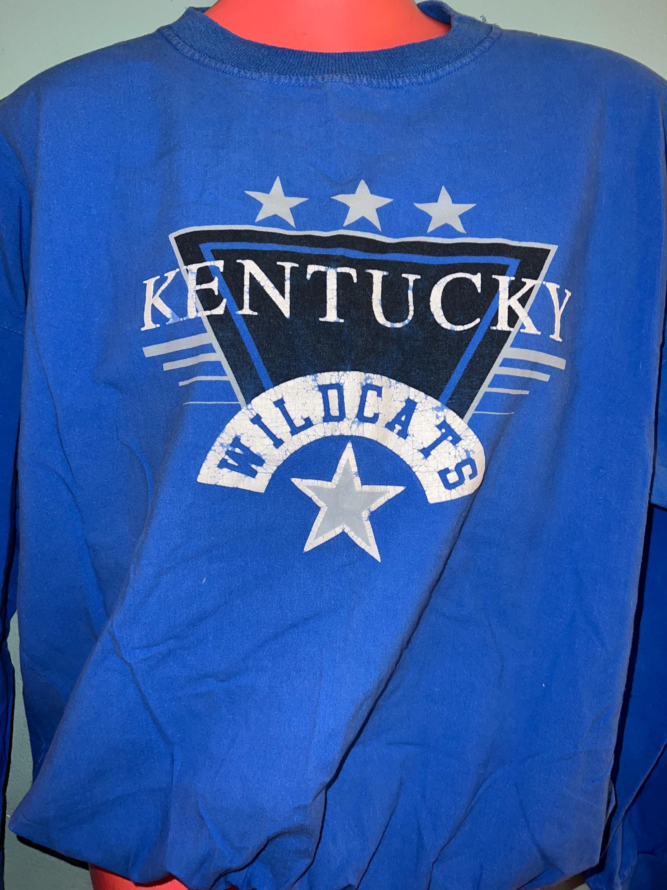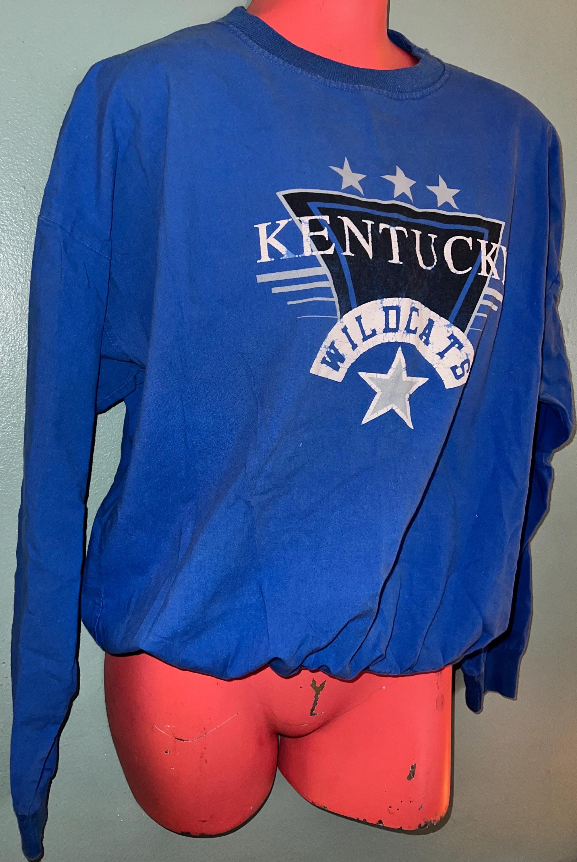 This is a nice 90’s Kentucky Wildcats Sweatshirt! This isn’t a thick sweatshirt, it’s super thin like a button down shirt. The vinyl is worn in places, (see detail in 2nd photo). It’s otherwise in good vintage condition.