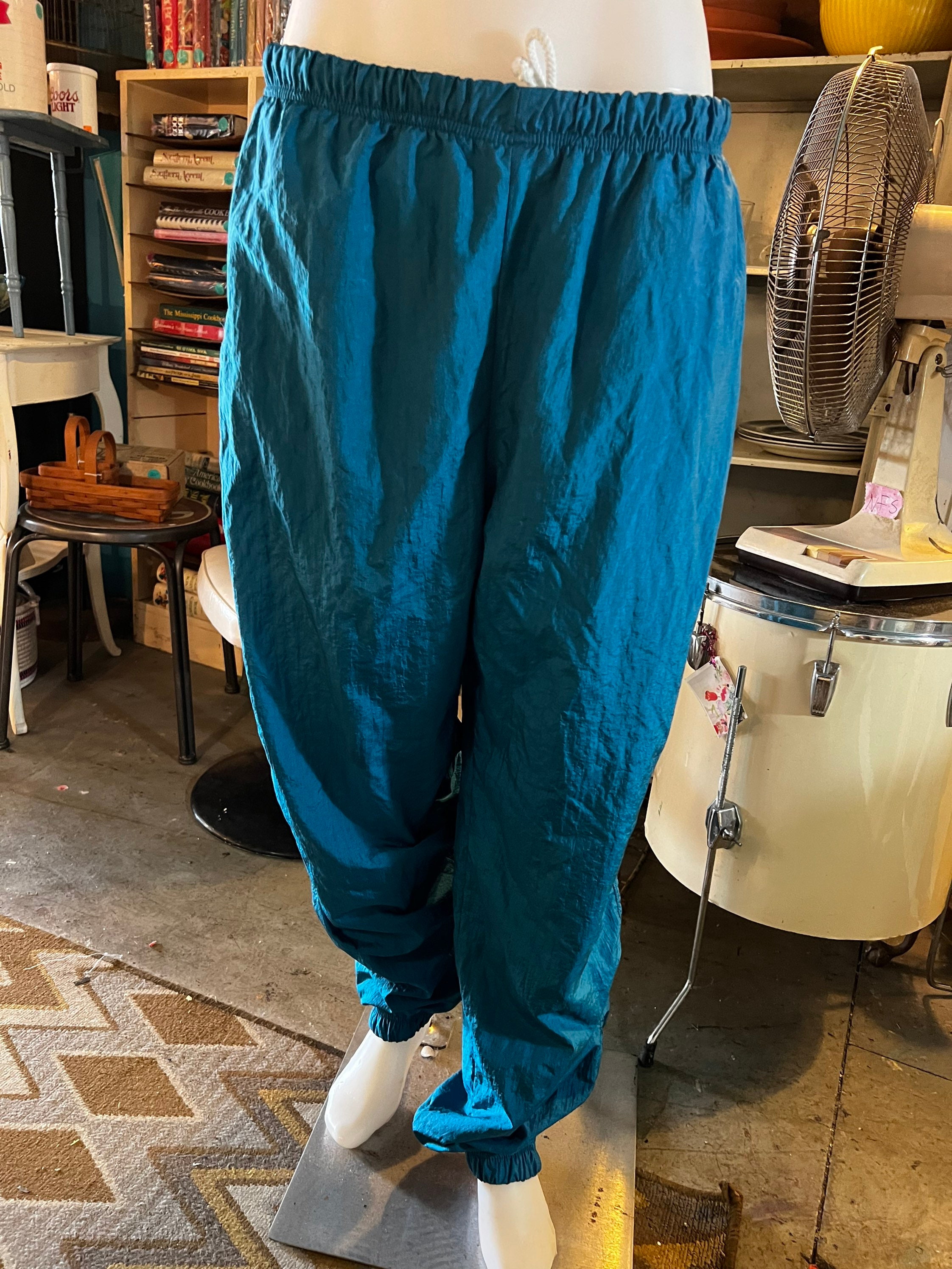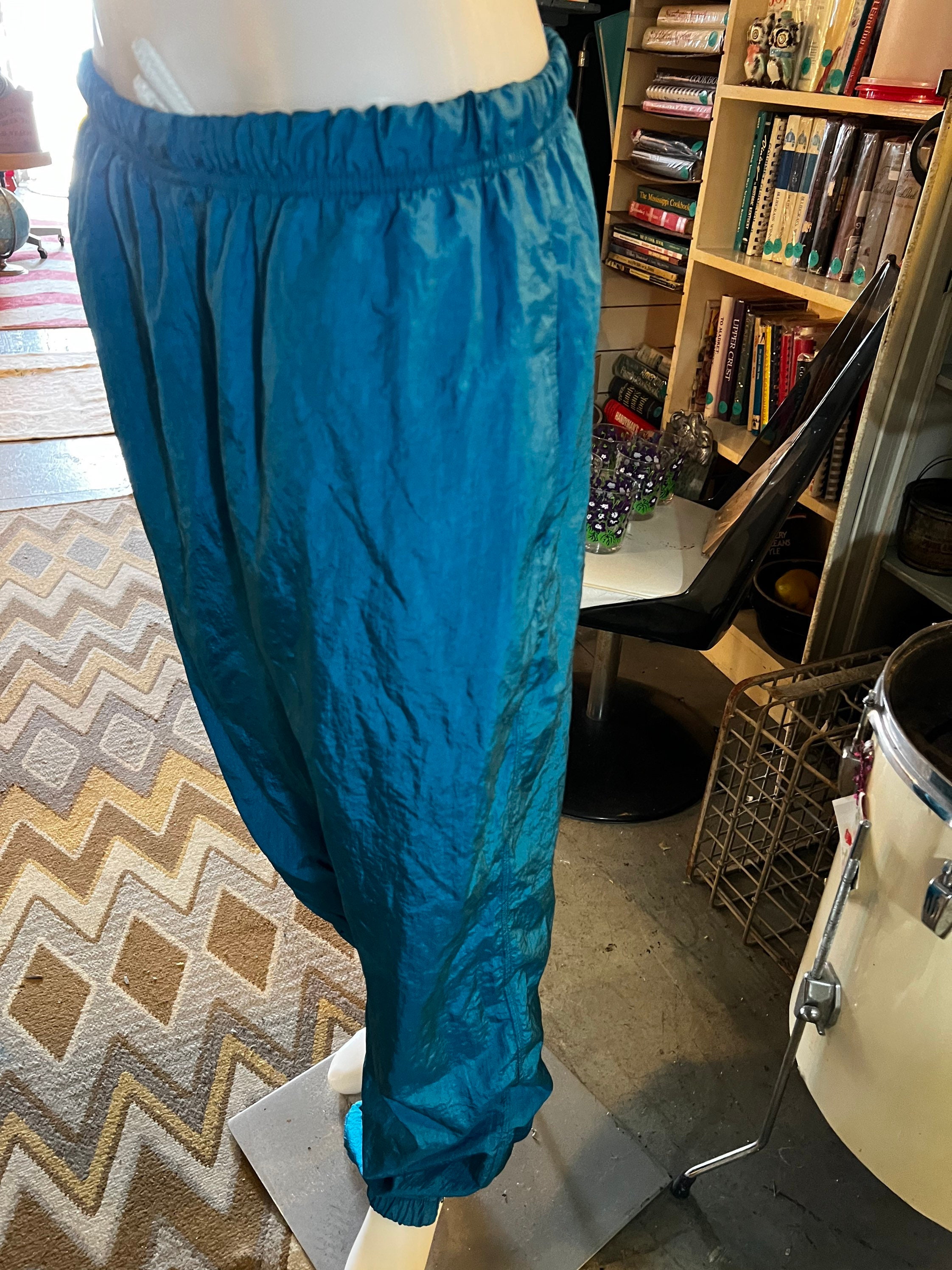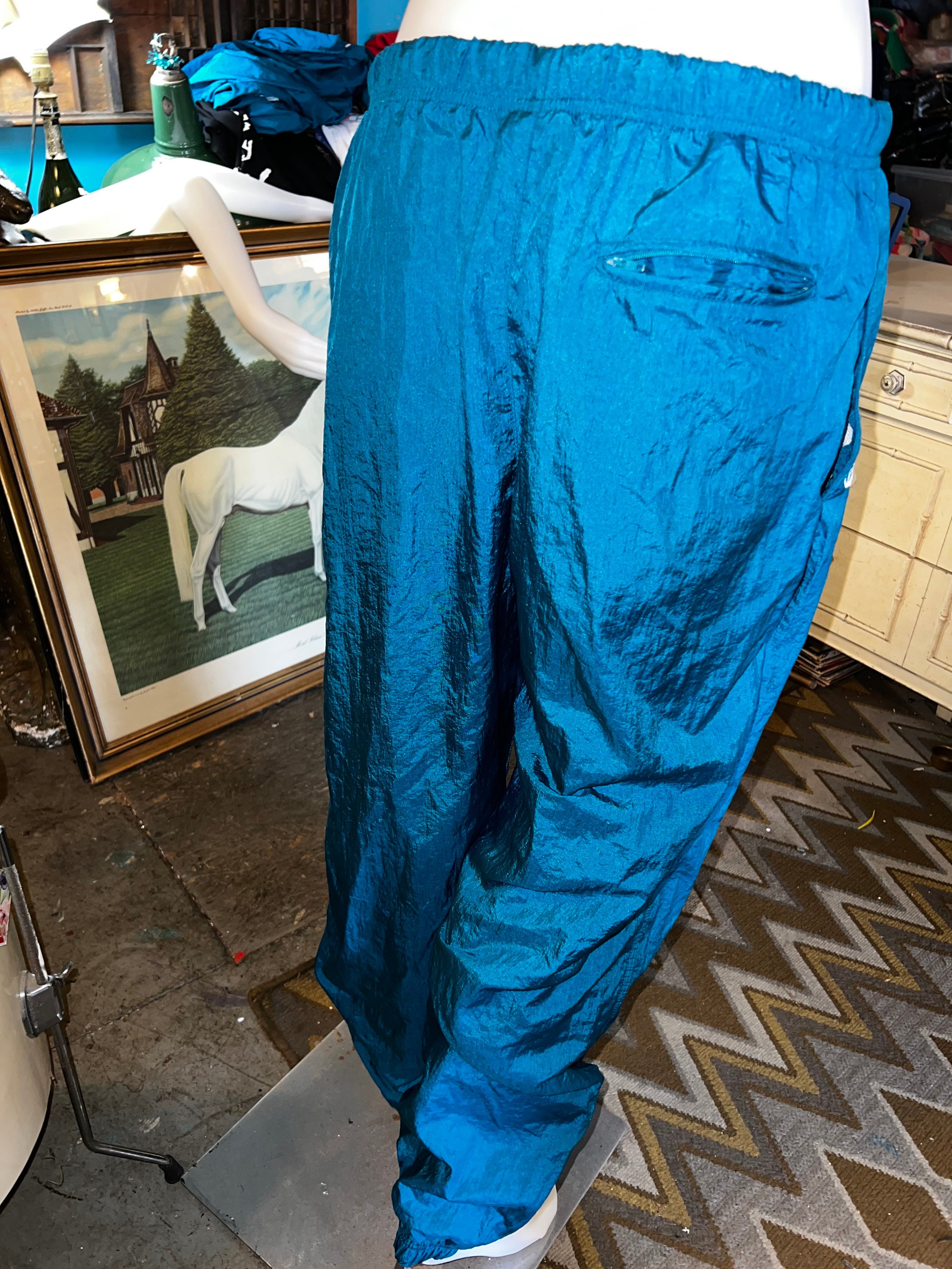 This is a very cool tracksuit! It has all teal green/blue pants with a matching jacket with a cool teal, purple, and white pattern. BUT, the jacket can be reversed and worn as an all teal jacket. They are both lined.It’s super great and perfect for fall! It’s in good vintage condition.