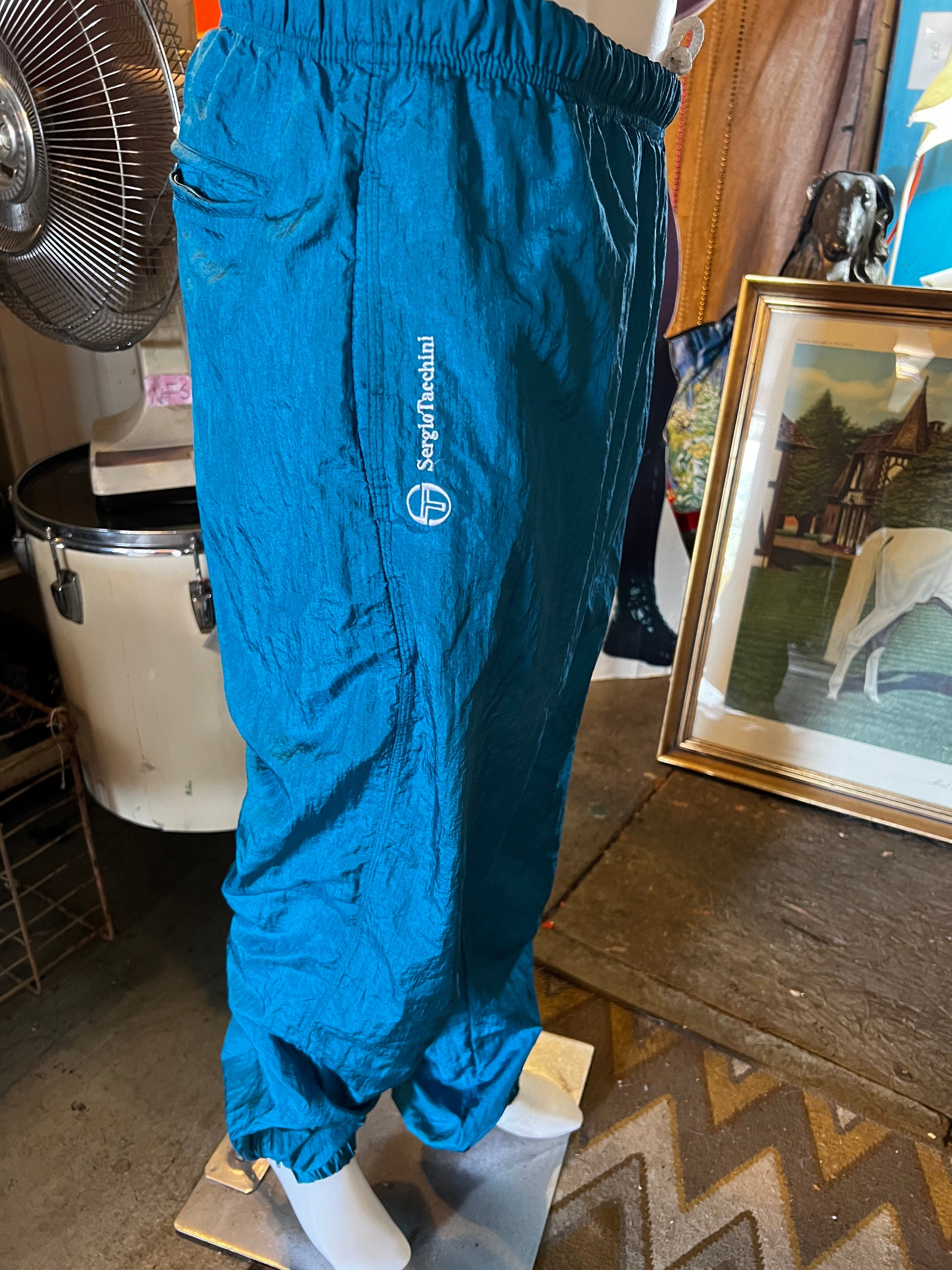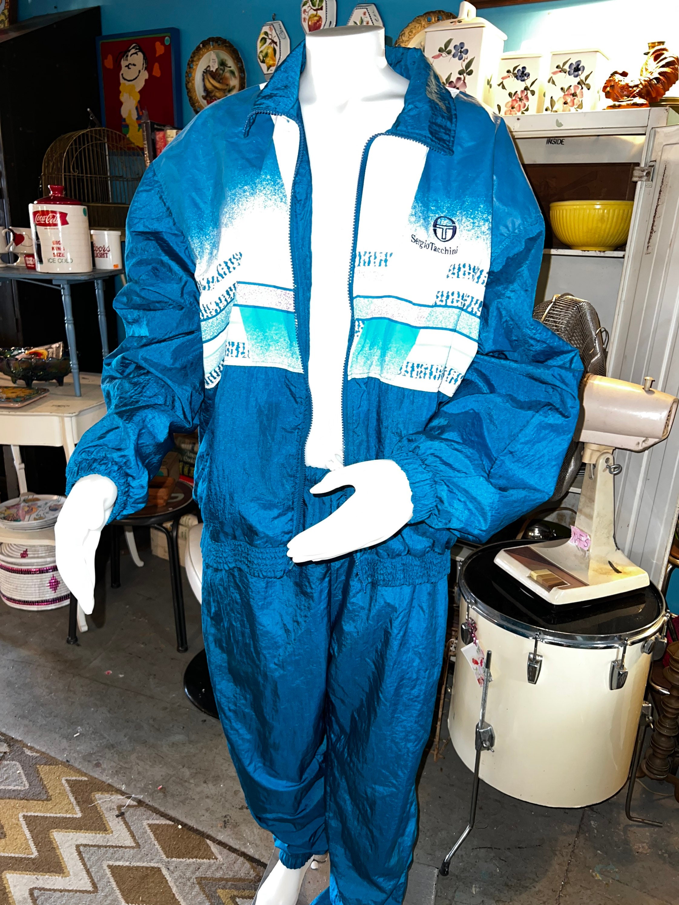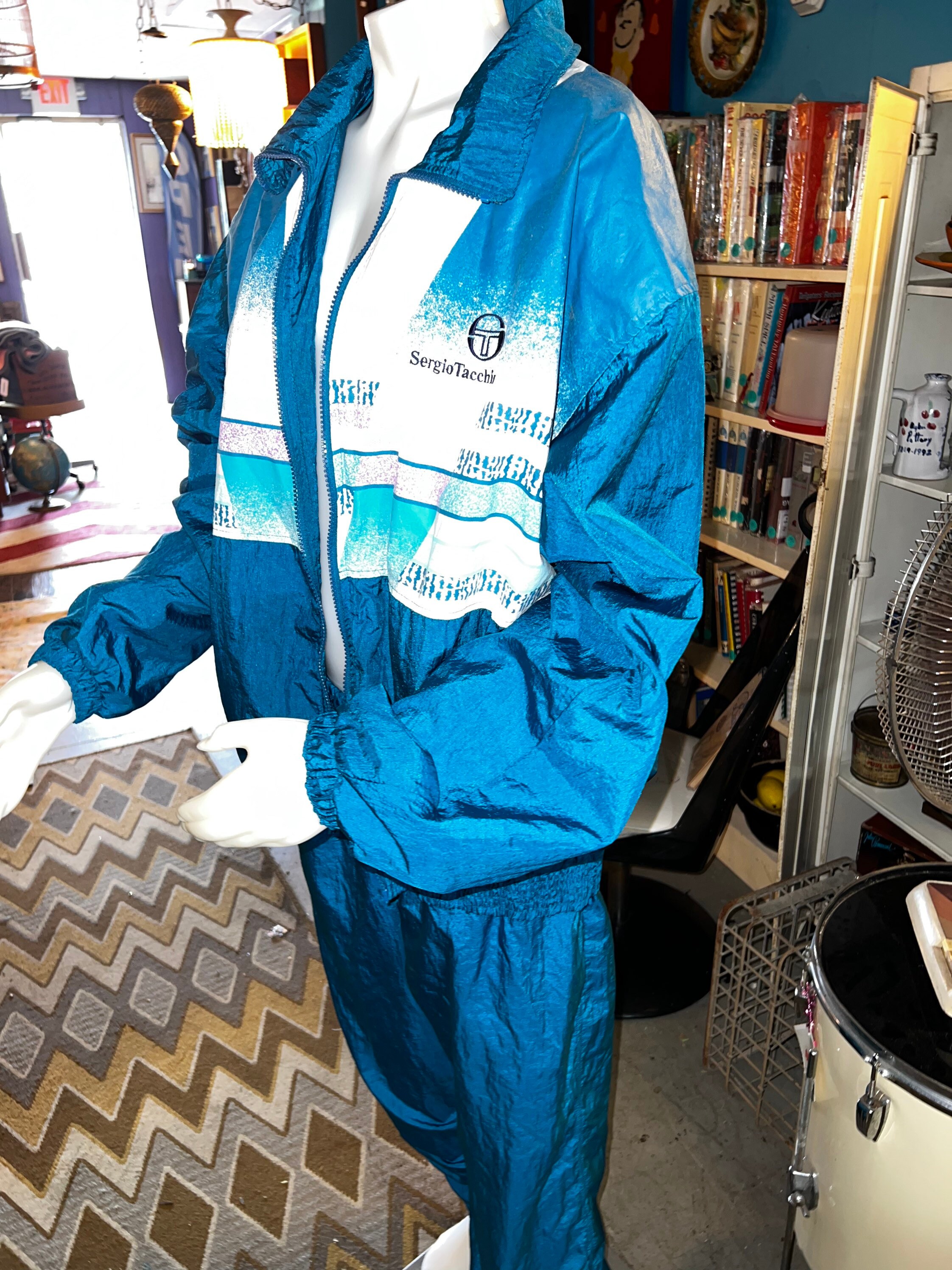This is a very cool tracksuit! It has all teal green/blue pants with a matching jacket with a cool teal, purple, and white pattern. BUT, the jacket can be reversed and worn as an all teal jacket. They are both lined.It’s super great and perfect for fall! It’s in good vintage condition.