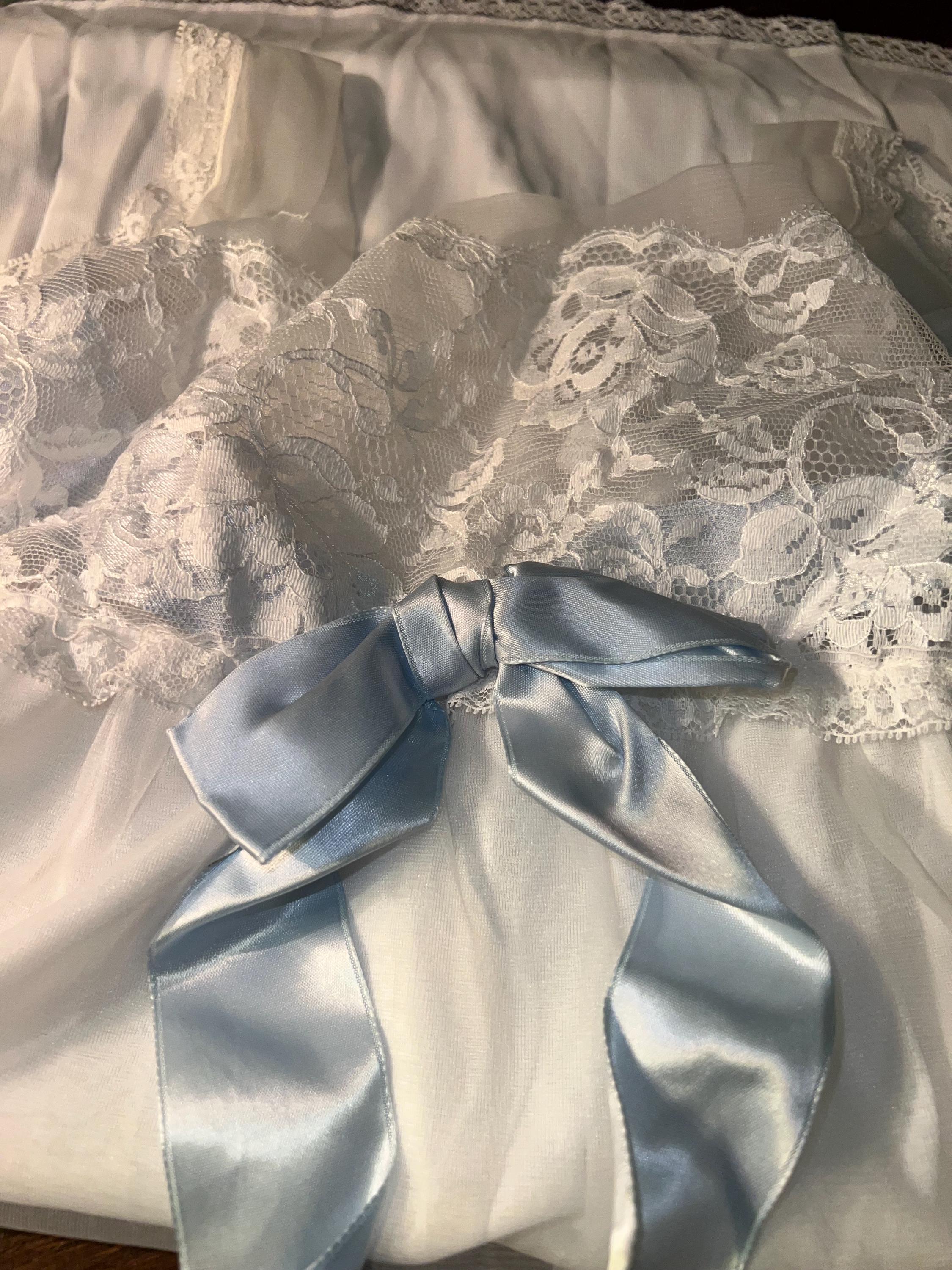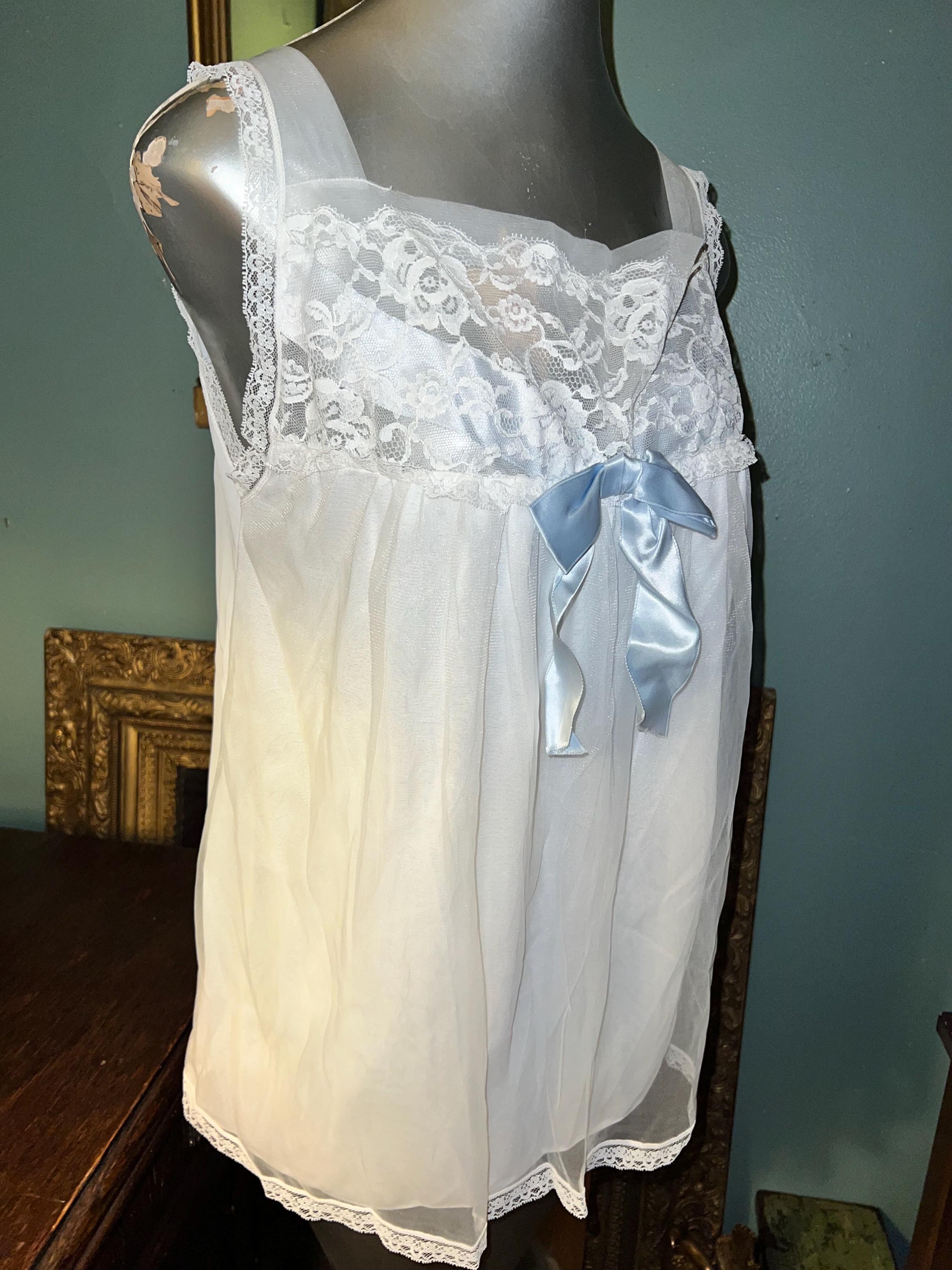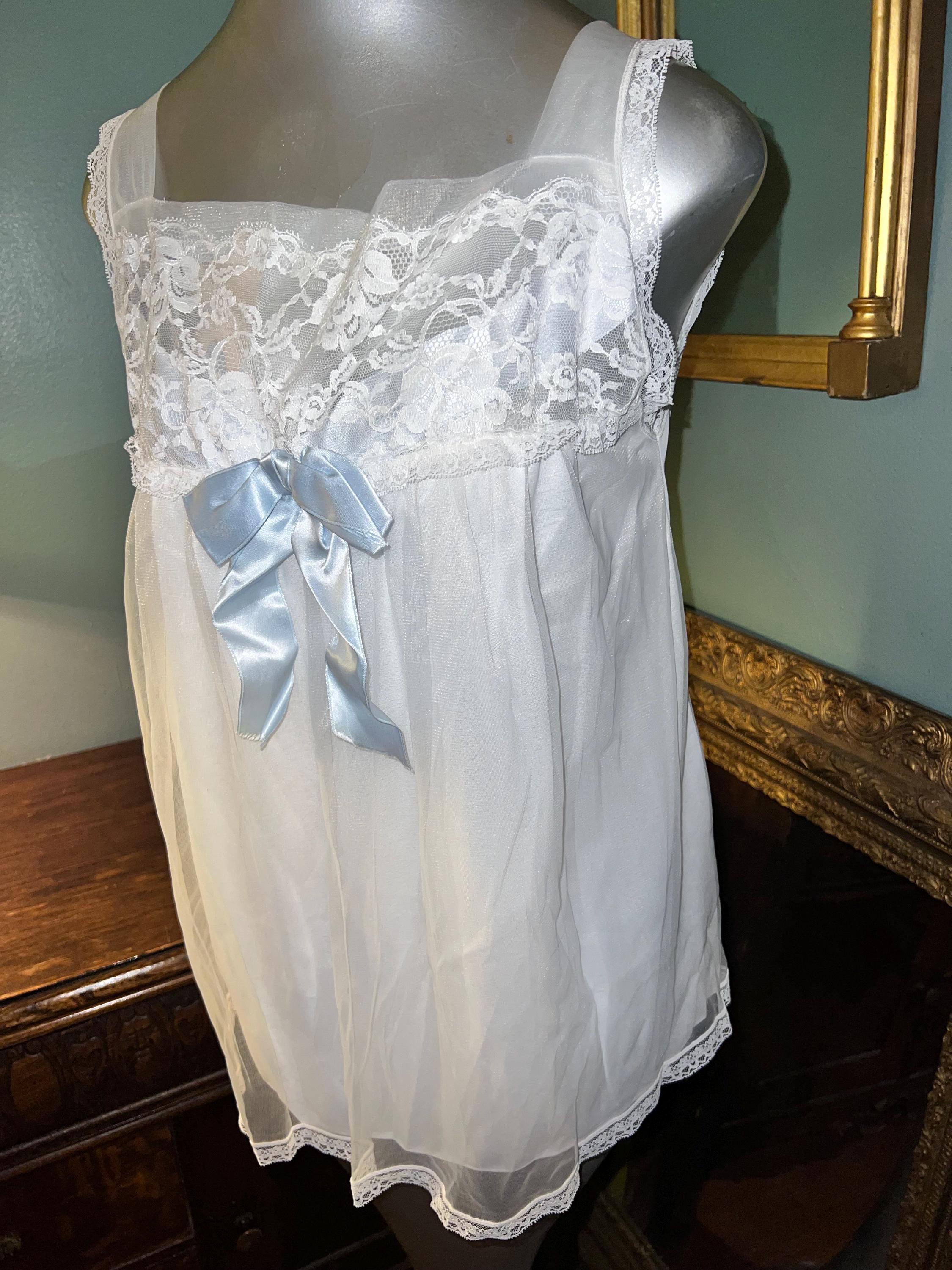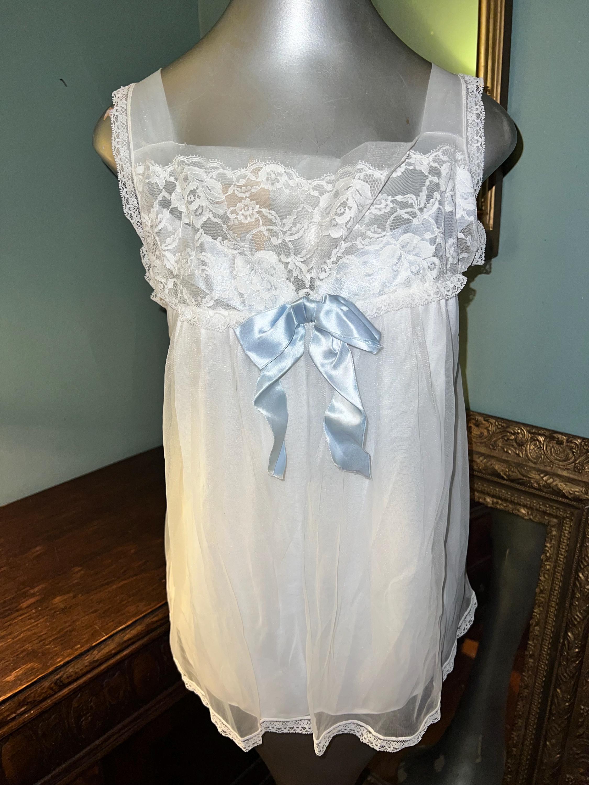 This is a very pretty and quite sexy simple short white with a white gauzy material over top with white lace bodice and edging with a thick baby blue ribbon. Very very cute. It’s in good vintage condition.