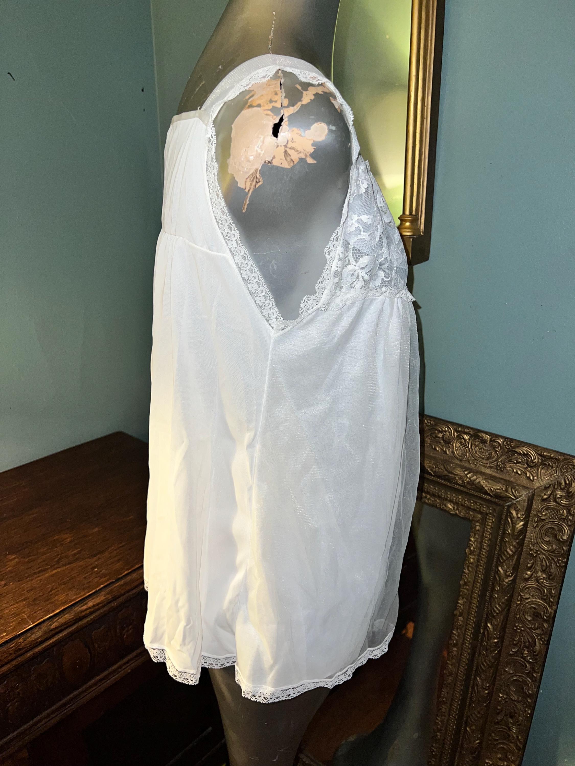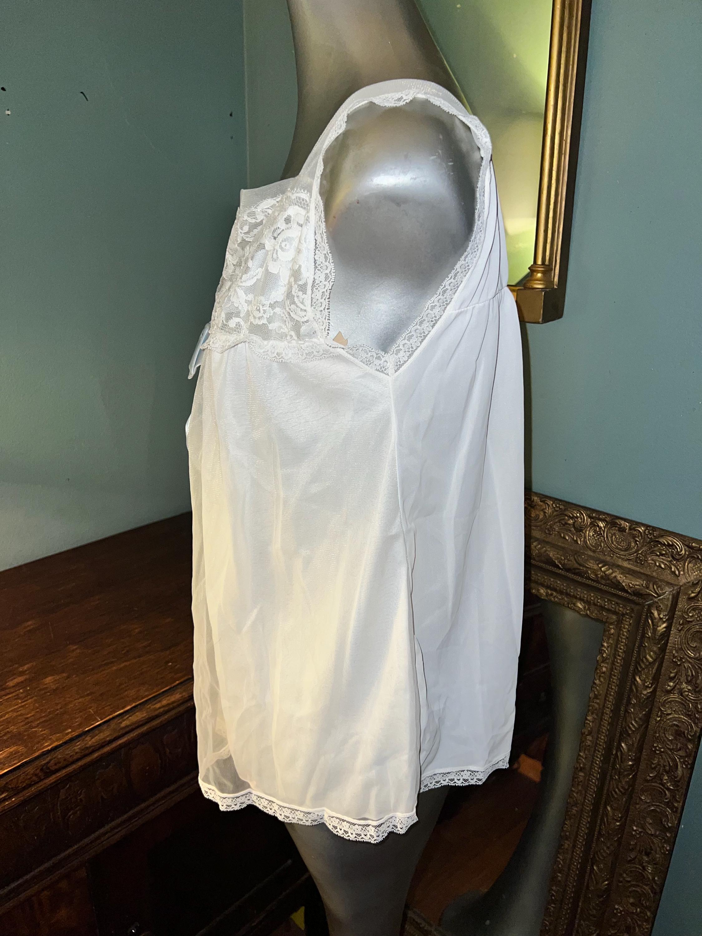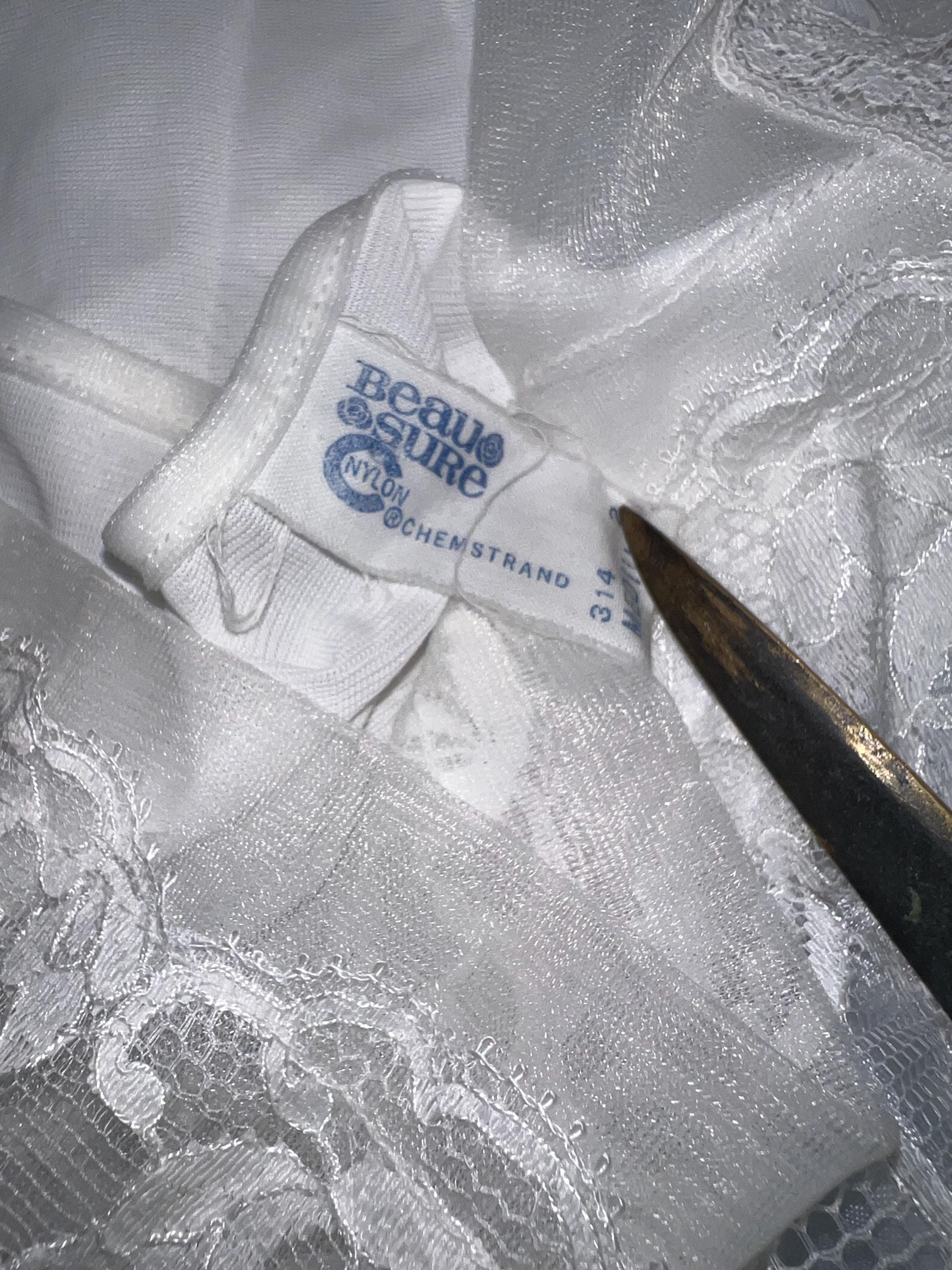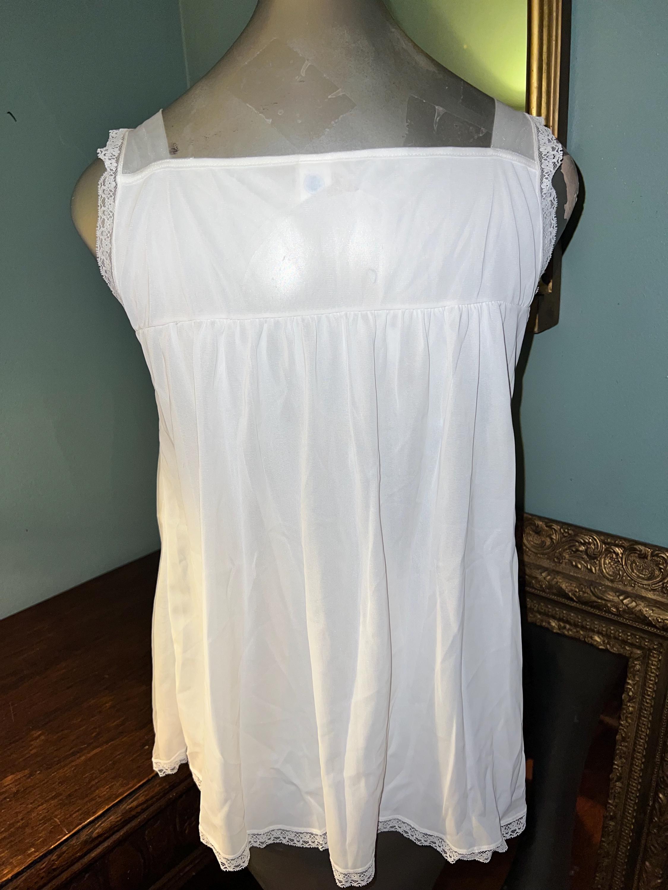 This is a very pretty and quite sexy simple short white with a white gauzy material over top with white lace bodice and edging with a thick baby blue ribbon. Very very cute. It’s in good vintage condition.