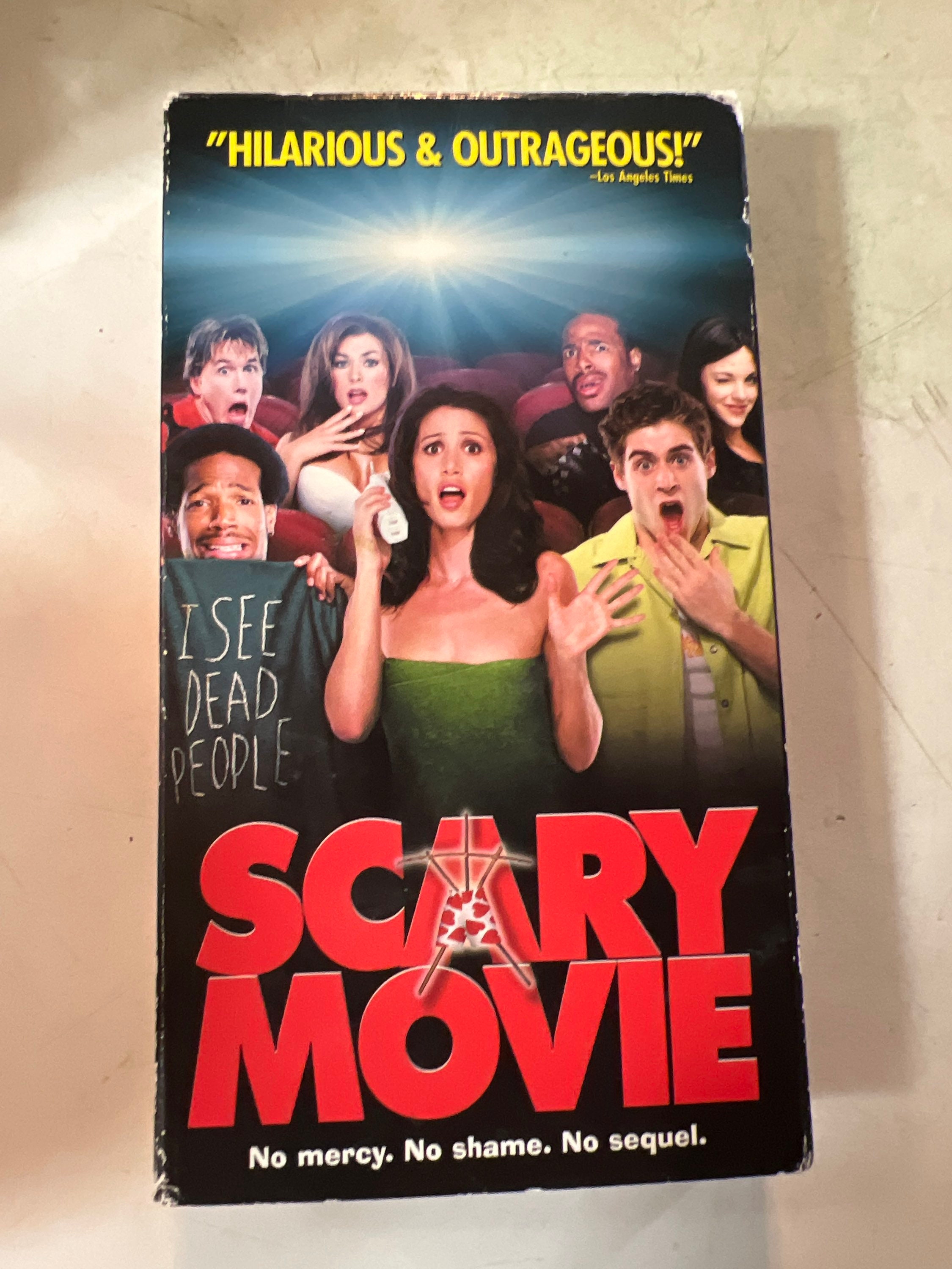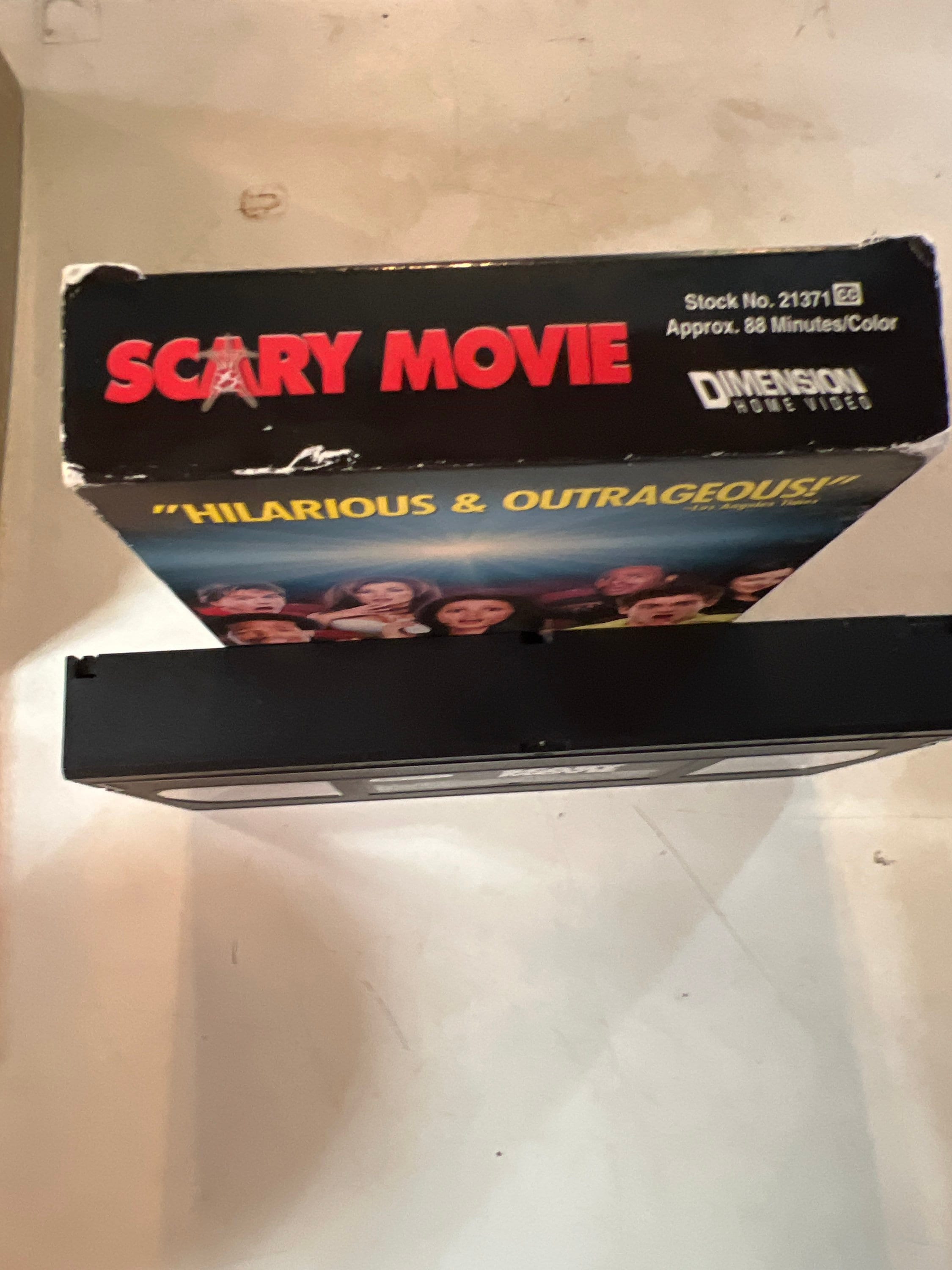 This is the movie, Scary Movie on VHS. It’s an excellent funny movie, The tape has the Hollywood Video sticker on it so I’m guessing it’s been okayed a lot but it still works good! The case shows some wear and tear, (see photos) but otherwise it’s in good vintage condition.