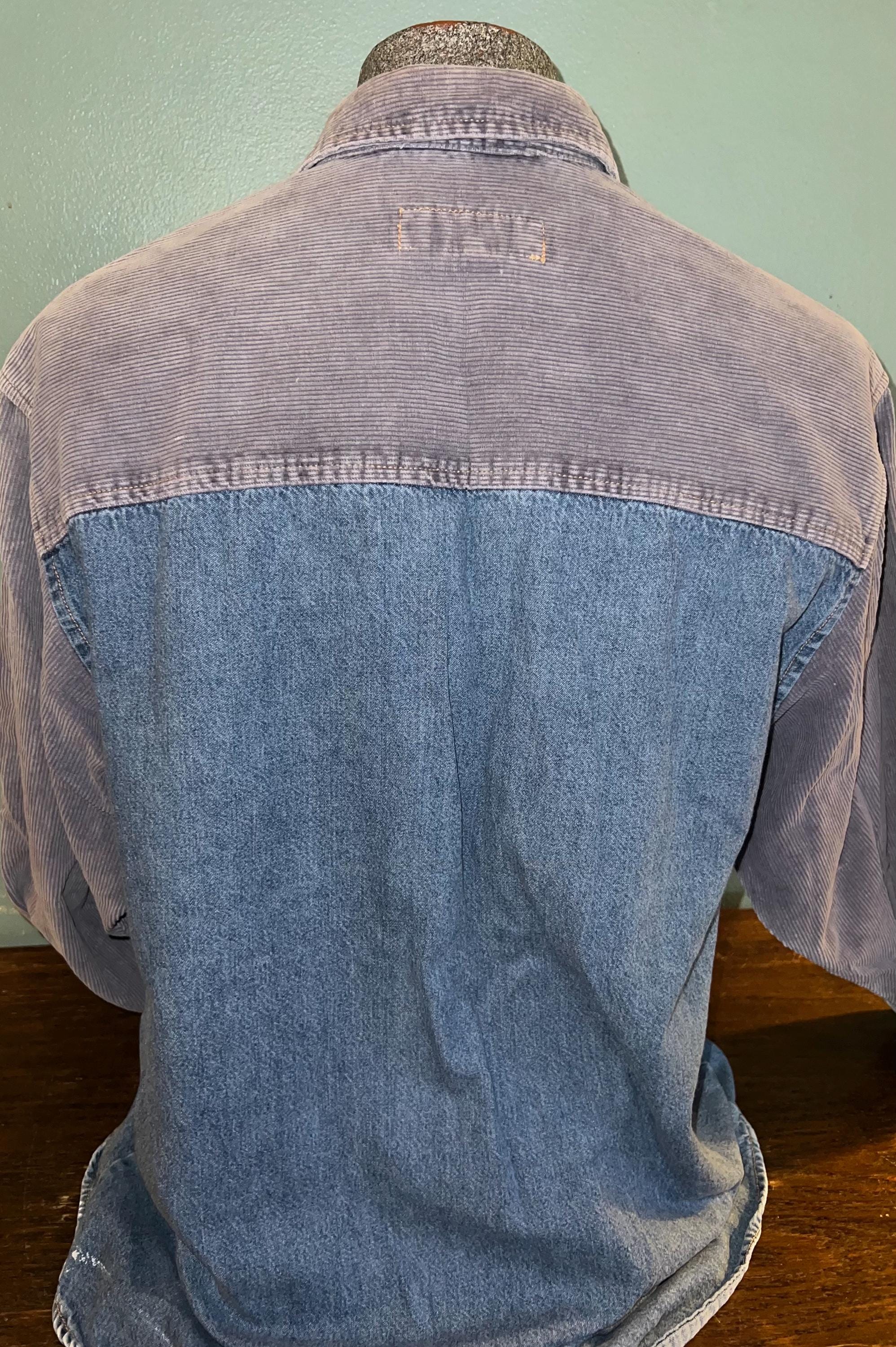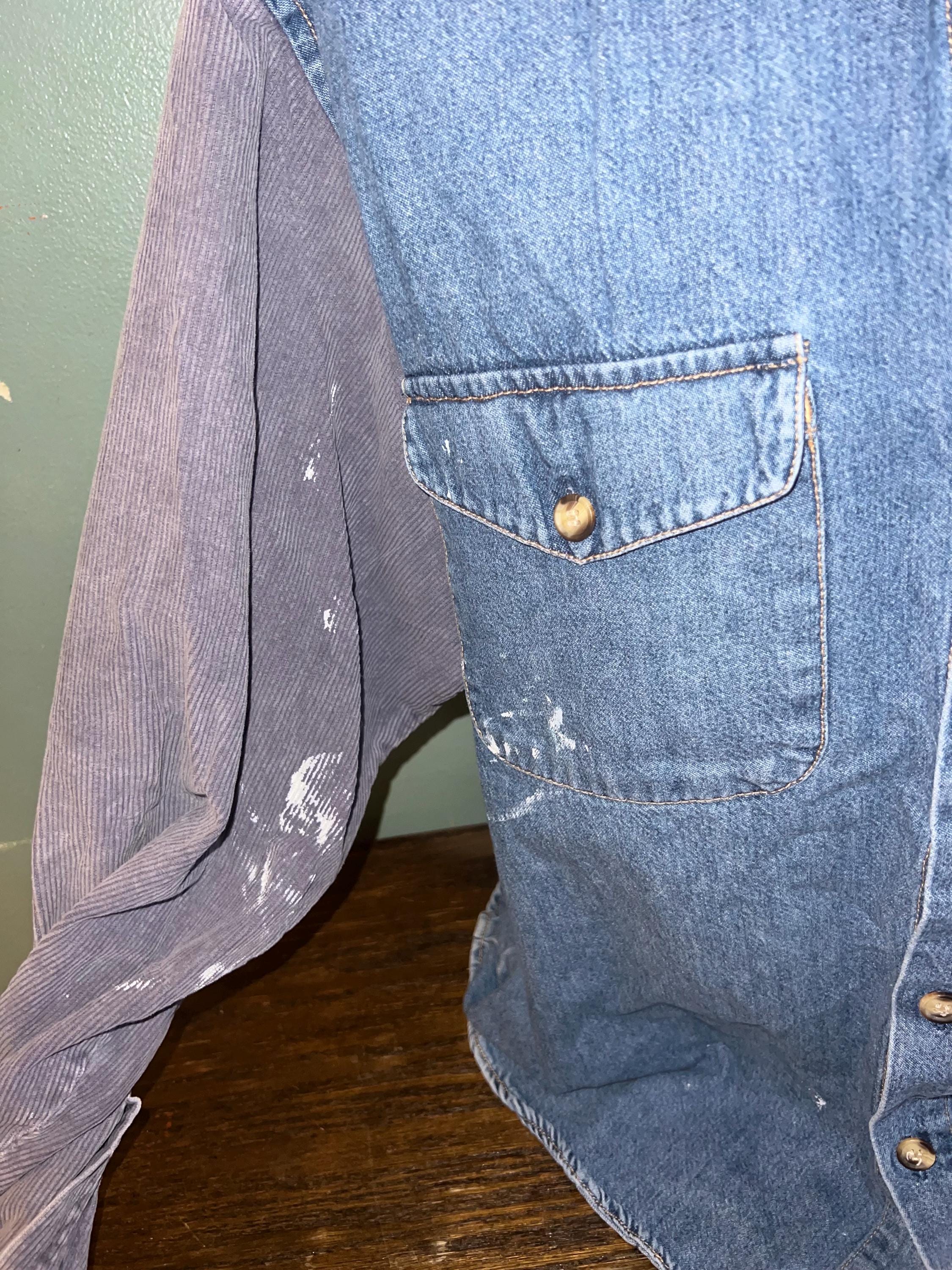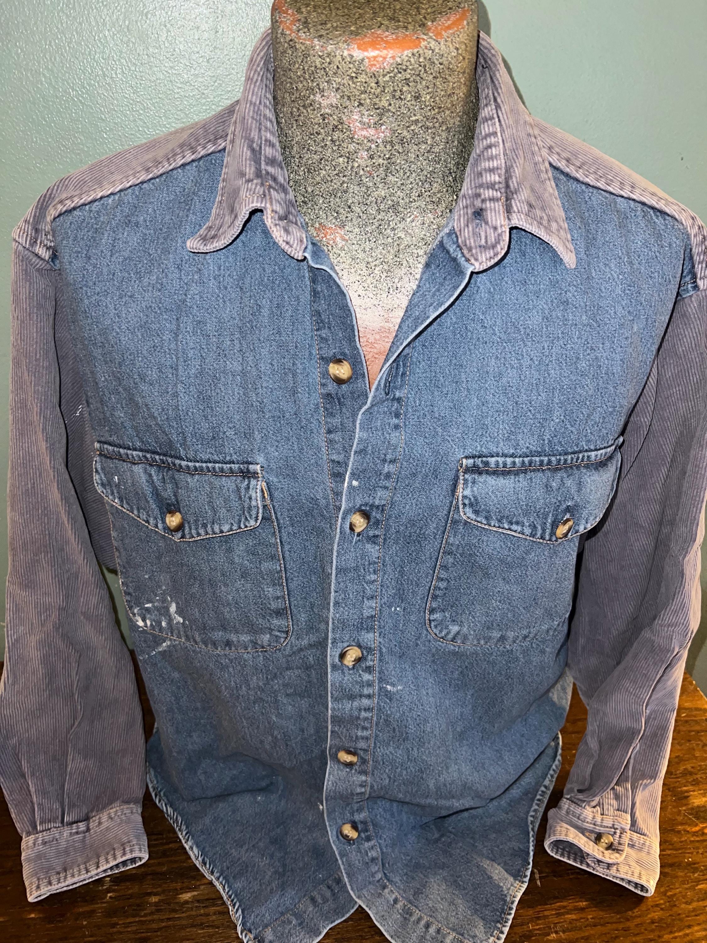 This is a cool “work shirt” from the 90’s by Unionbay. Its distressed with some white paint marks on it. It’s made of blue jean and blue corduroy. It’s faded some and has the paint marks but otherwise its in good vintage condition.