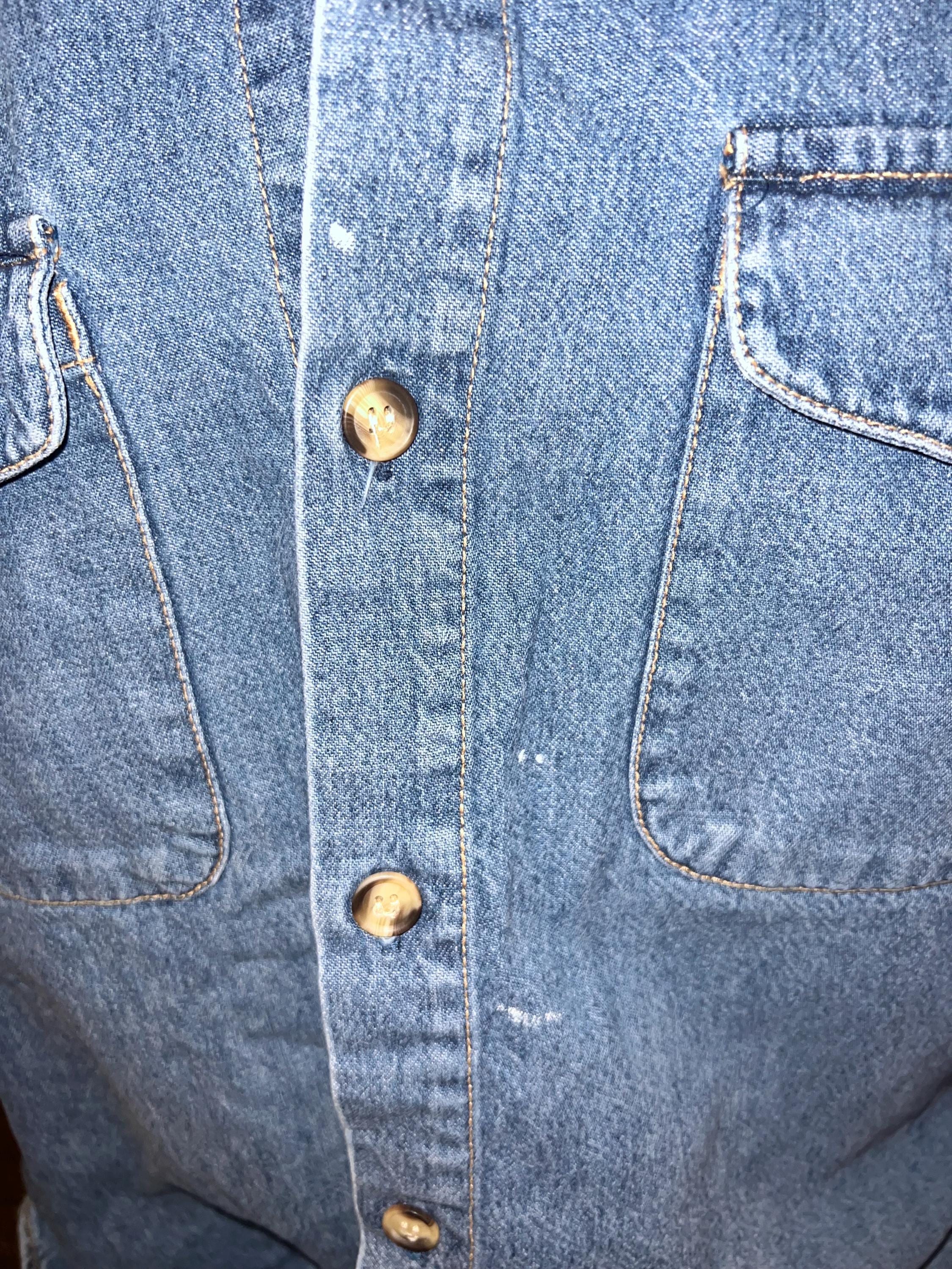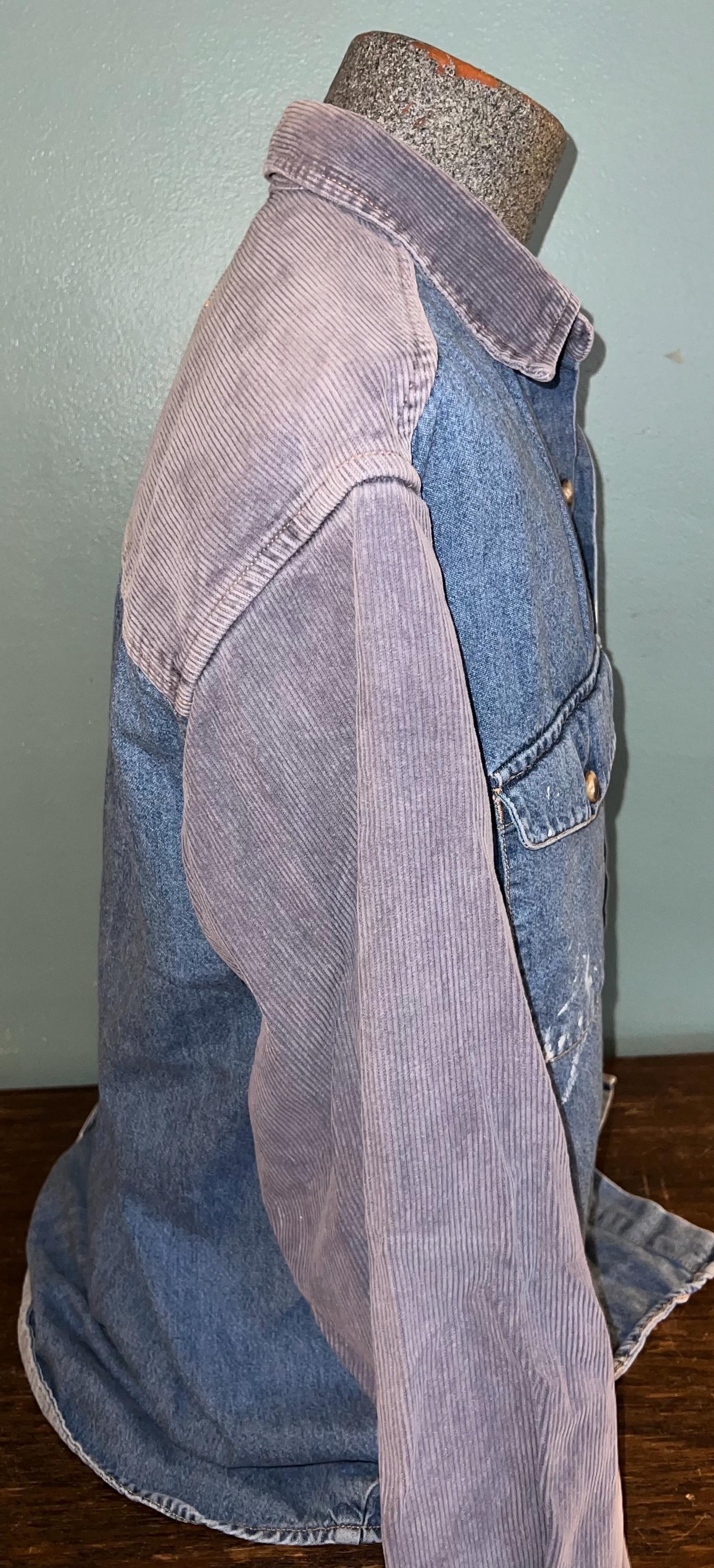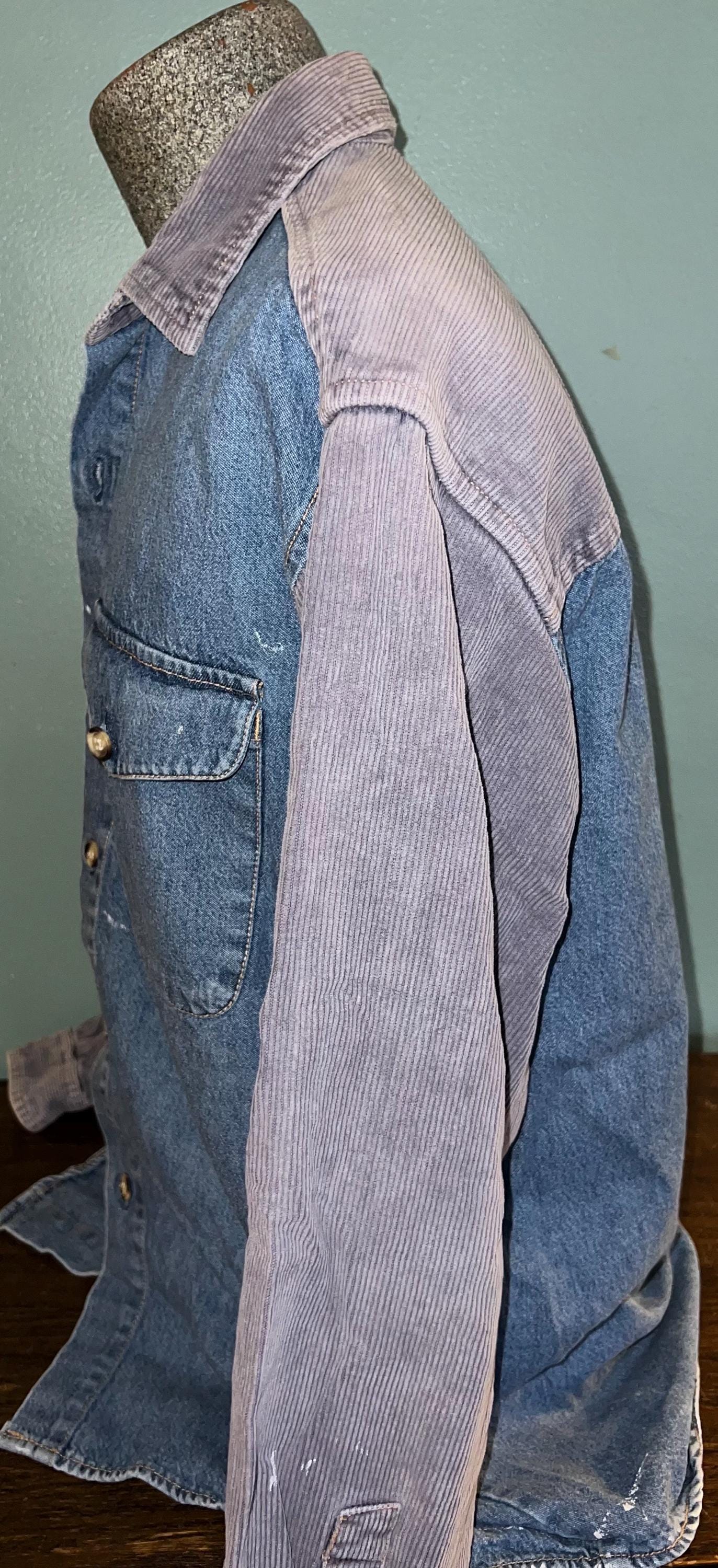 This is a cool “work shirt” from the 90’s by Unionbay. Its distressed with some white paint marks on it. It’s made of blue jean and blue corduroy. It’s faded some and has the paint marks but otherwise its in good vintage condition.