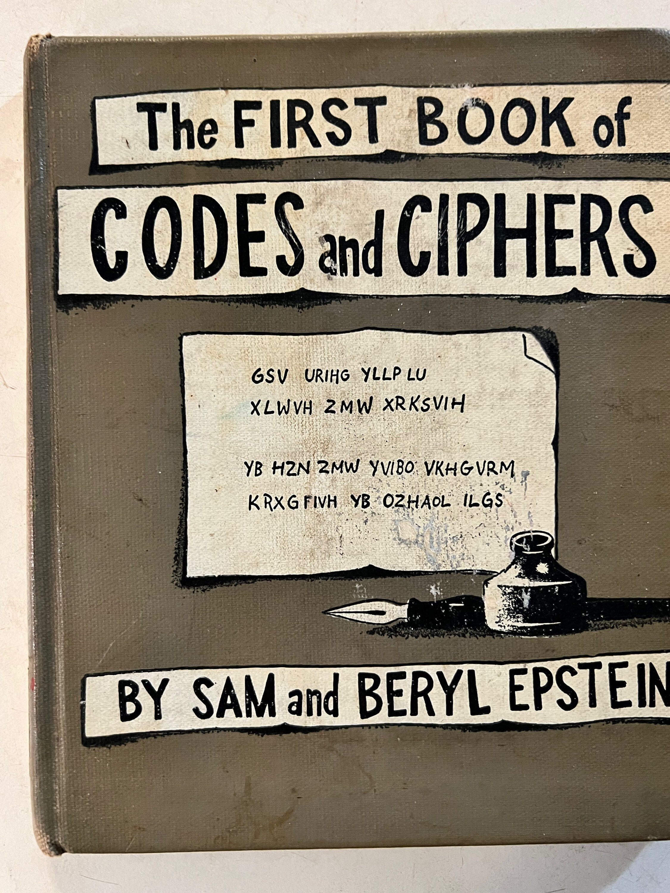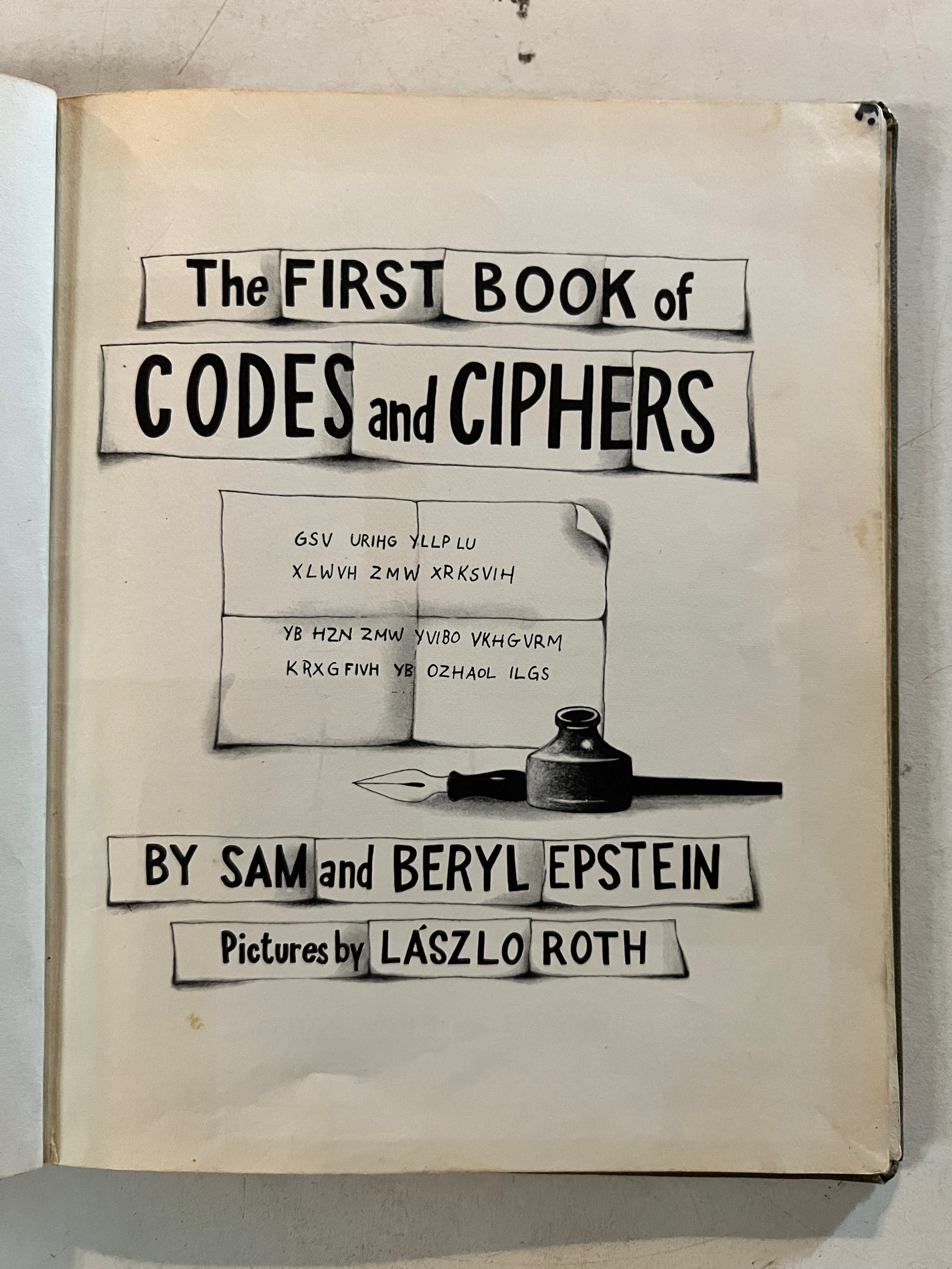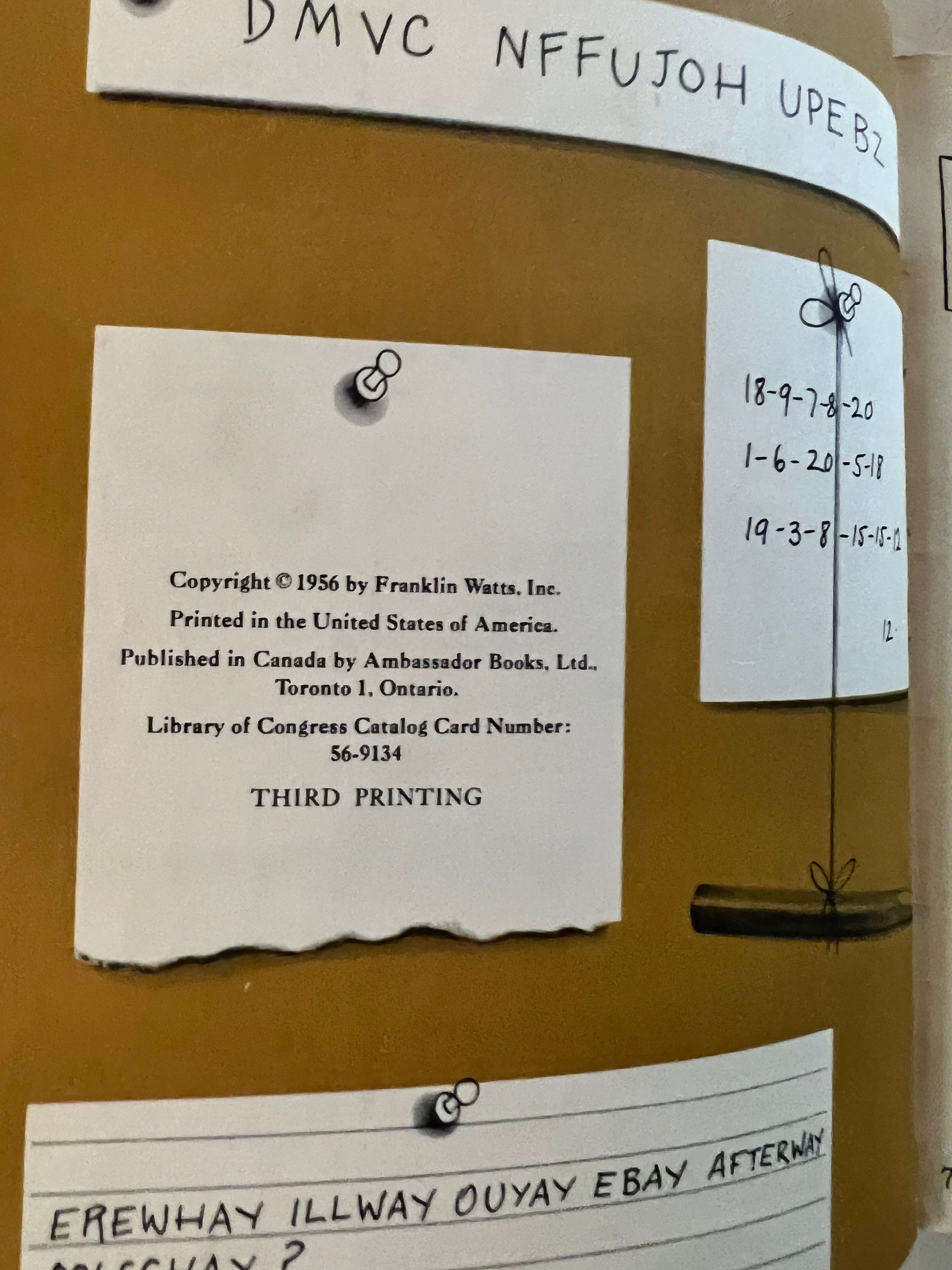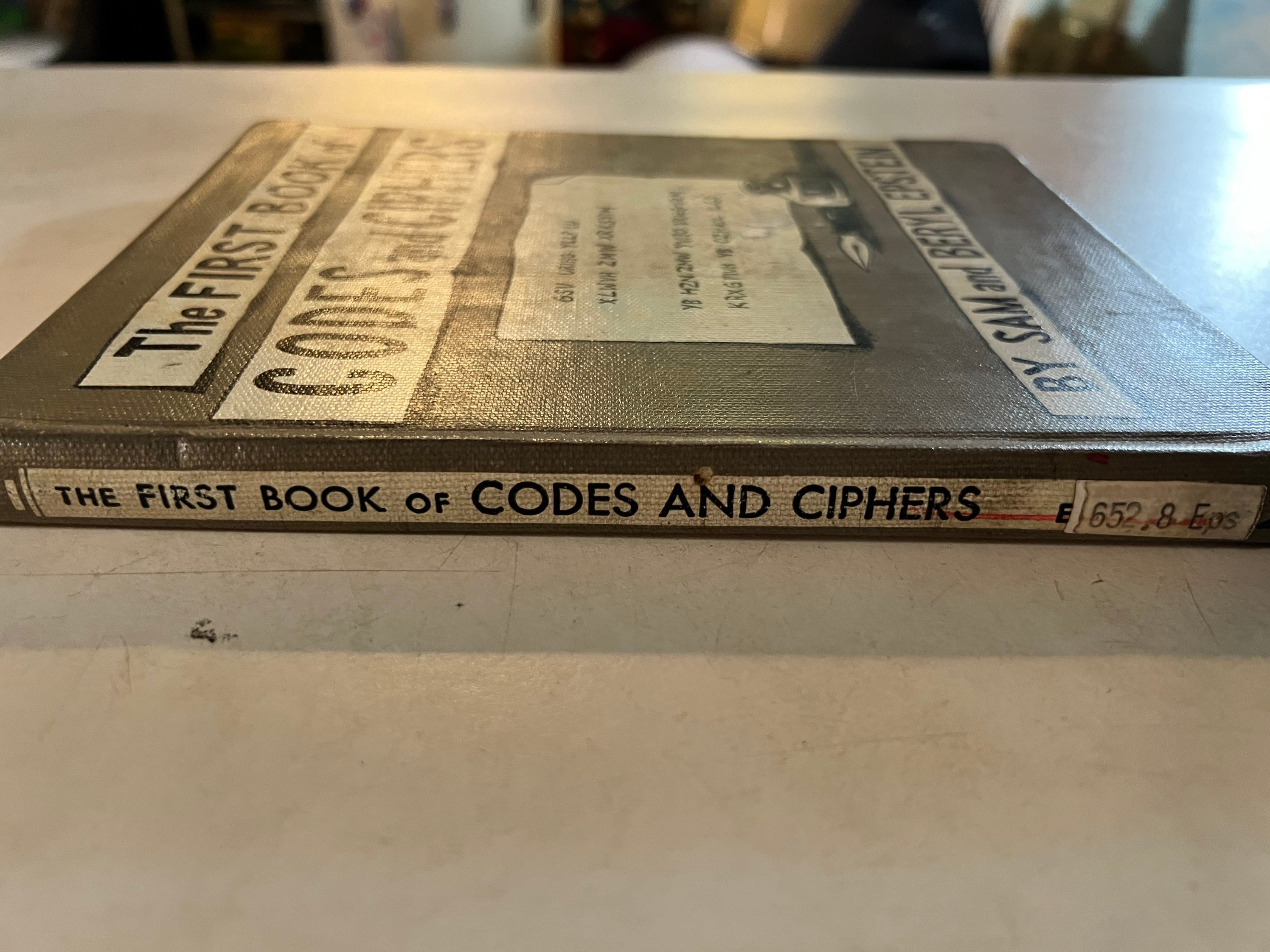 This is a book that has been read ALOT!! It’s called “The First Book of Codes and Ciphers” I can imagine how many children checked this out at the library and were completely fascinated by what they learned from this book. It’s a very well loved book as you can see in the photos, also there was a blank page in the back that got ripped out, I taped that edge down.