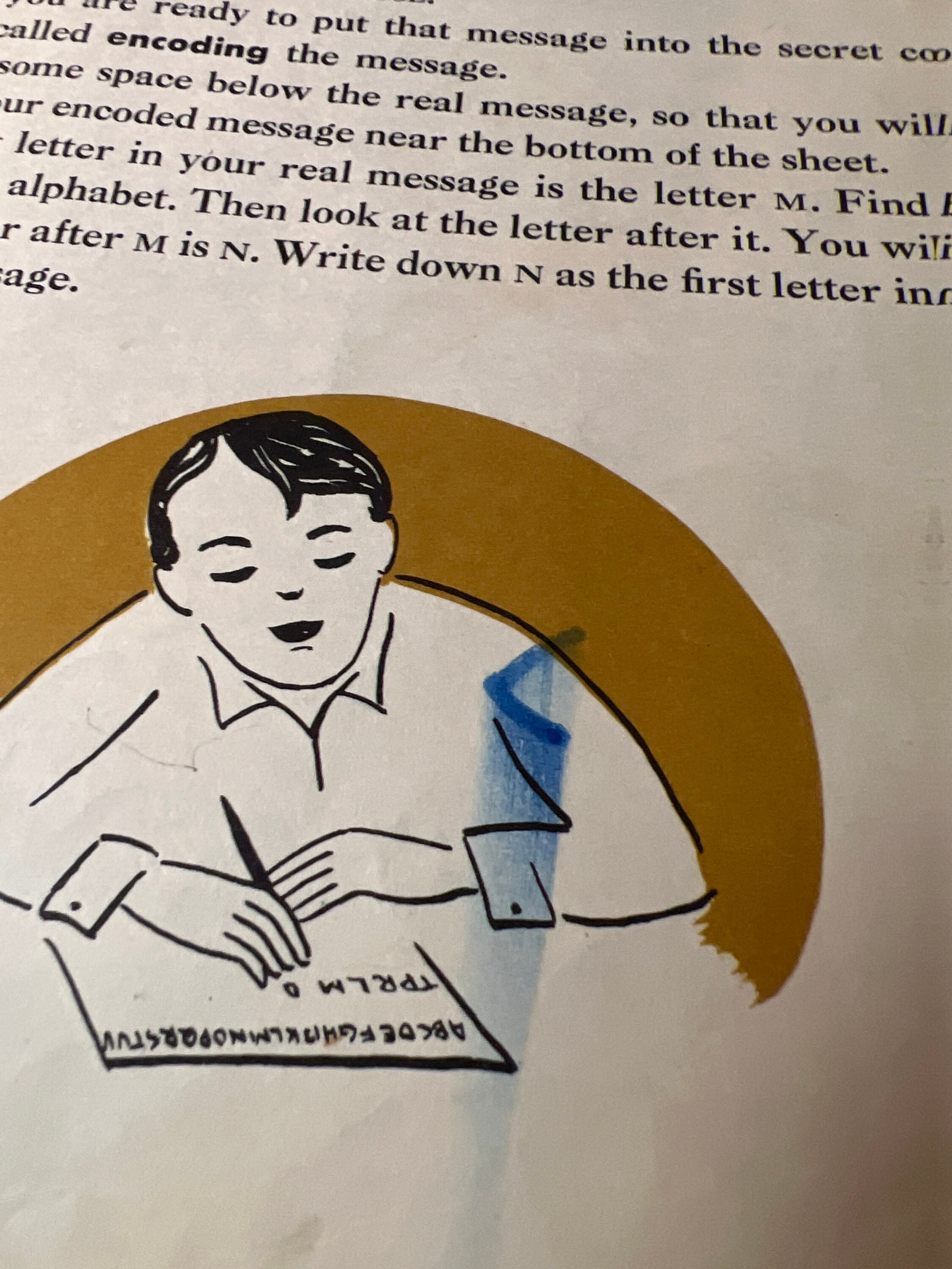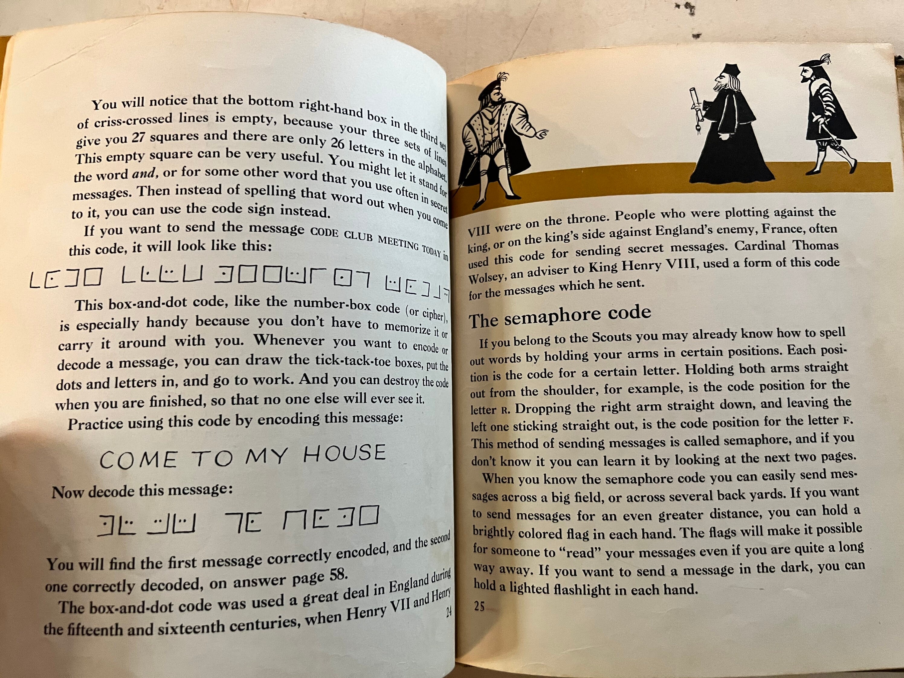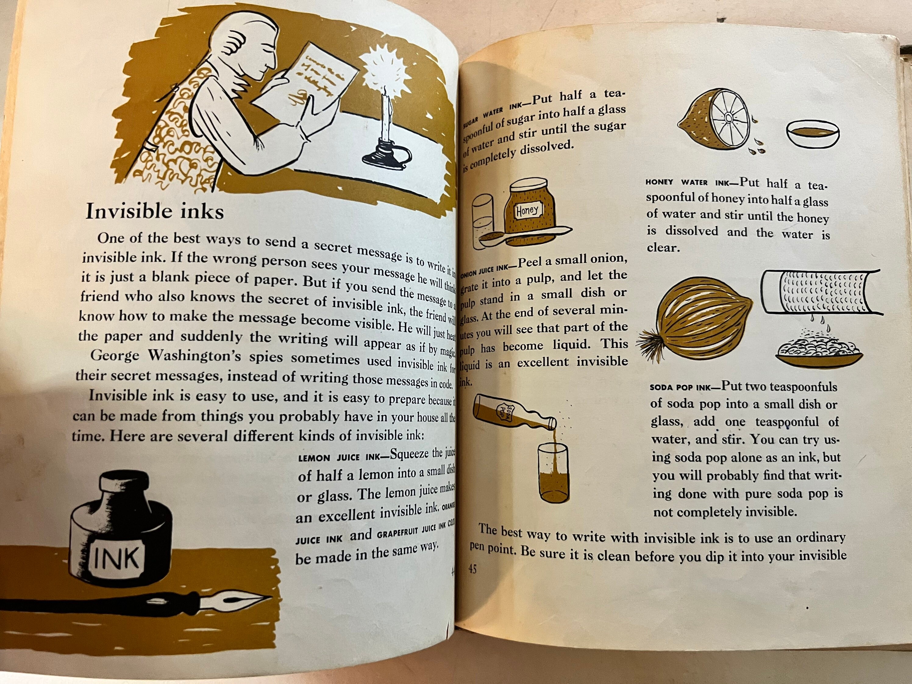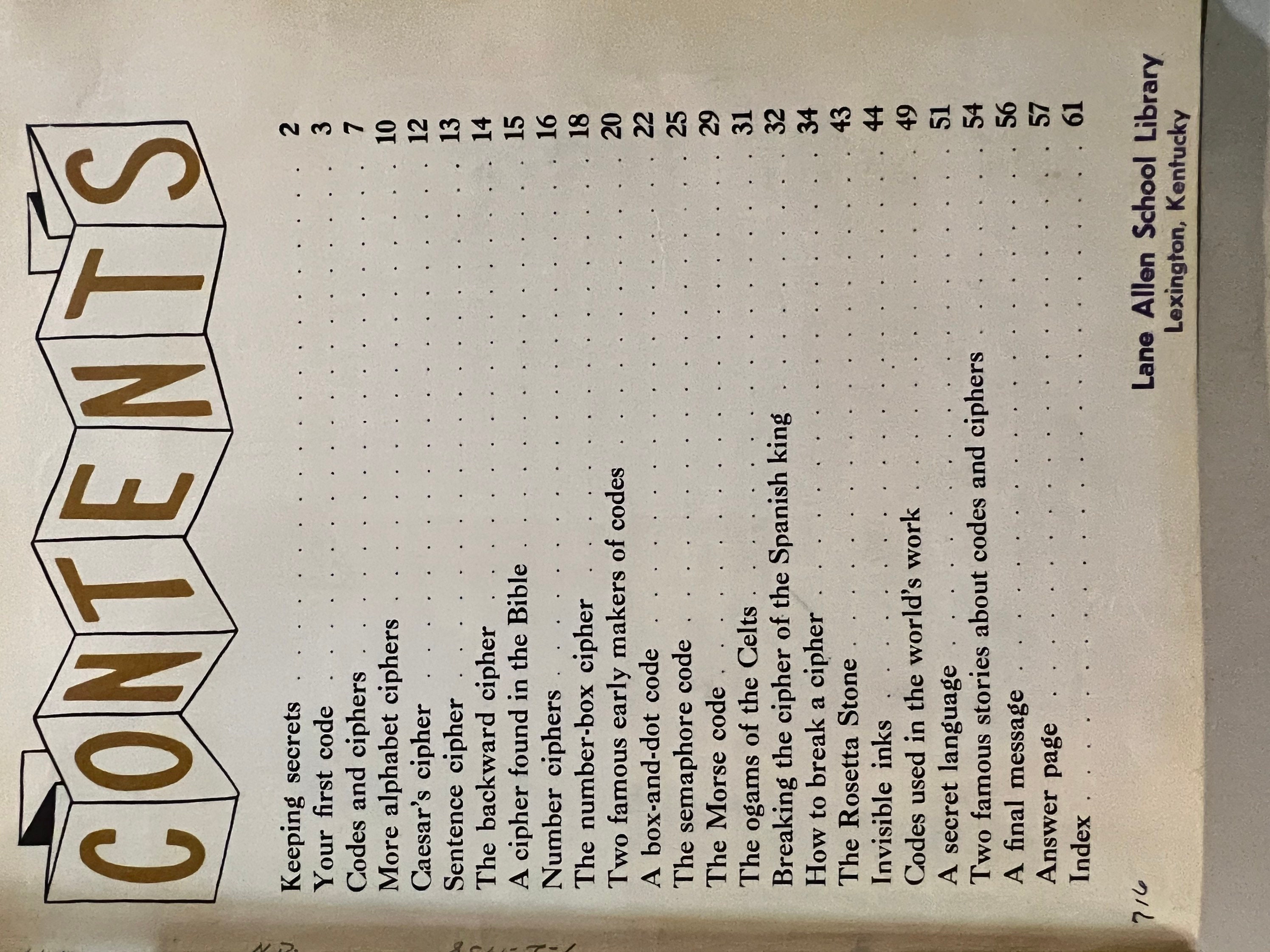 This is a book that has been read ALOT!! It’s called “The First Book of Codes and Ciphers” I can imagine how many children checked this out at the library and were completely fascinated by what they learned from this book. It’s a very well loved book as you can see in the photos, also there was a blank page in the back that got ripped out, I taped that edge down.
