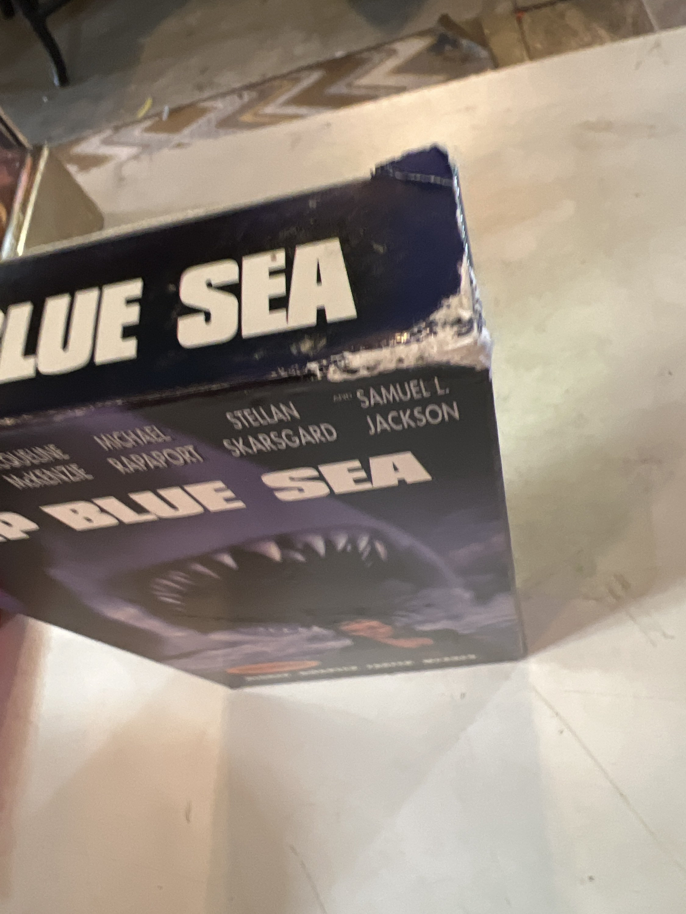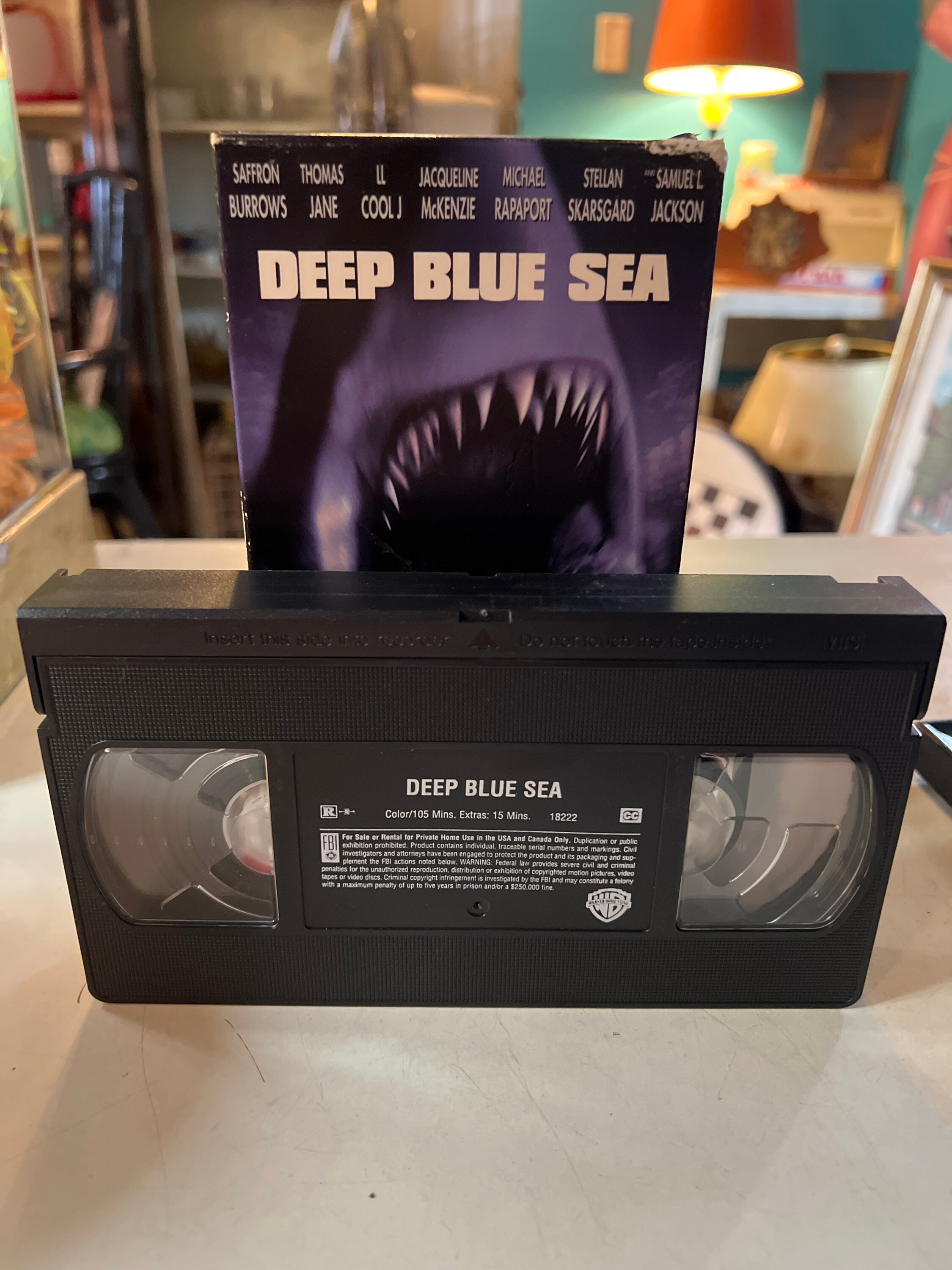 This is the movie, Deep Blue Sea on VHS. It’s an excellent shark scary movie, The case shows some wear and tear, (see photos) but otherwise it’s in good vintage condition.