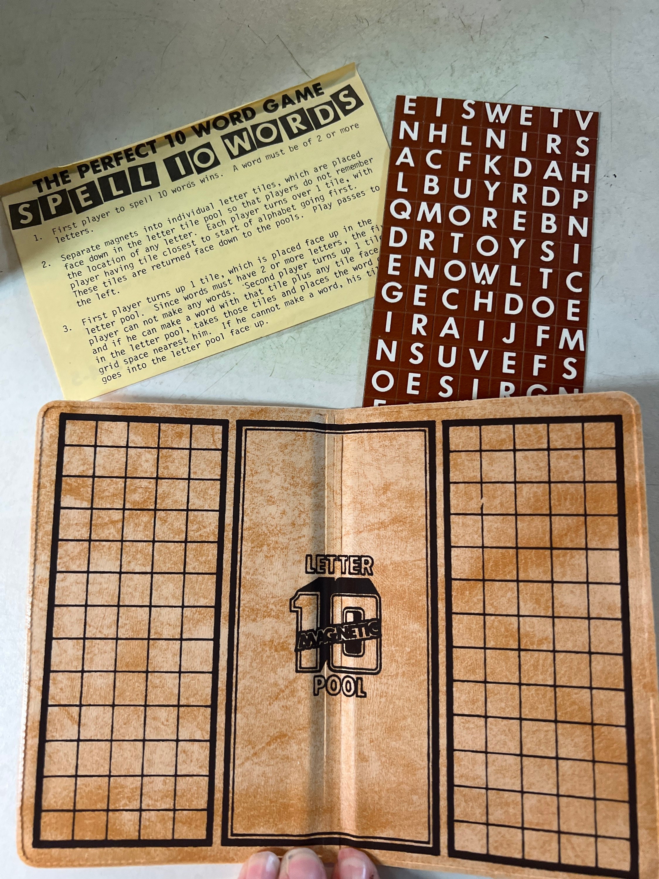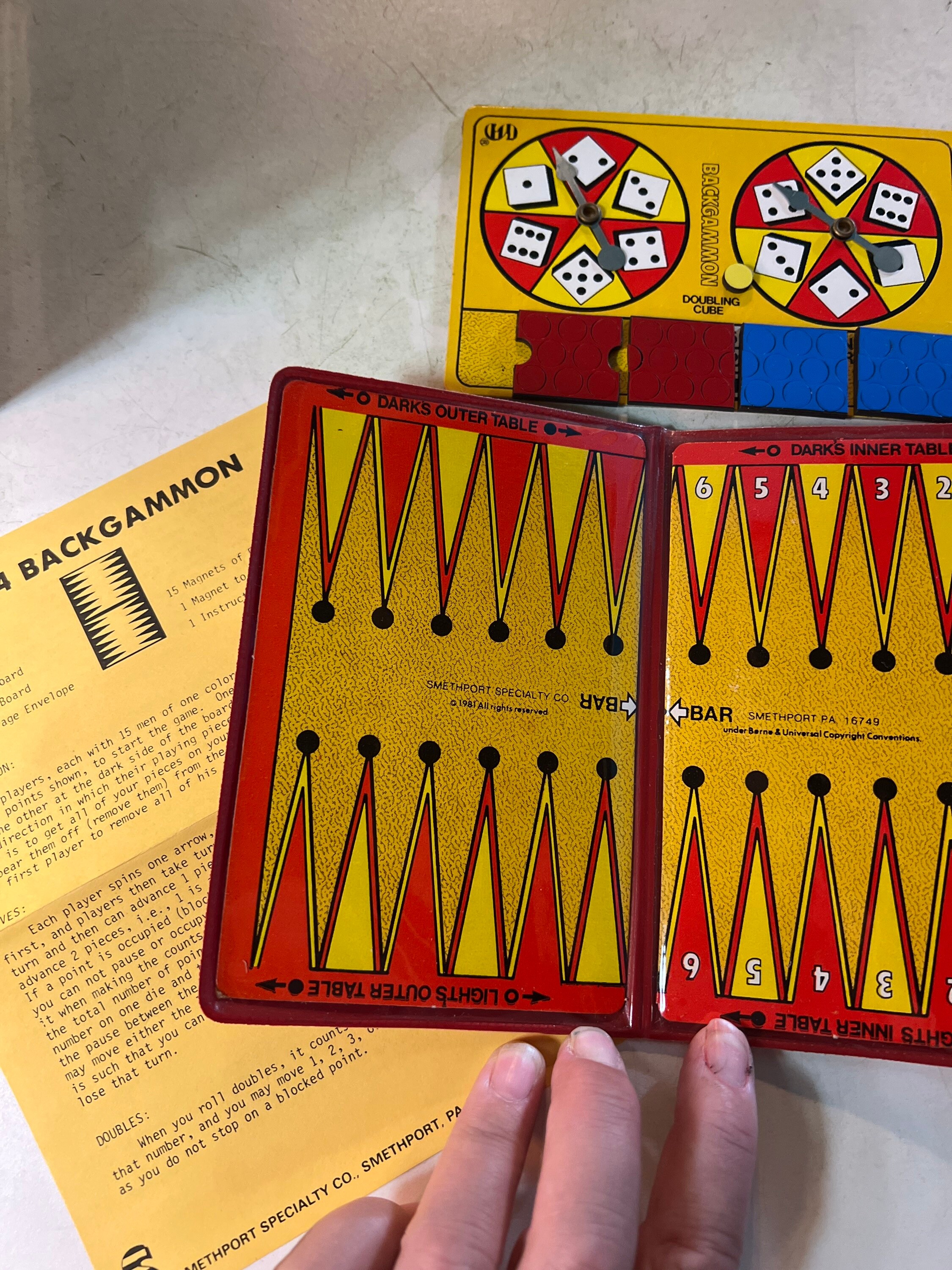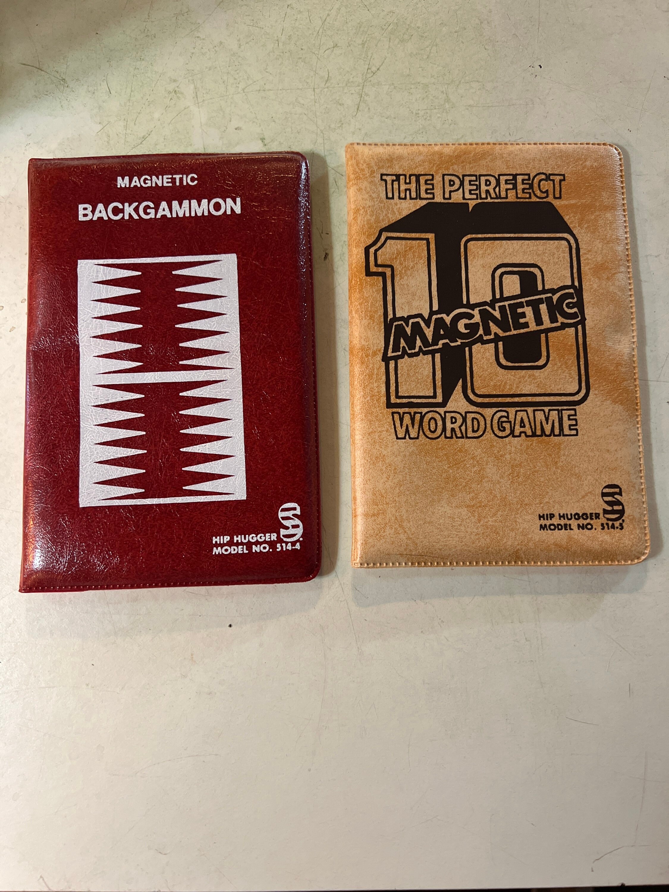 These are two cool. It’s a set of two magnetic hip huggers games. I grew up in the 80’s but I don’t recall ever seeing these games. One of them is Backgammon and the other is called The Perfect Ten Word Game. They both are in never used great vintage condition.