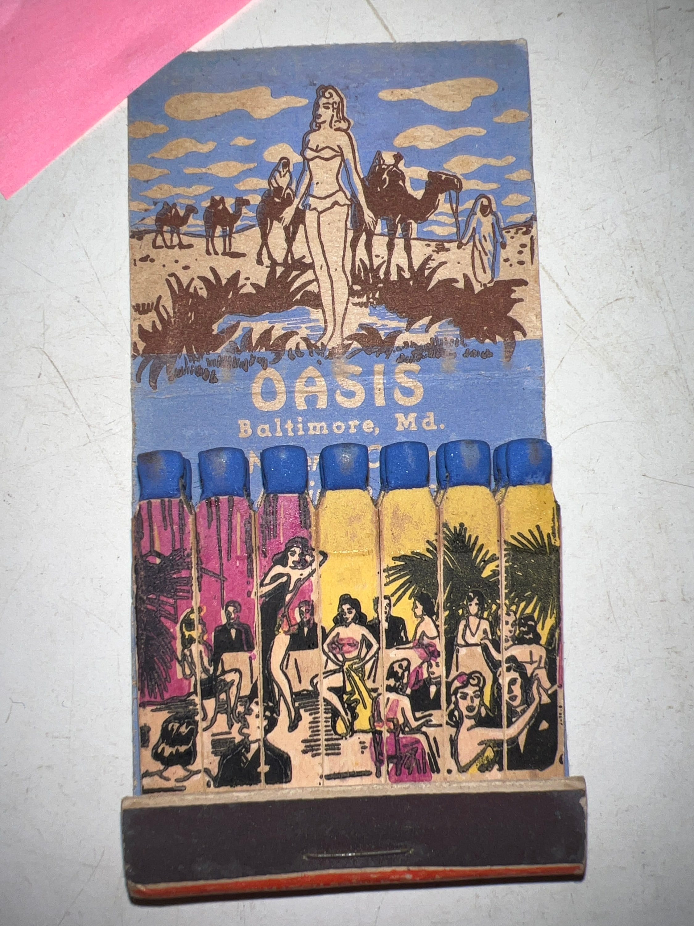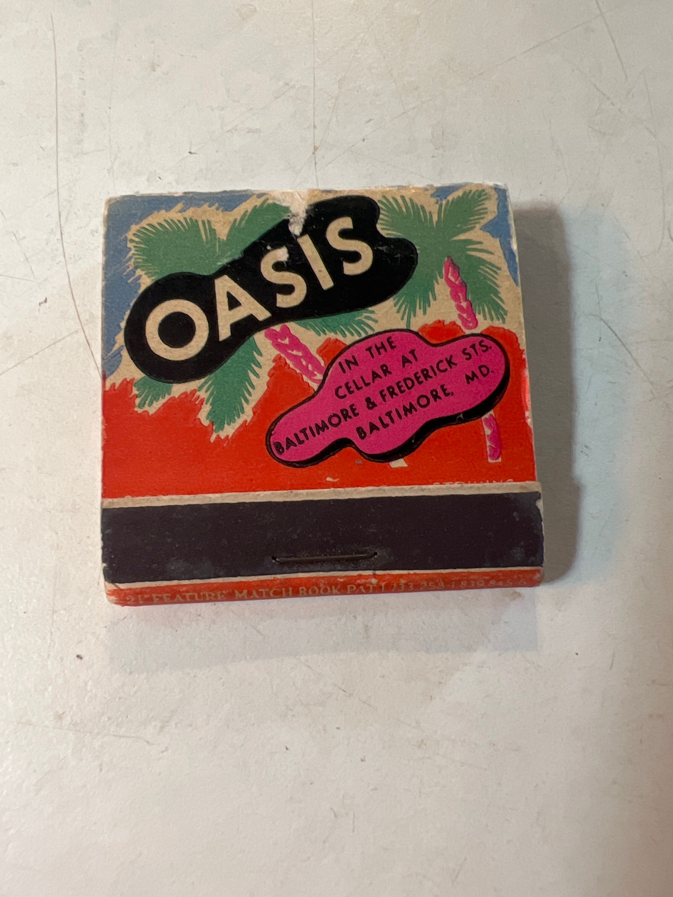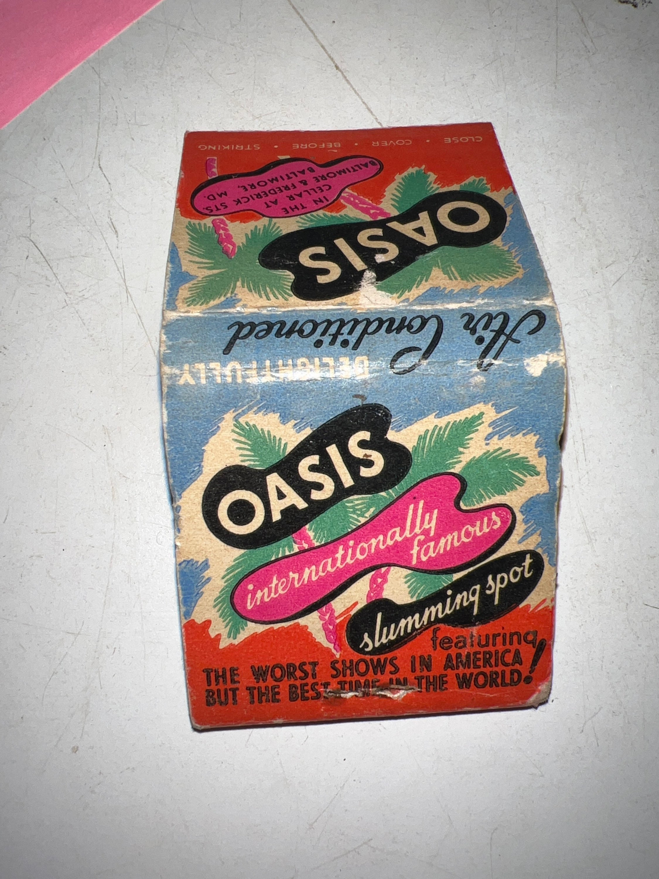This is so cool! 1940’s Rare Oasis Nightclub feature matchbook. The Oasis nightclub in Baltimore, “Internationally Known, Slumming Spot, The Worst Shows In America, But The Best Time In The World”