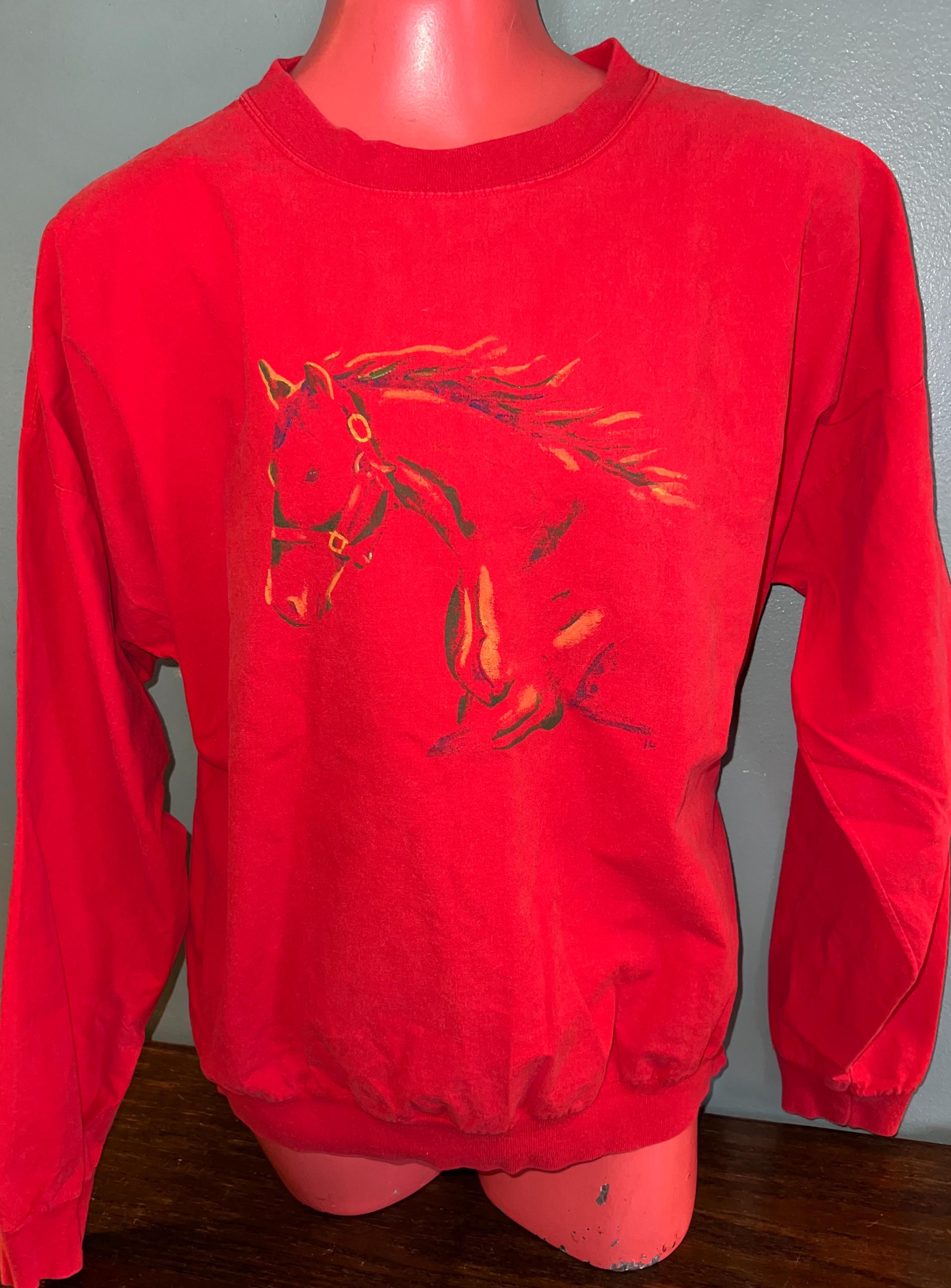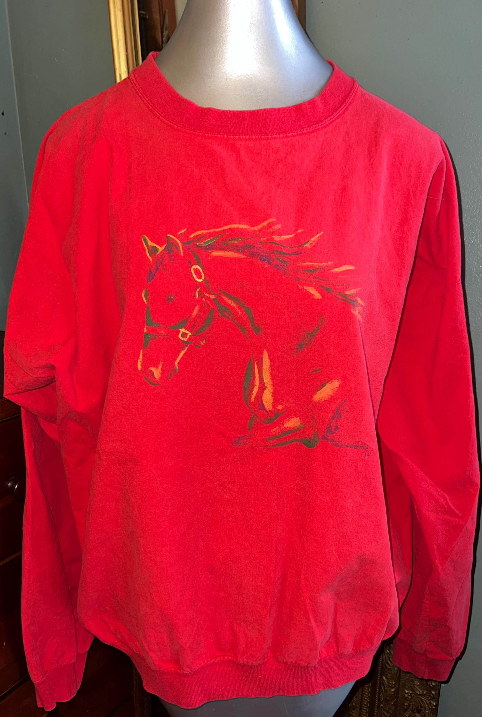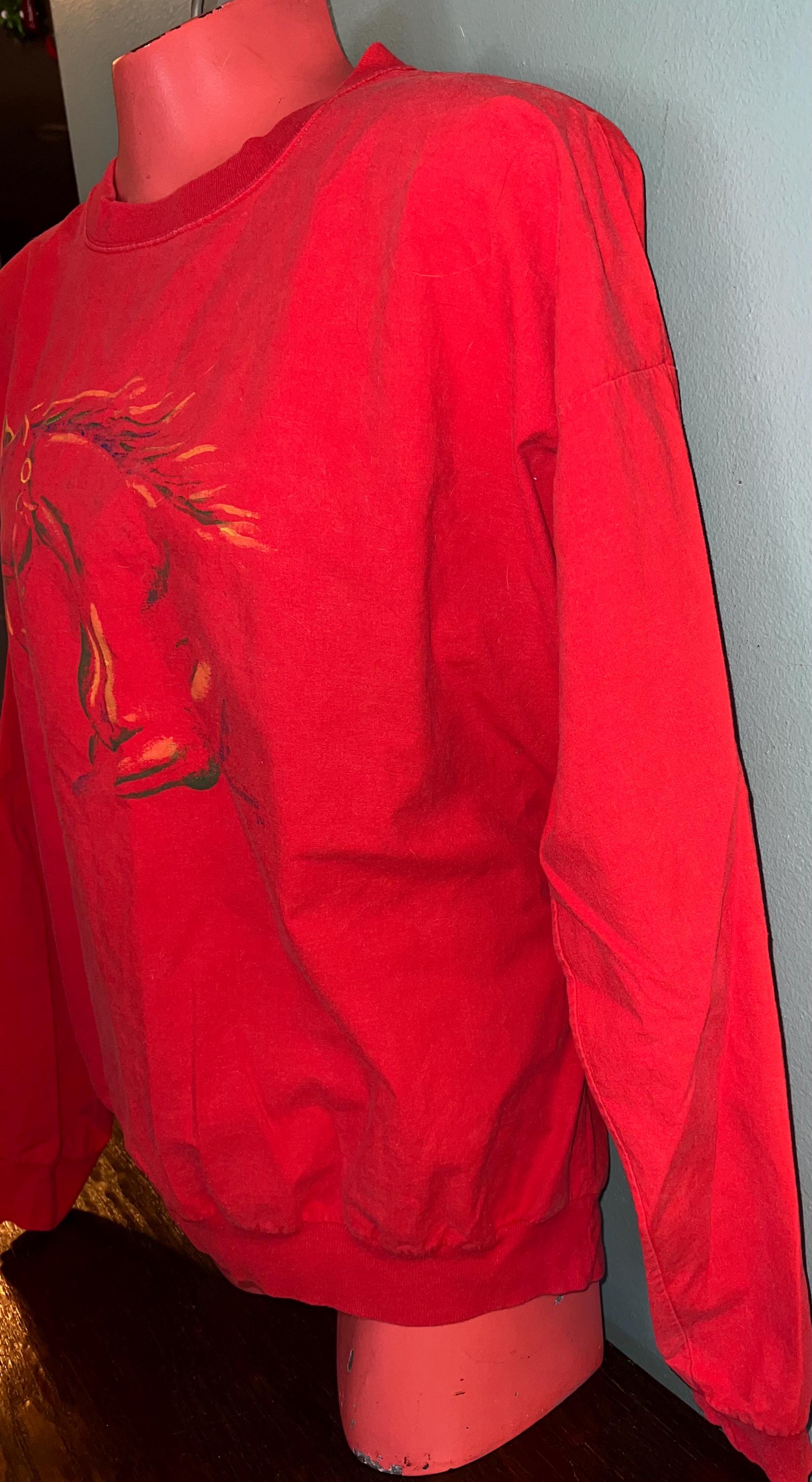 I love this great 80’s horse shirt. It’s a eye popping red with a painted horse head. It looks like a sweatshirt, but it feels more like a button down shirt, so it’s thin. It’s in good vintage condition.