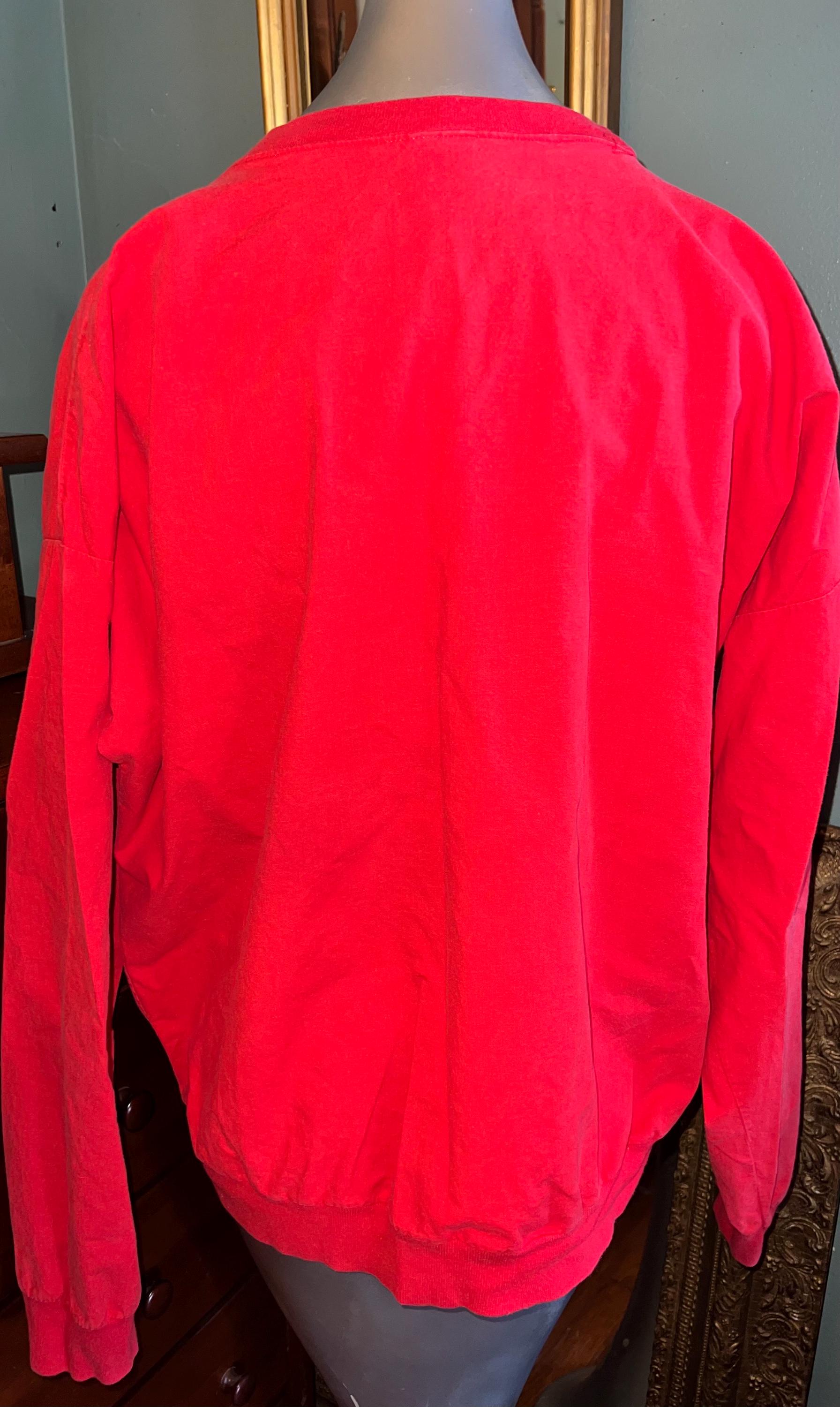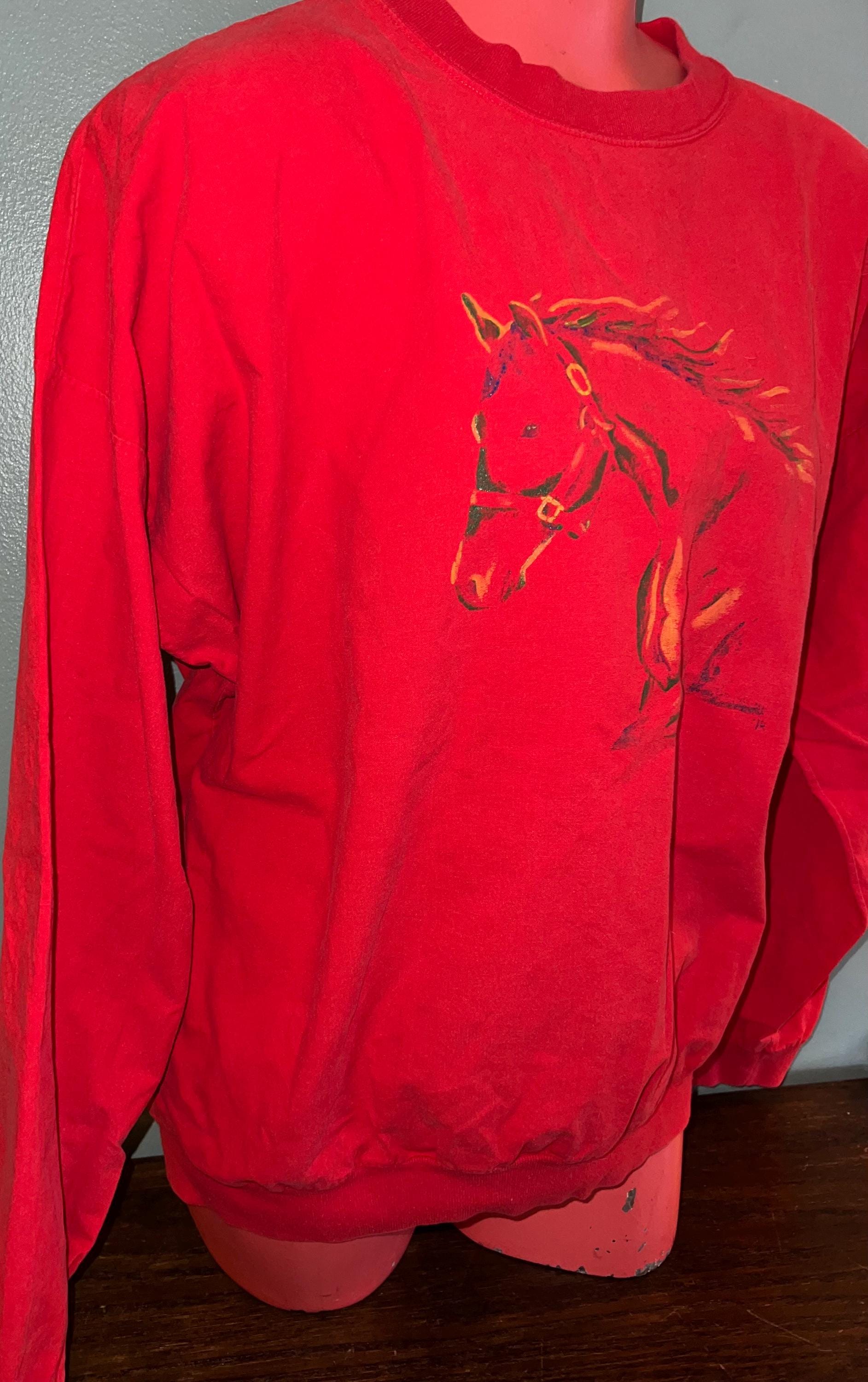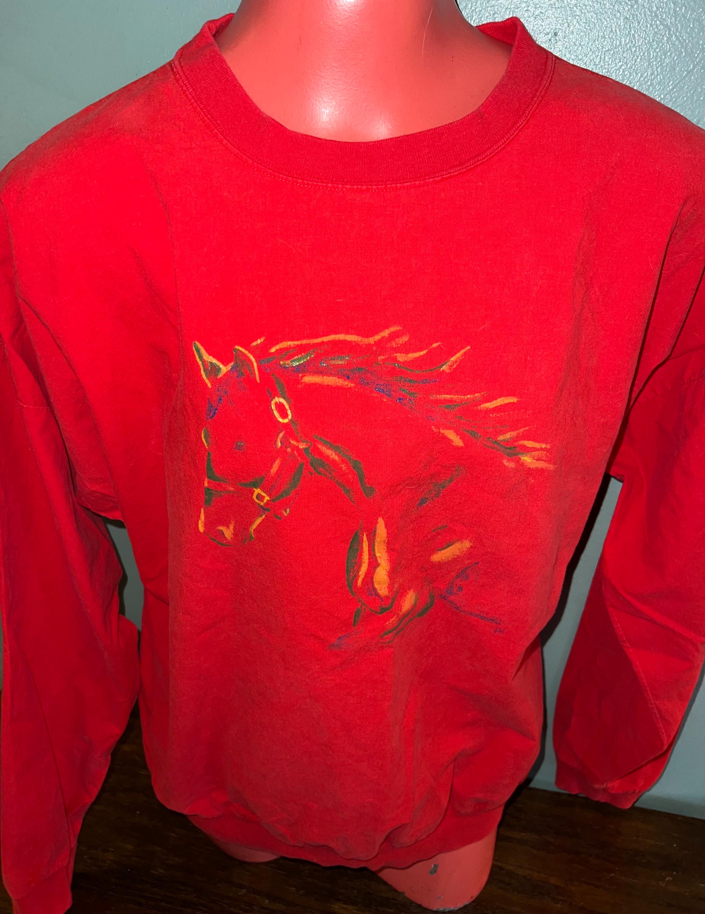 I love this great 80’s horse shirt. It’s a eye popping red with a painted horse head. It looks like a sweatshirt, but it feels more like a button down shirt, so it’s thin. It’s in good vintage condition.