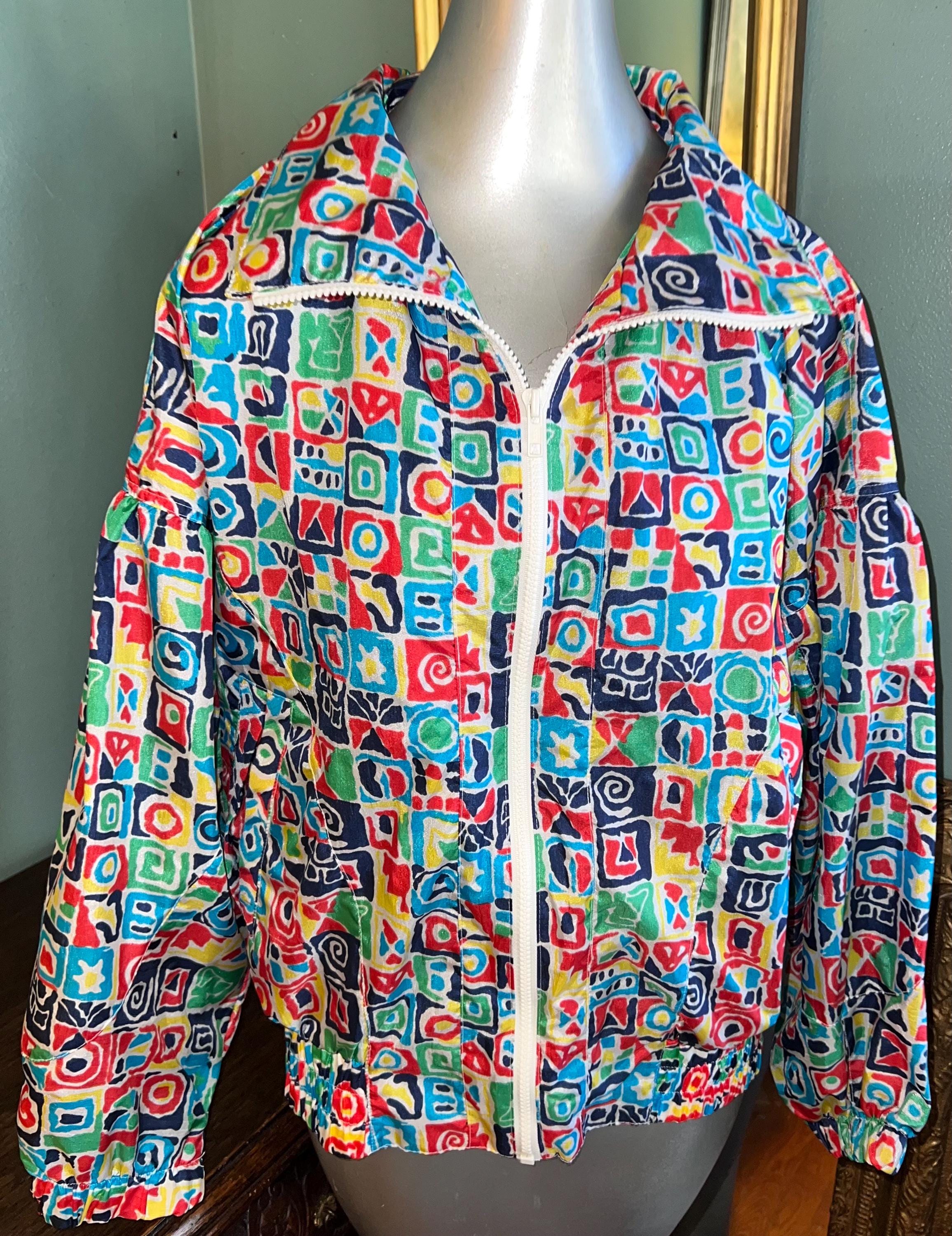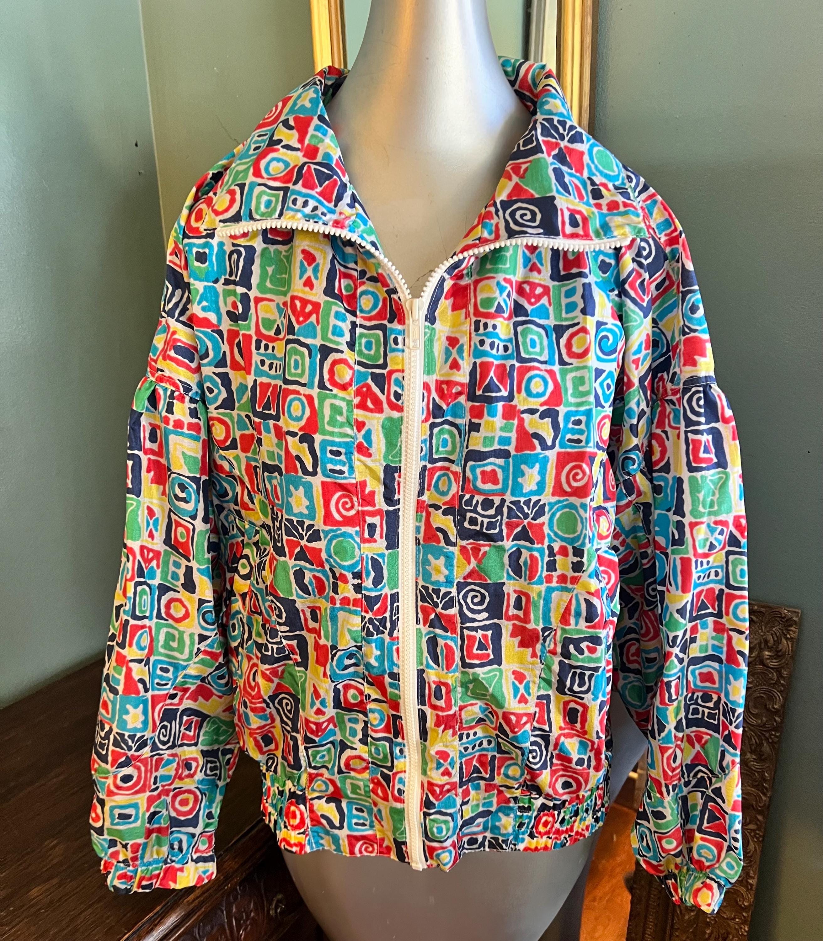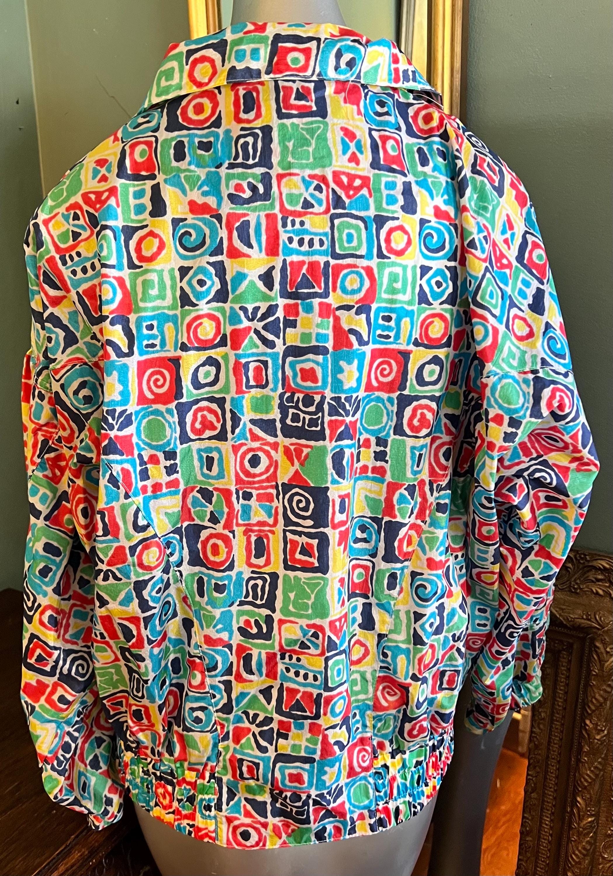 This is a super bold windbreaker jacket. The colors and the design is off the charts cool. It is not lined but dies have pockets. It’s in good vintage condition.