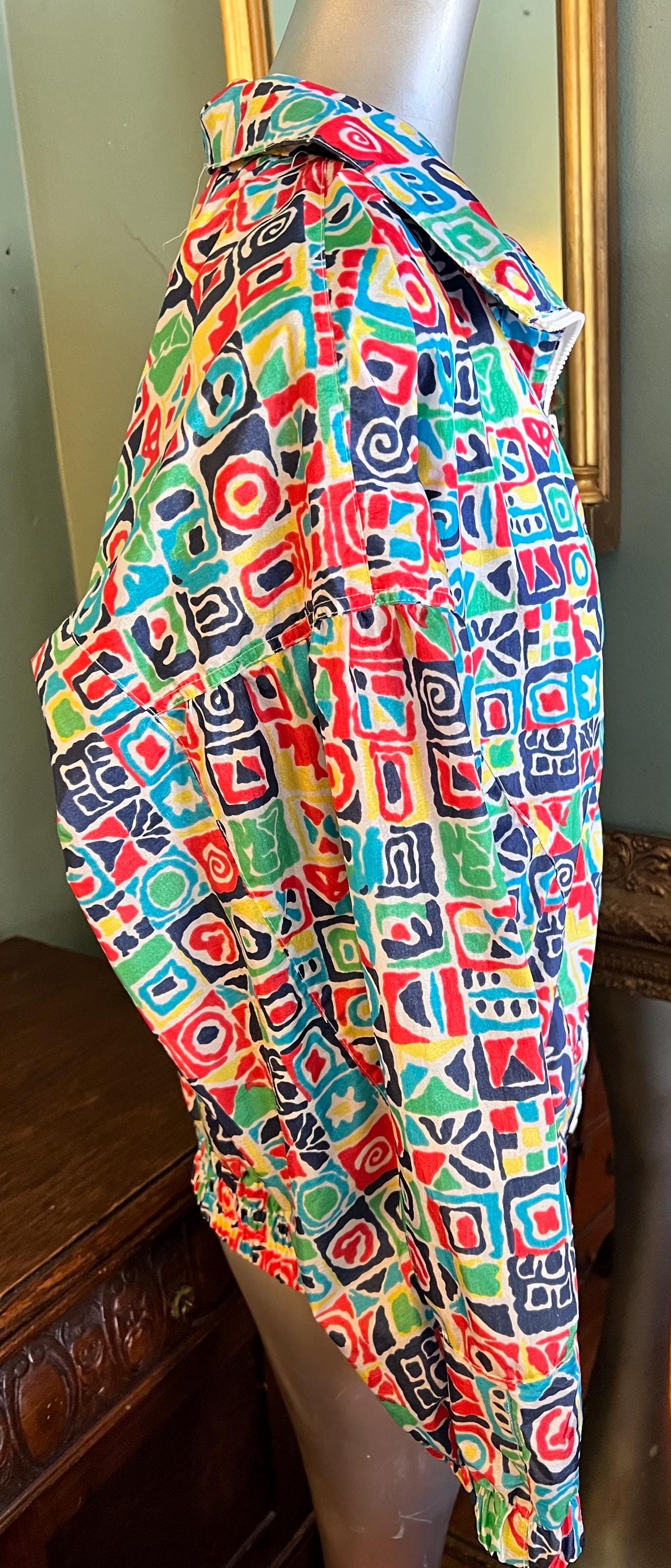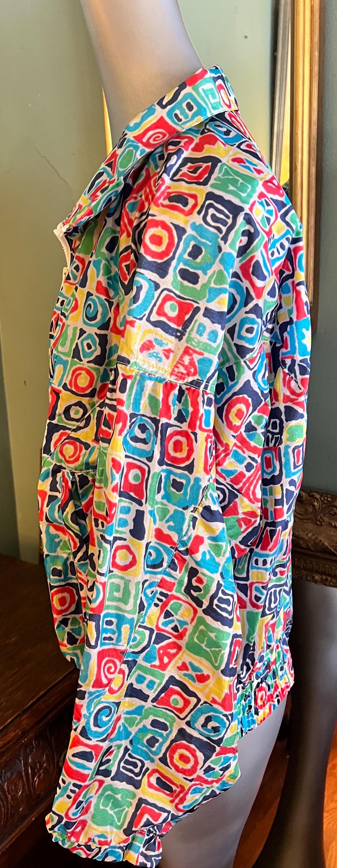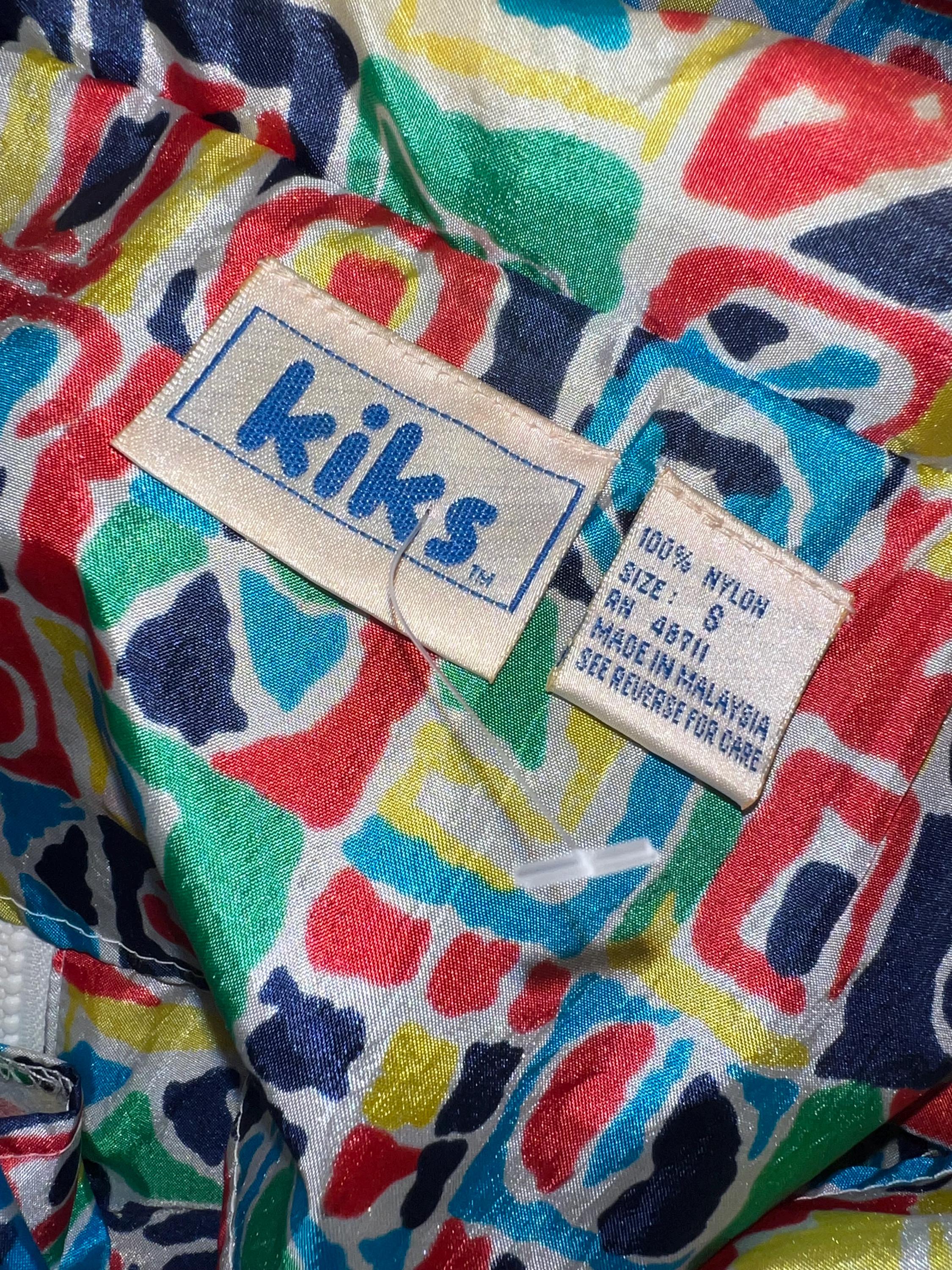 This is a super bold windbreaker jacket. The colors and the design is off the charts cool. It is not lined but dies have pockets. It’s in good vintage condition.