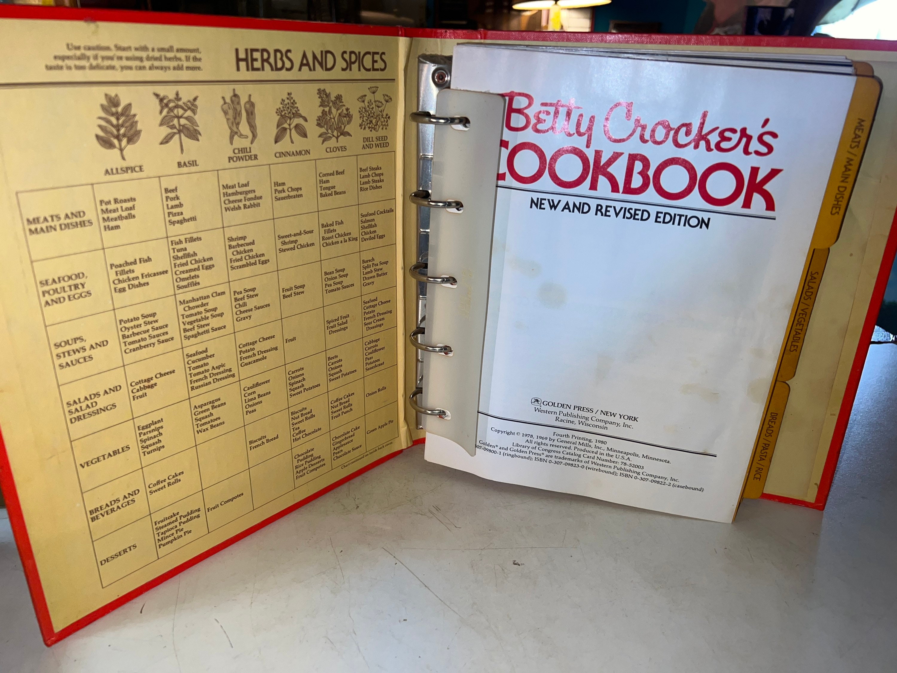 This is a nice 1980 Betty Crocker Binder Cookbook. The colors are great for decorating. The recipes sound scrumptious! It’s in good condition BUT there are spots on it from cooking, (i cleaned it S best as I could). Please see all photos and zoom in if you have too.
