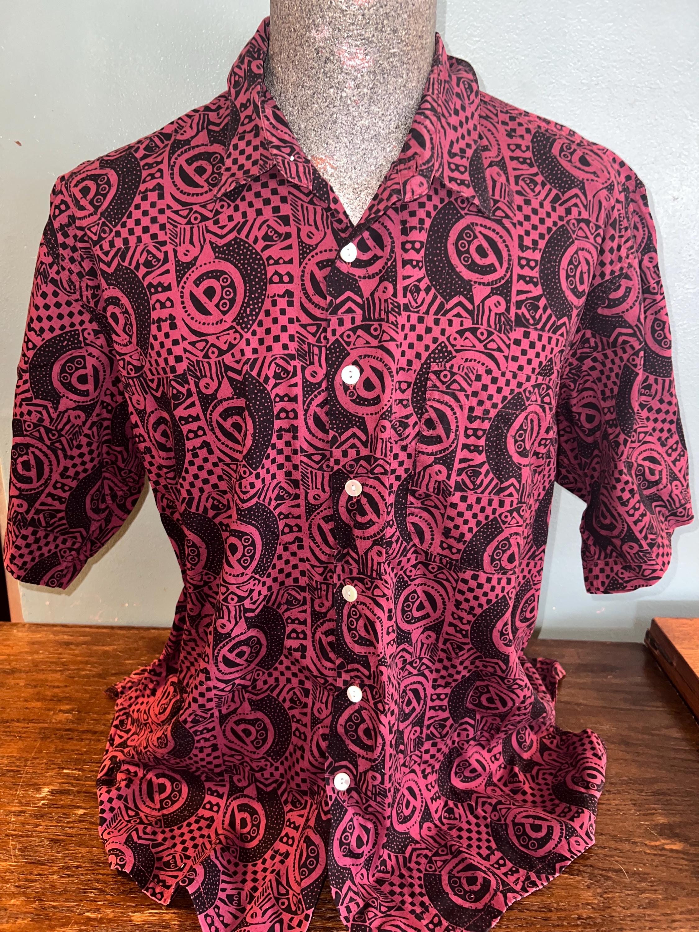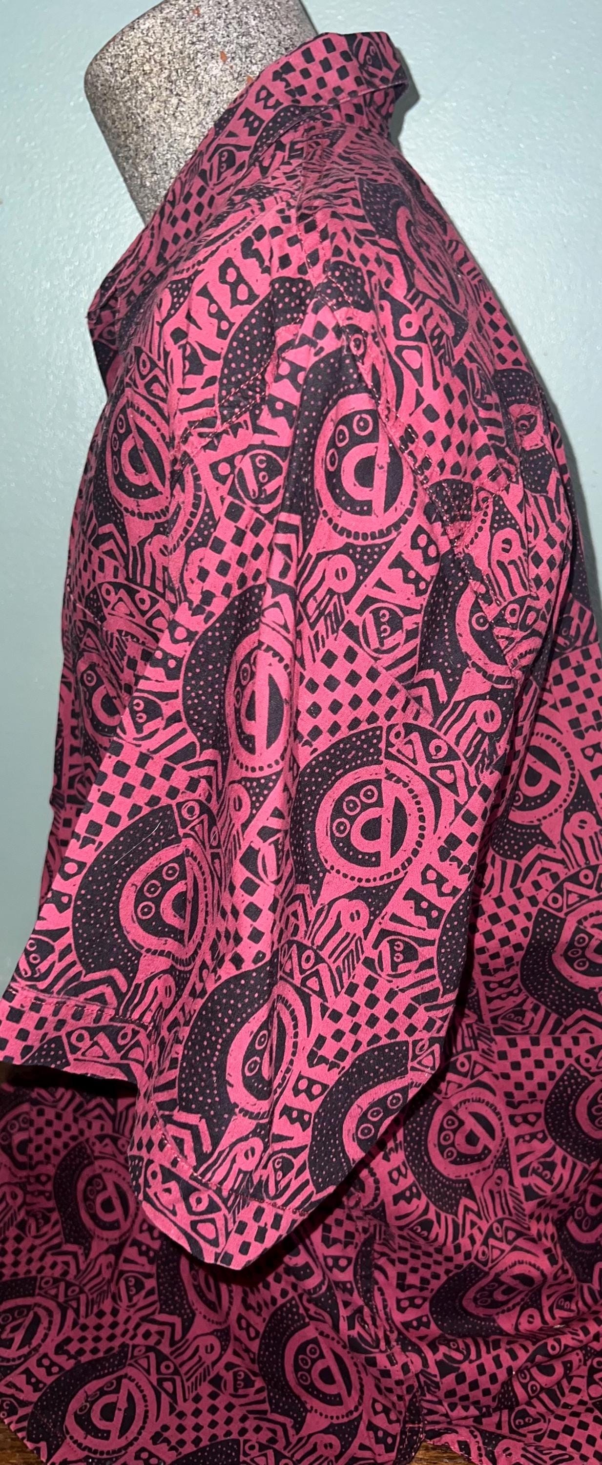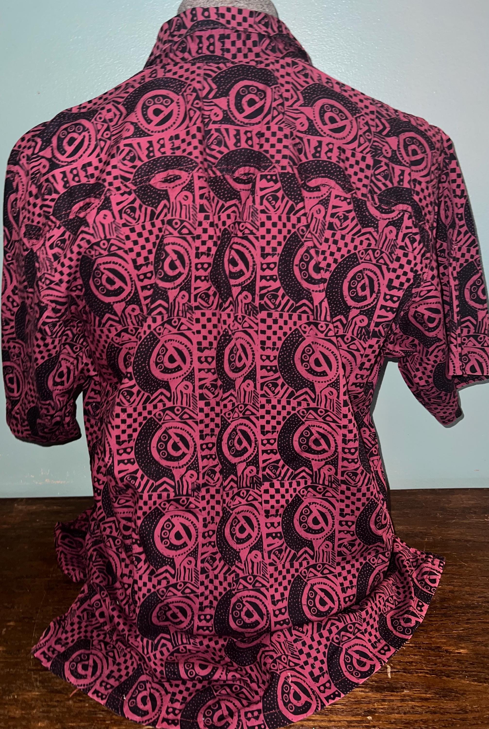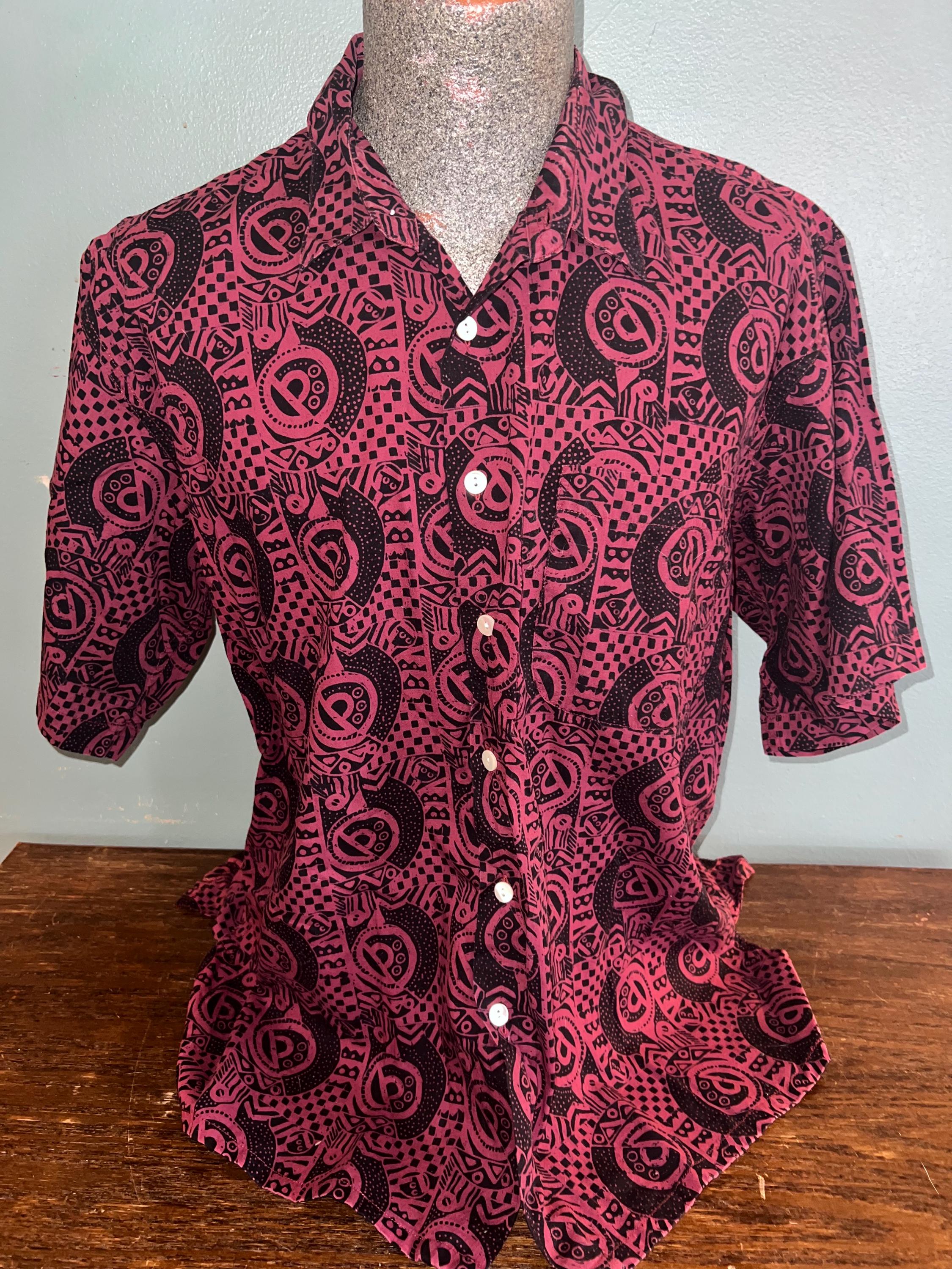 Very nice, J. Peterman all cotton maroon and black batik button down. it’s in good vintage condition.
