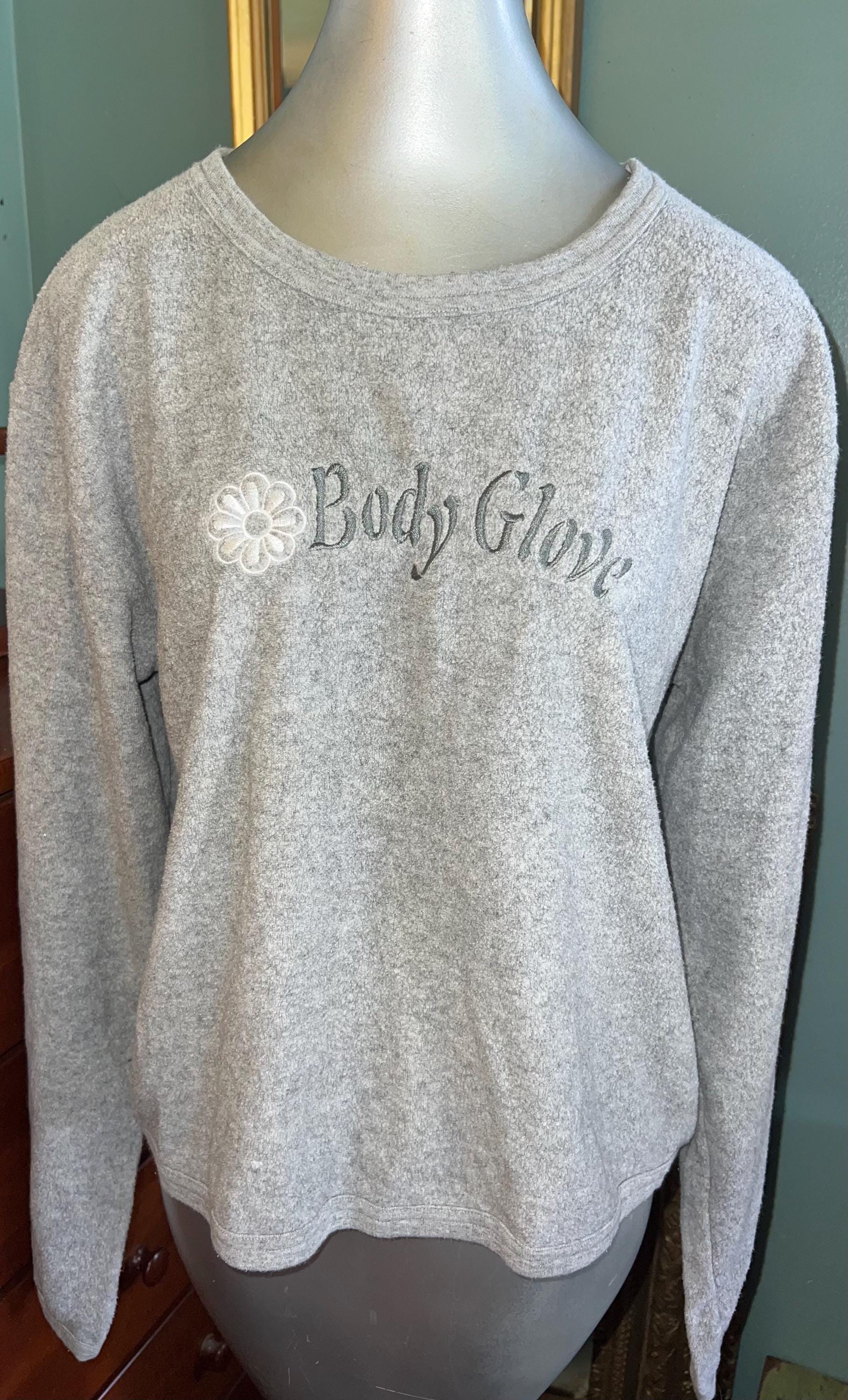 This is a nice thin fleece Body Glove sweatshirt from the 80’s. It’s embroidered with a white flower and “Body Glove” the fleece shows some wear and tear as all fleece like shirts do over time. Otherwise it’s in good vintage condition.