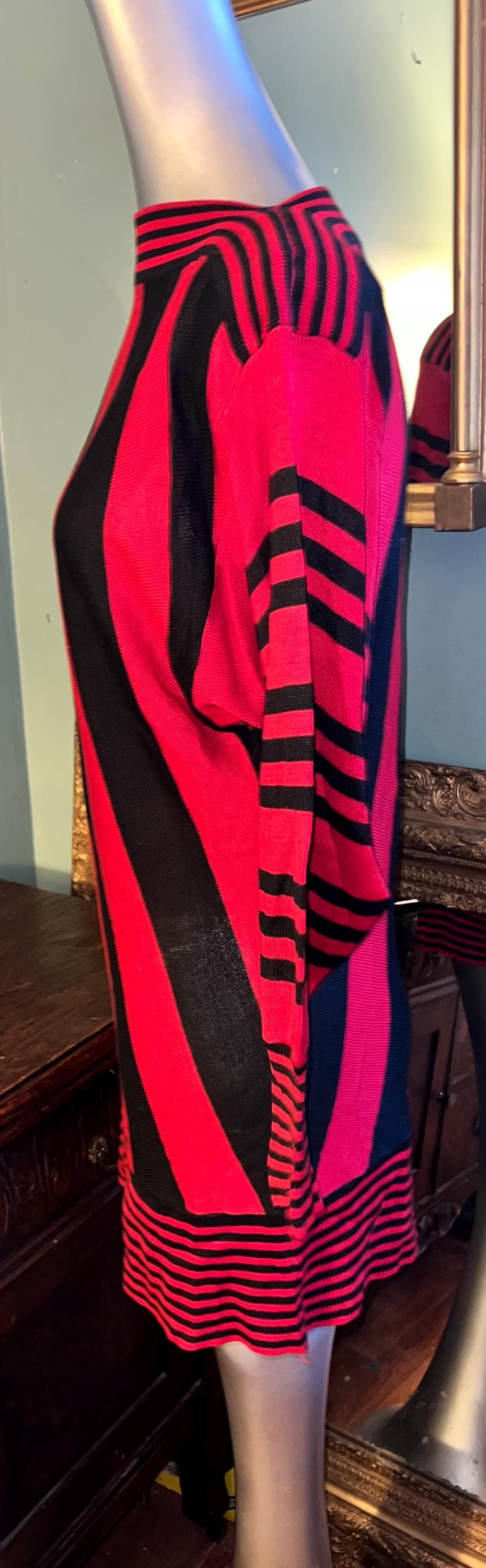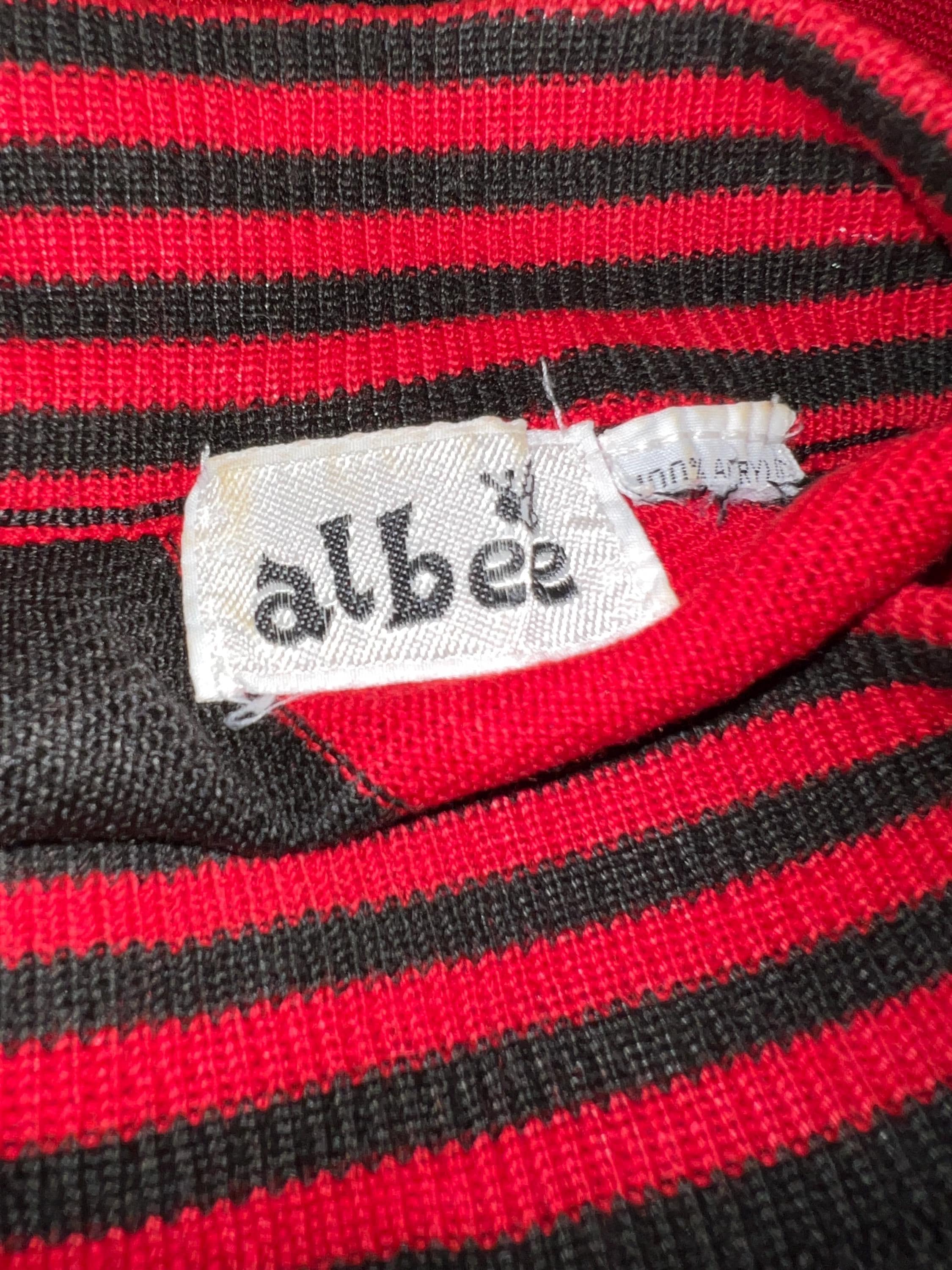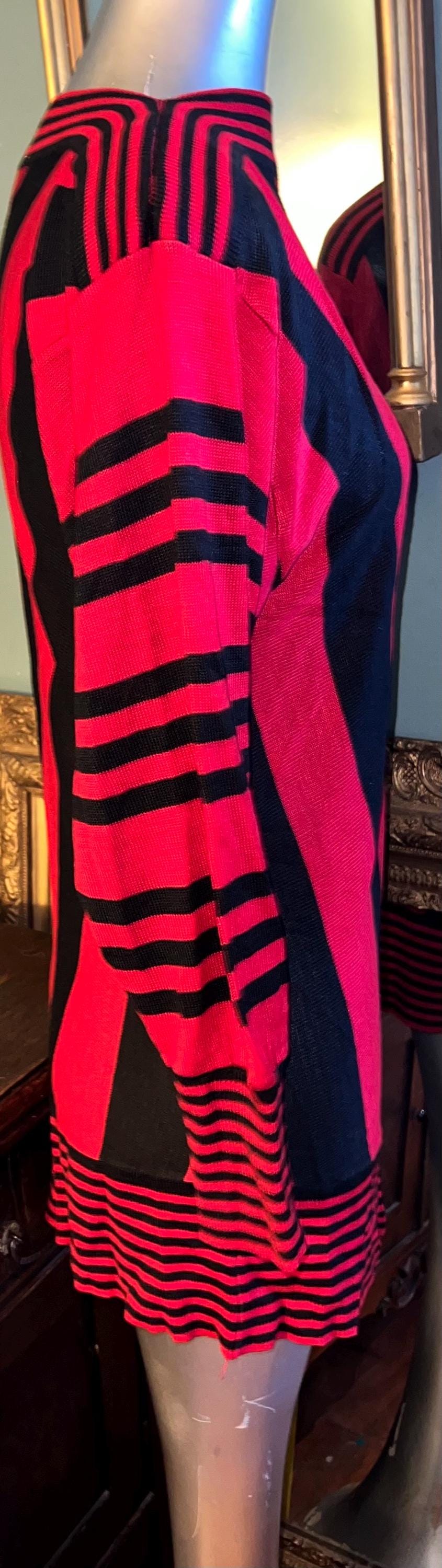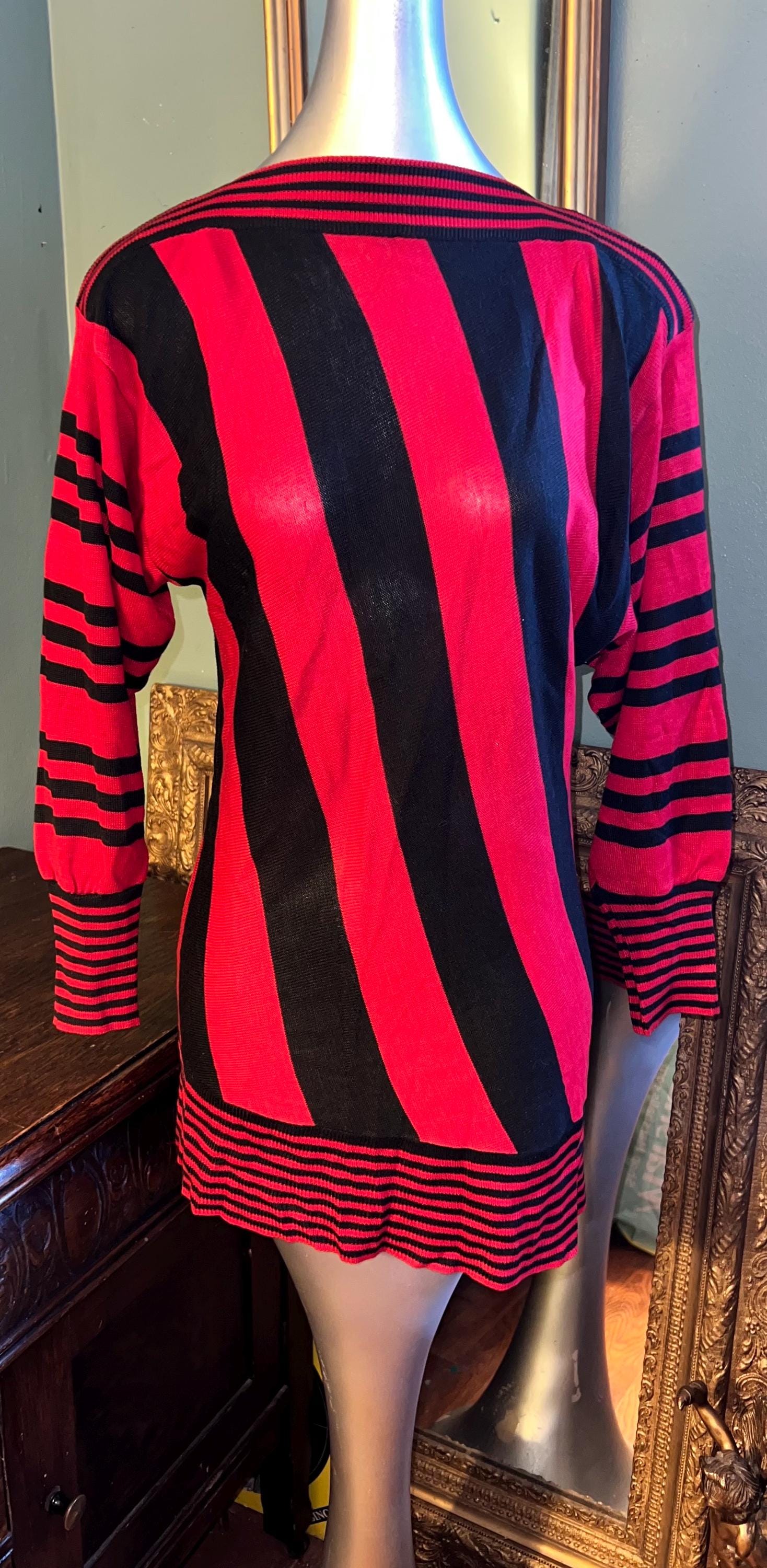 This is a too cute 80’s thin sweater dress. It’s straight, skin tight and perfect for a night out! It’s super cute with all the different stripe patterns. Its in really good vintage condition!