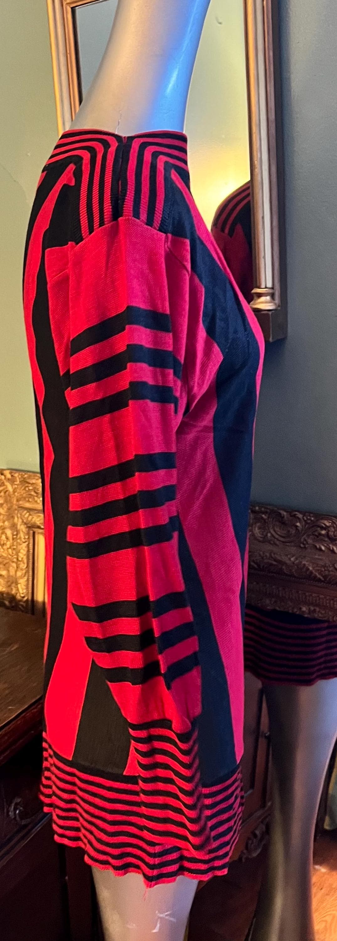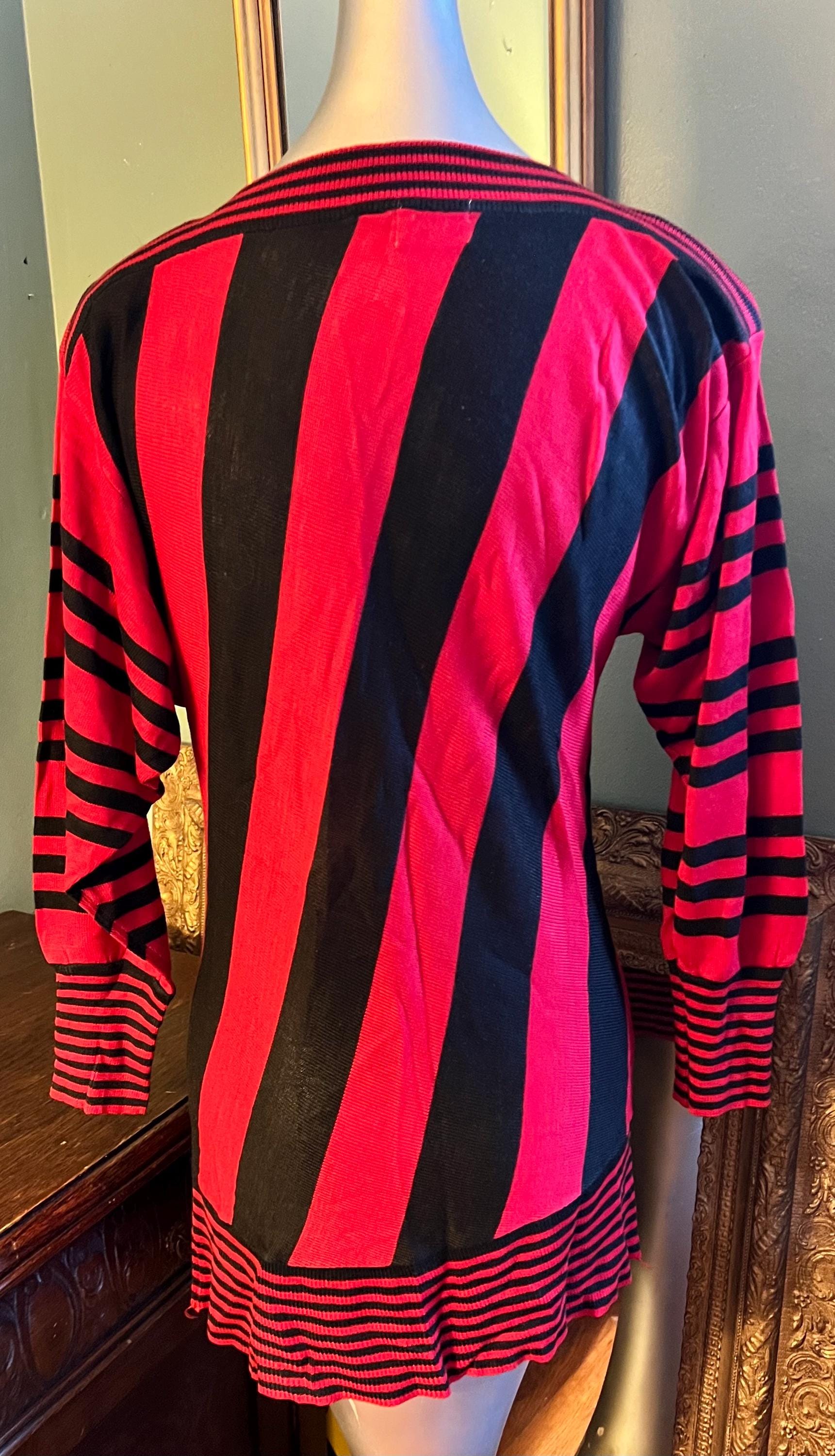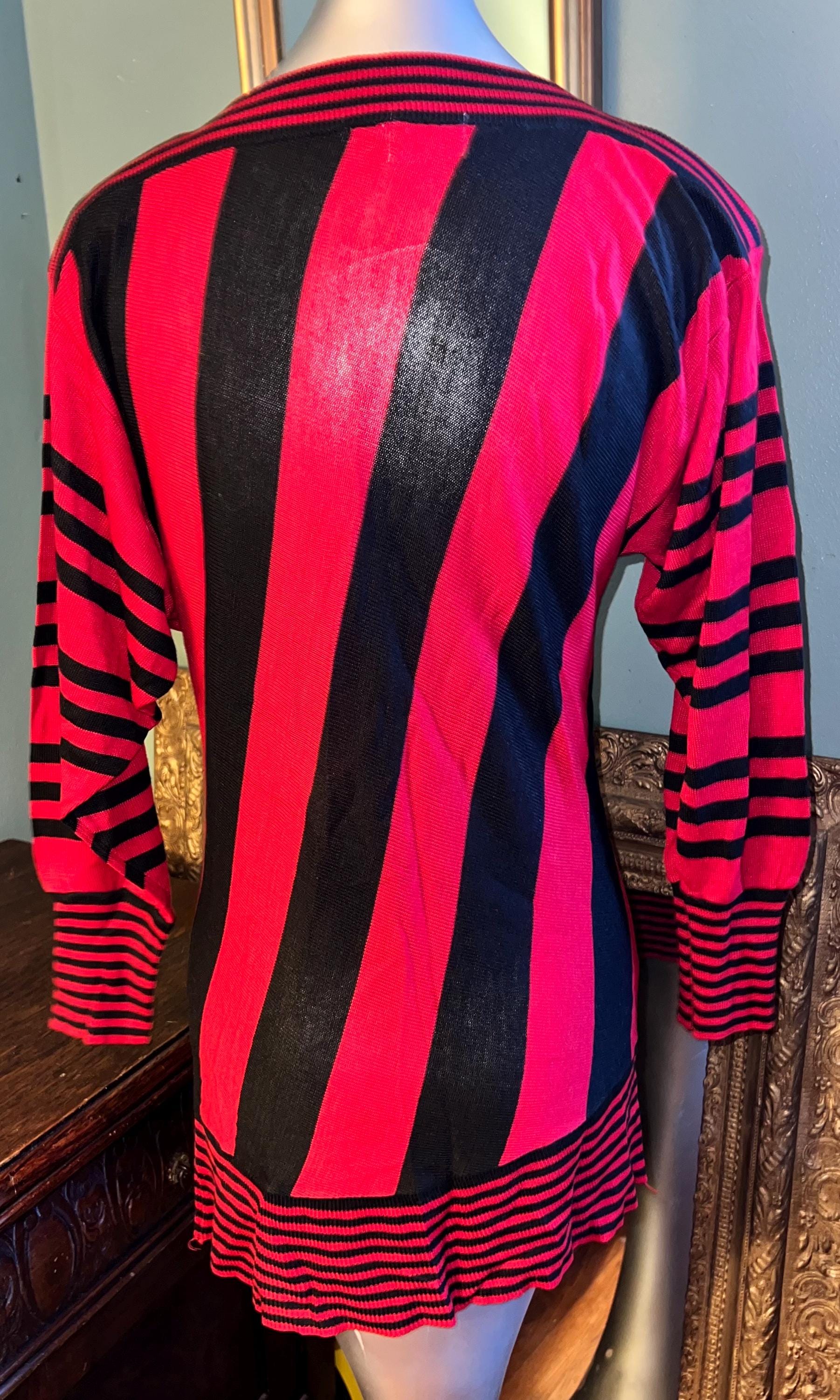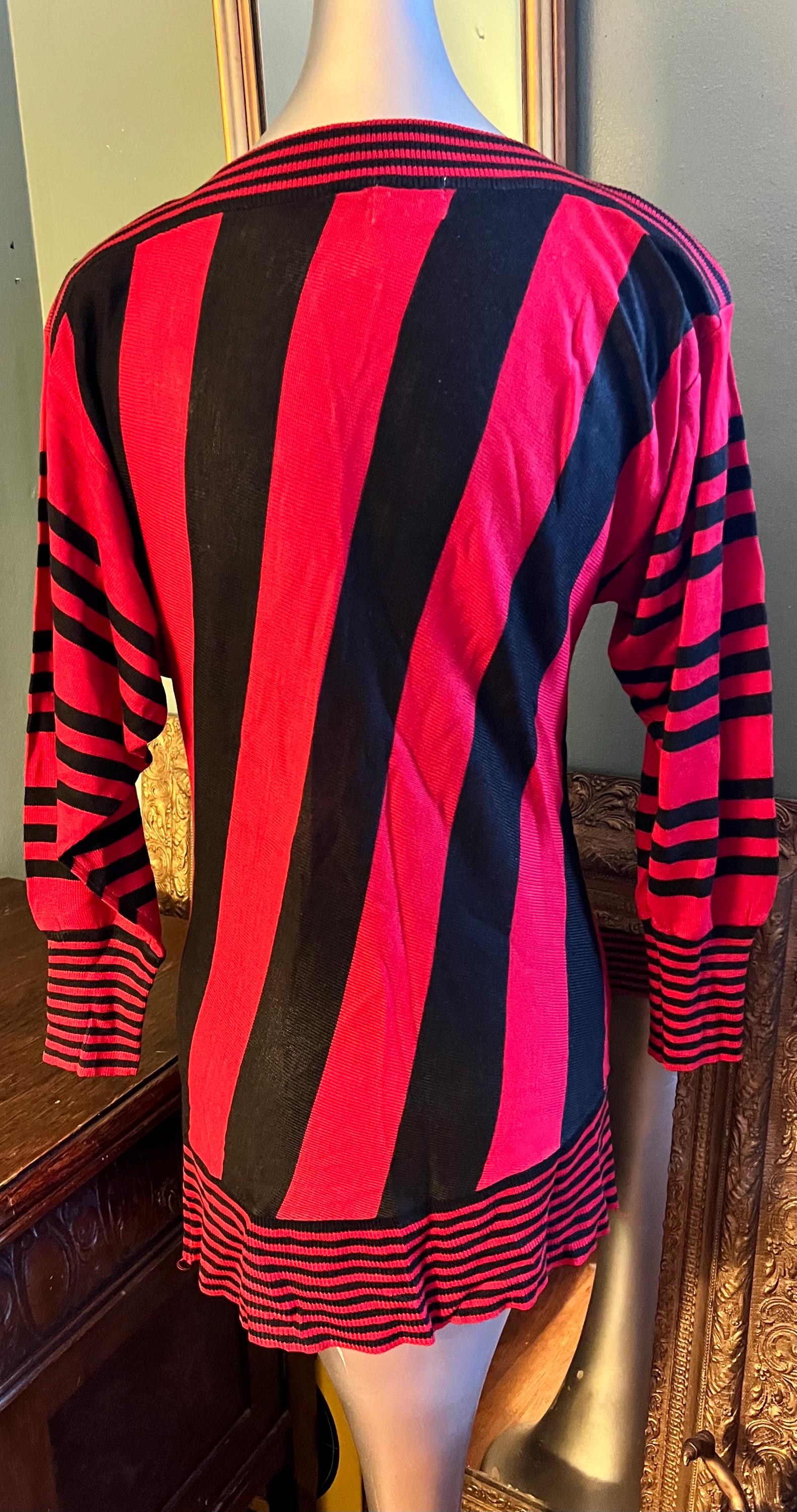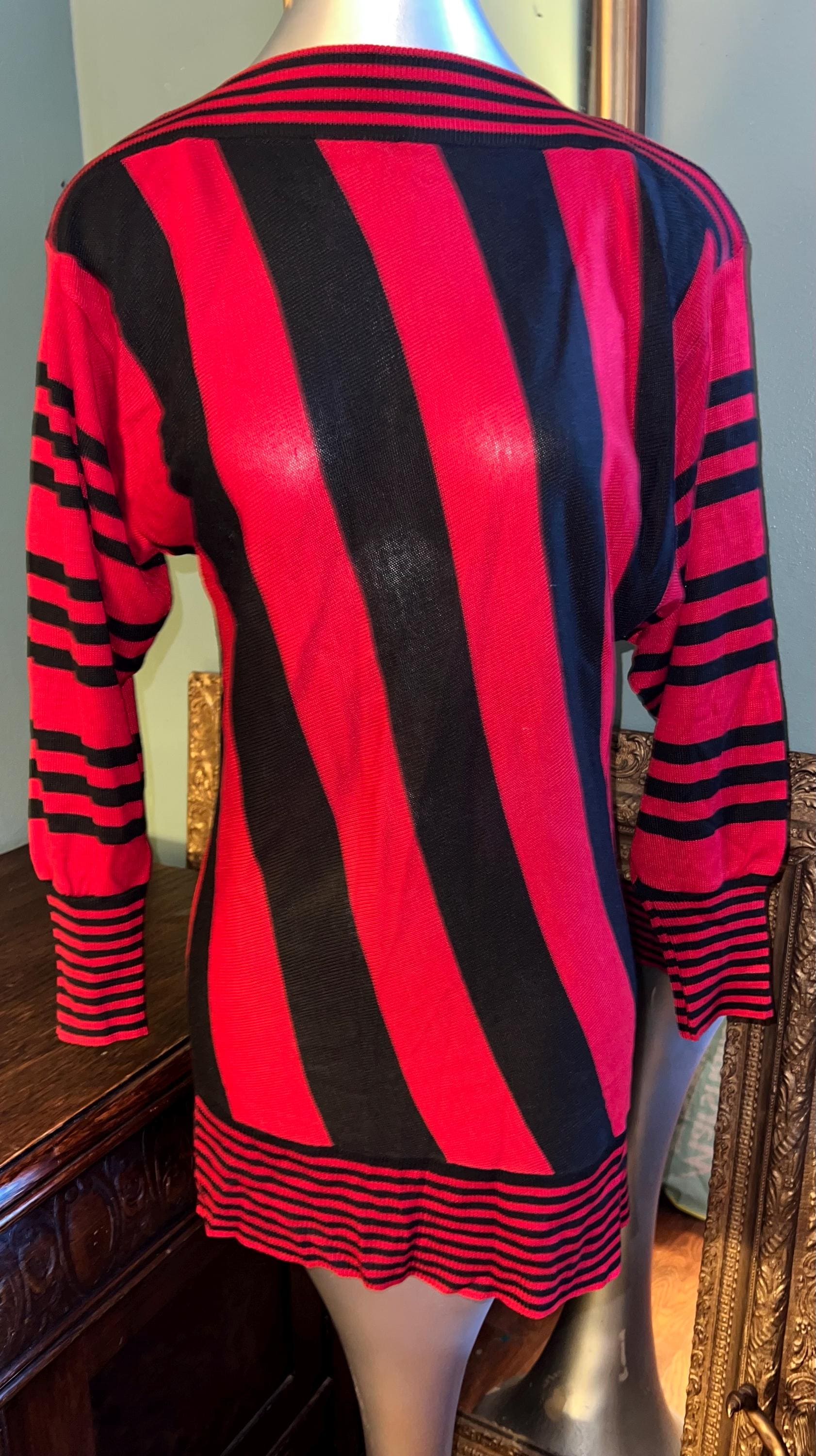 This is a too cute 80’s thin sweater dress. It’s straight, skin tight and perfect for a night out! It’s super cute with all the different stripe patterns. Its in really good vintage condition!