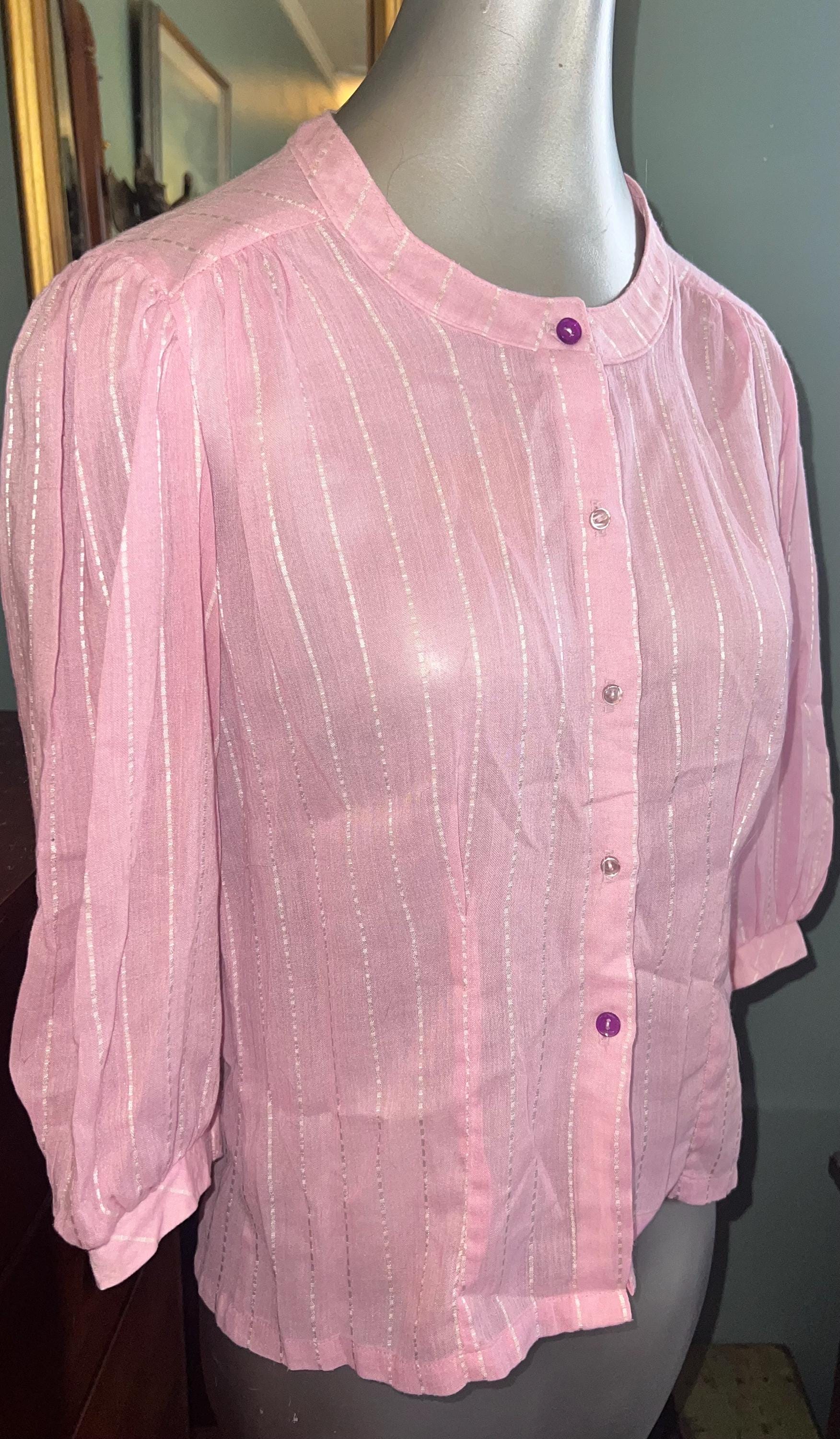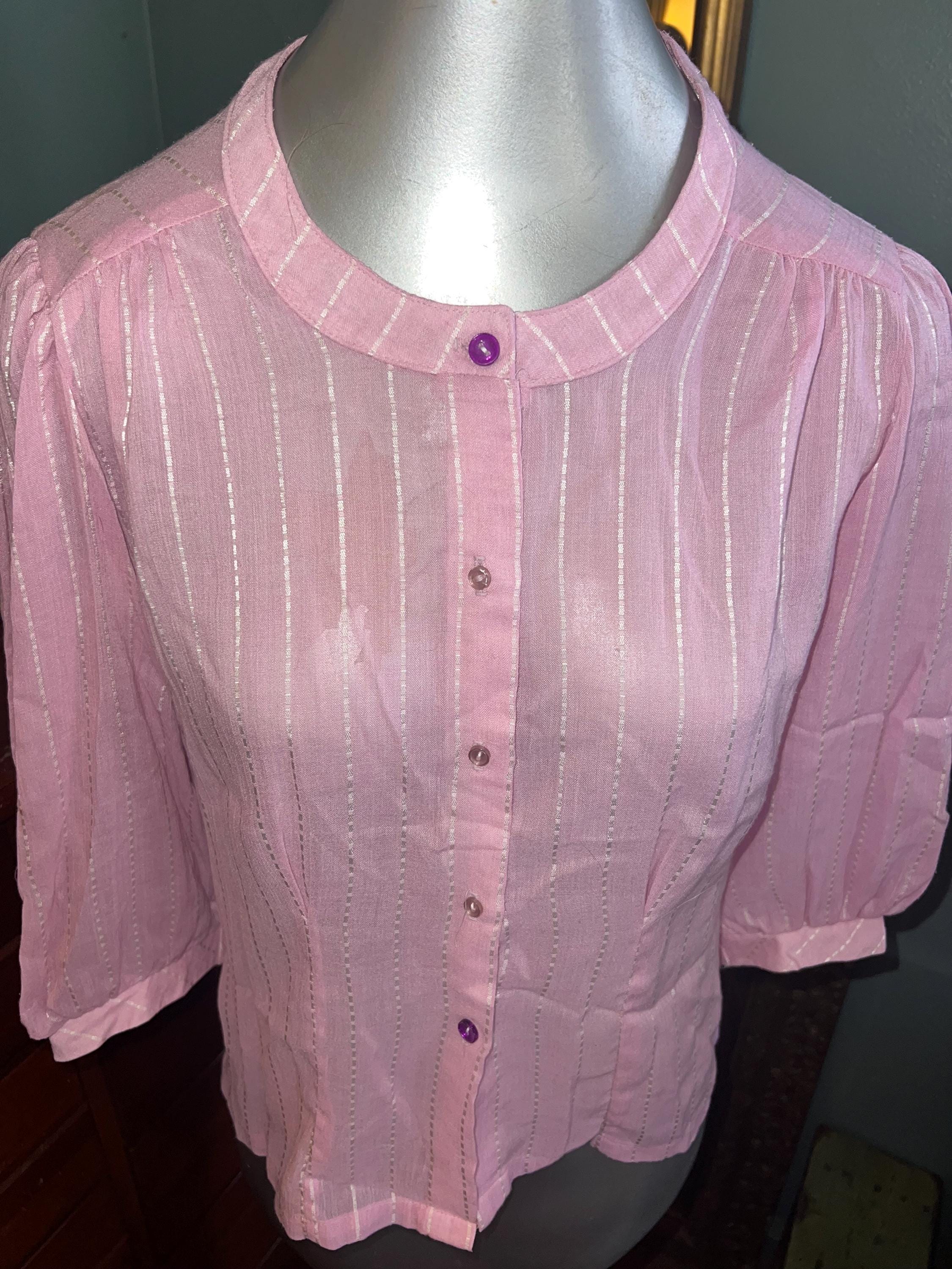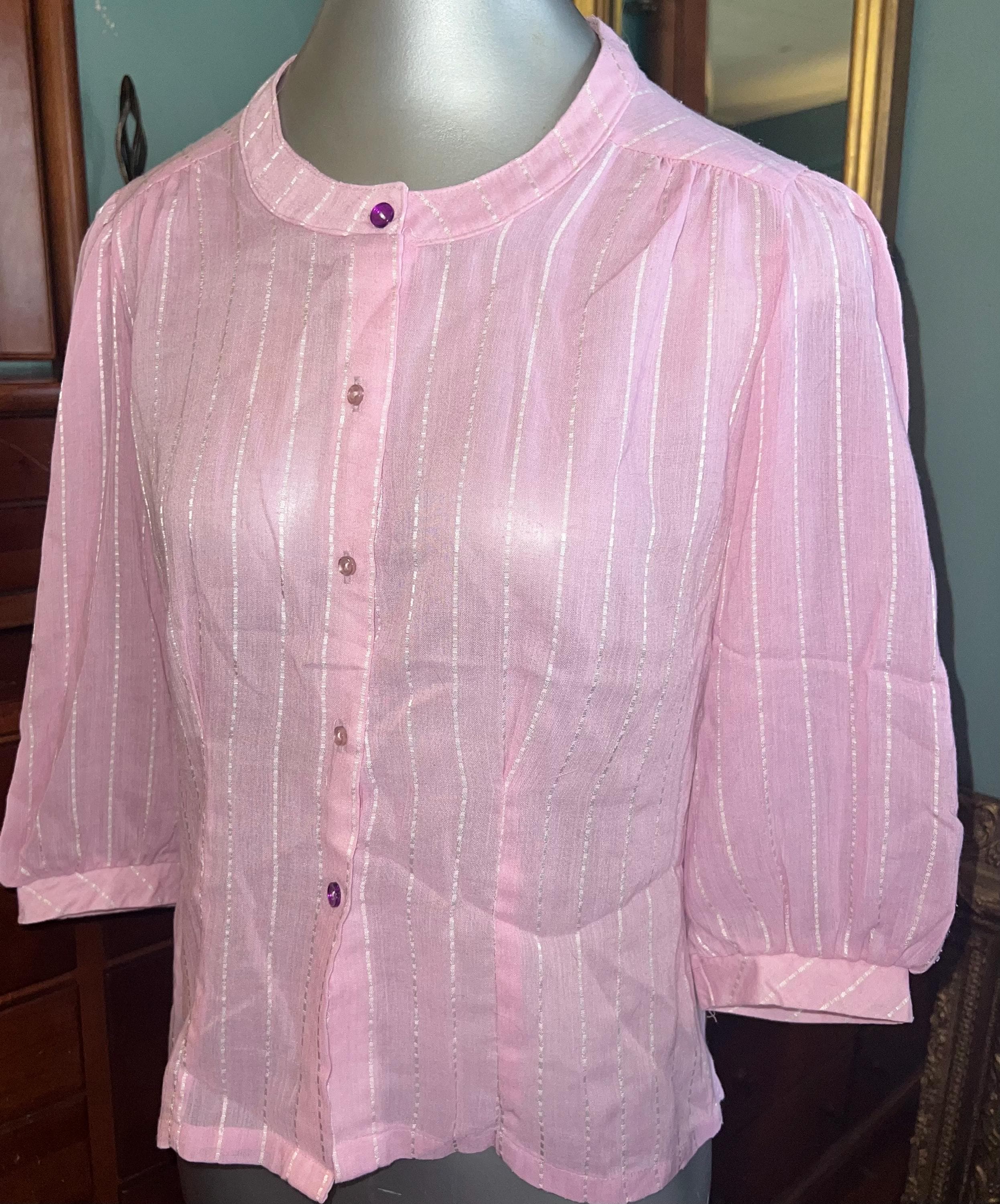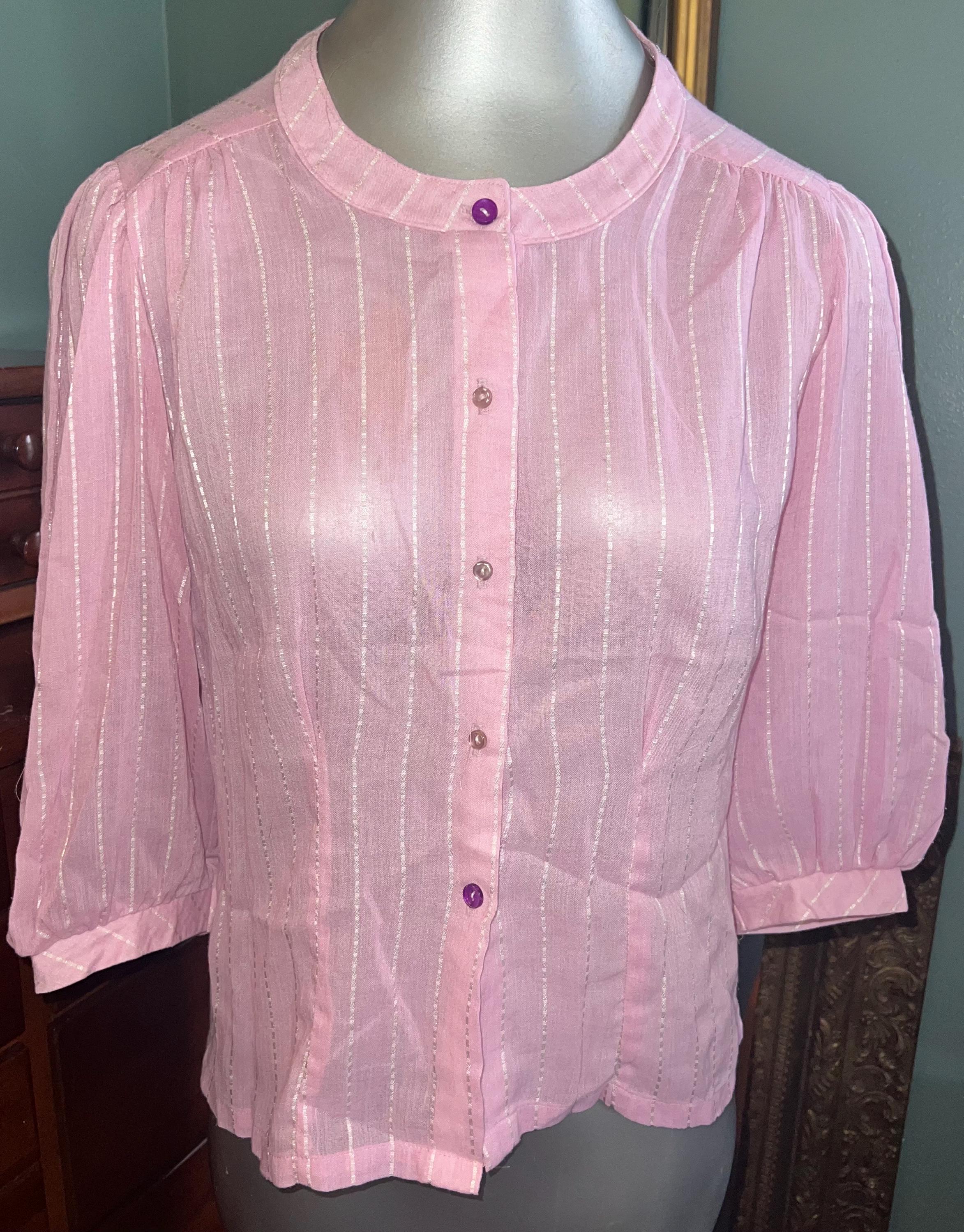This shirt is super cute. It’s a light pretty sheer pink with white dotted stripes. It has two purple buttons but the rest are white, (see photos). It’s in good vintage condition.