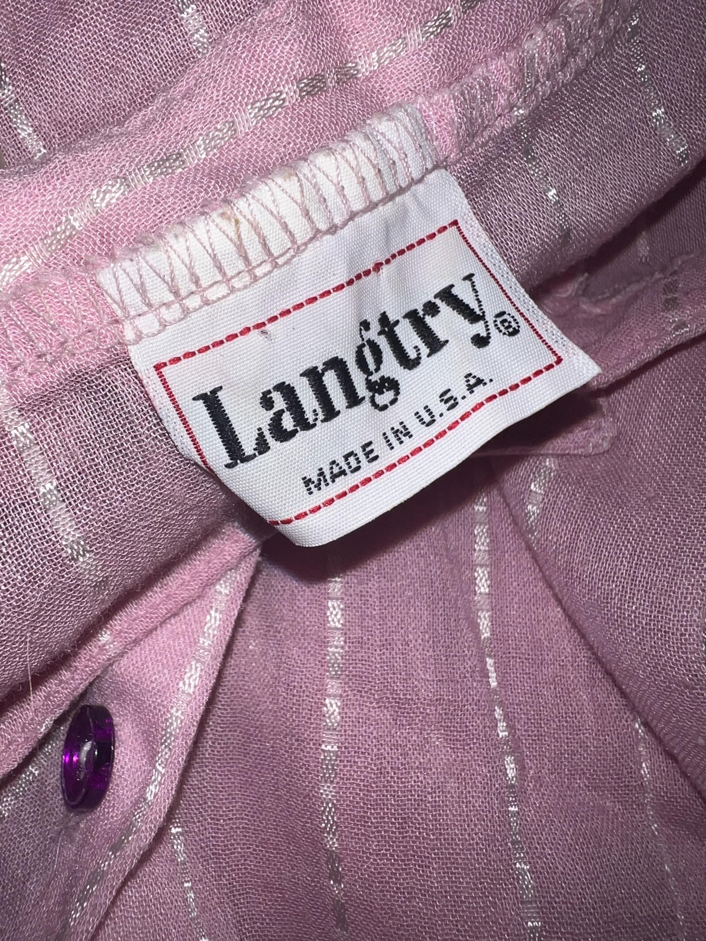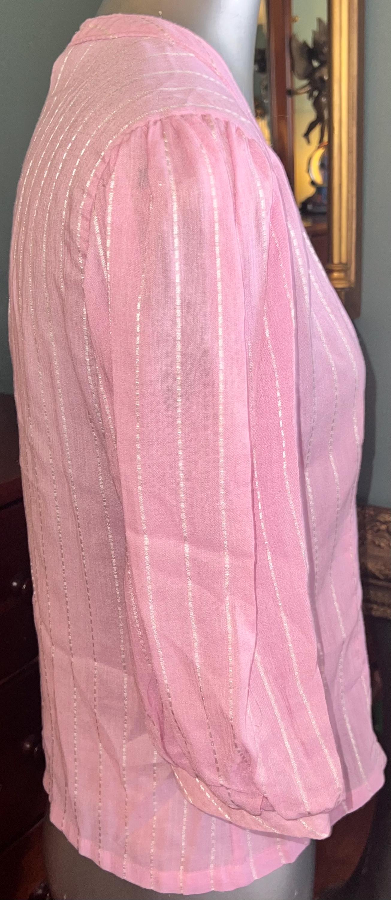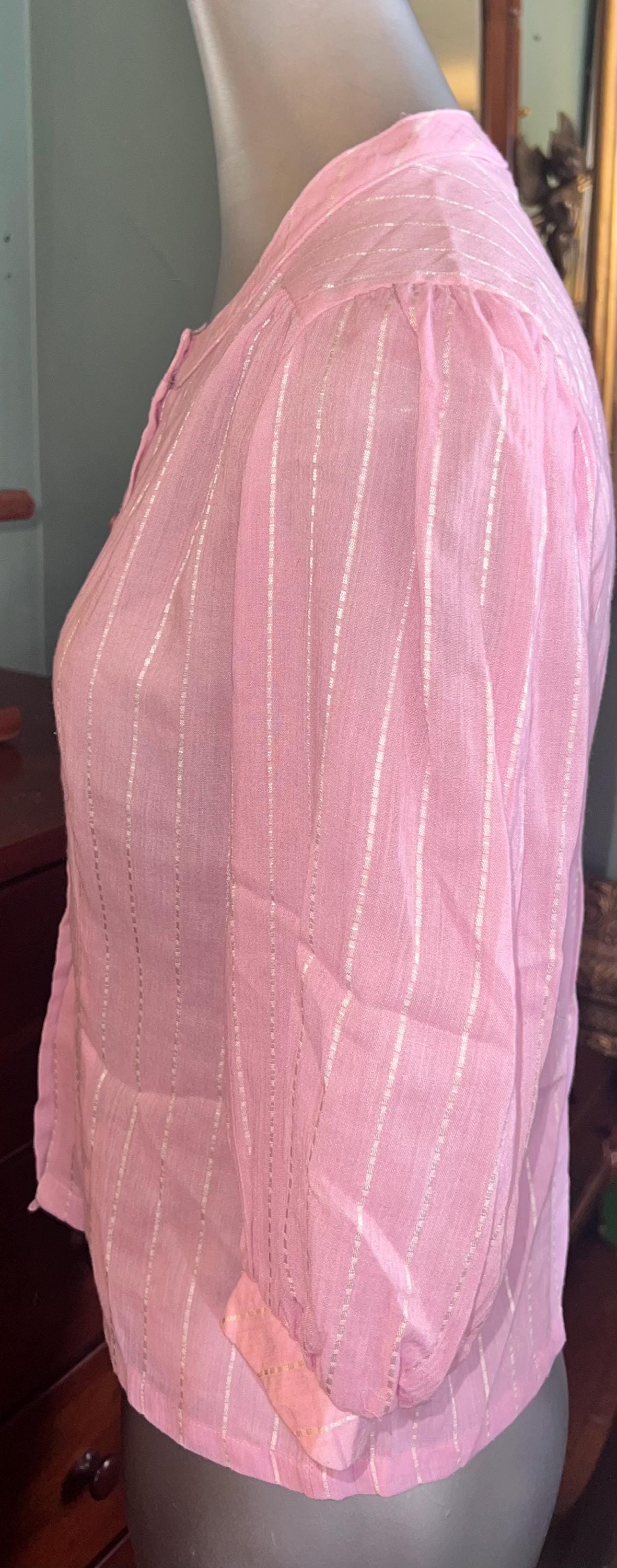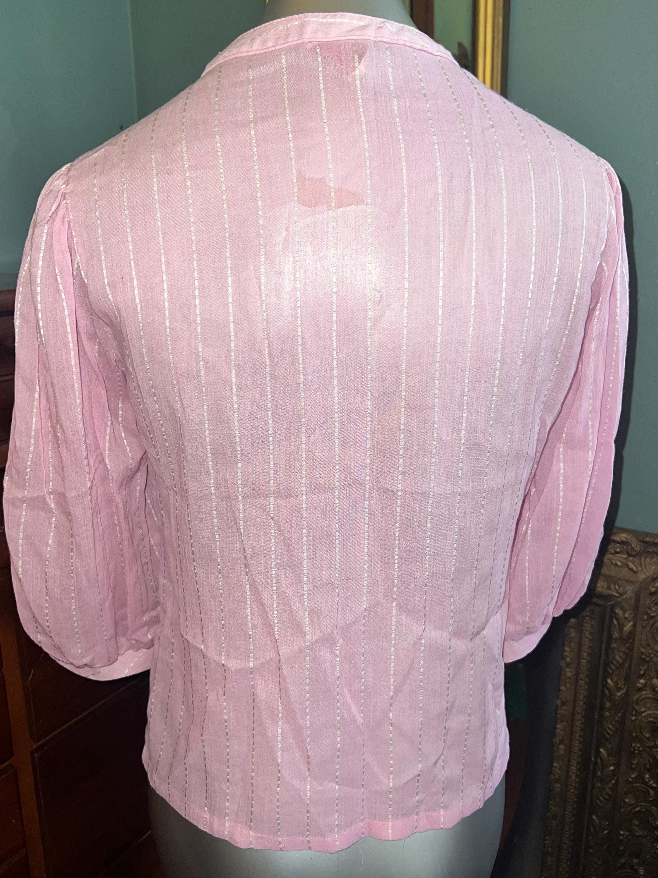 This shirt is super cute. It’s a light pretty sheer pink with white dotted stripes. It has two purple buttons but the rest are white, (see photos). It’s in good vintage condition.