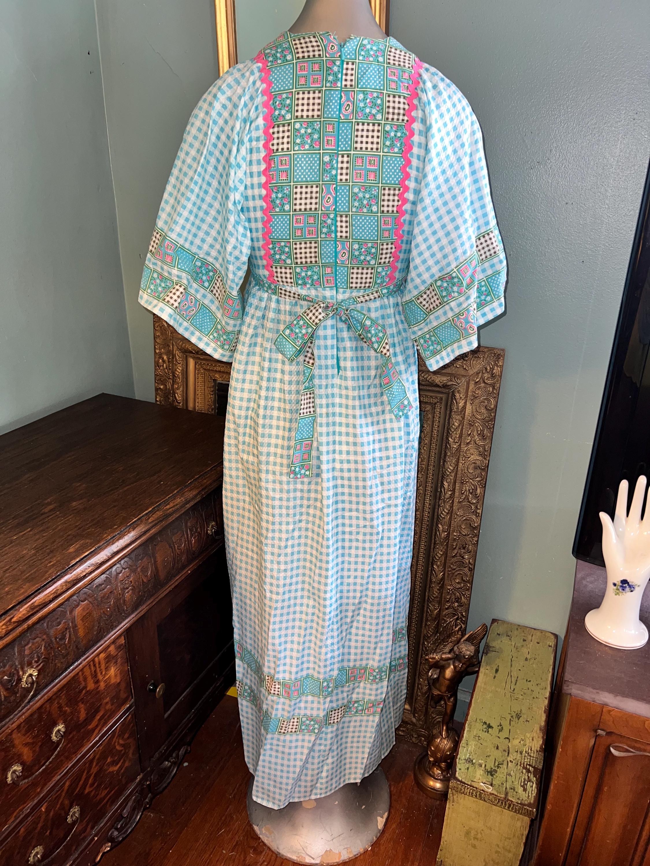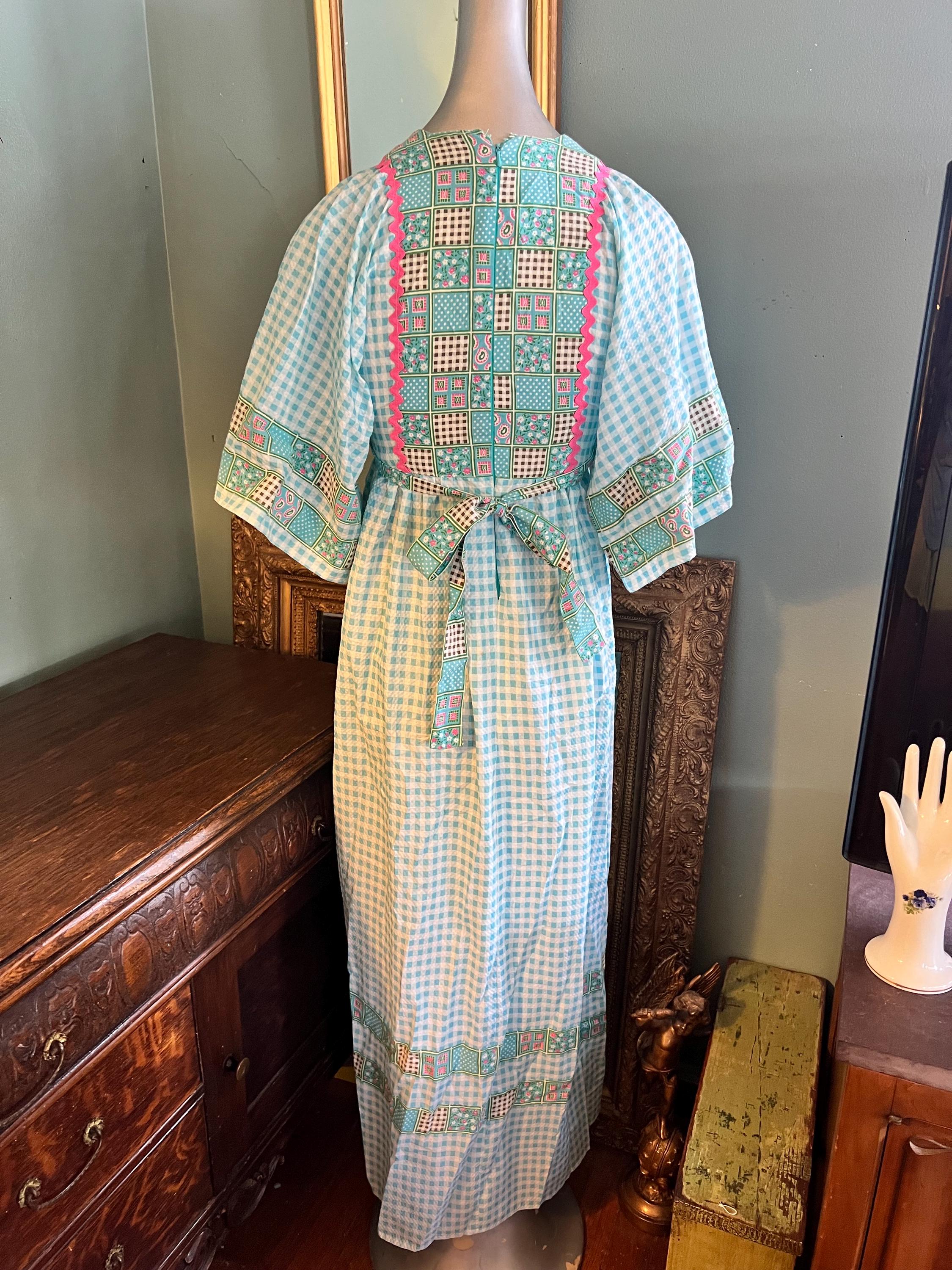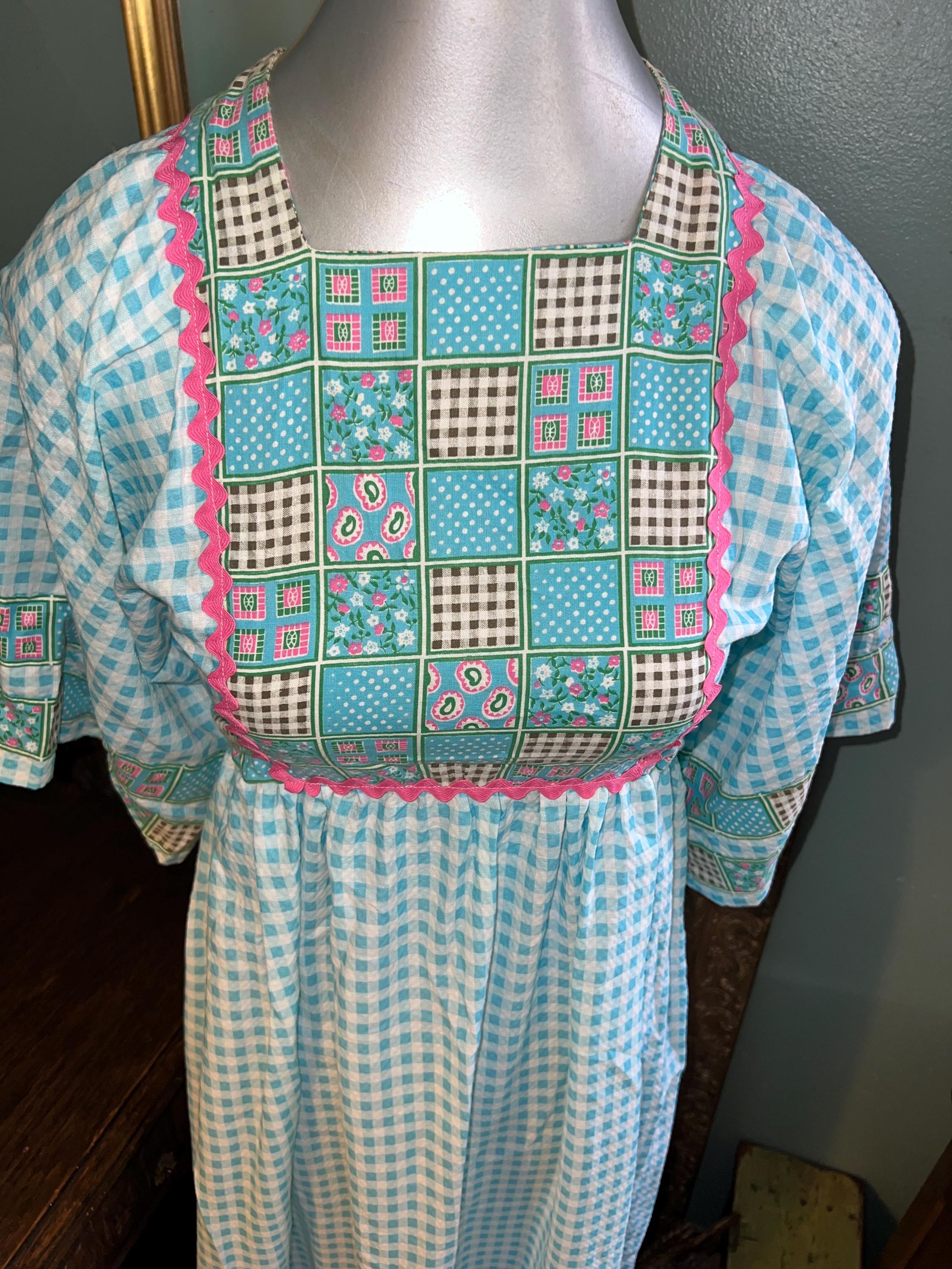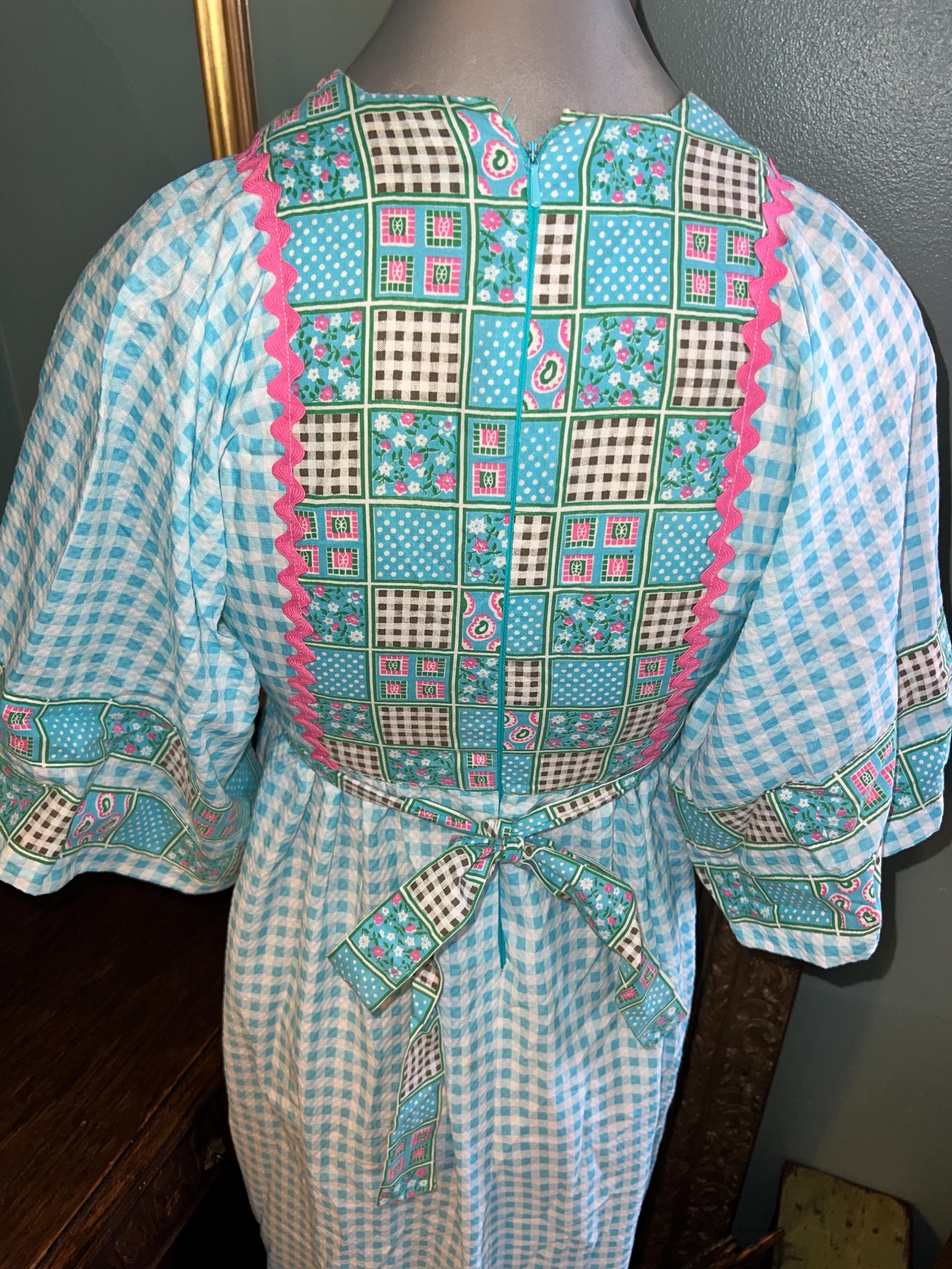 This is an adorable blue and white gingham with a cool patchwork design with pink zig zag trim house dress. It zips up the back and ties back at the waist. It’s in good vintage condition.