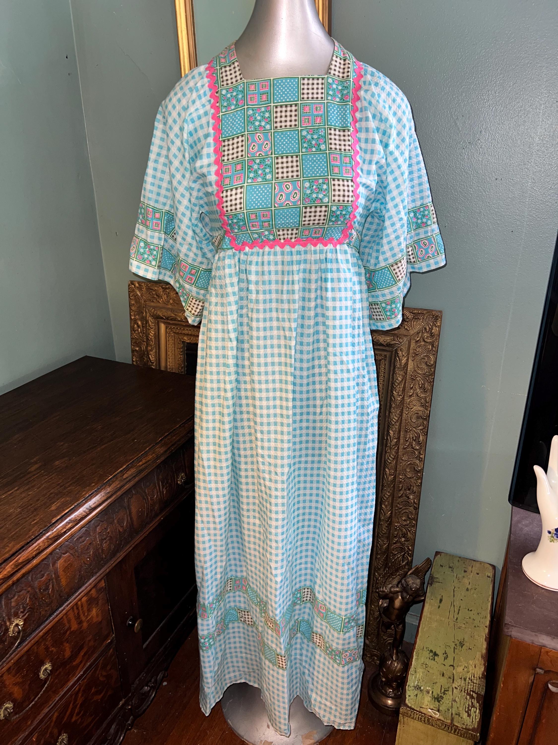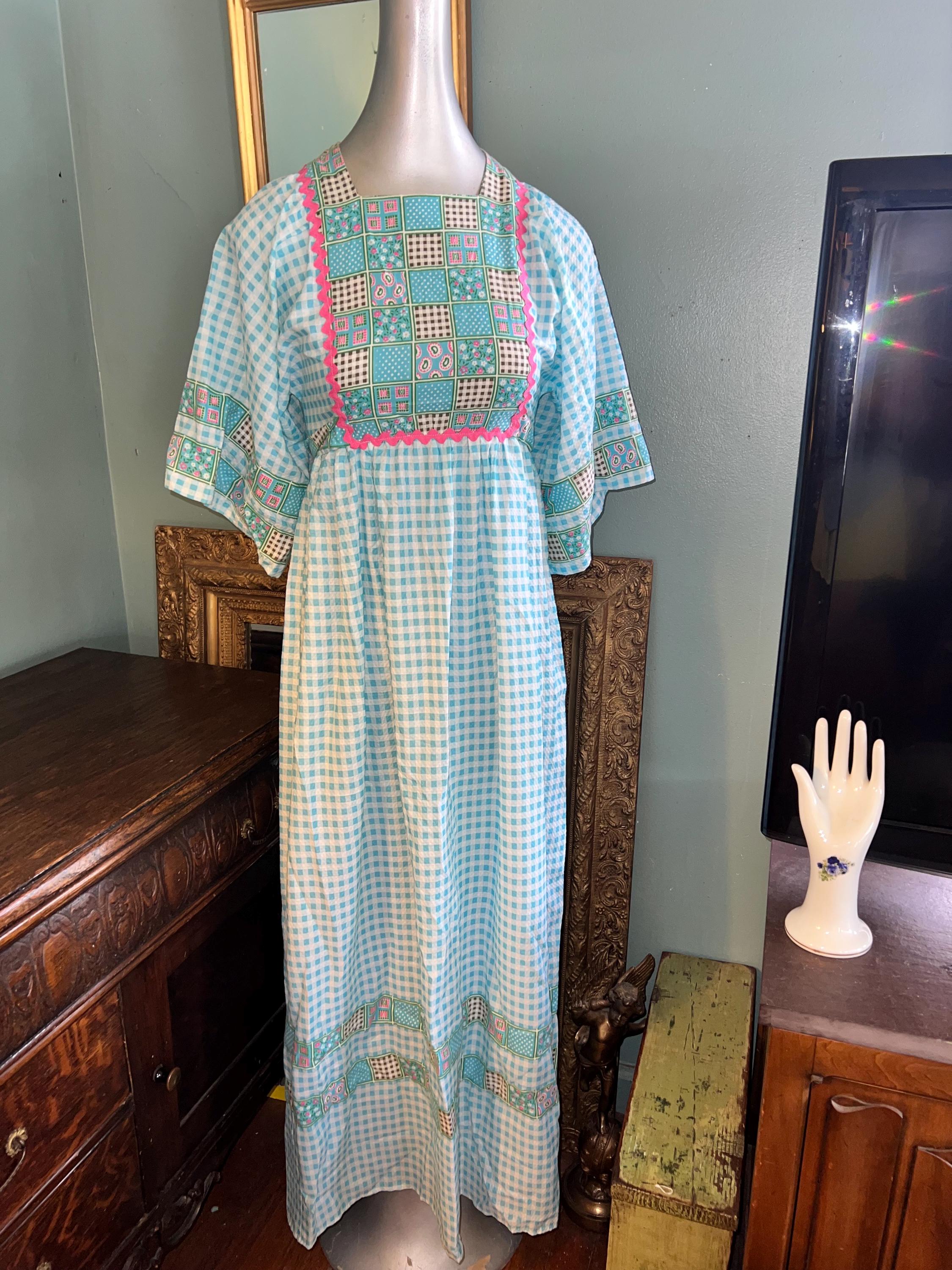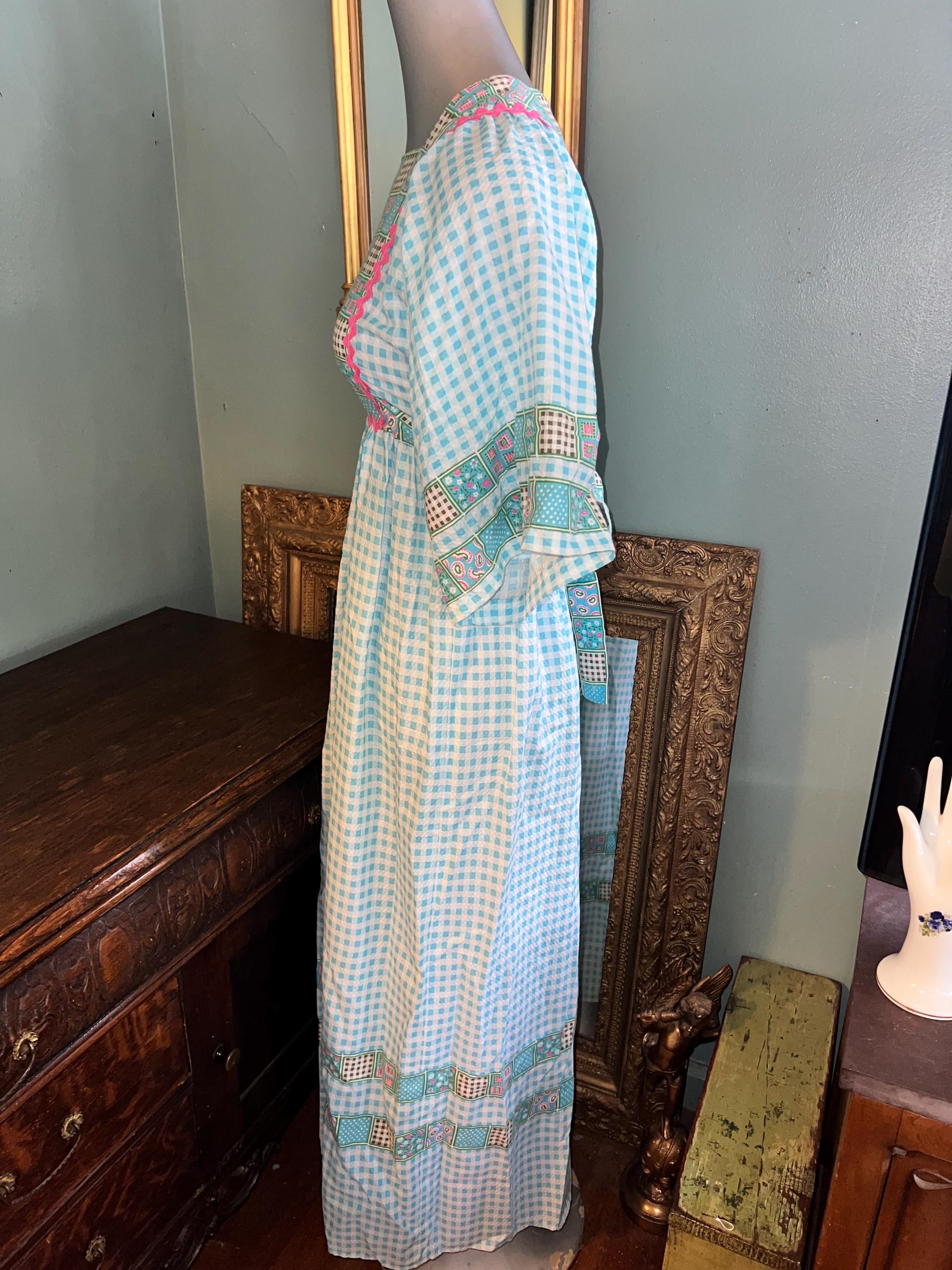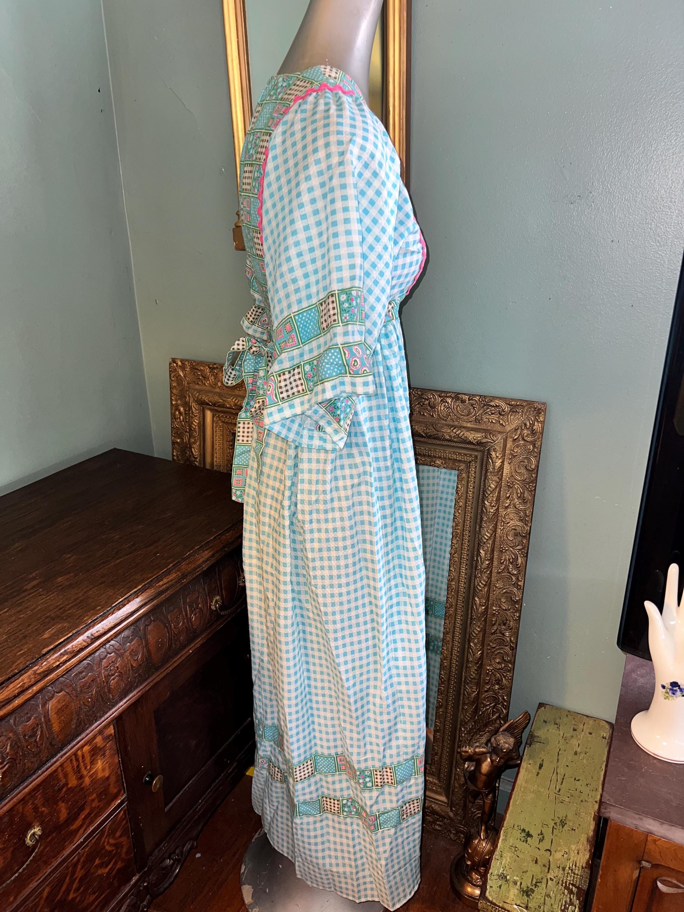 This is an adorable blue and white gingham with a cool patchwork design with pink zig zag trim house dress. It zips up the back and ties back at the waist. It’s in good vintage condition.