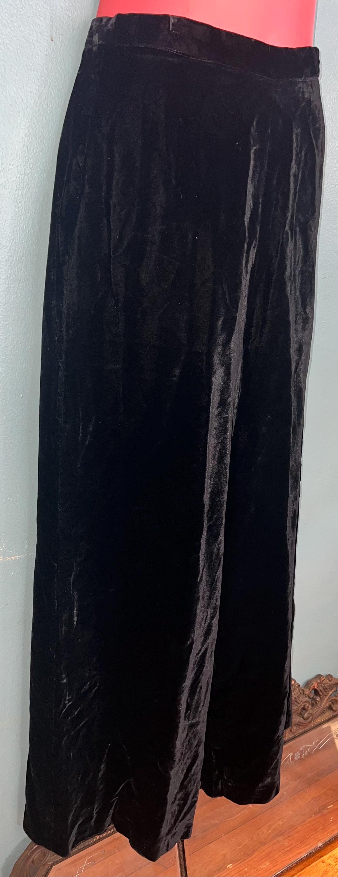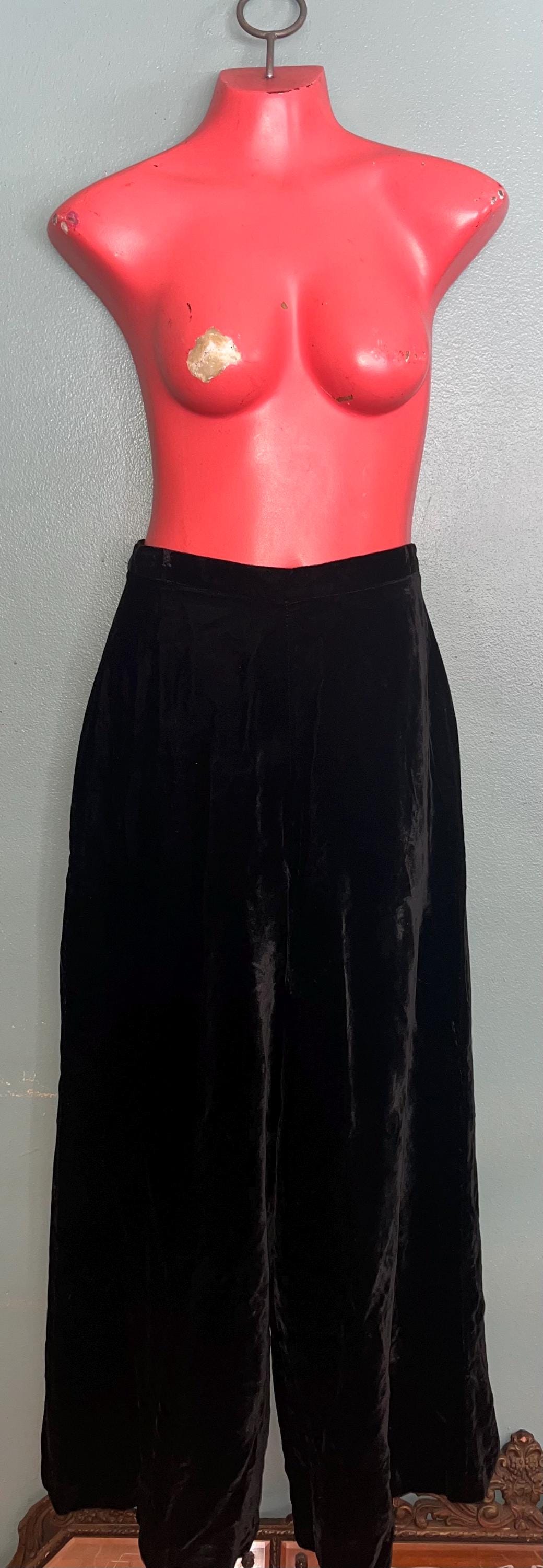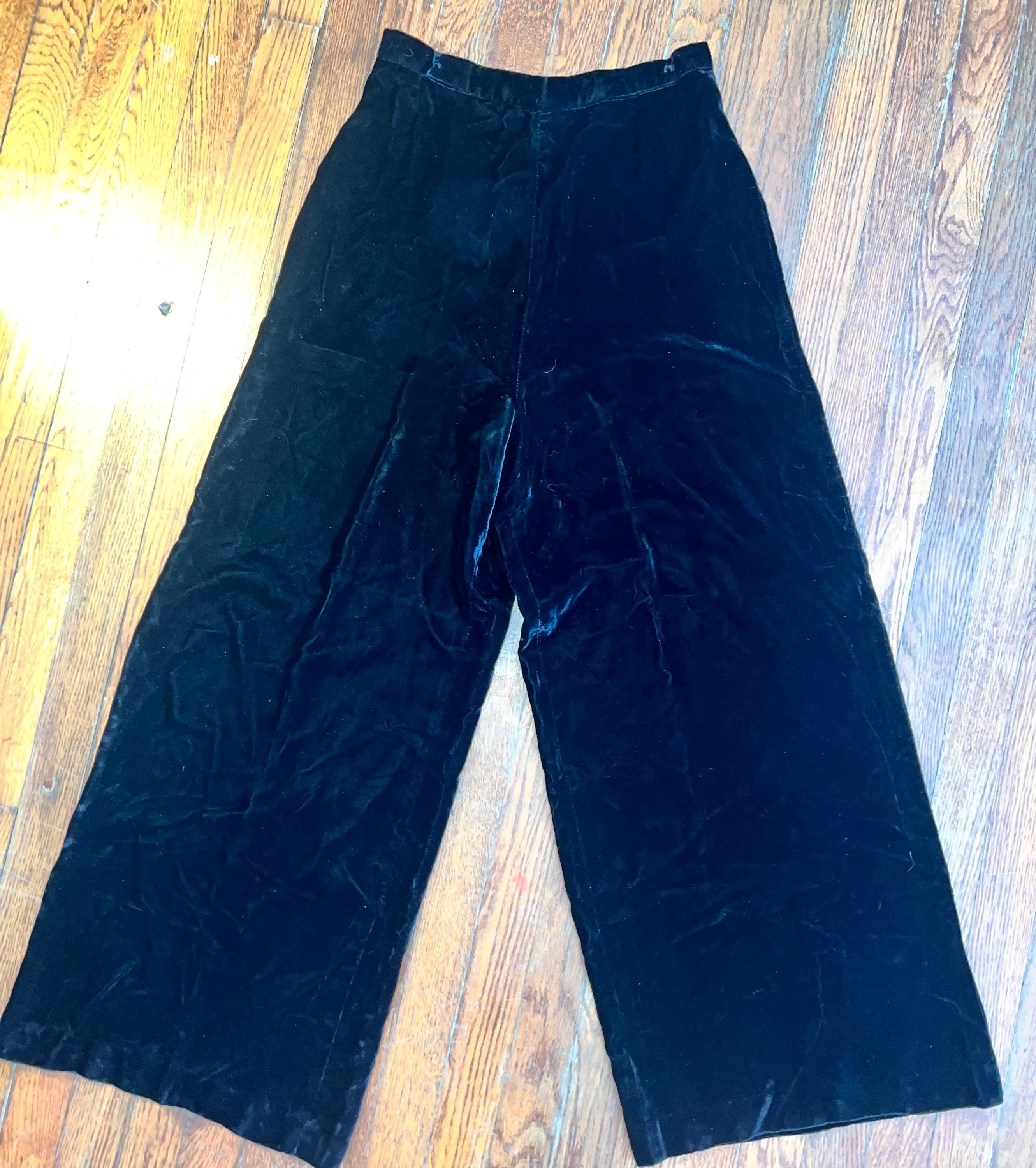 This is an excellent pair of Alex Coleman Pants from the 60’s. They are black velvet with lining, high waisted, and wide legged. No pockets. They are very pretty and in good vintage condition!