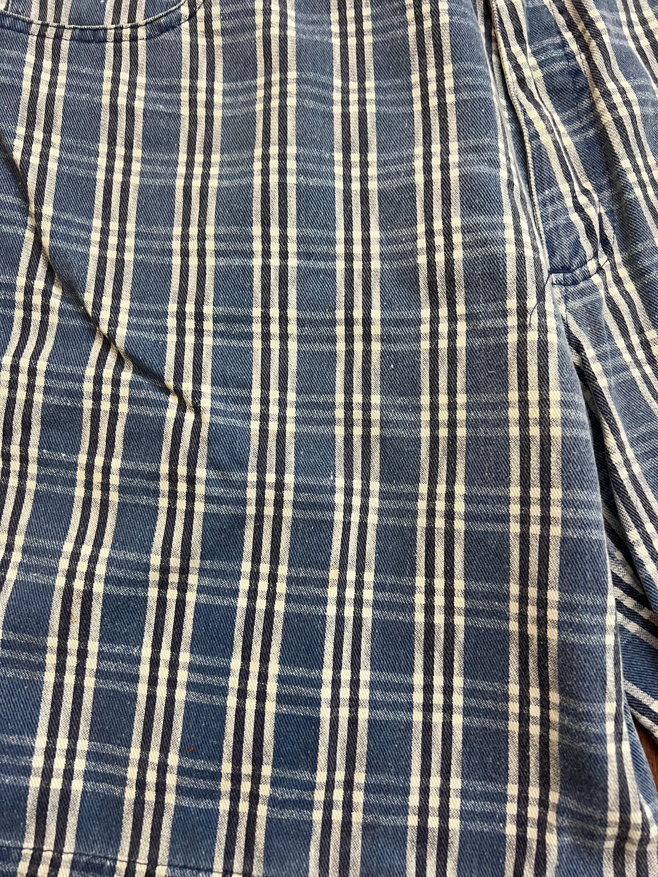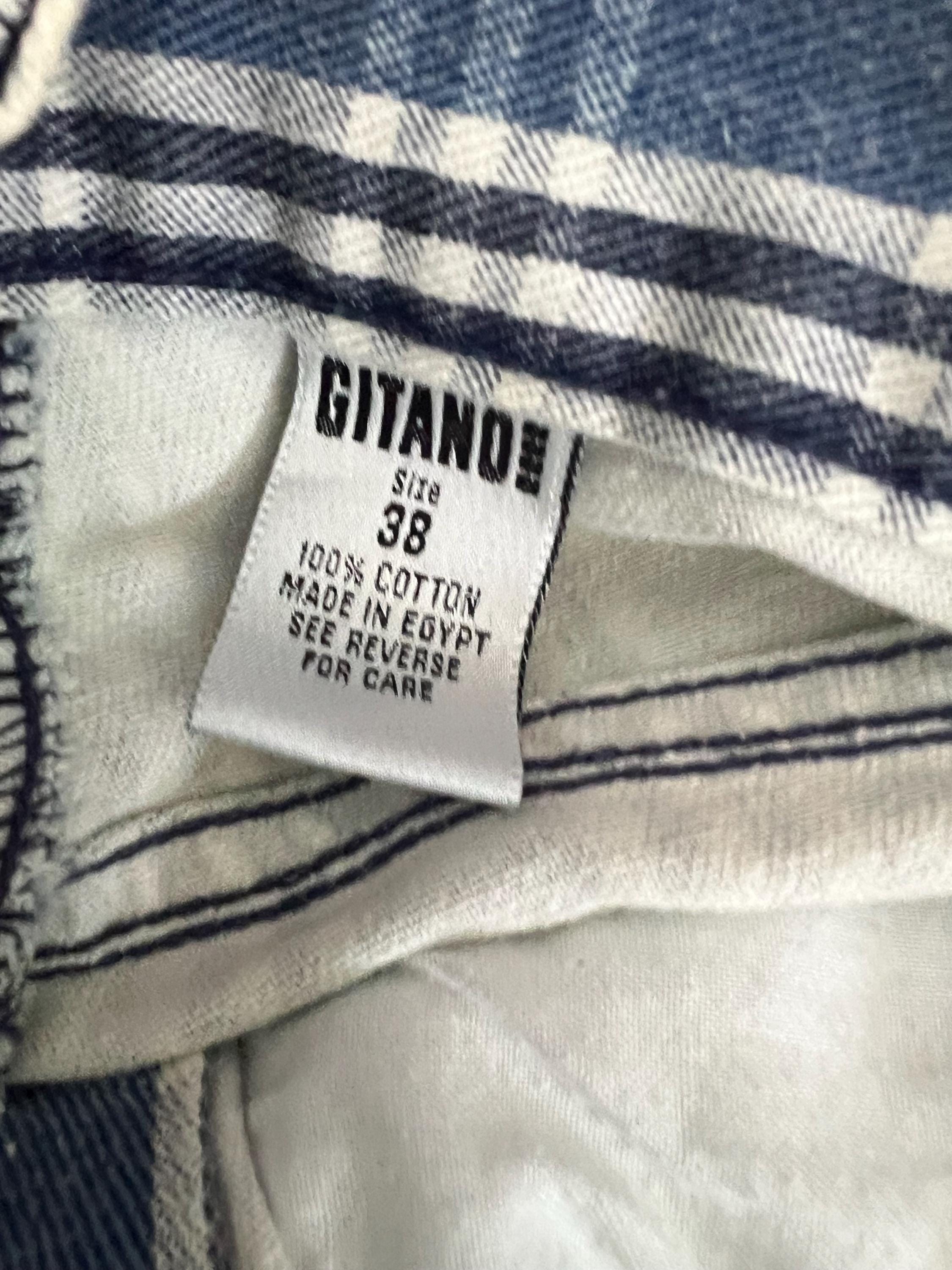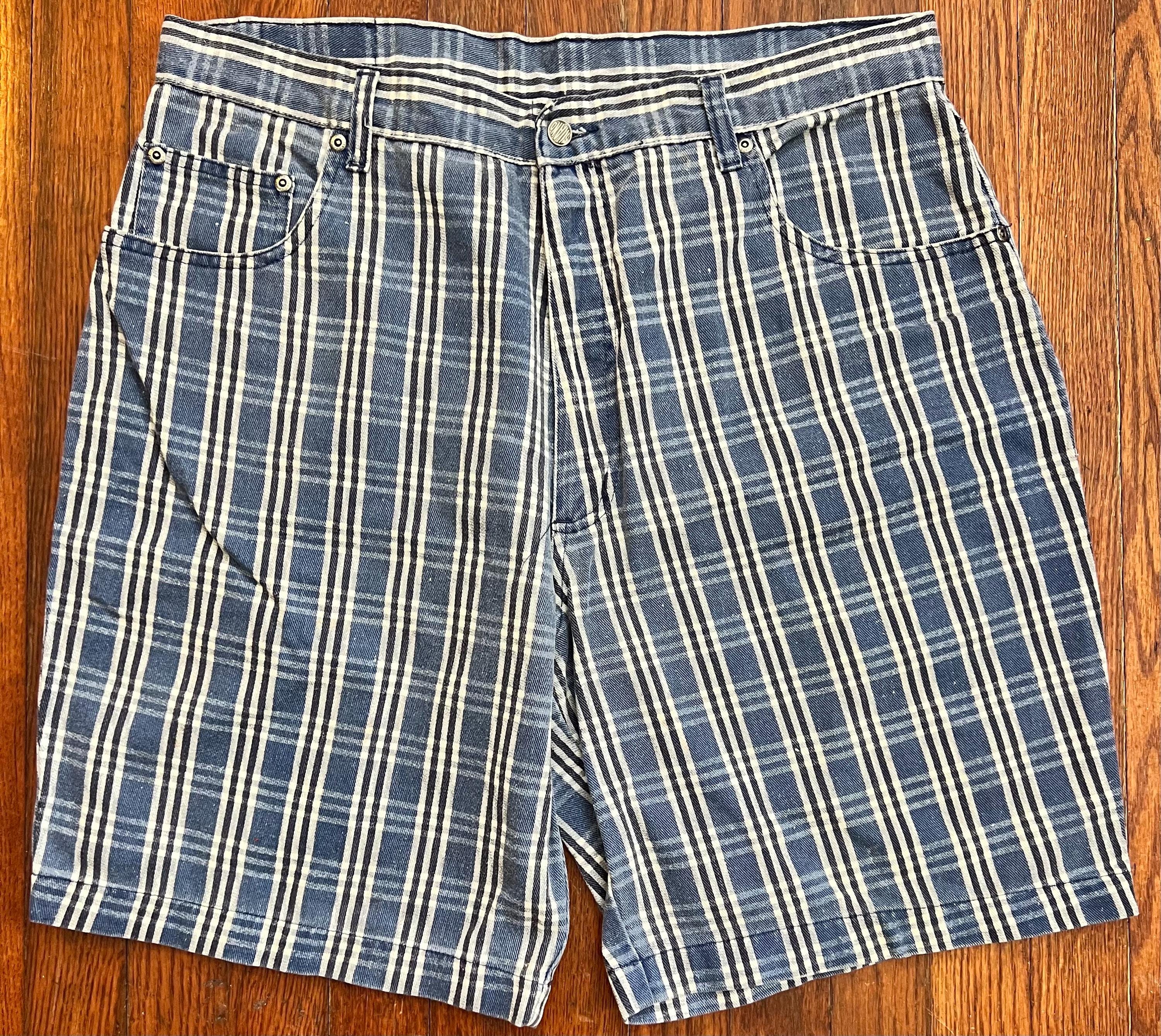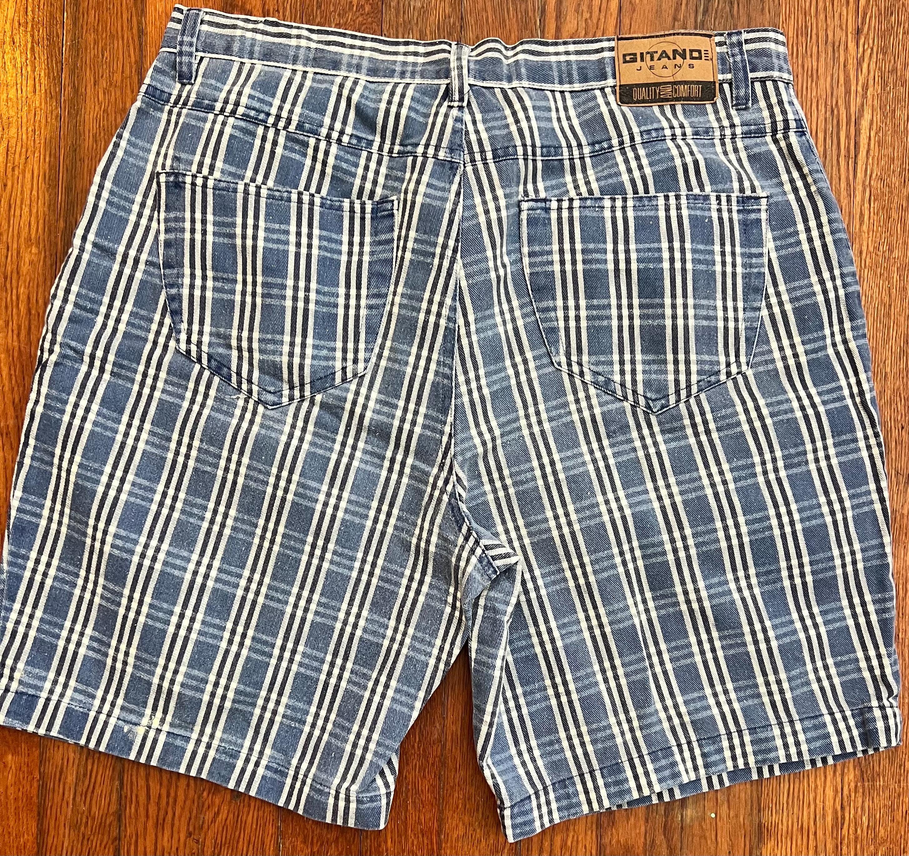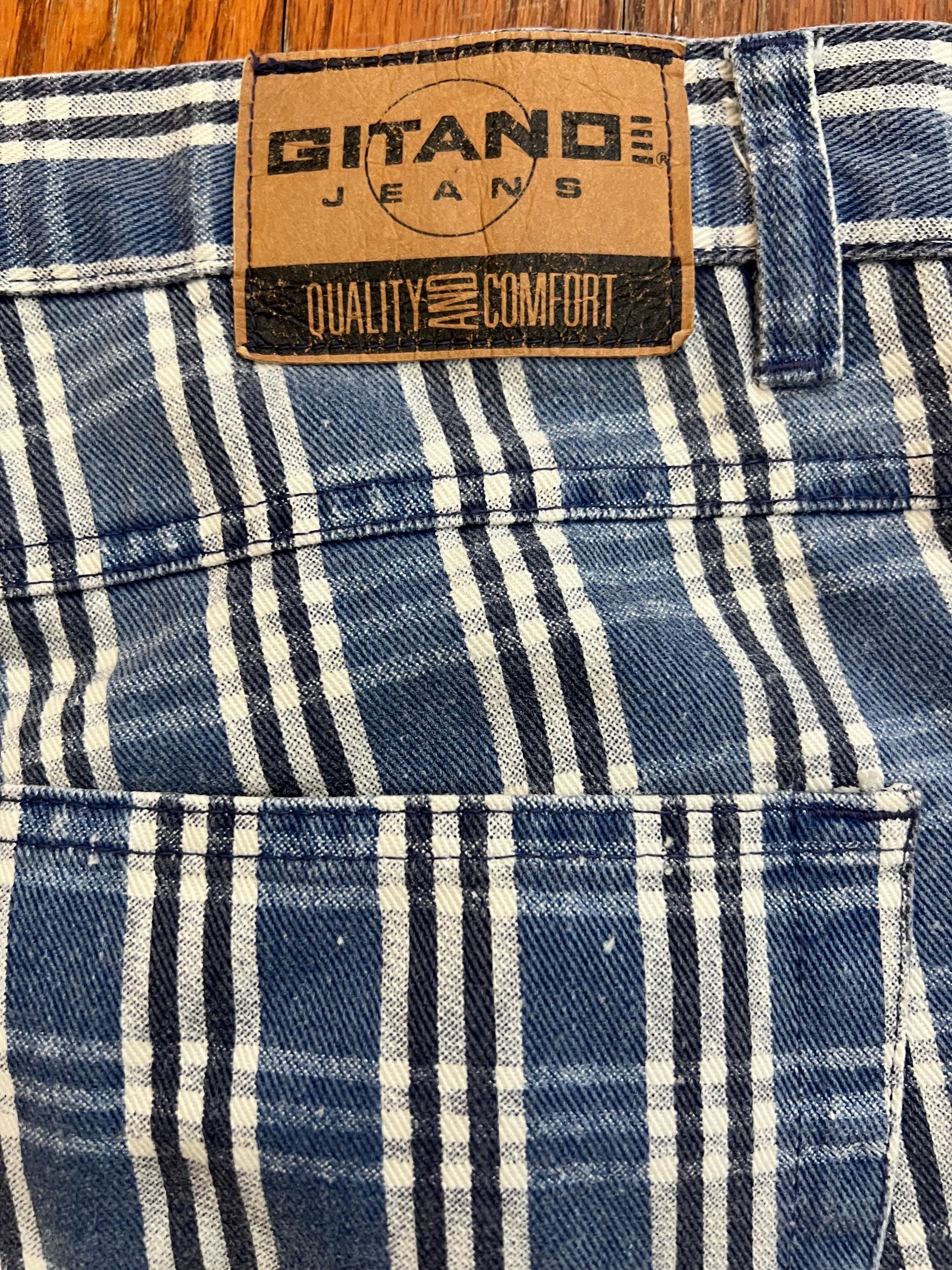 This is a nice pair of 90’s Gitano jean shorts. They have a neat blue and white striped pattern on them. They are in good vintage condition.