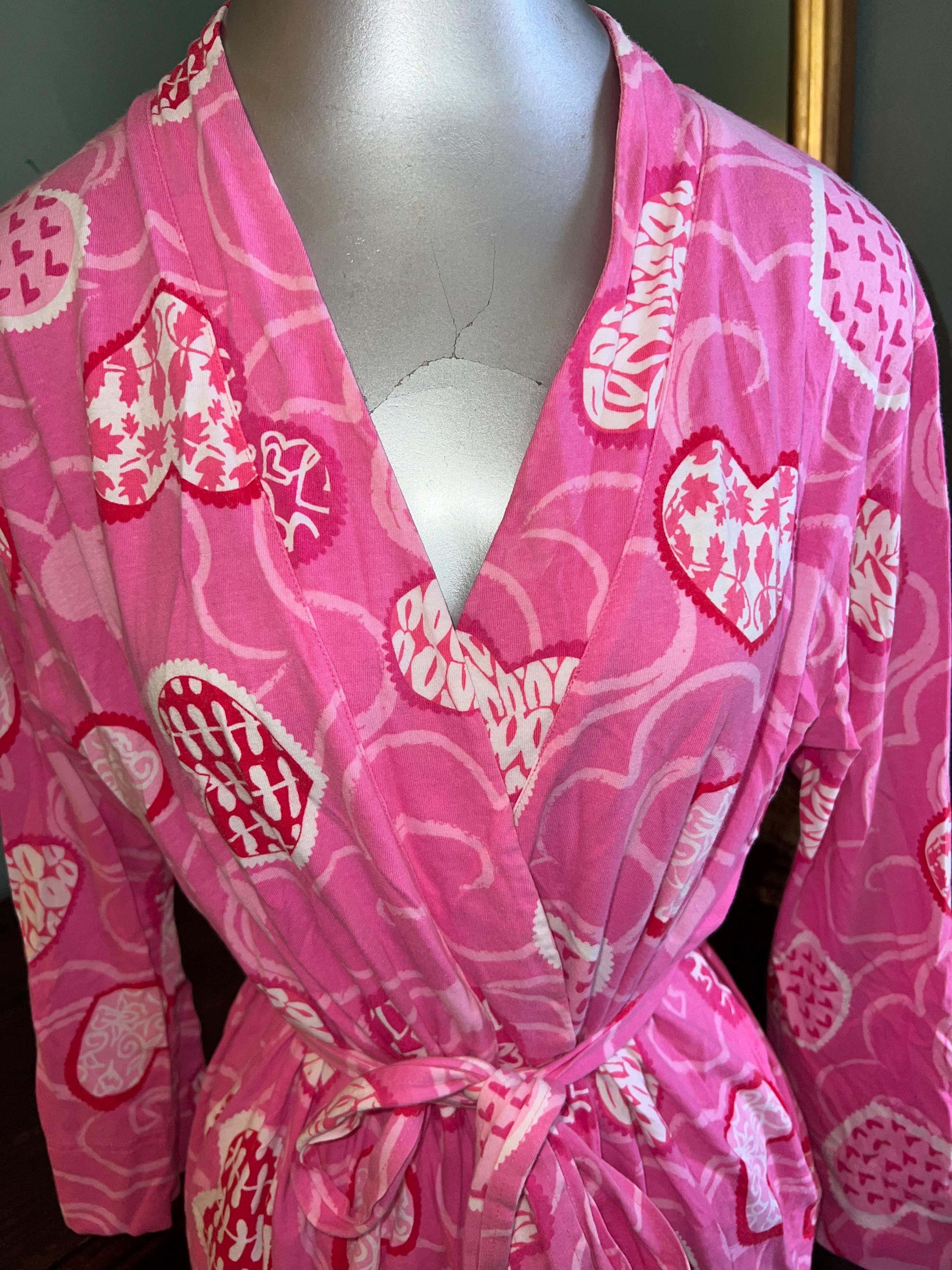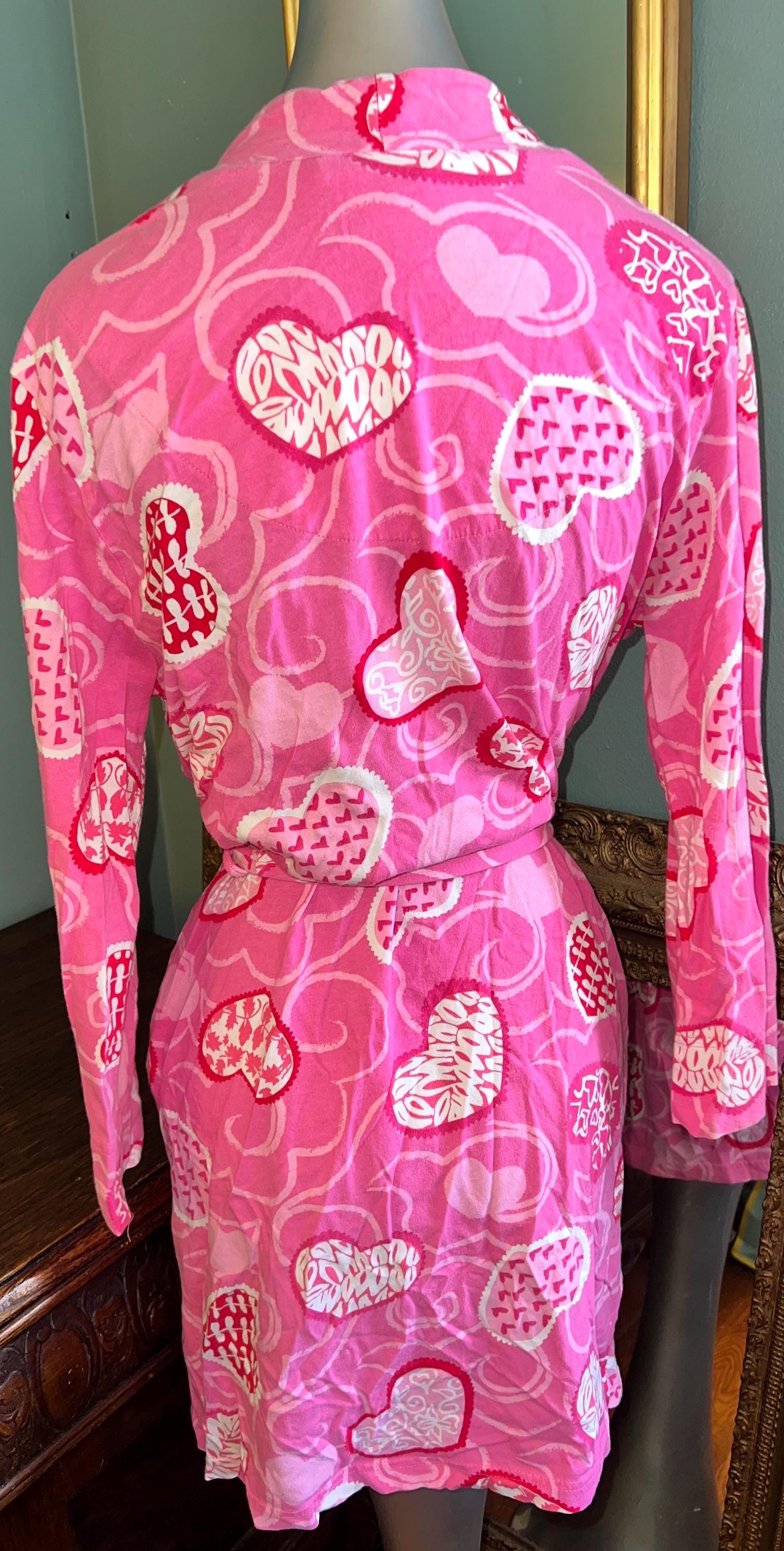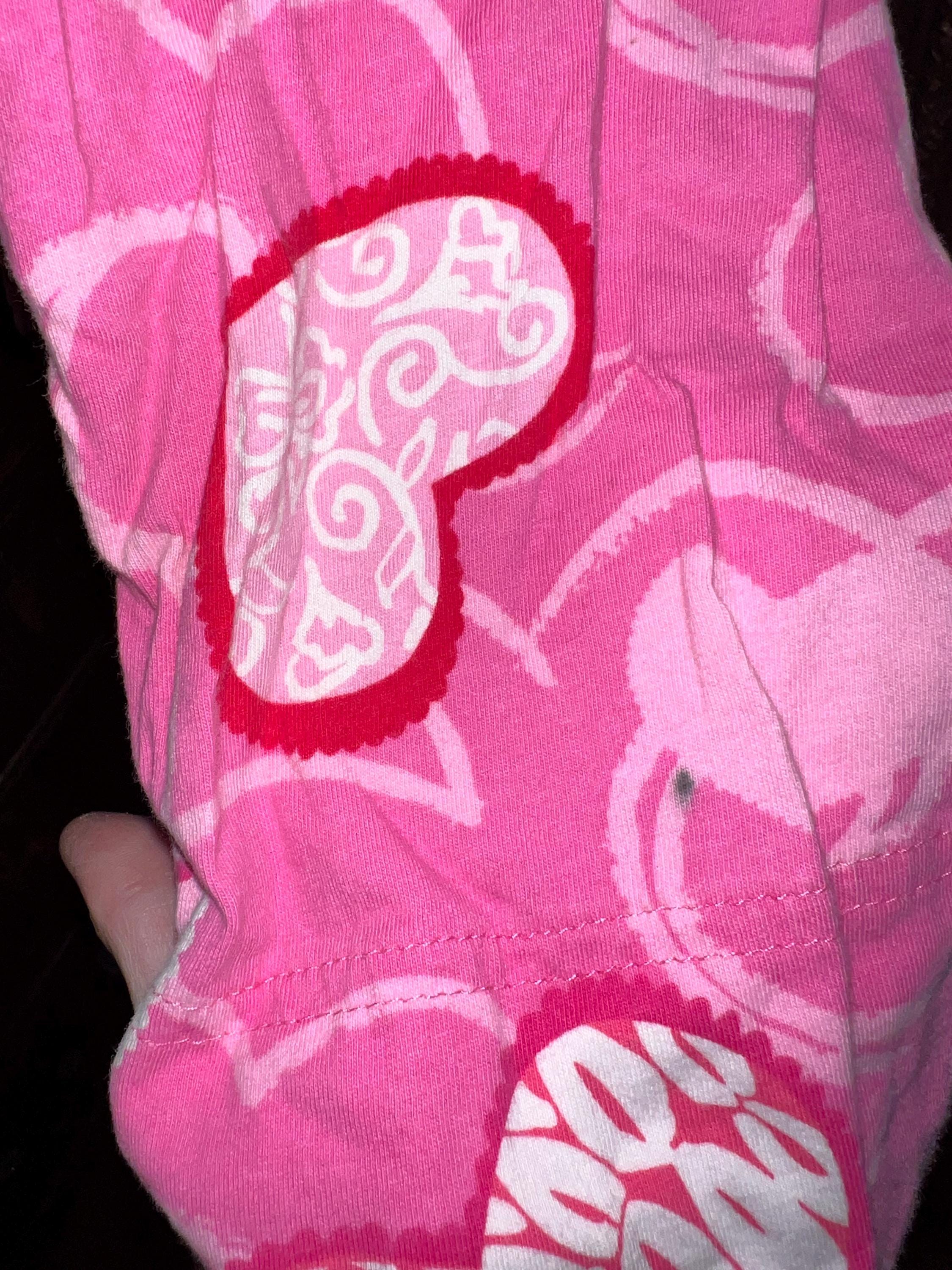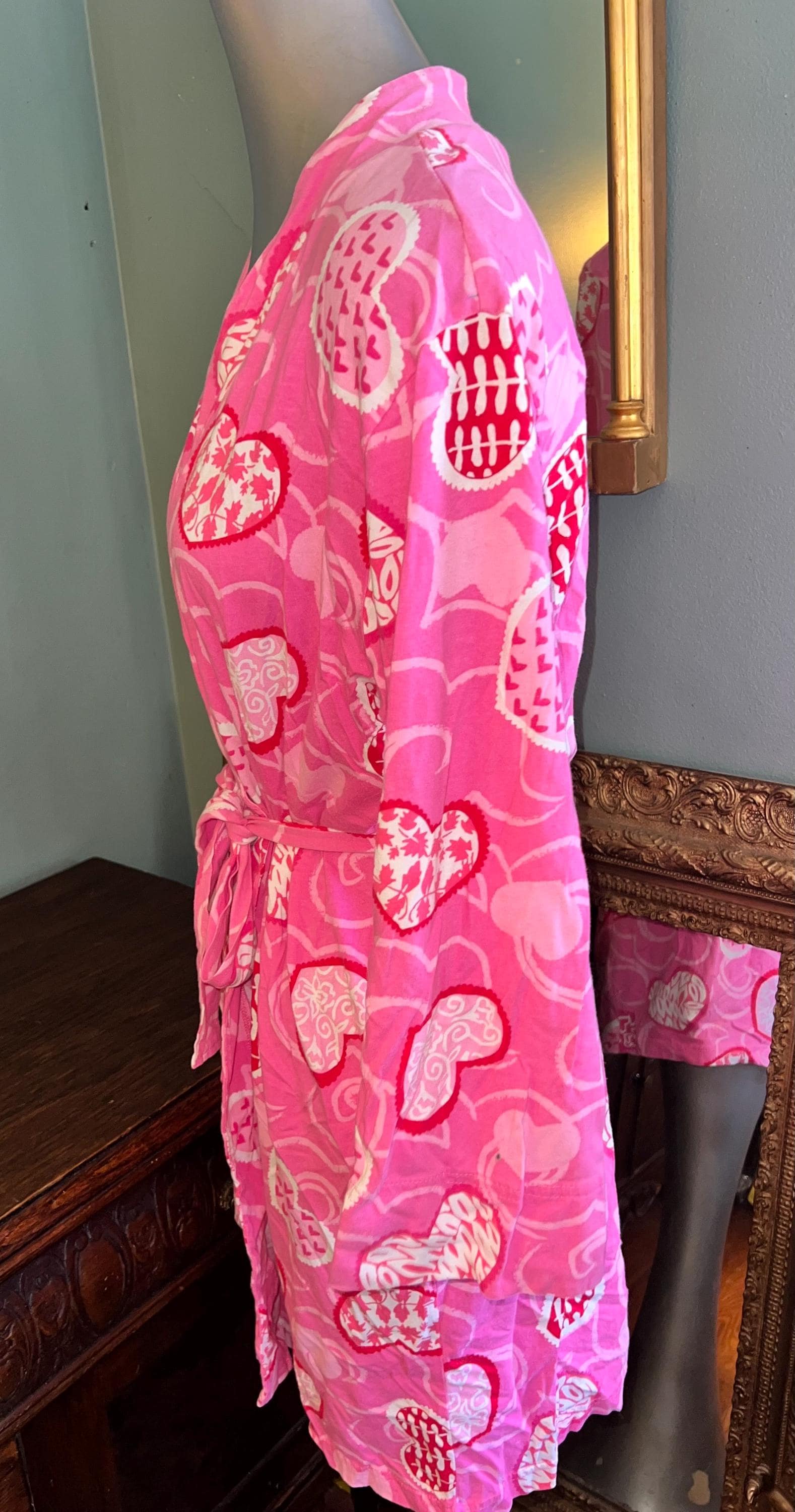This is so cute! It’s a simple cotton pink, red and white with hearts all over it. It’s in good vintage condition, BUT if you look at the last photo there is a tiny black mark on the arm.