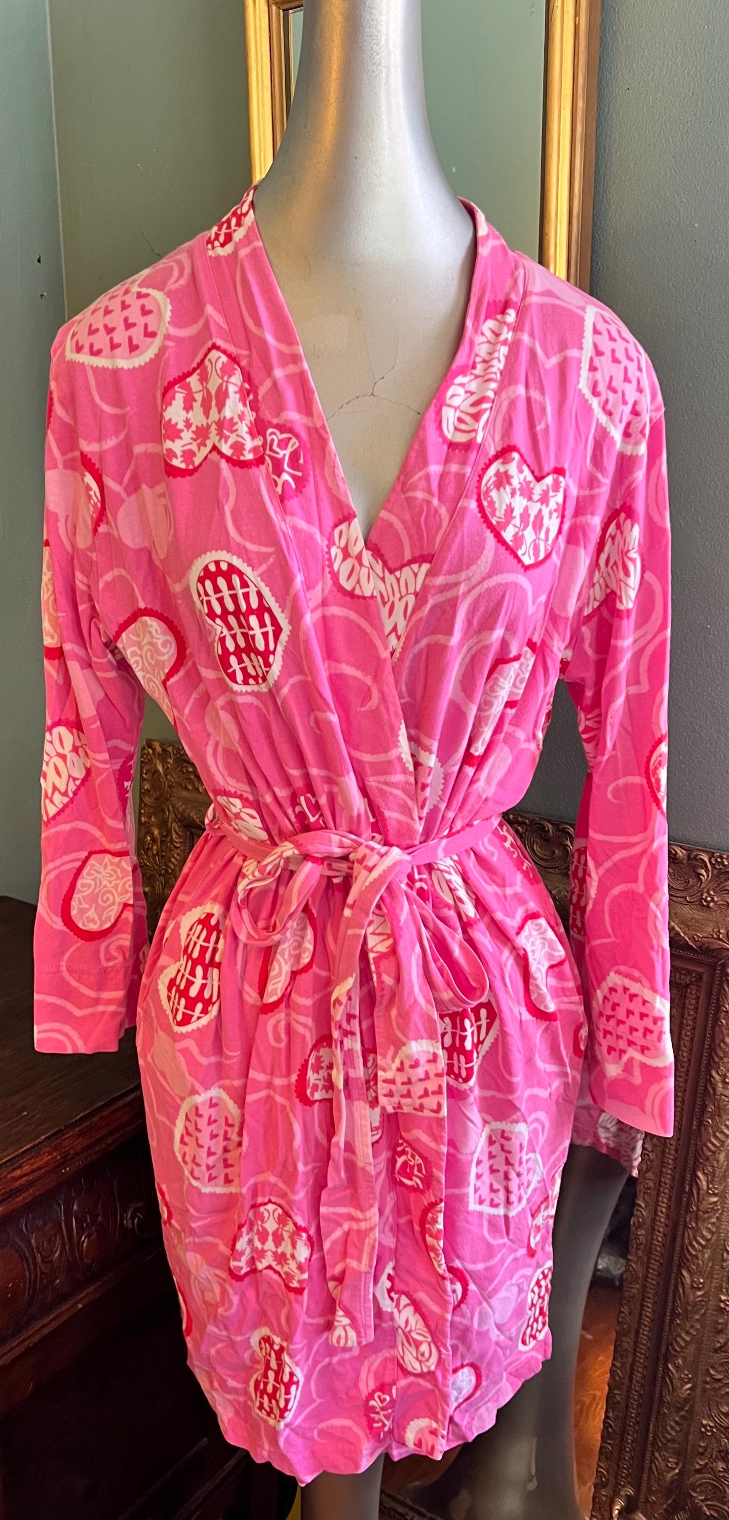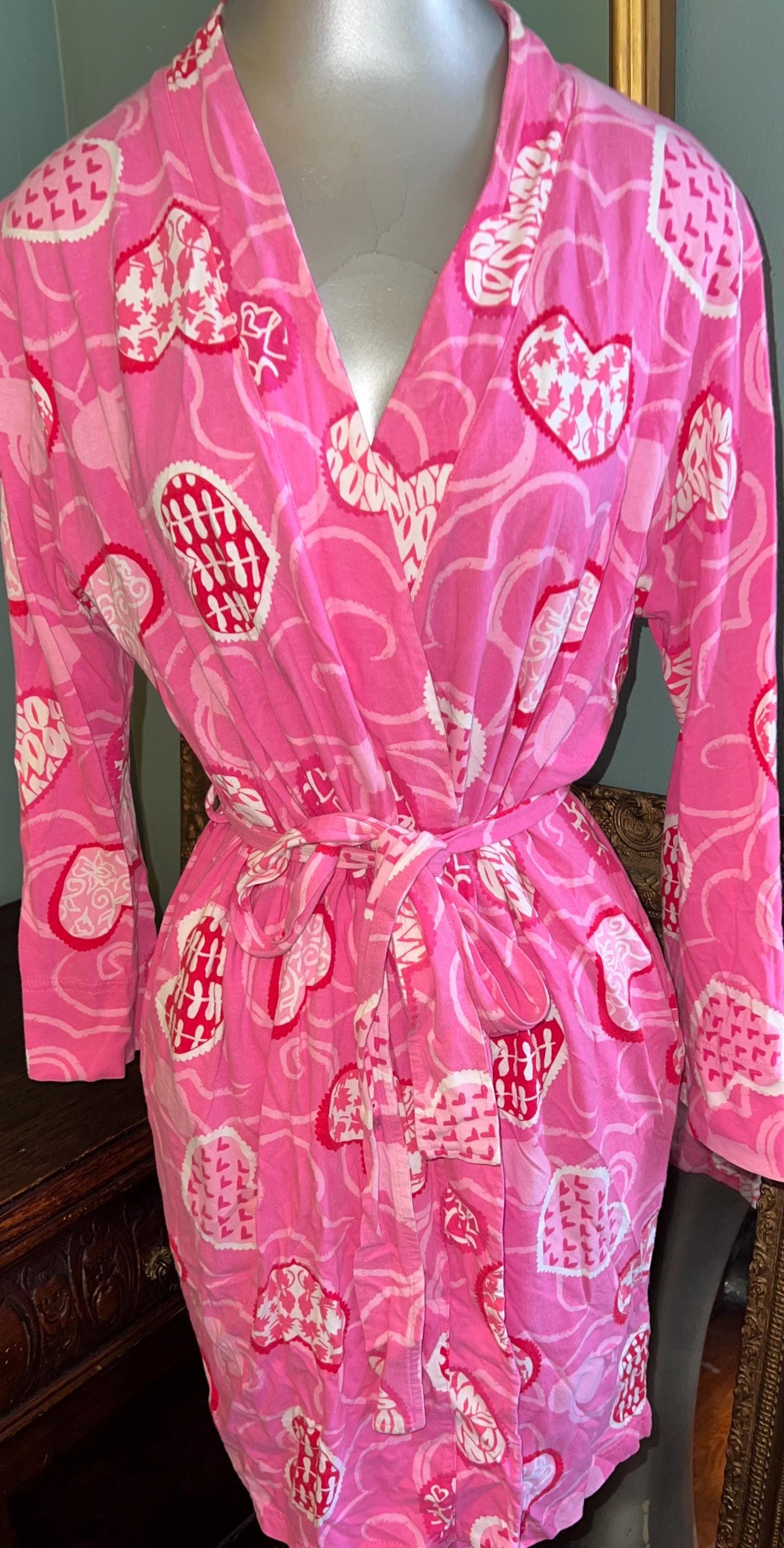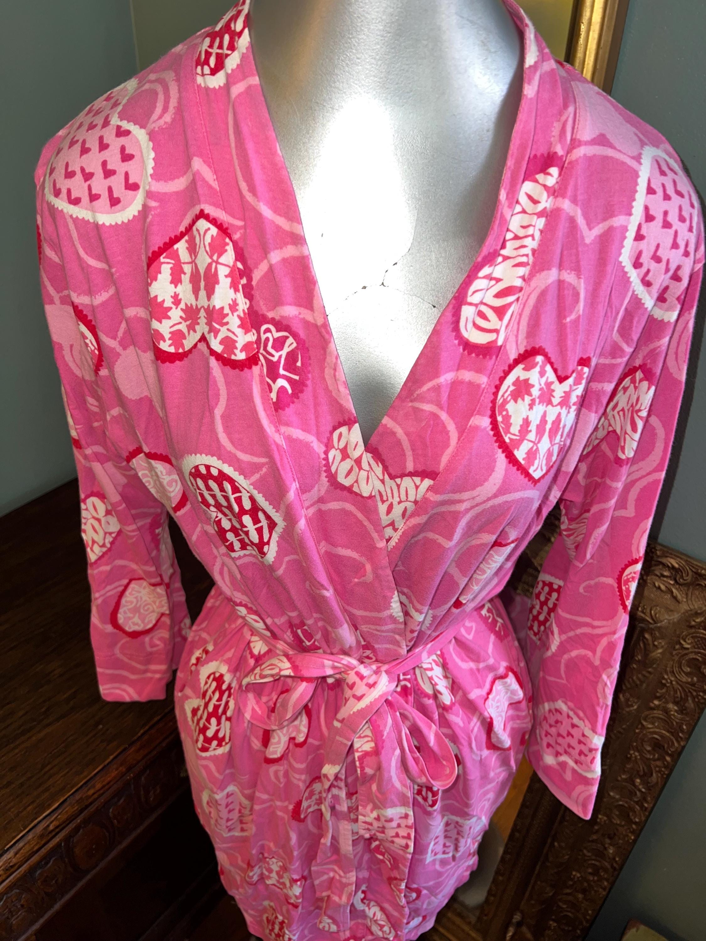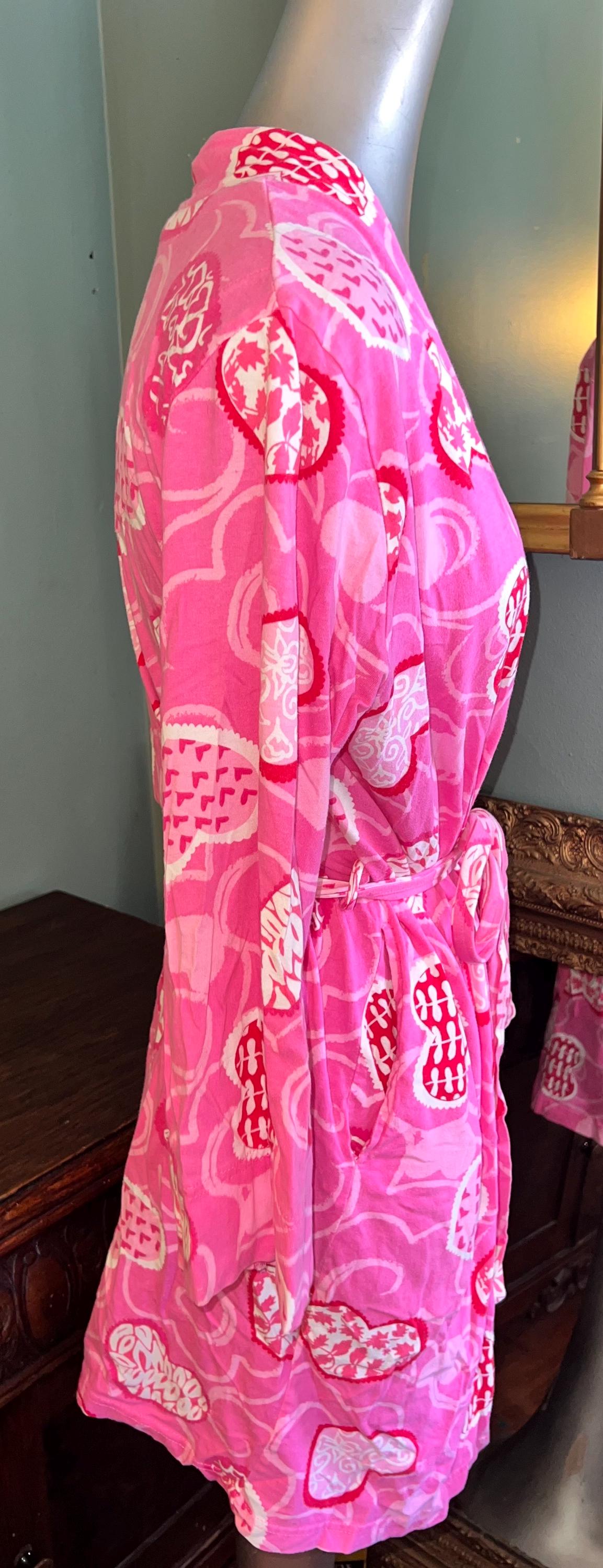 This is so cute! It’s a simple cotton pink, red and white with hearts all over it. It’s in good vintage condition, BUT if you look at the last photo there is a tiny black mark on the arm.