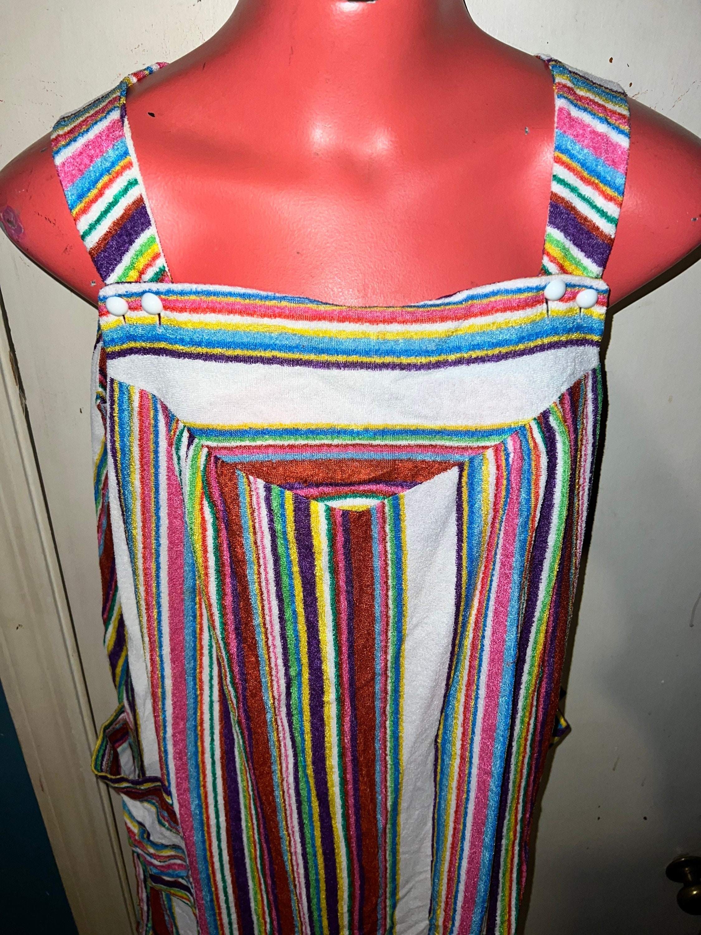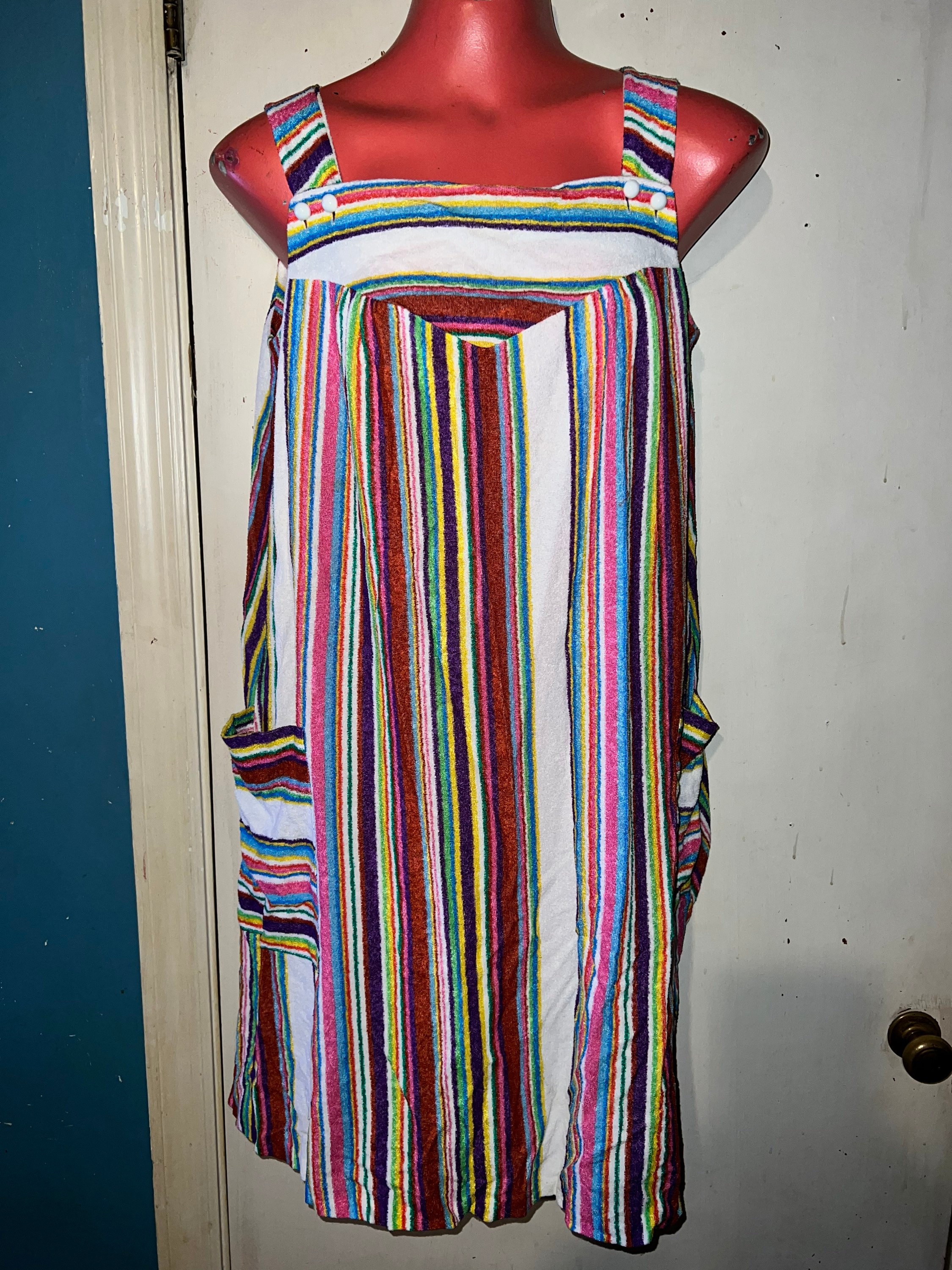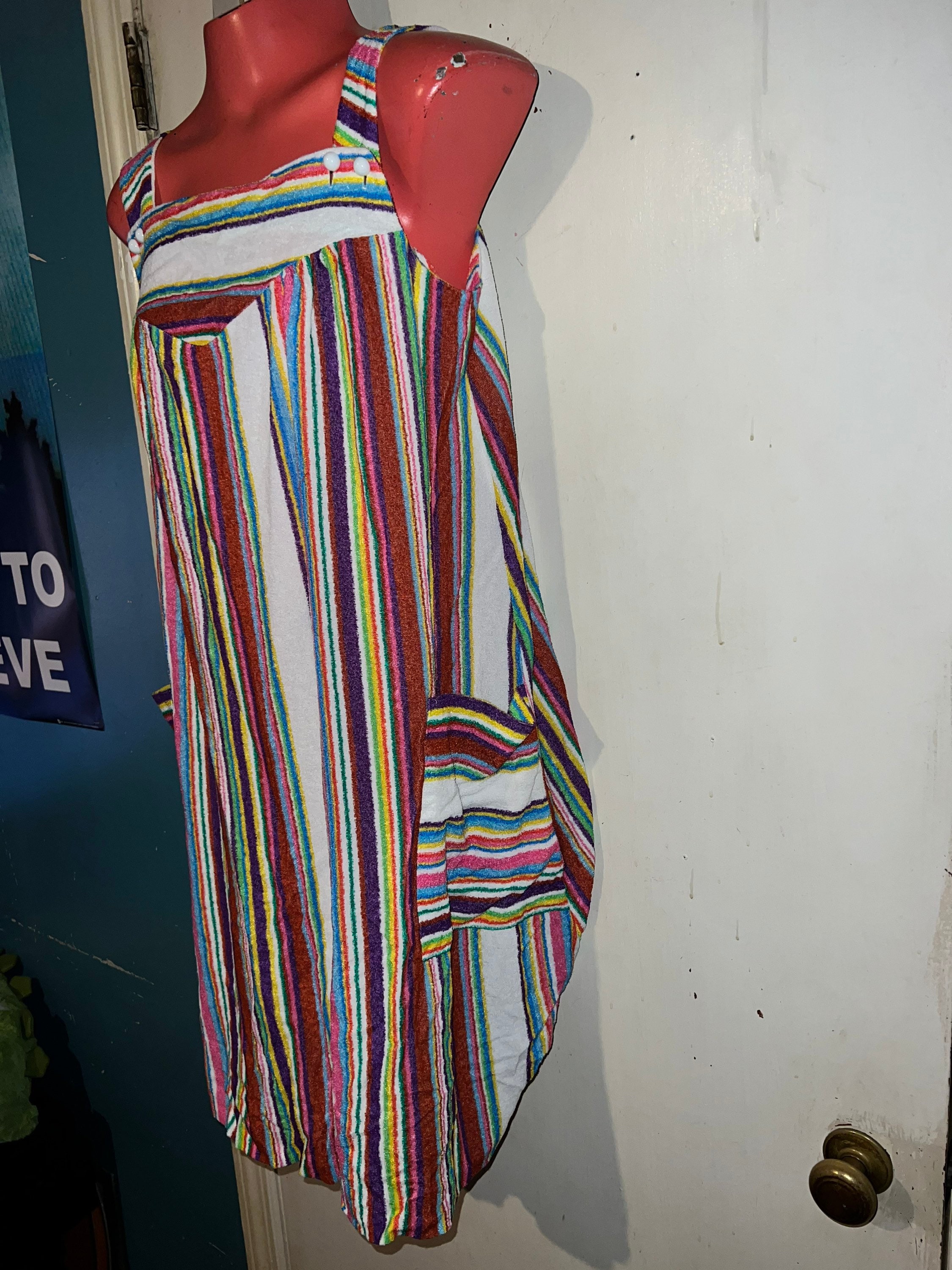 This is a super cute long and comfy teddy cloth dress from the late 60’s or early 70’s. It’s short and flowy with beautiful colors of different sizes stripes. It has two pockets on the front, it’s in good vintage condition.