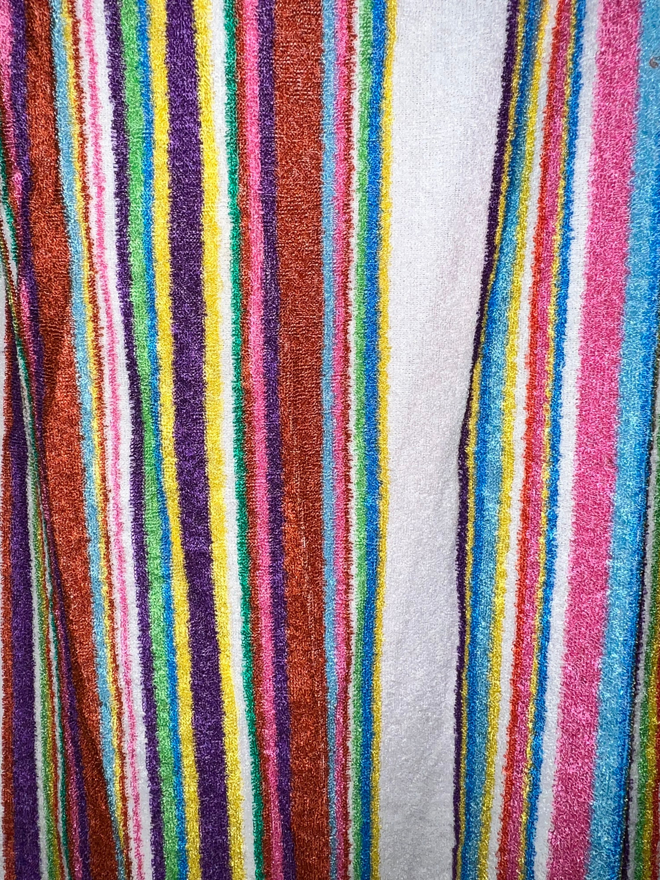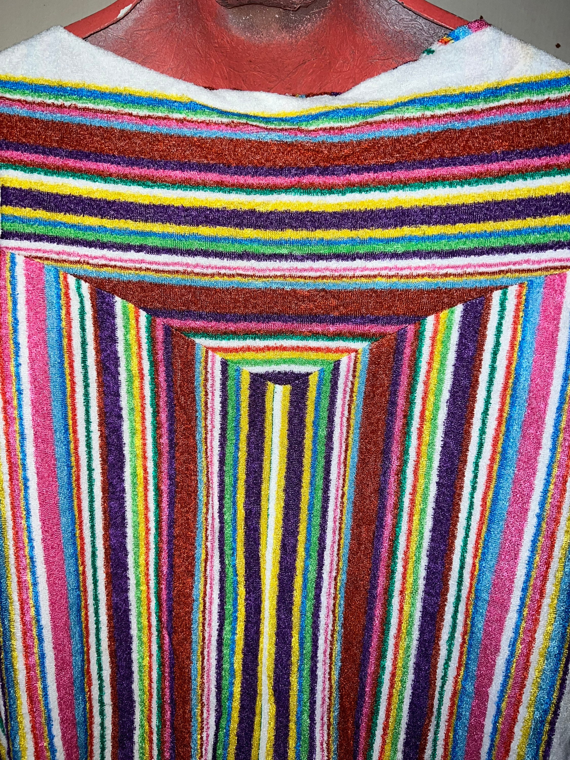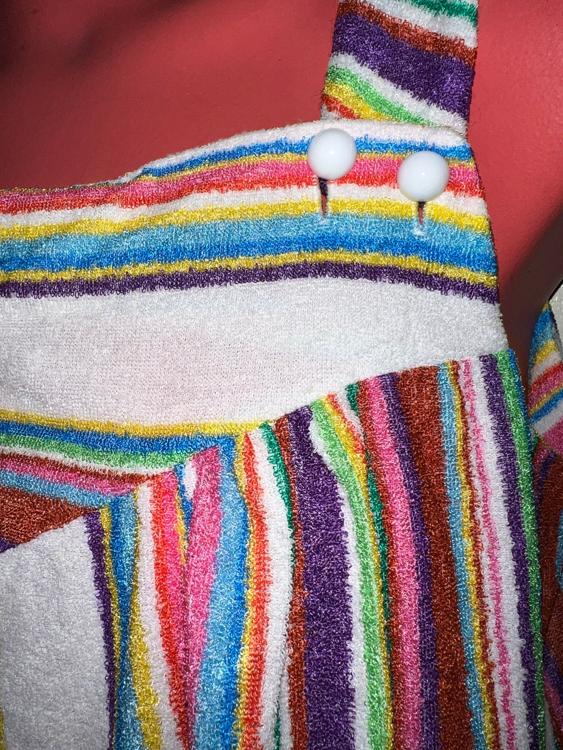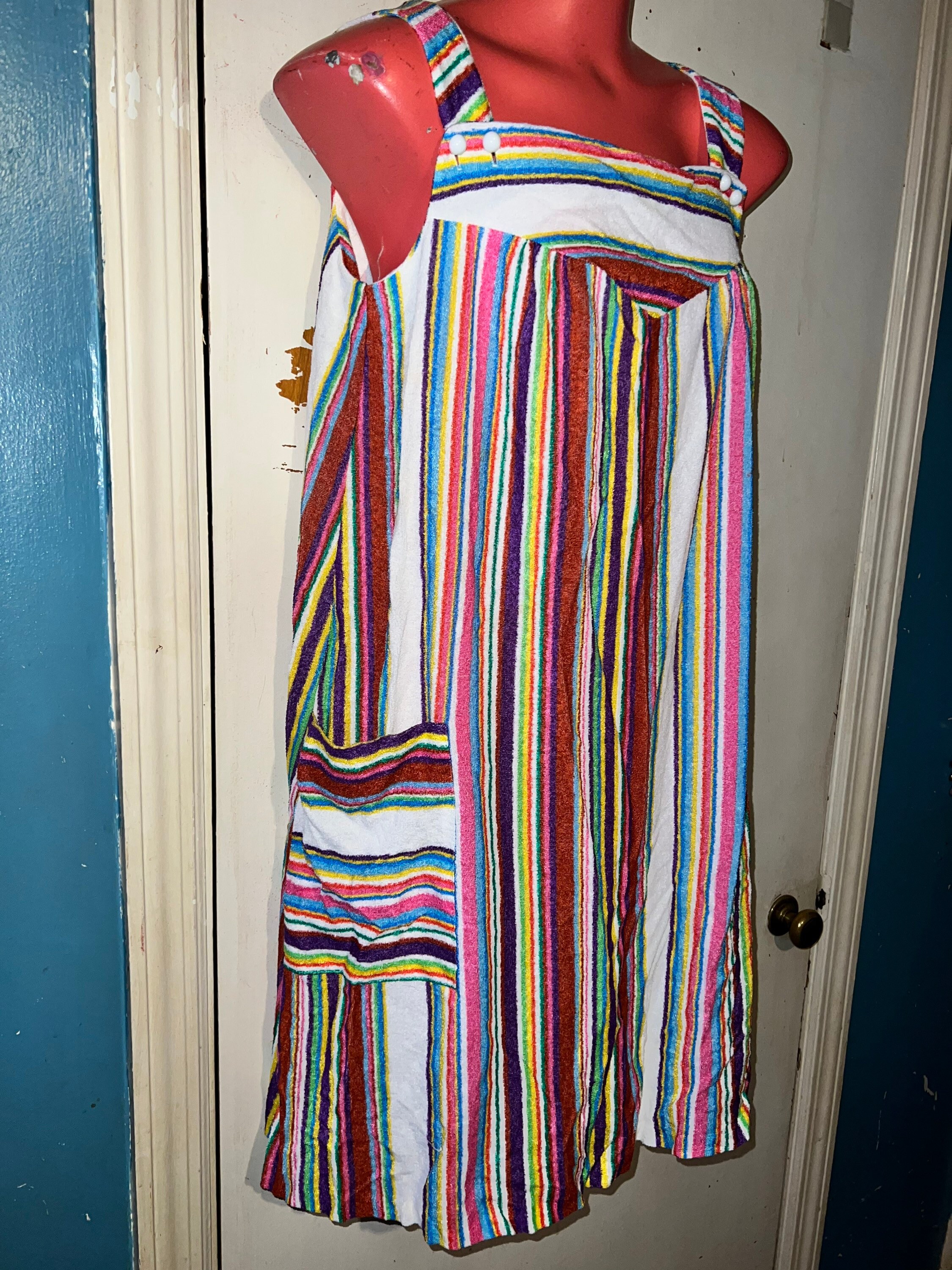 This is a super cute long and comfy teddy cloth dress from the late 60’s or early 70’s. It’s short and flowy with beautiful colors of different sizes stripes. It has two pockets on the front, it’s in good vintage condition.