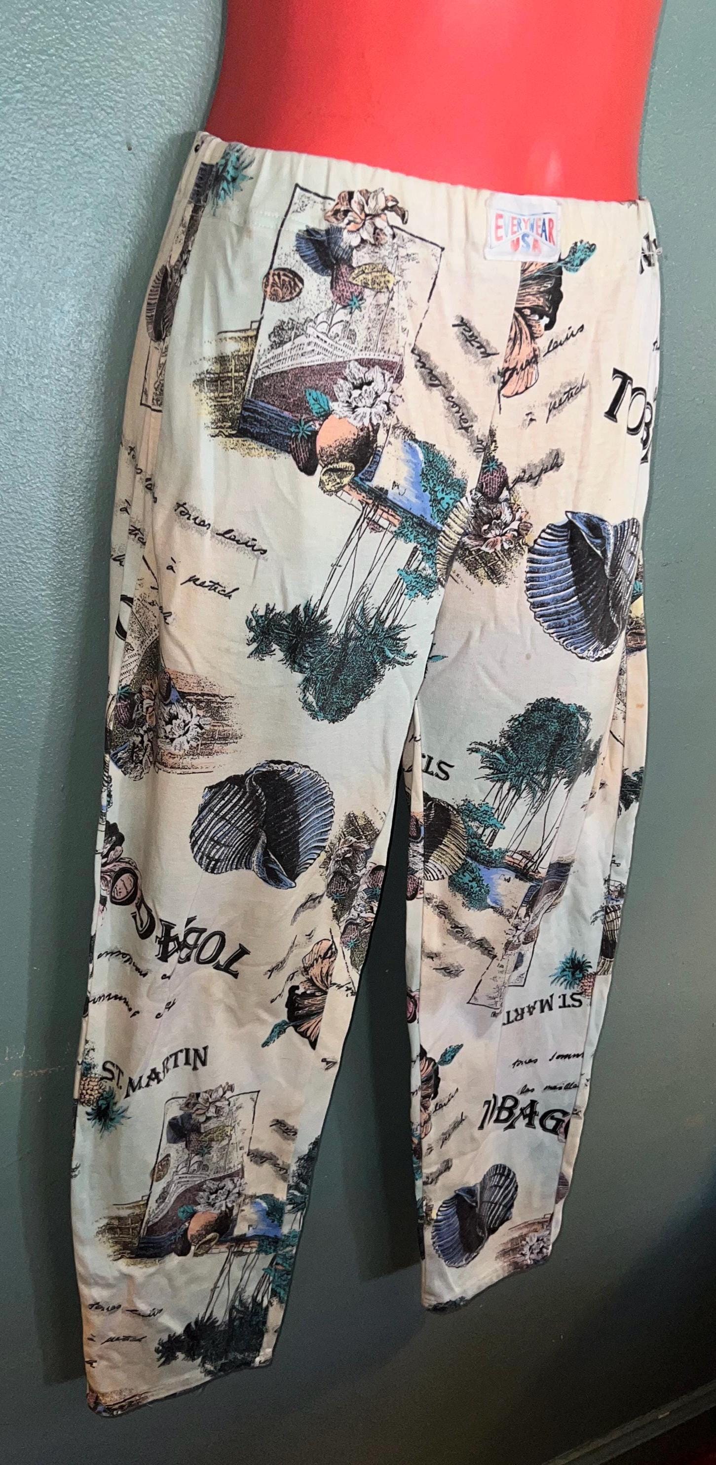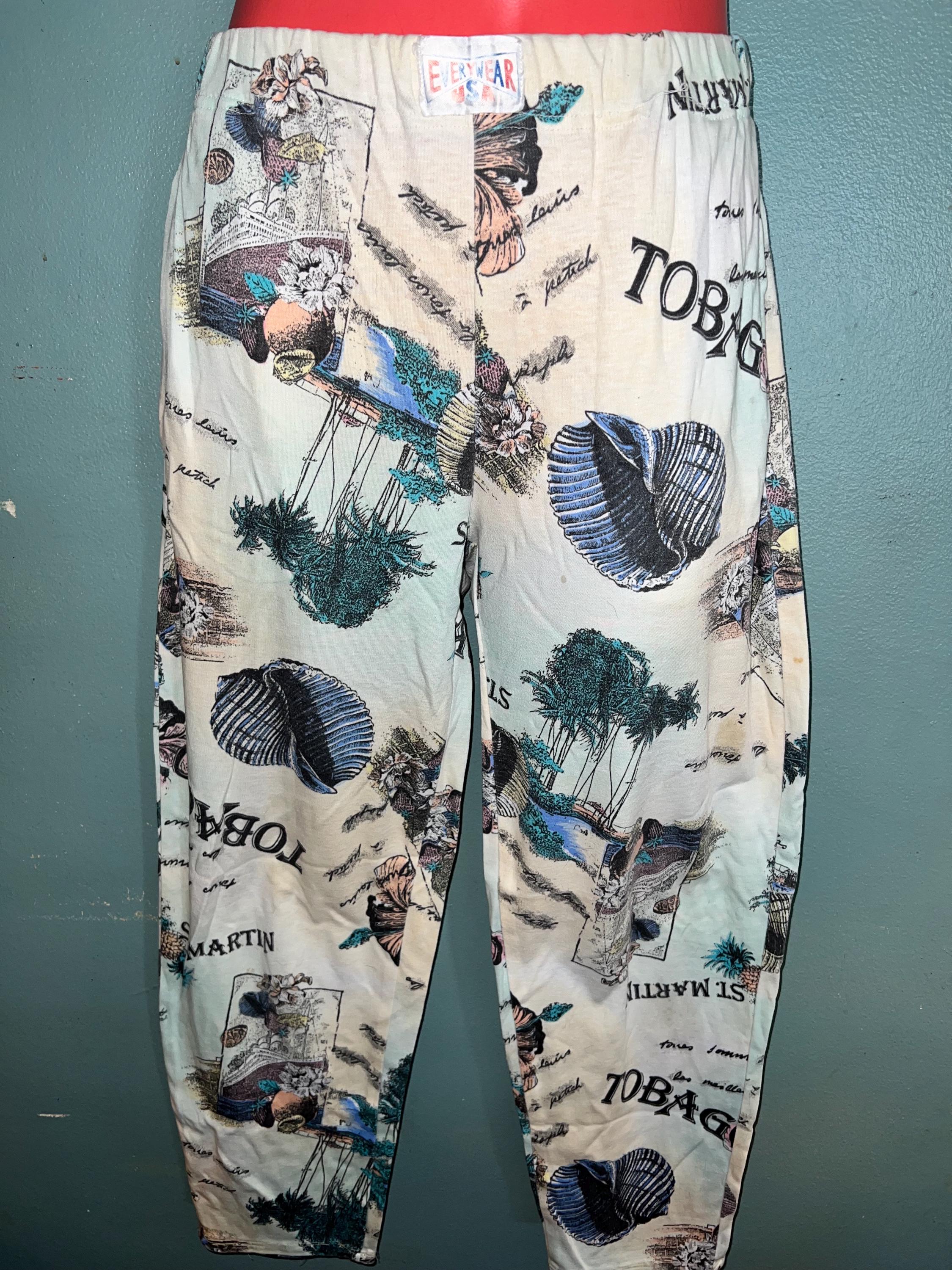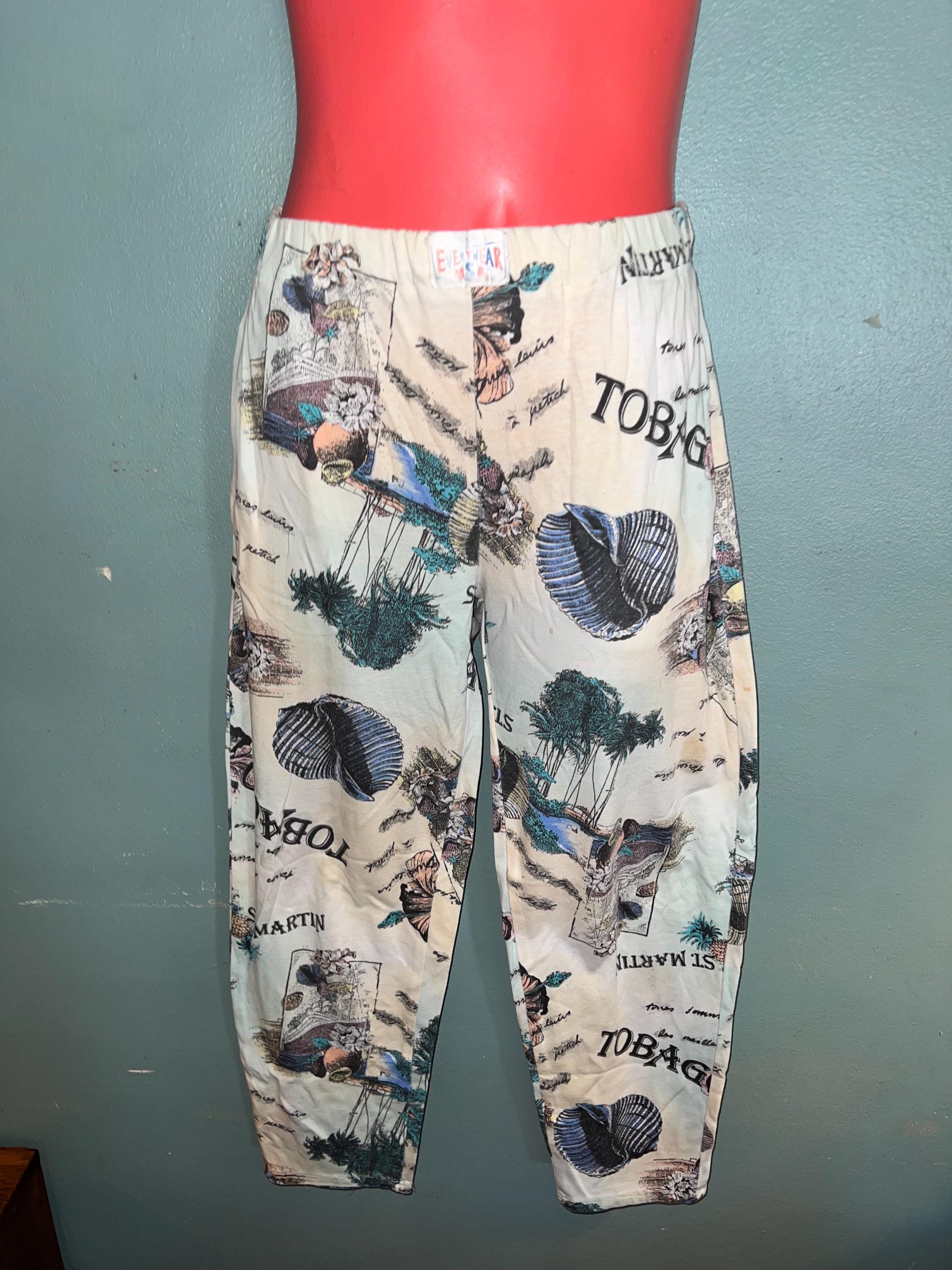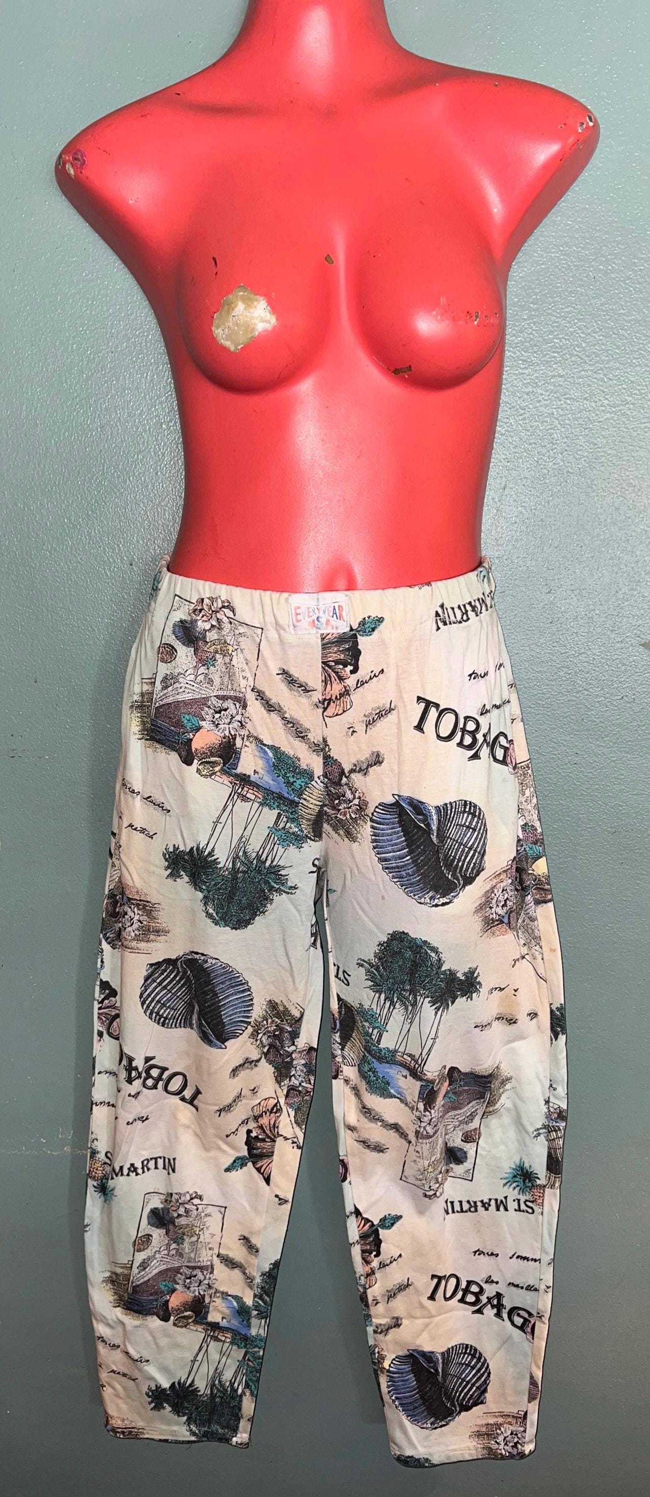 These are awesome Everywear pants from the 80's! They are a thin cotton pants with a Carribean design on them. They do show some wear and tear but they’ve still got sone years to go!