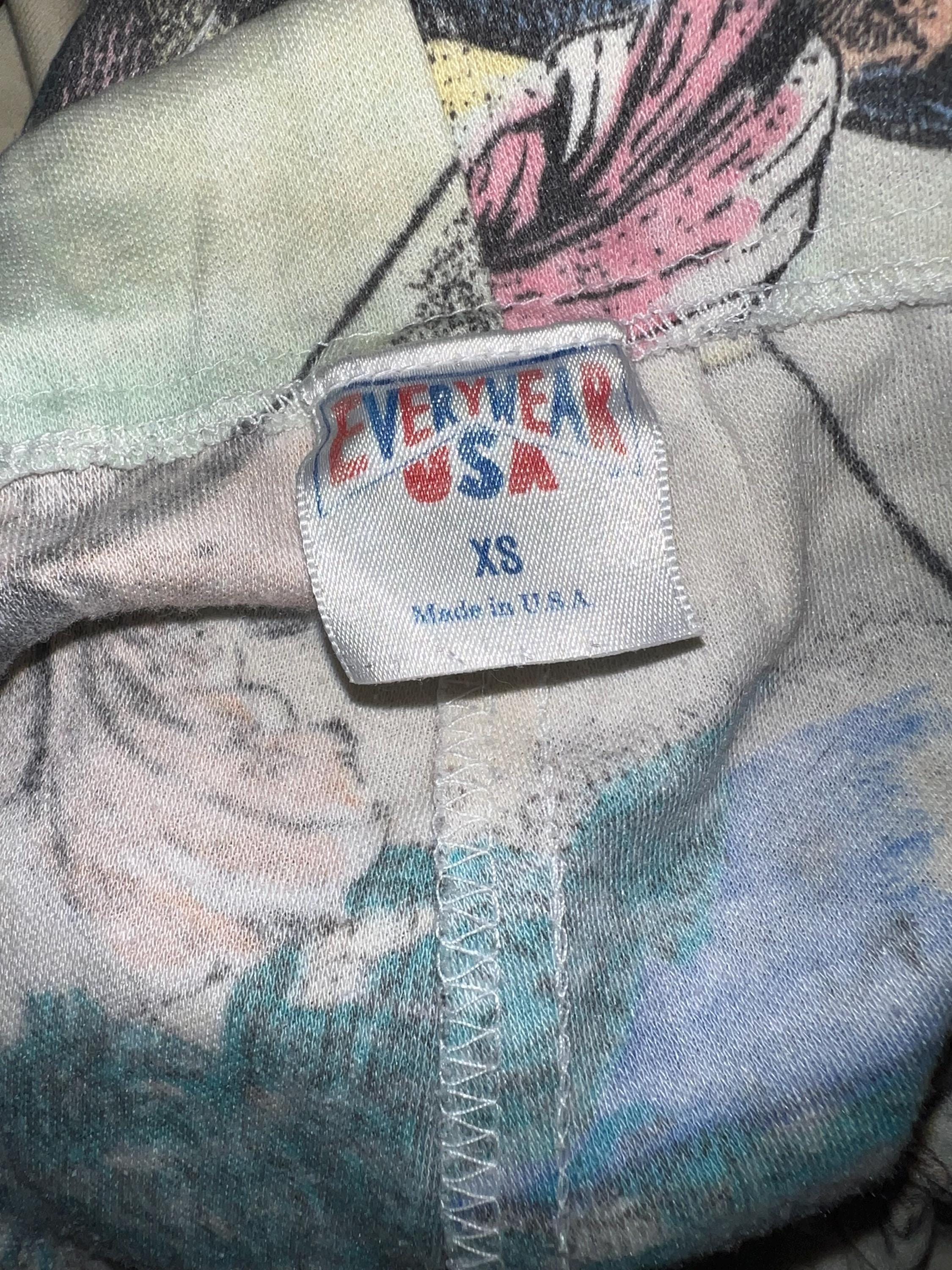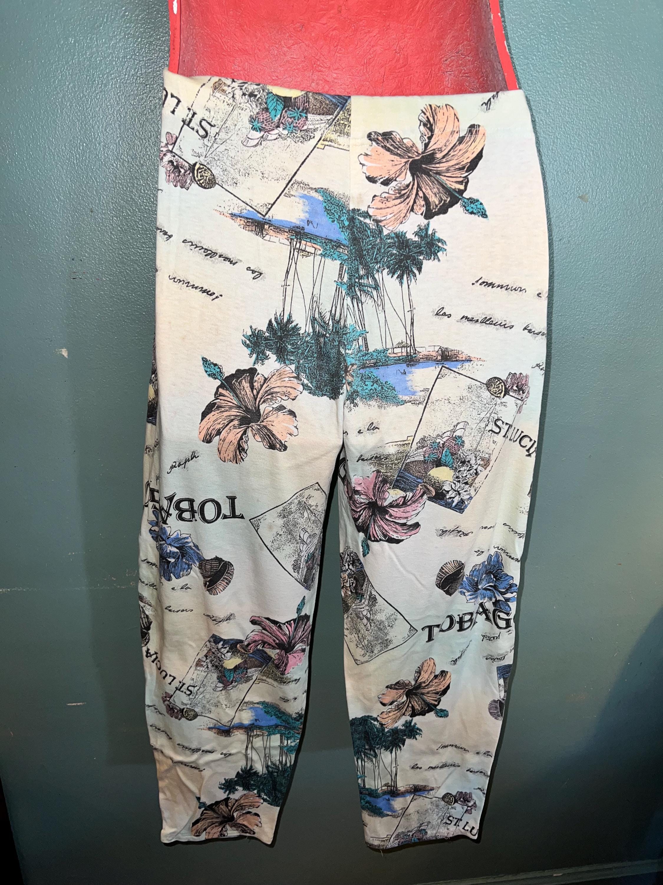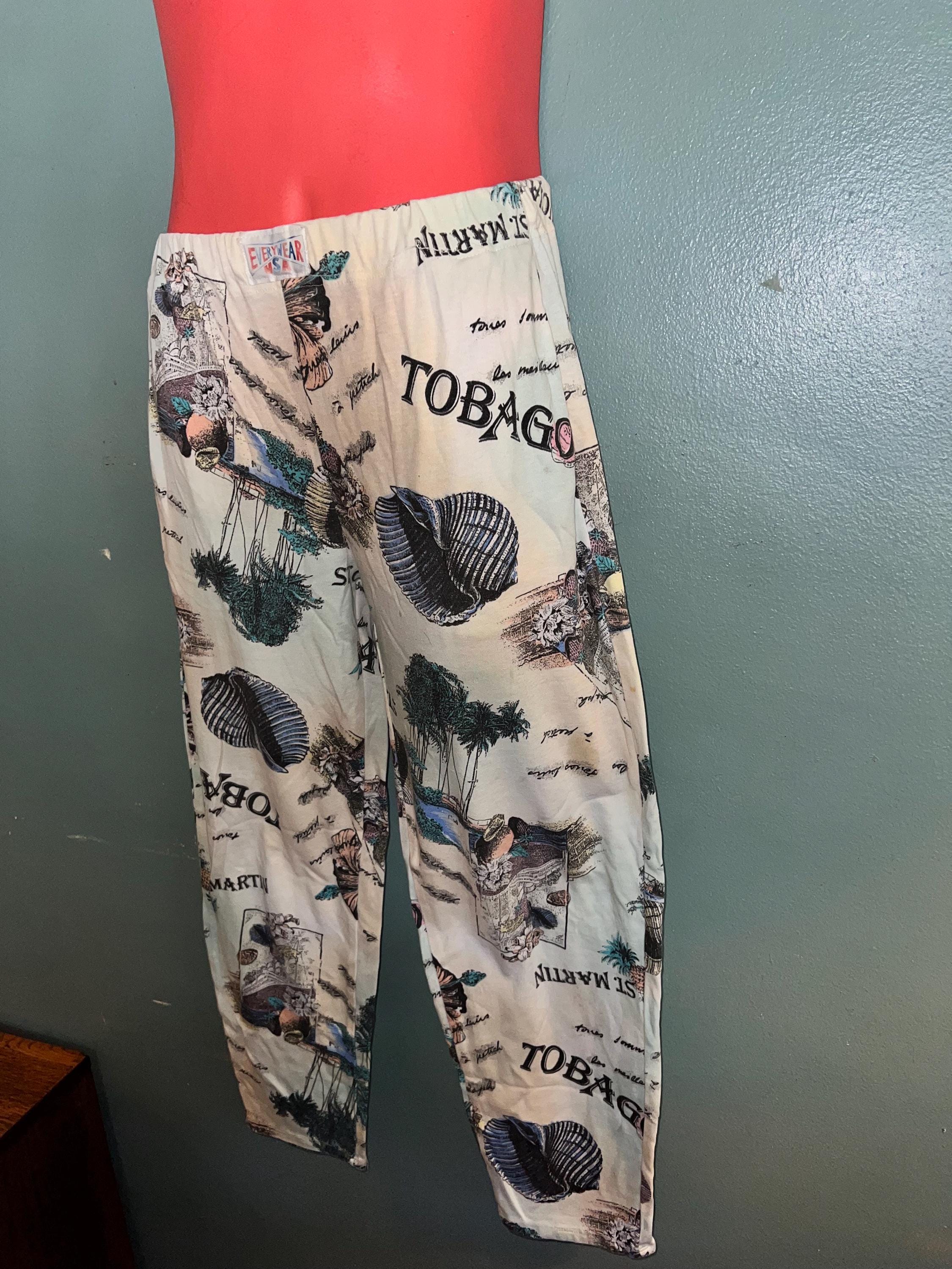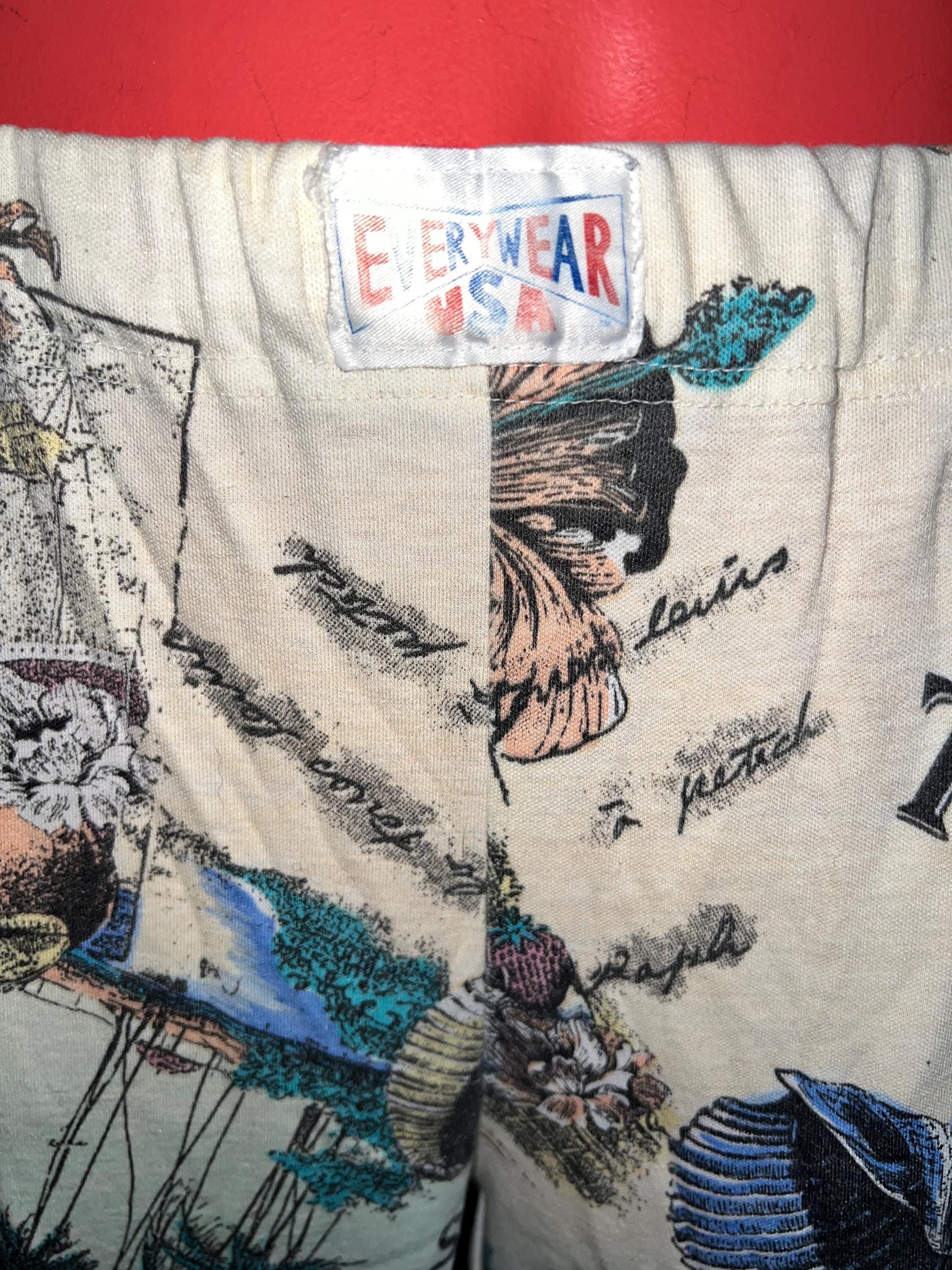 These are awesome Everywear pants from the 80's! They are a thin cotton pants with a Carribean design on them. They do show some wear and tear but they’ve still got sone years to go!