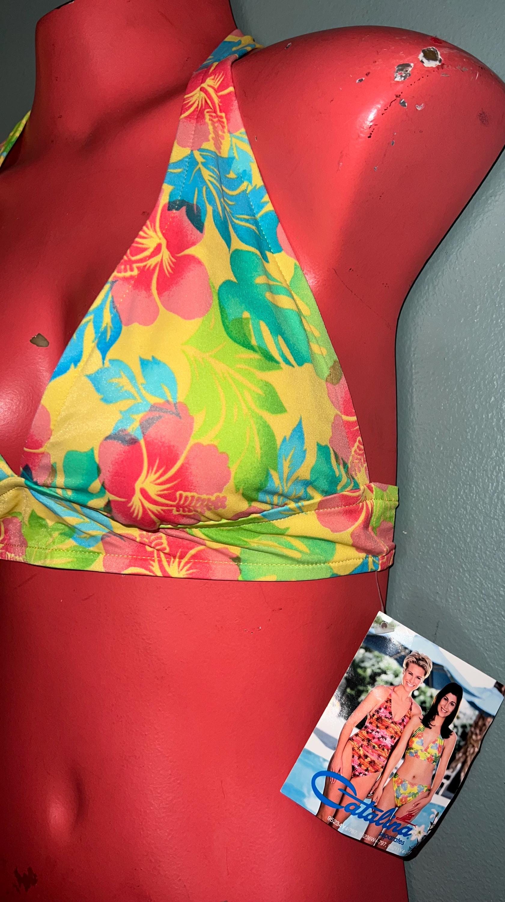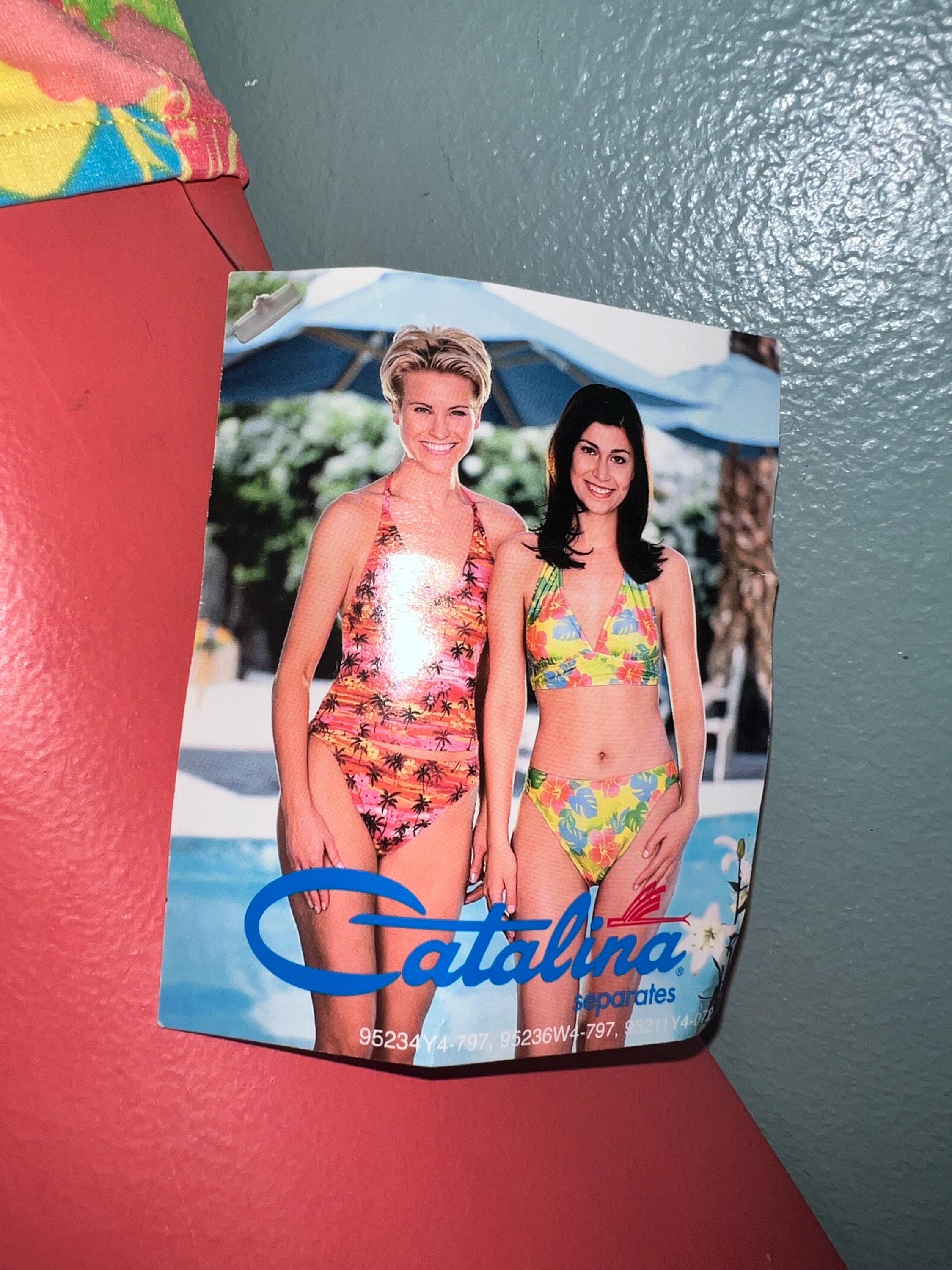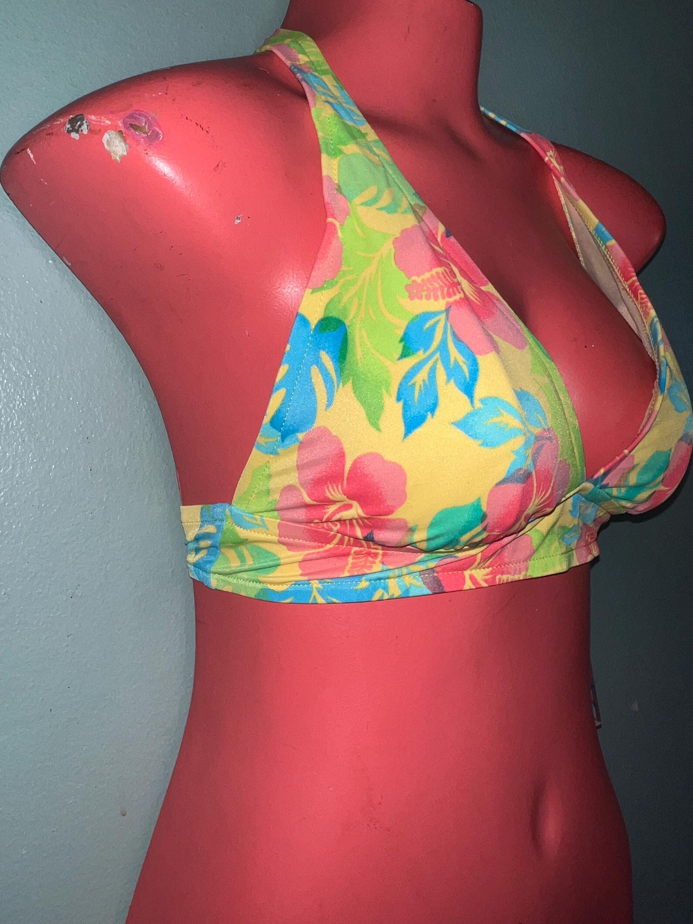 This is a really cute 1990’s bikini top made by Catalina. The bright floral colors really pop with the yellow background. It’s in really good new vintage condition.