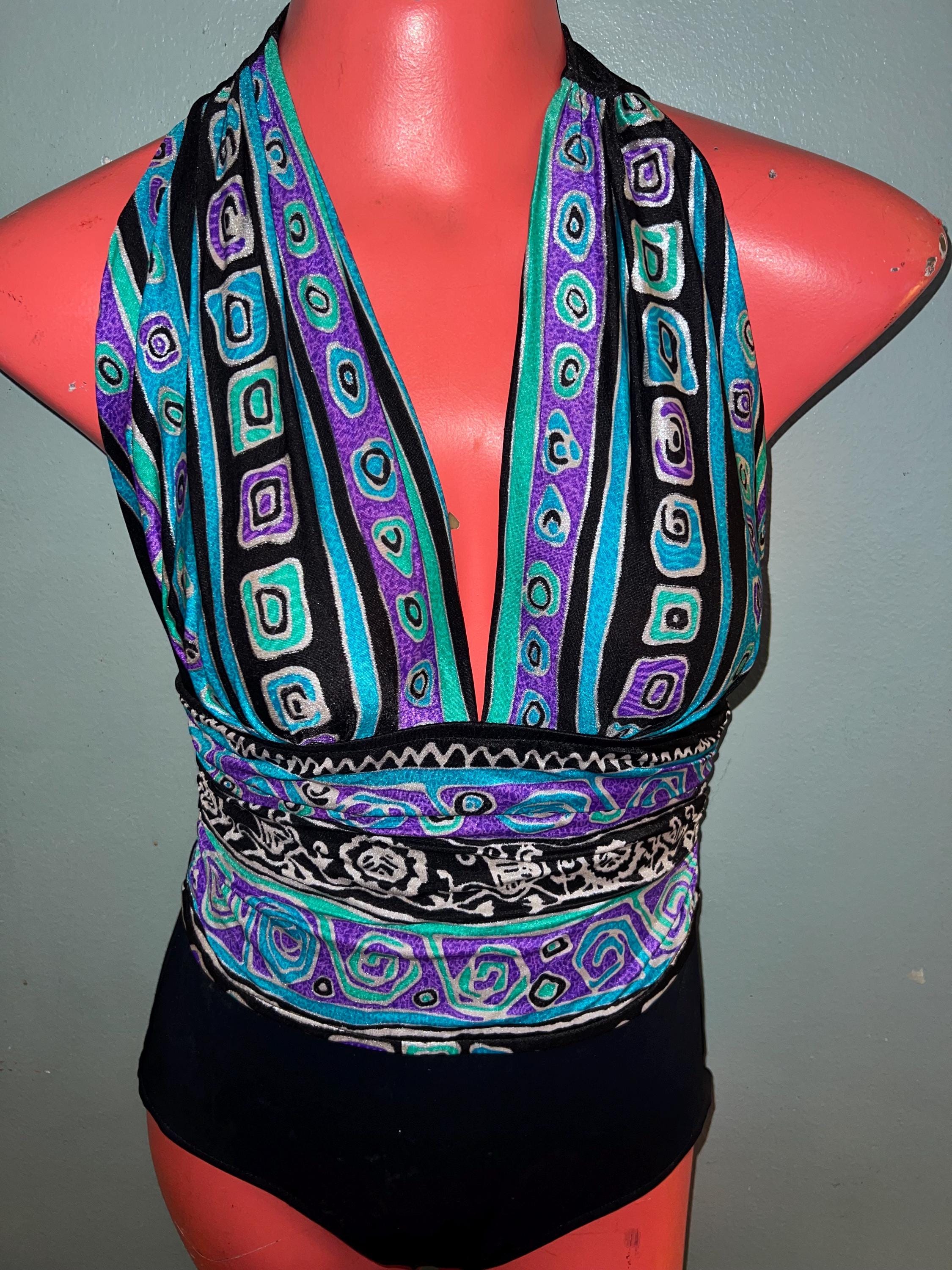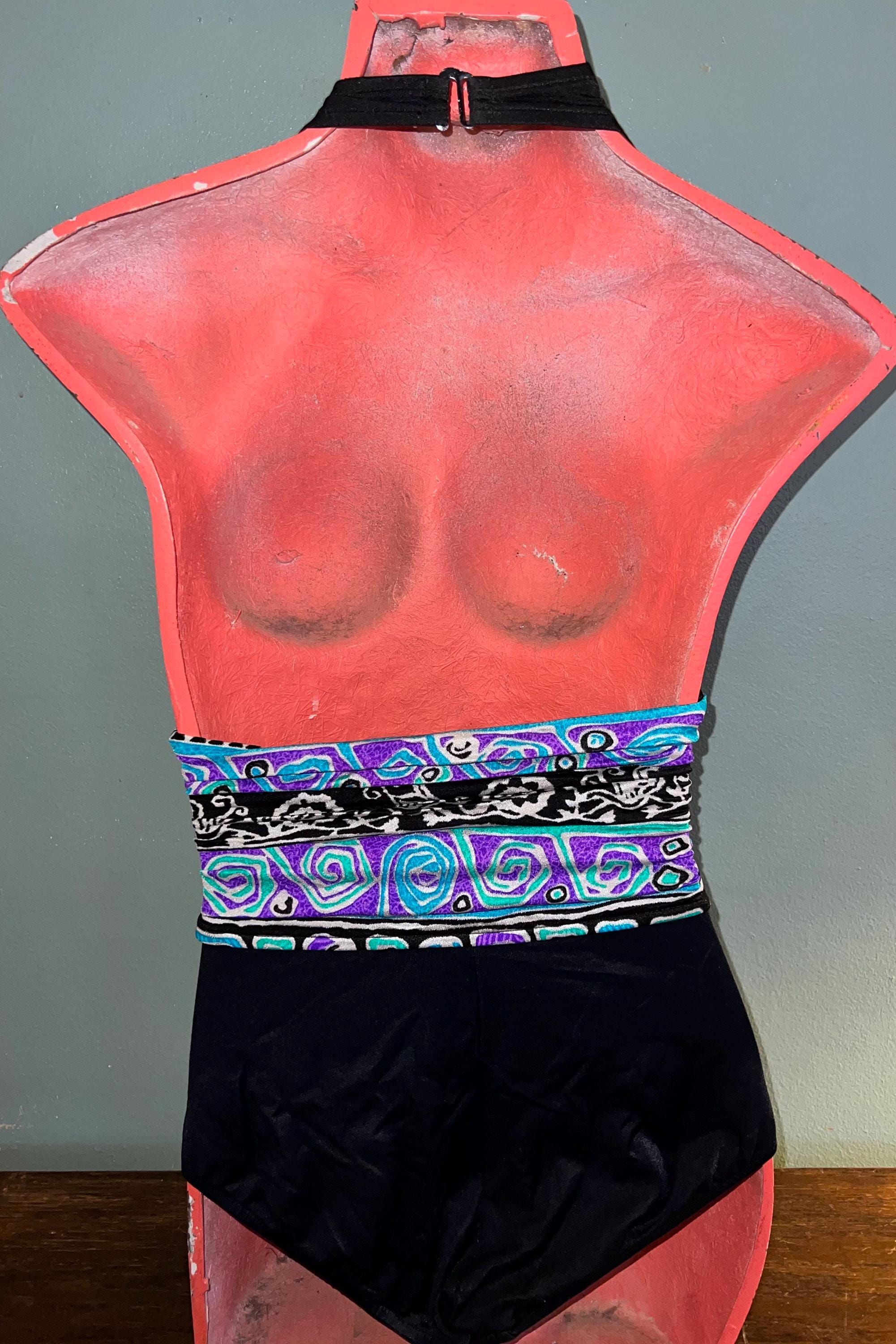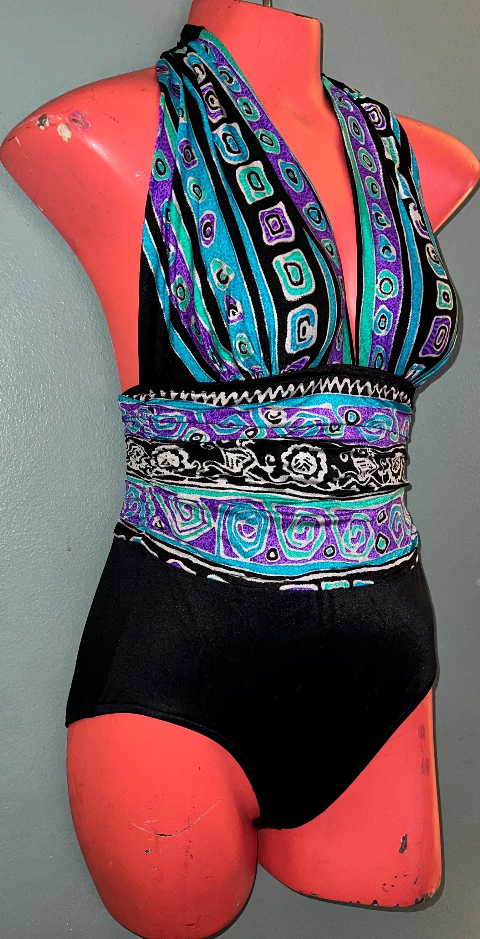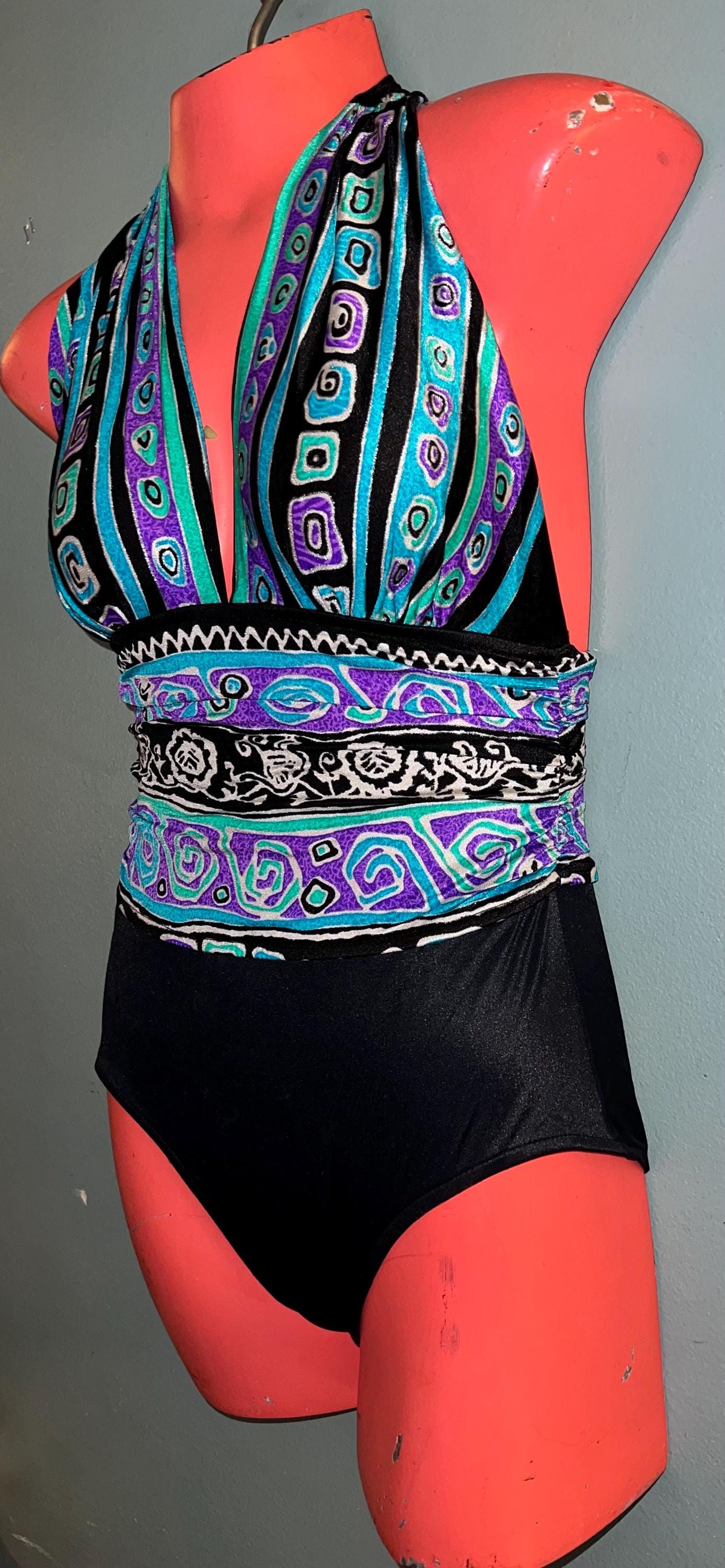 This is a really cute and excellent design 1980’s Swimsuit! It has a great cut to it and a halter like top. It’s a size 10 It’s in good vintage condition.