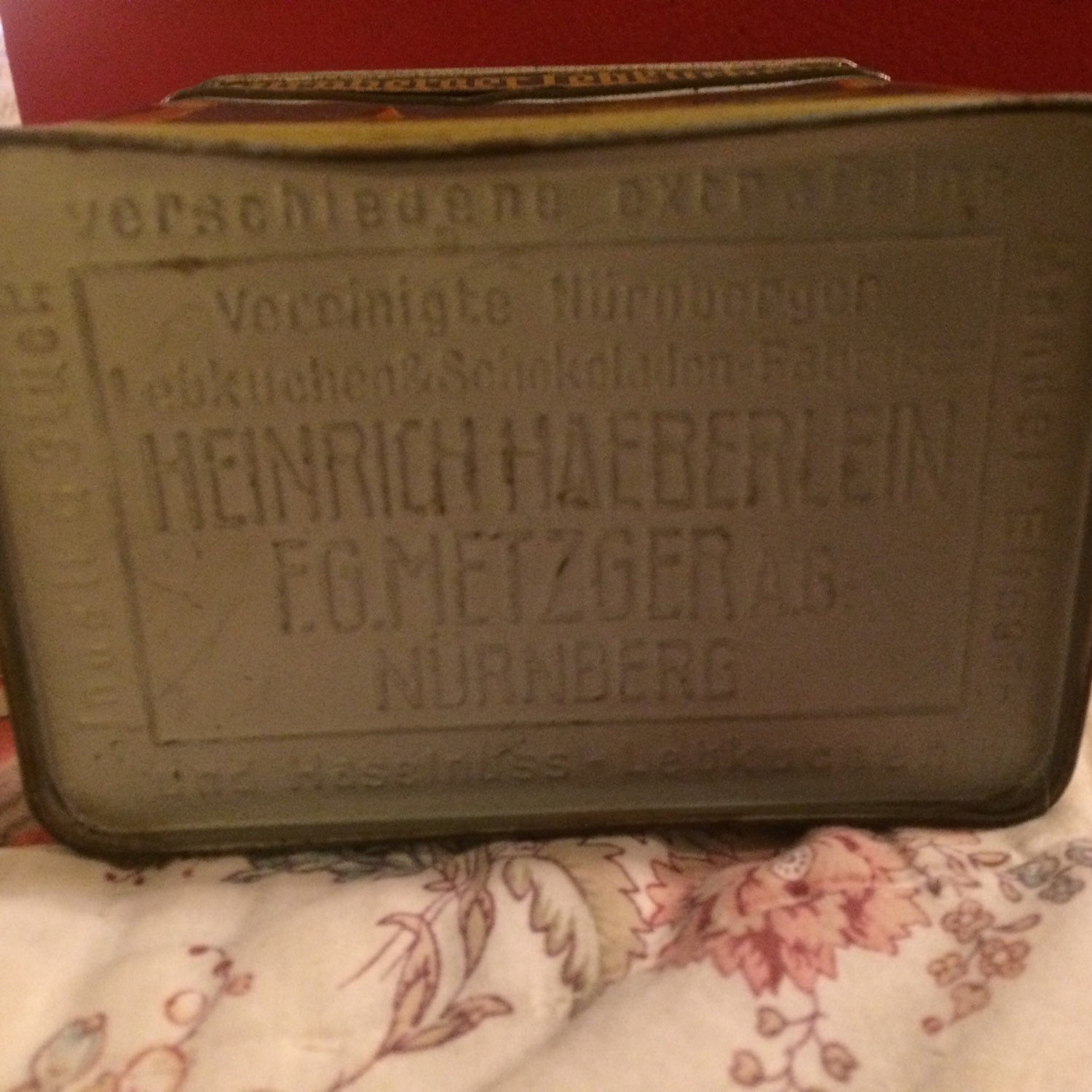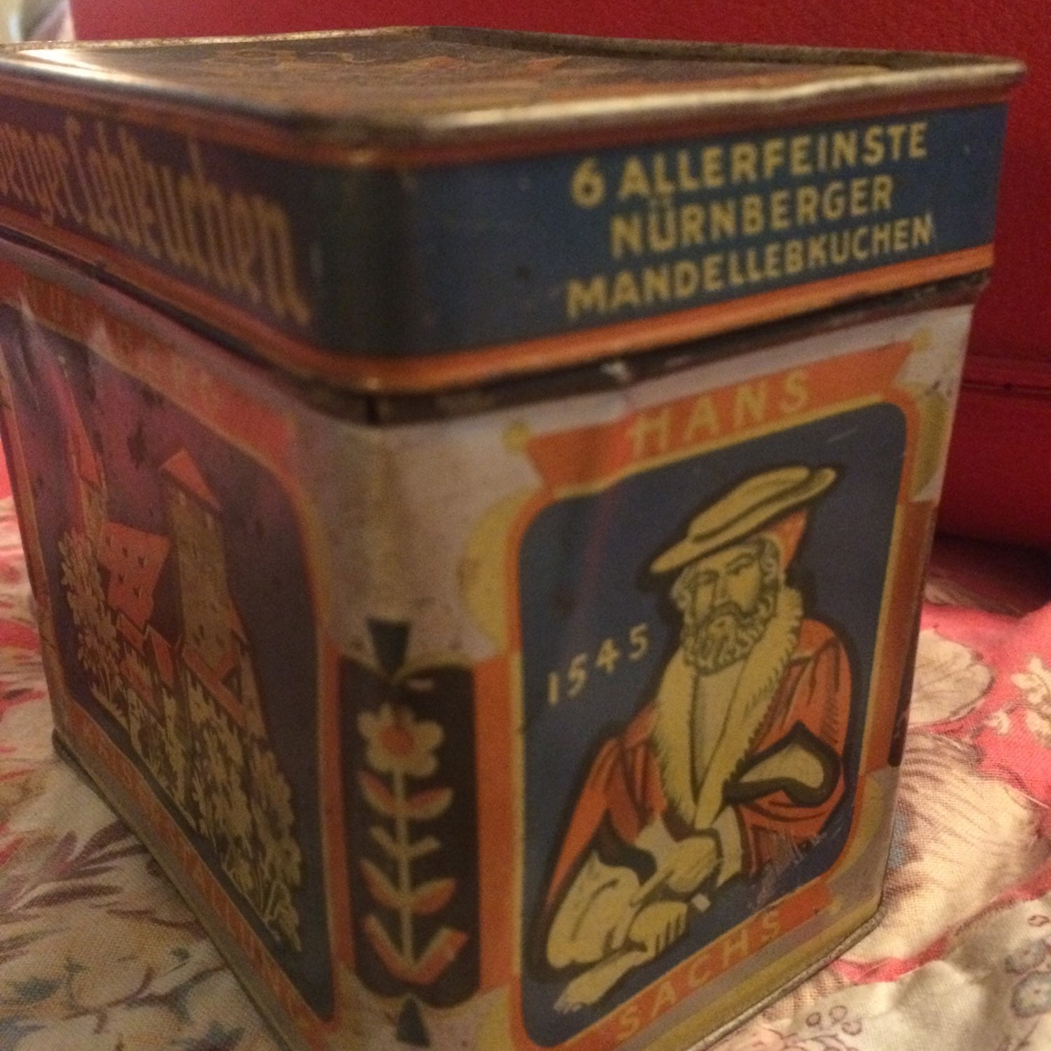 I love this tin box! It's bent and wavy in places but it's so awesomely vintage German! The tin was used for almond cookies made by the Heinrich Haeberlein company.