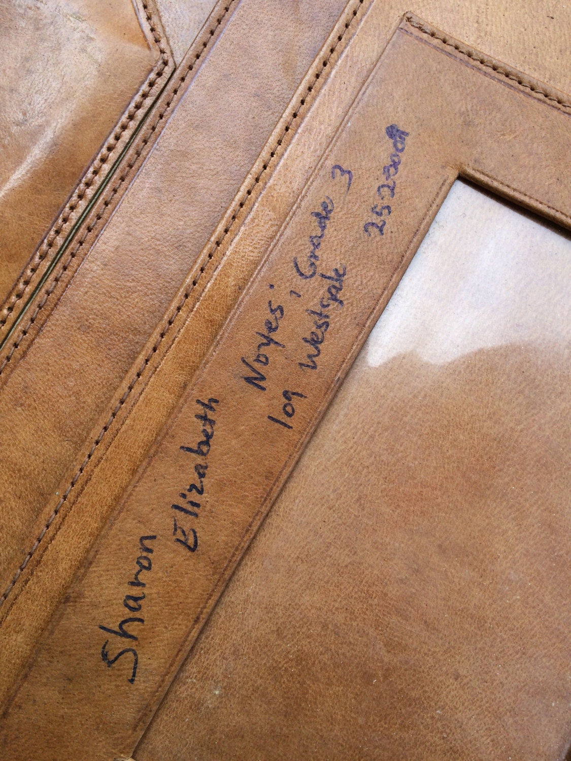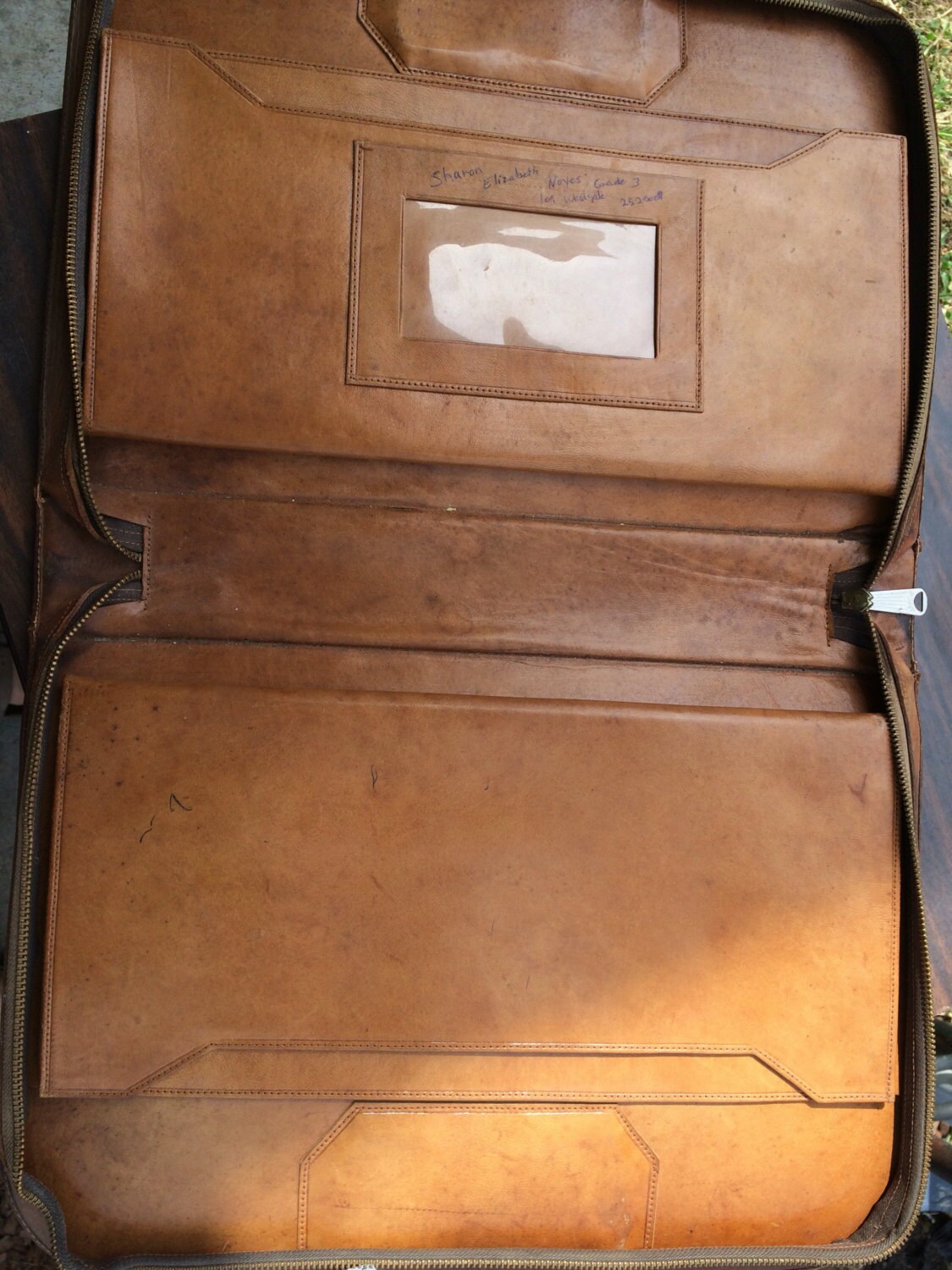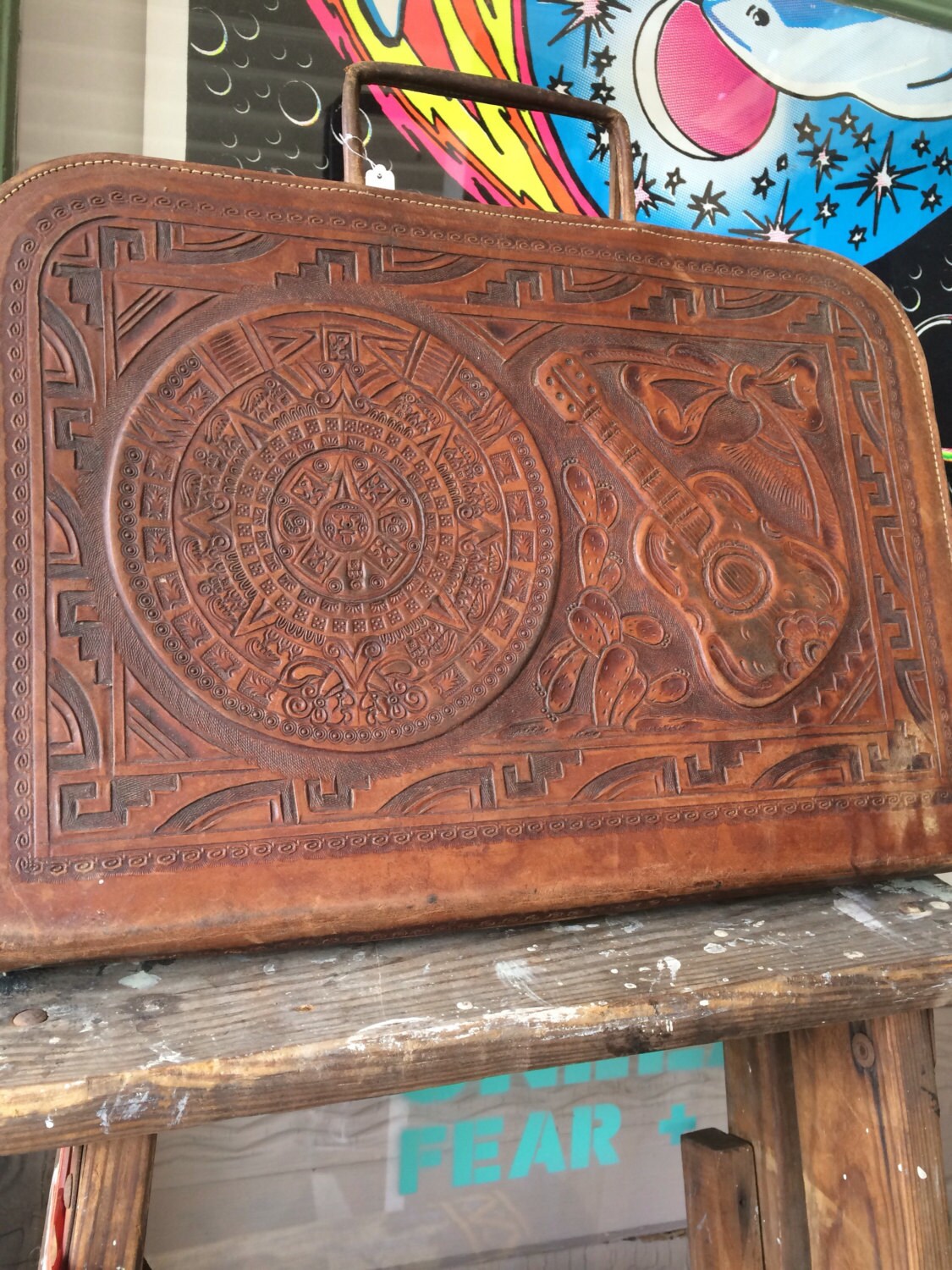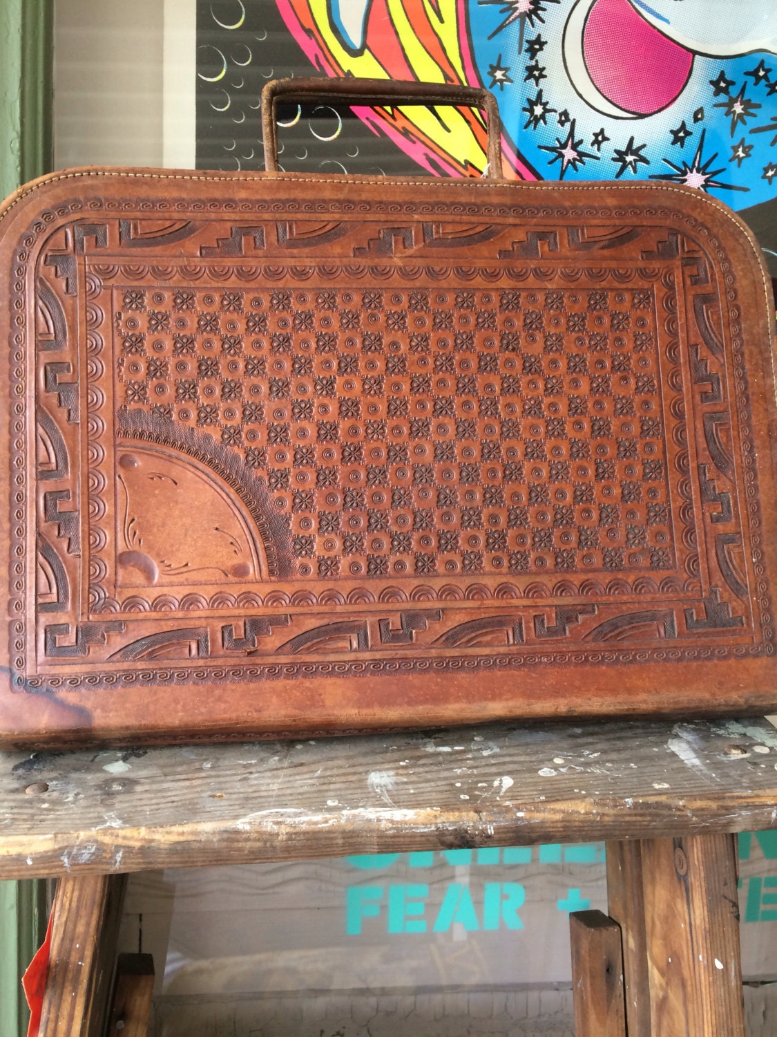 This is a vintage etched leather briefcase/document holder. ! It's large, and so super amazing! I love it!! There are some marks on the leather but only as much as expected with age. There are also some names written with ink on the inside (as seen in last photo), other than that it’s in good vintage condition. How great would it be to use this as a briefcase instead of some boring normal looking stuffy briefcase?!?! It could be used as a super nice portfolio holder as well.