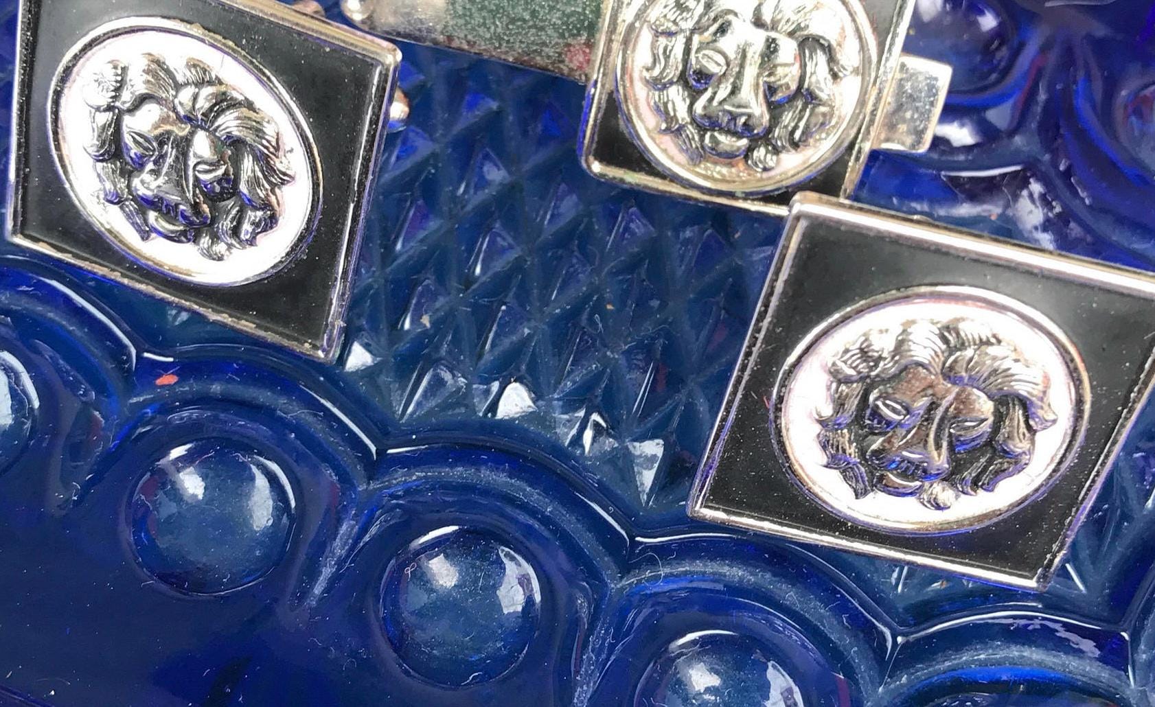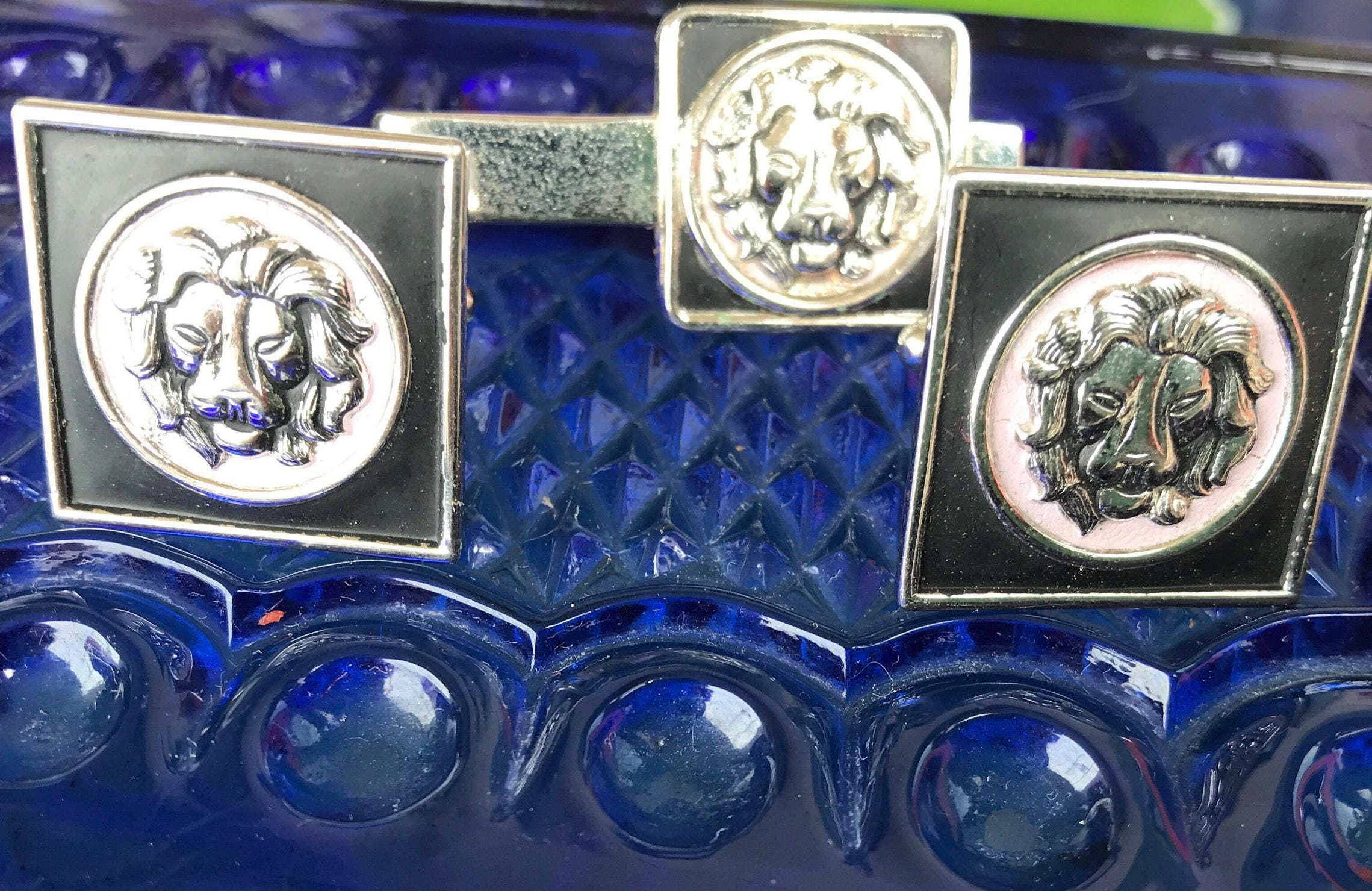 Beautiful 1950's Swank cuff link set with tie clip. These have an enamel pink background with a silver lions head. This set will make a great gift for any man in your life! A wedding day gift, Fathers Day of course or just because. Swank is the only marking on these 3 pieces!