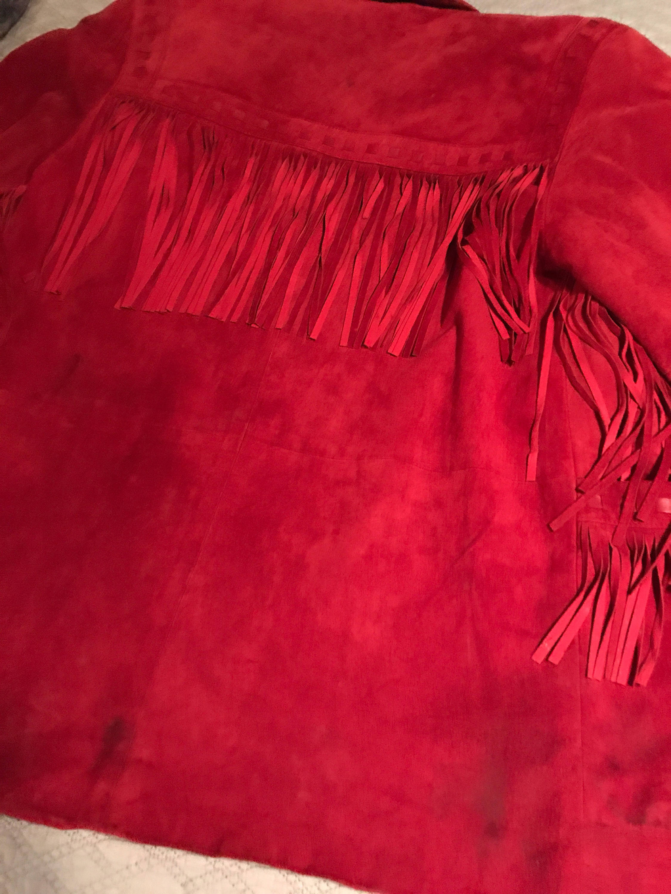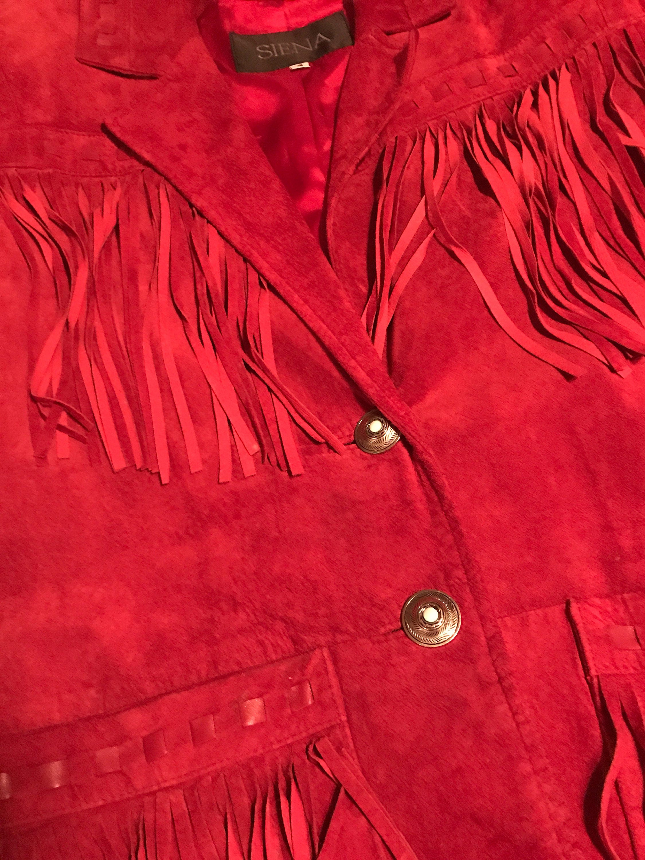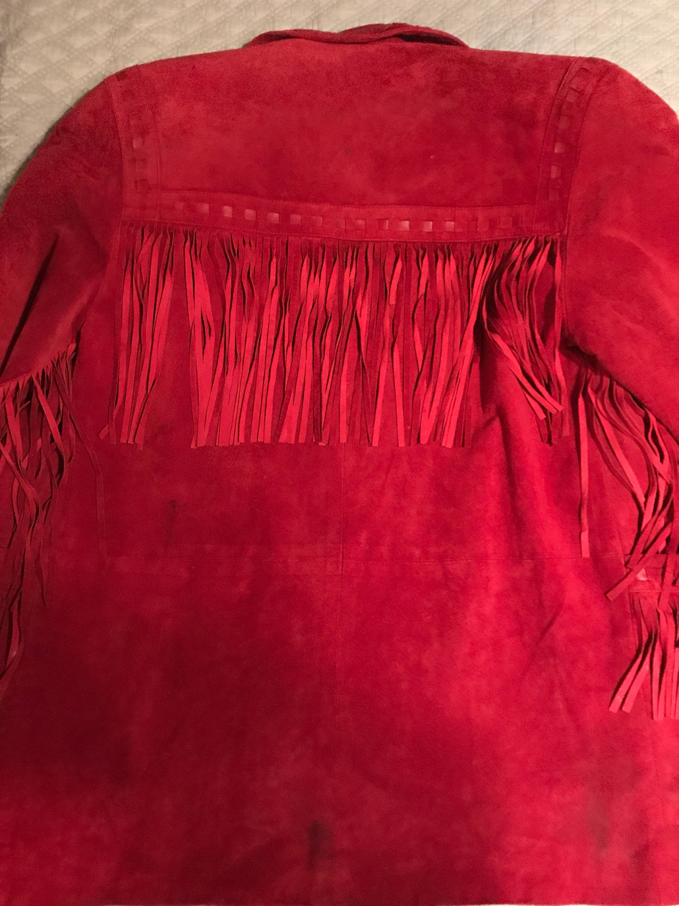 This coat is very nice! It's a Western style red suede with excellent fringe down each arm, across the collar, across each front pocket and on the back. It has two front buttons that are silver with a light blue stone. The inside is red satin lining and is in great condition. As far as I can tell the leather is in great condition with no missing fringe or anything. The front has two pockets. It has built in shoulder pads.