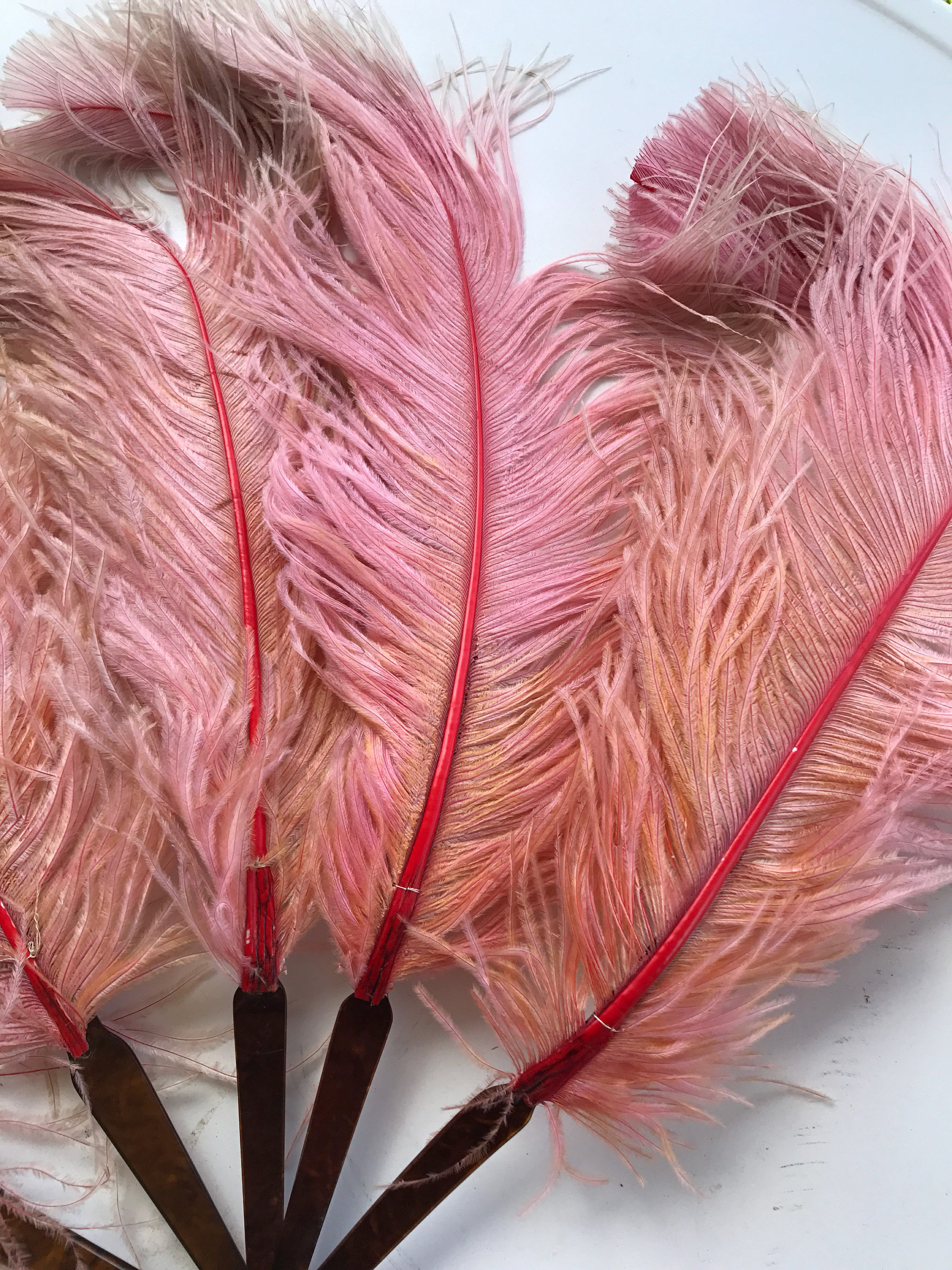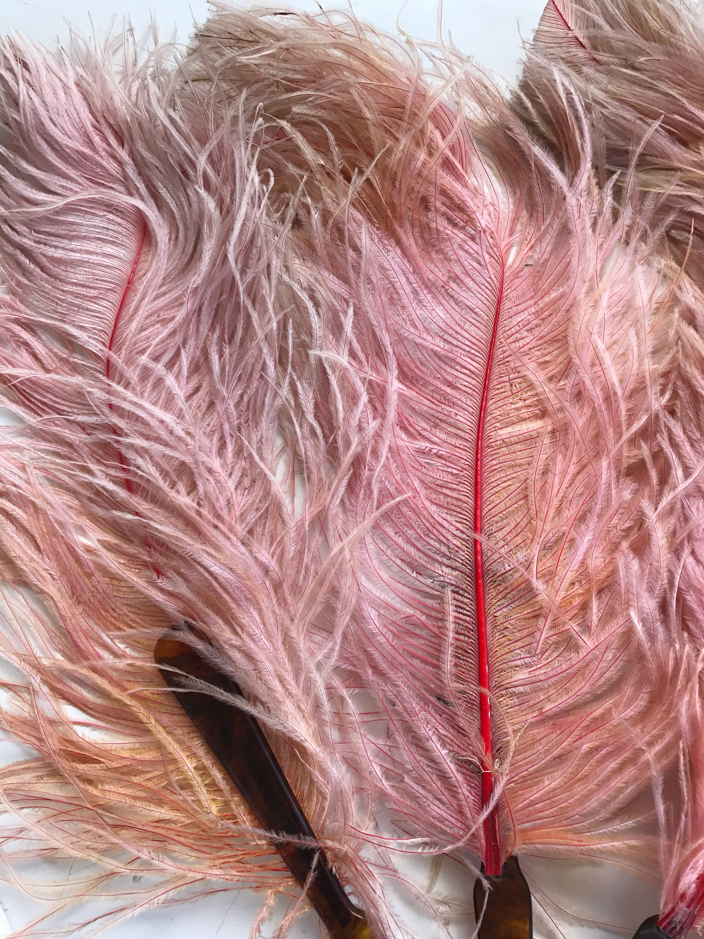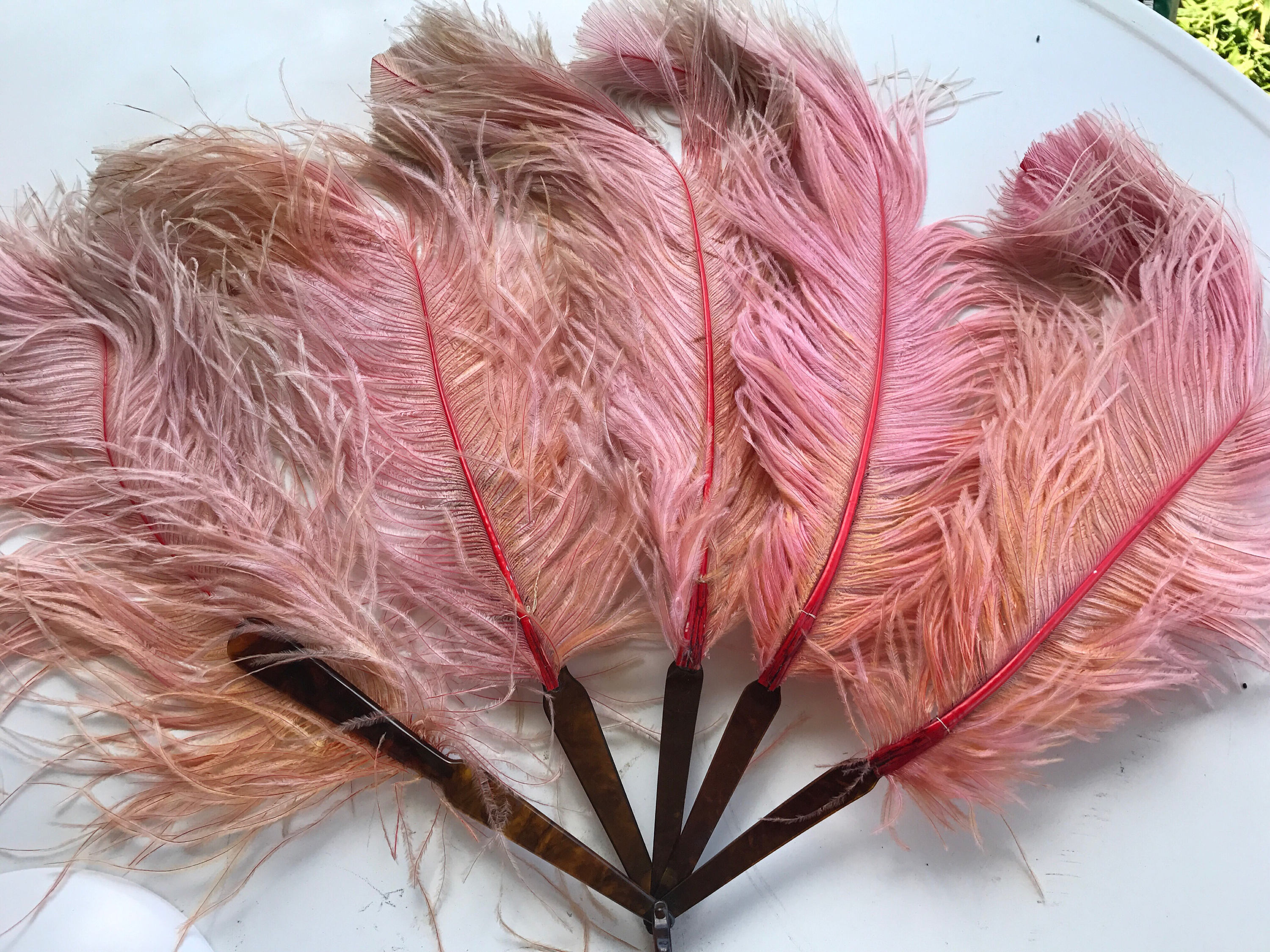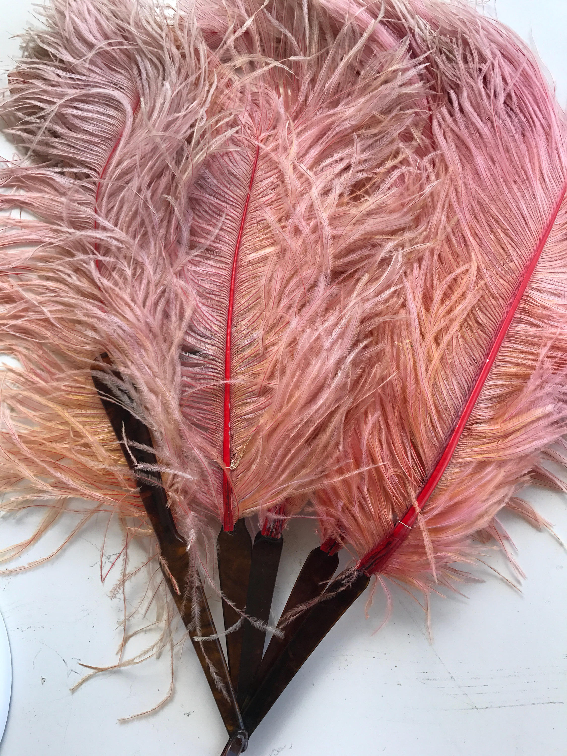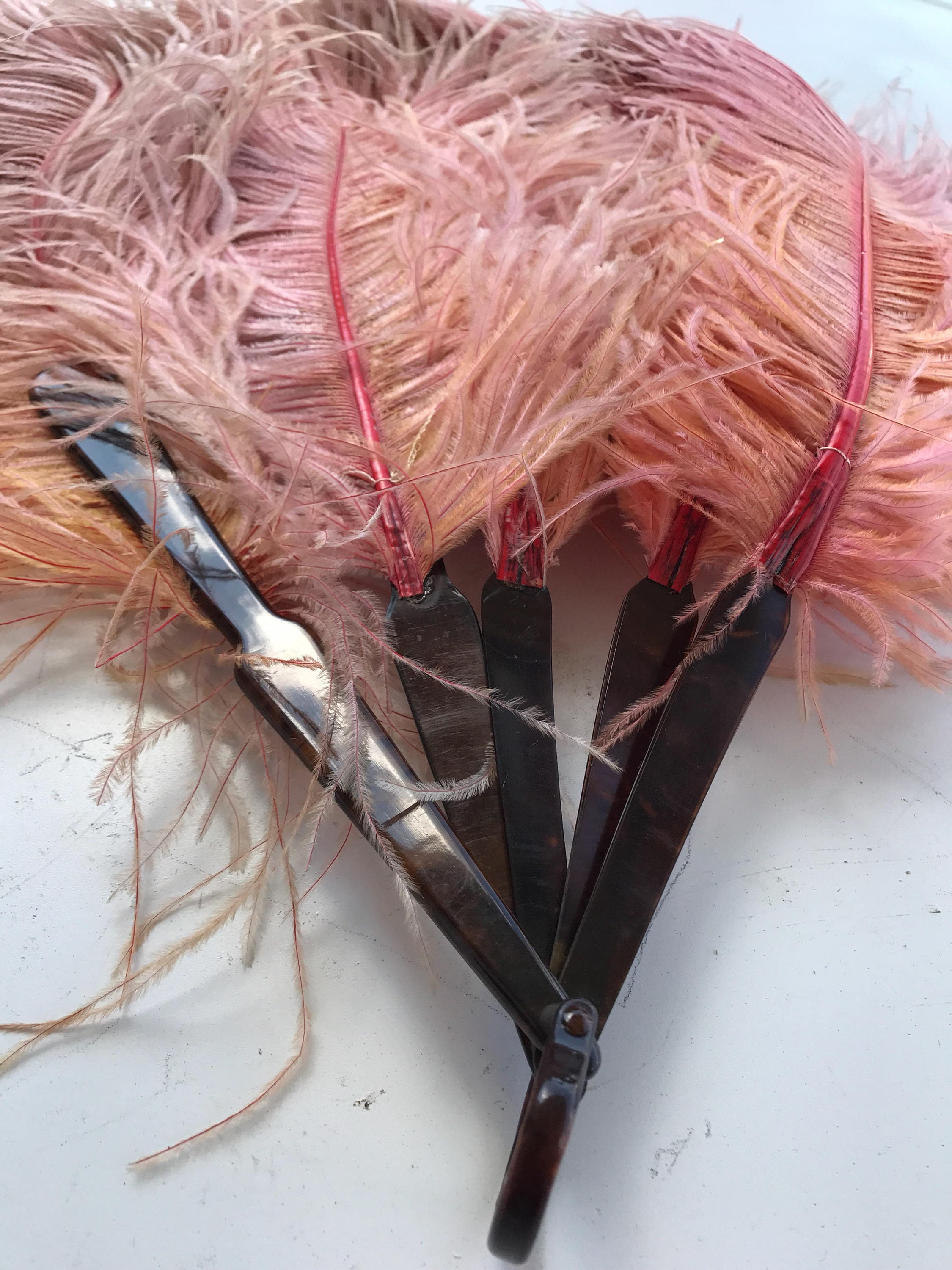 This is a neat antique pink ostrich feather fan from the 1800's. The base is faux tortoise shell celluloid with a celluloid ring at the bottom. The feathers are long and large, they were once all pink but now the pink has fades into some orange looking and some darker. It looks as if a string once attached each feather together but that string is no longer there. With a few minor repairs this fan would be even prettier than it is now. The feathers are also very turned at the top, I imagine a beautiful young burlesque dancer using this fan night after night which is why it's been so lovingly well used. It is delicate.