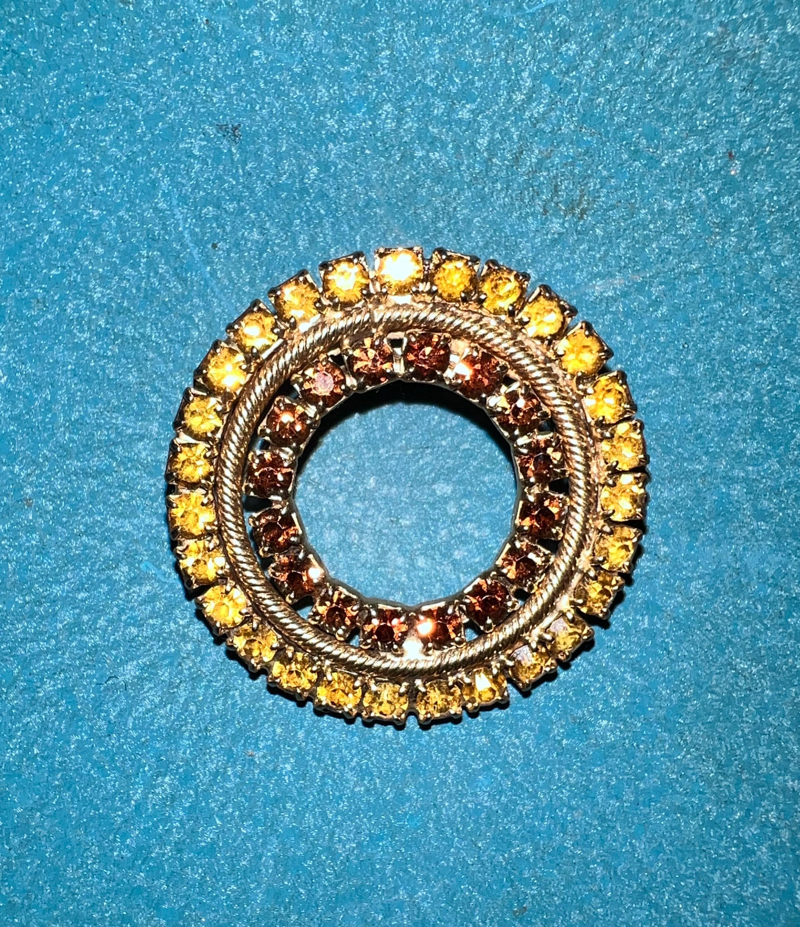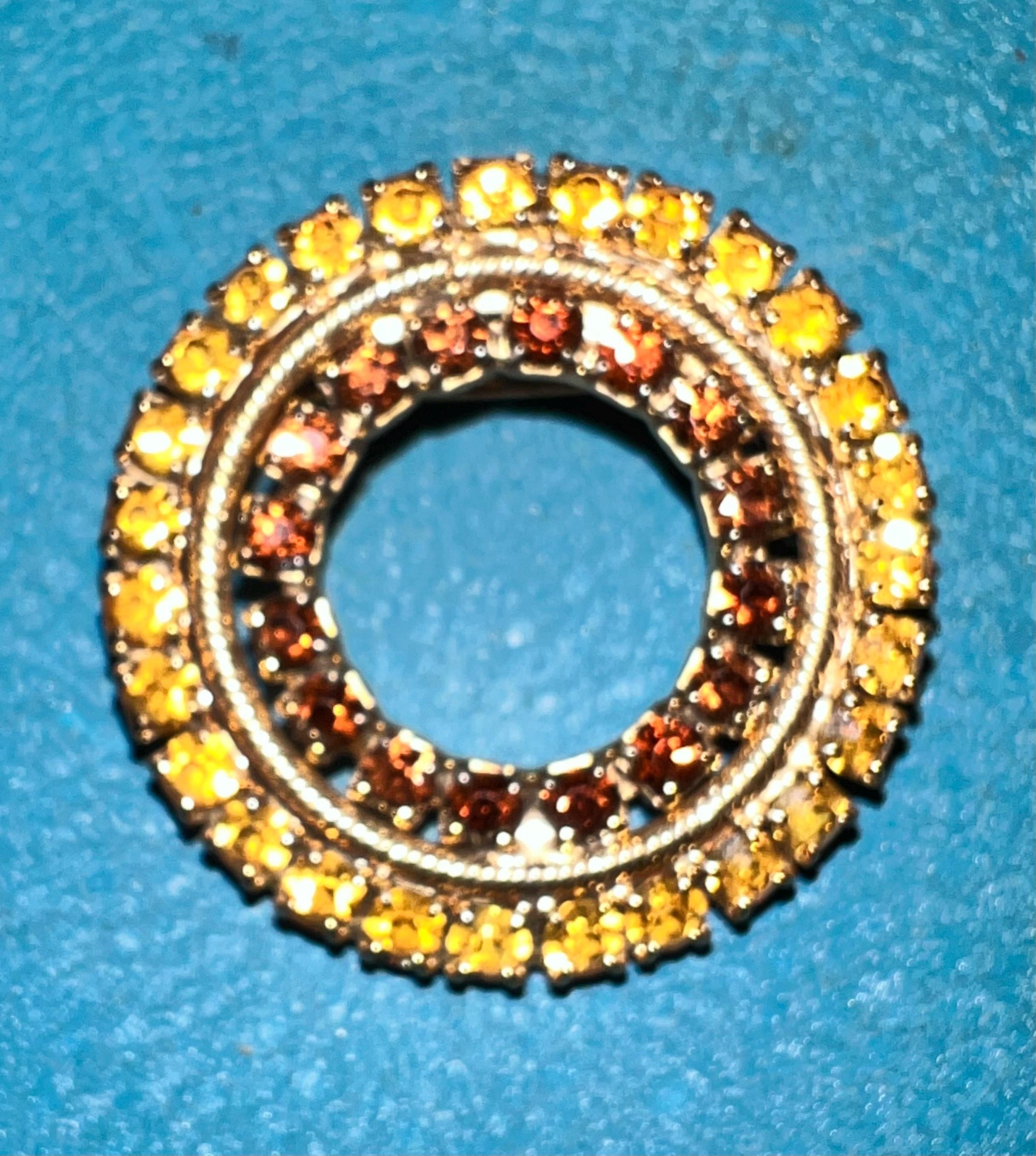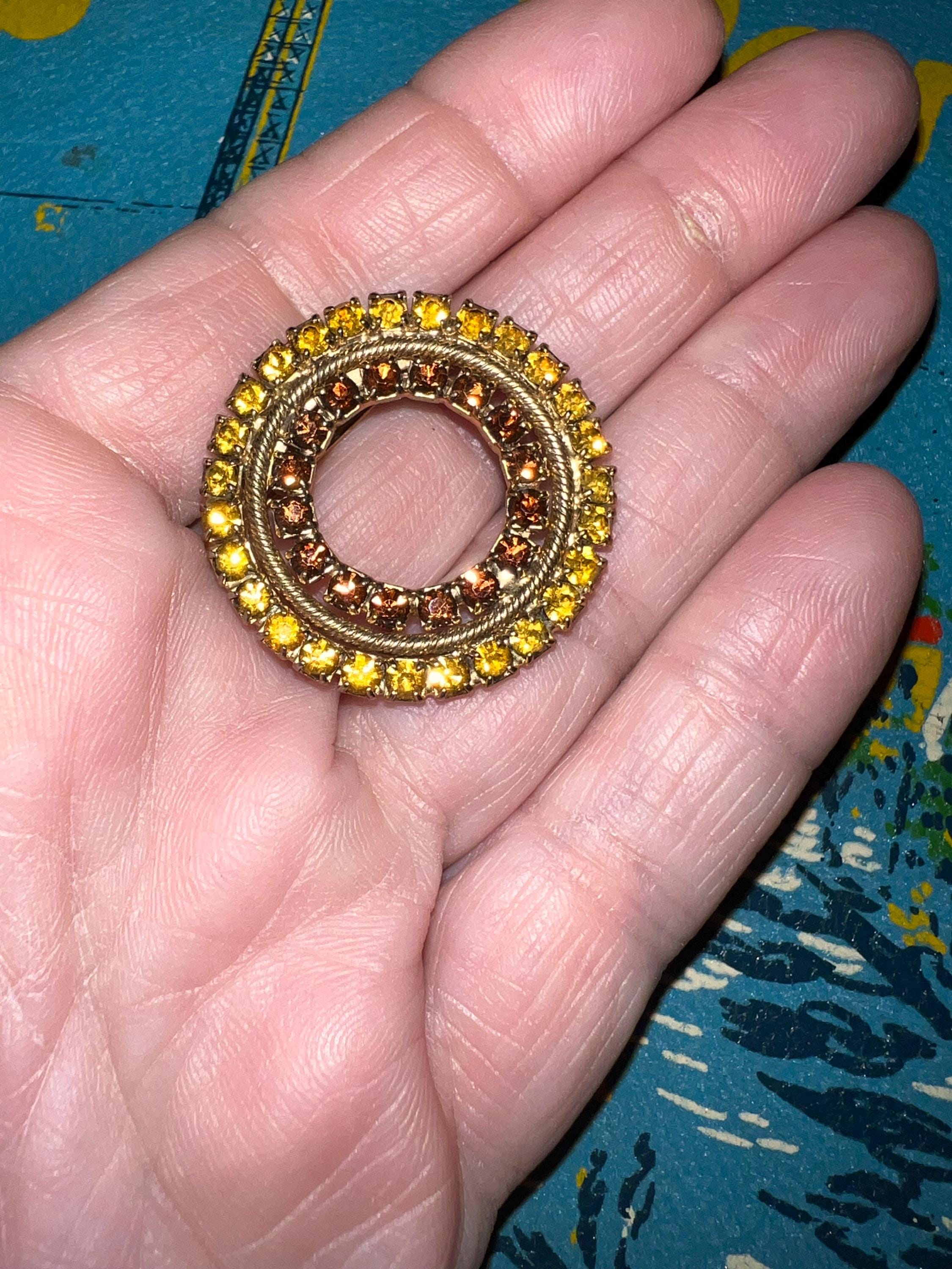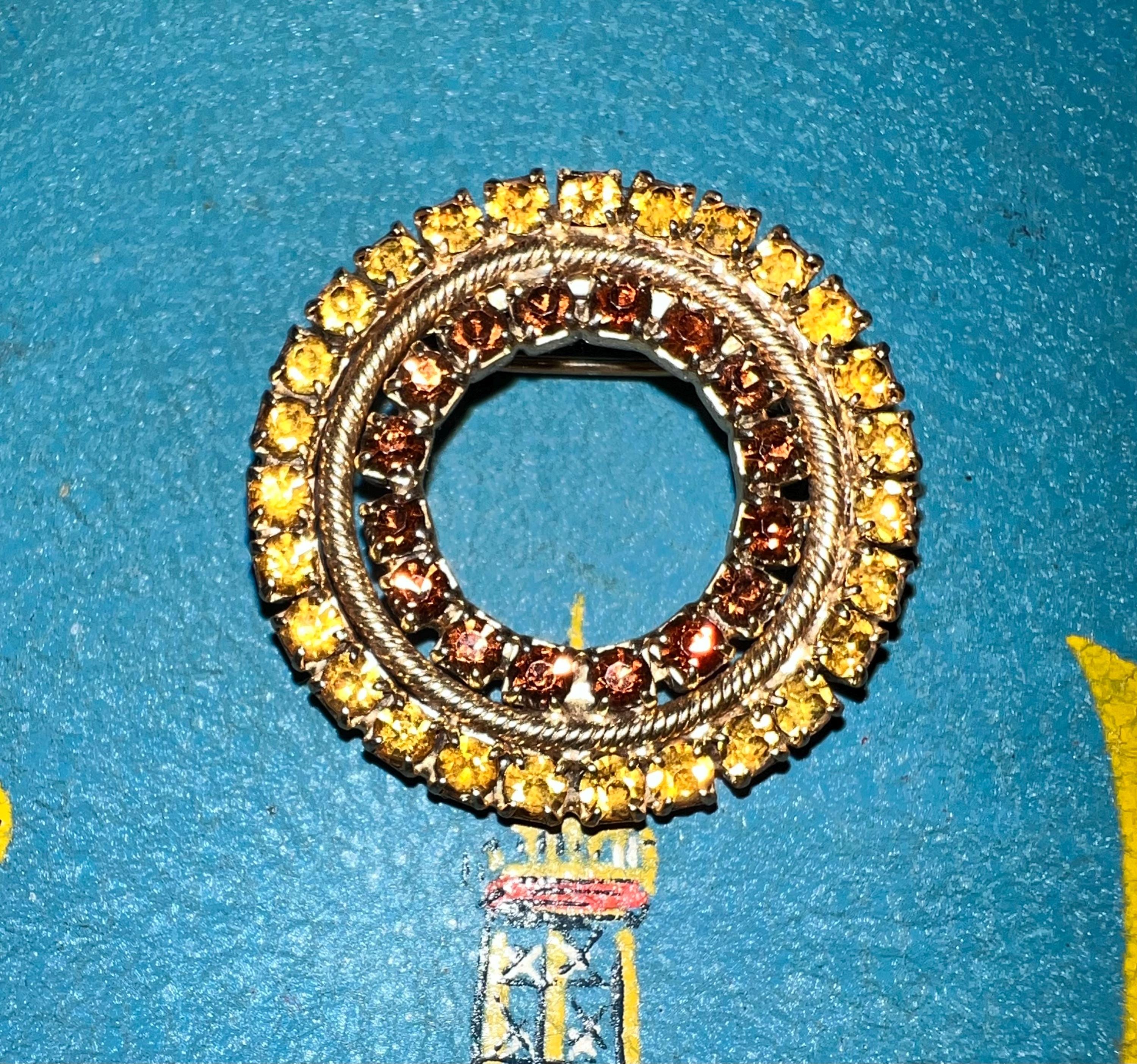 The gold and brown of the rhinestones make this a stunning piece. Its simple but sure makes a statement. It’s in very good vintage condition!