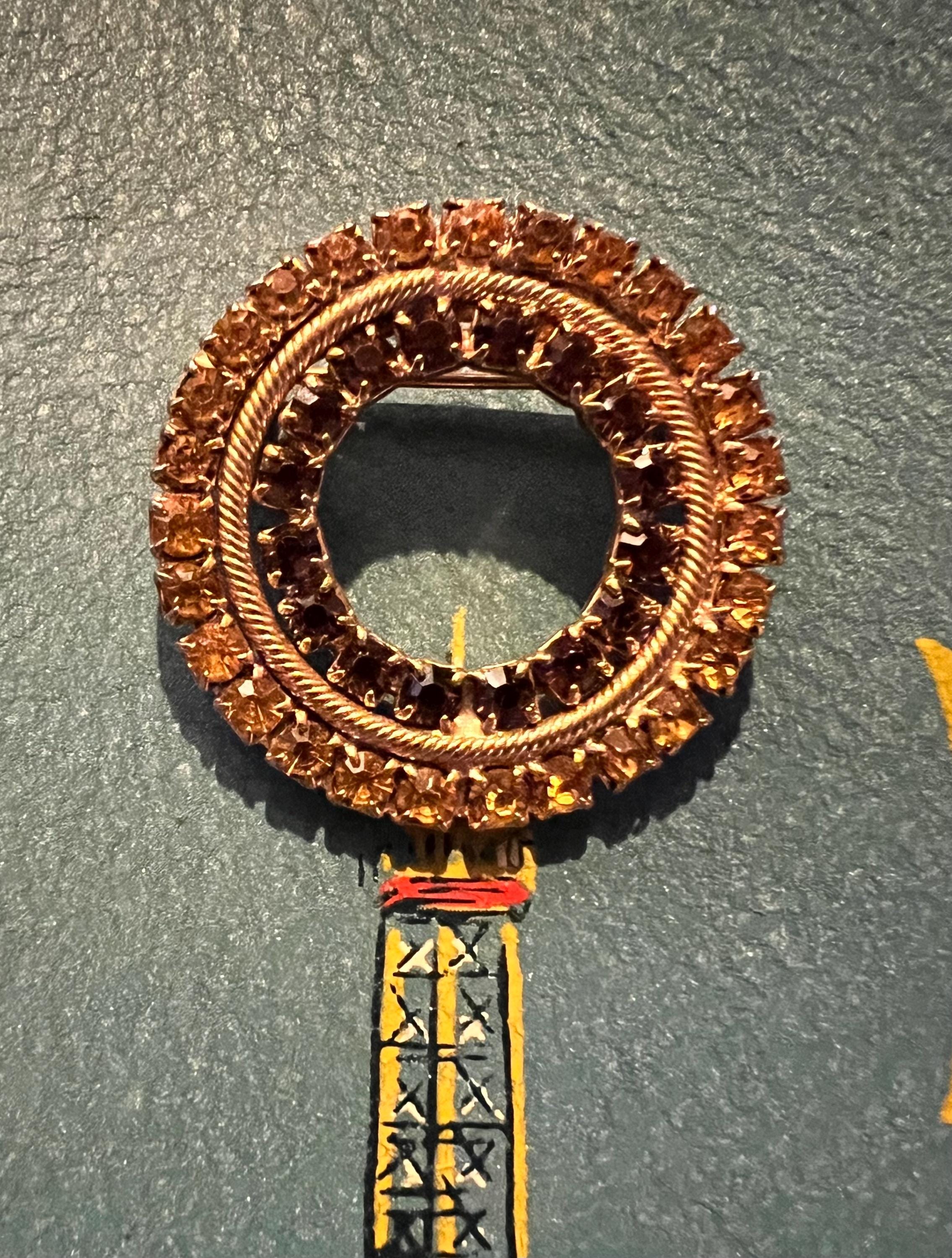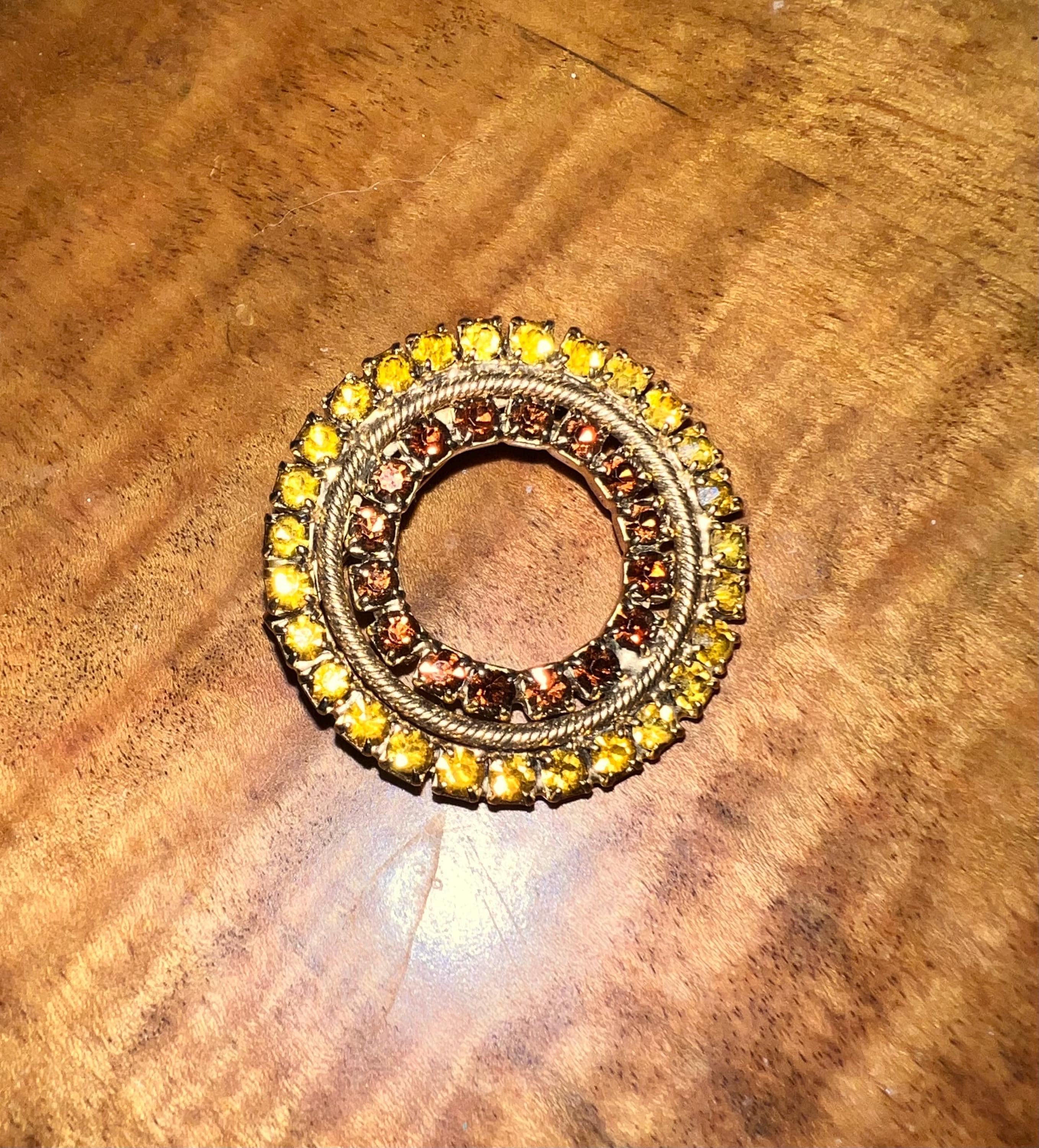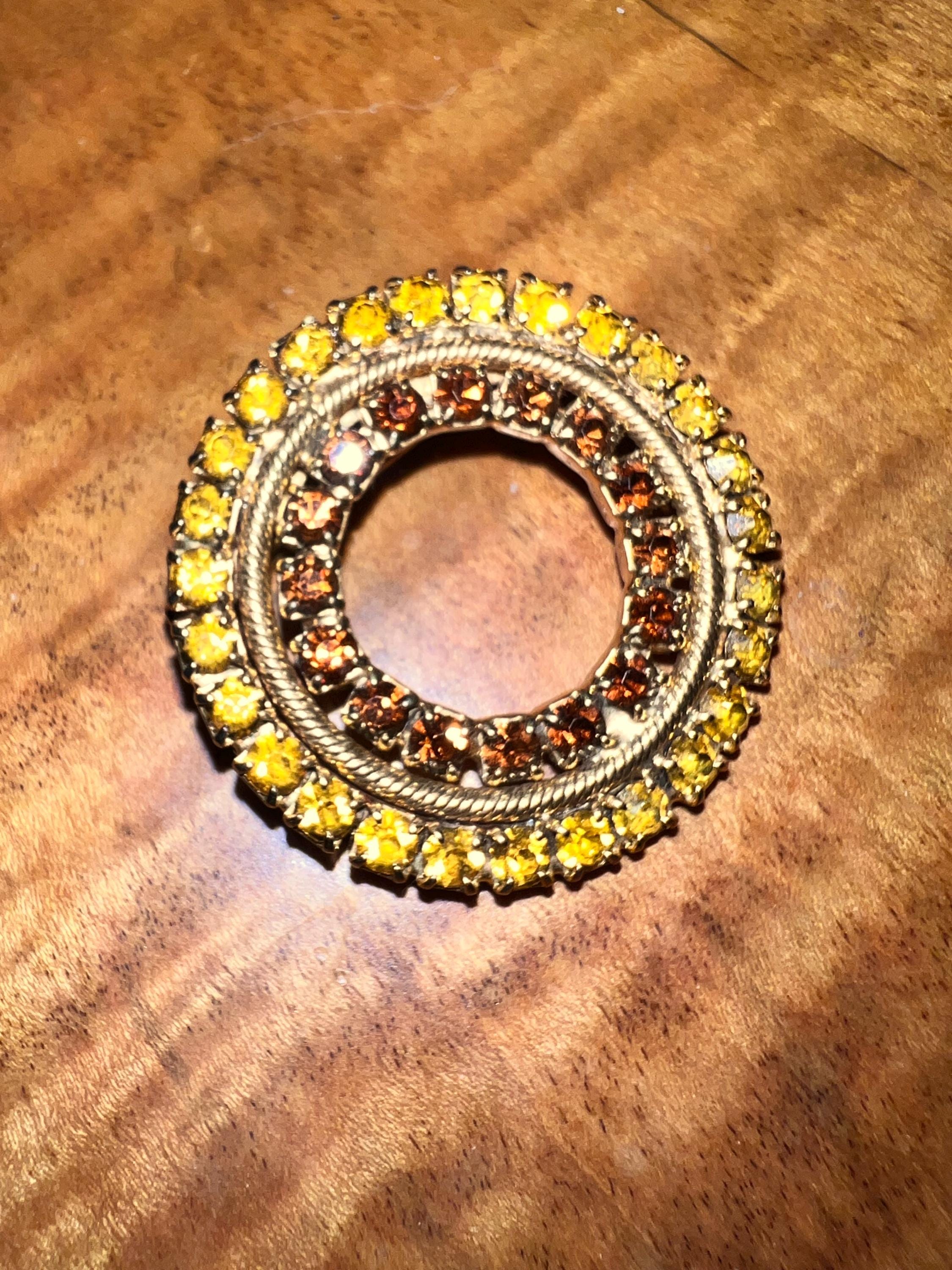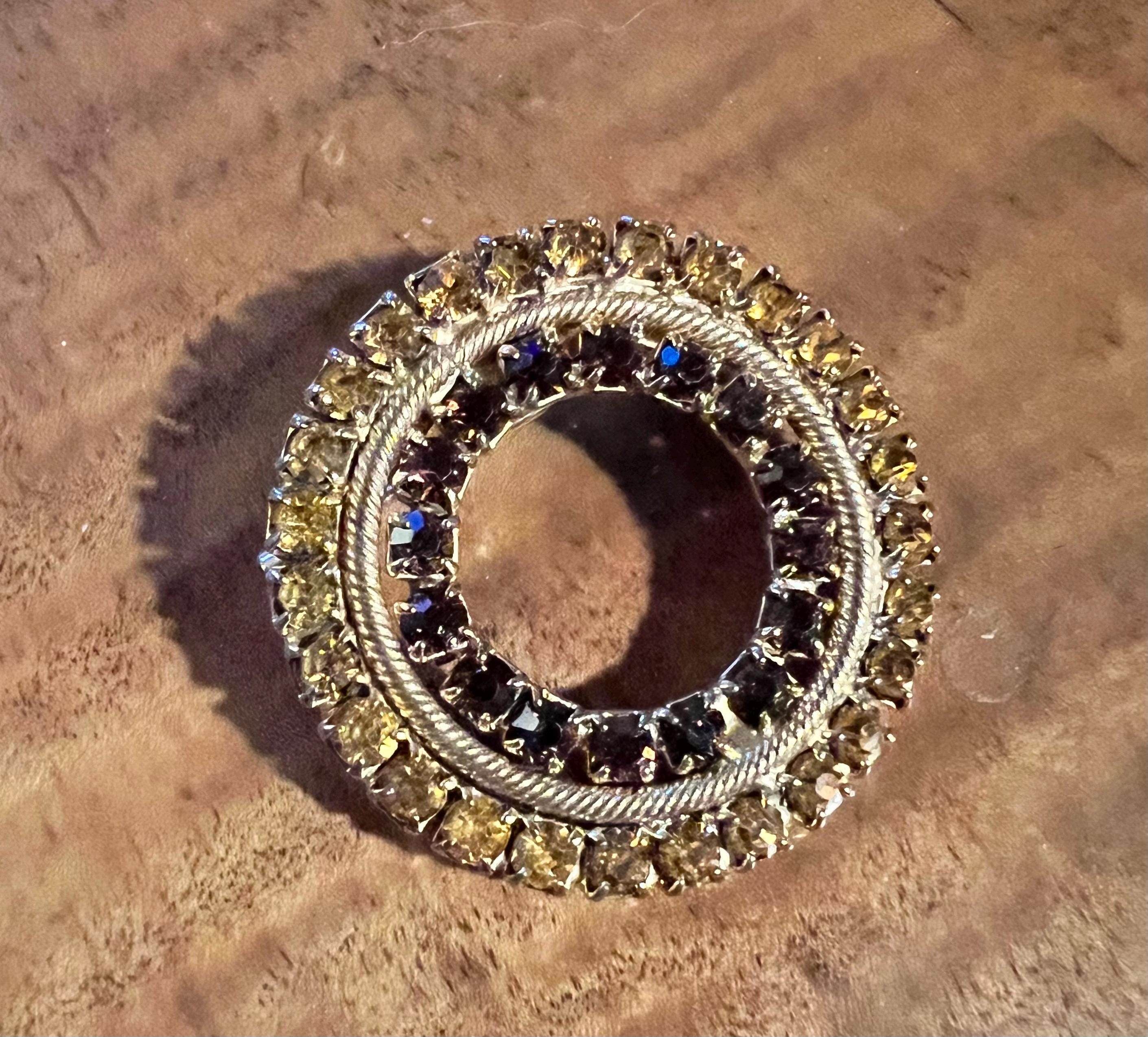 The gold and brown of the rhinestones make this a stunning piece. Its simple but sure makes a statement. It’s in very good vintage condition!