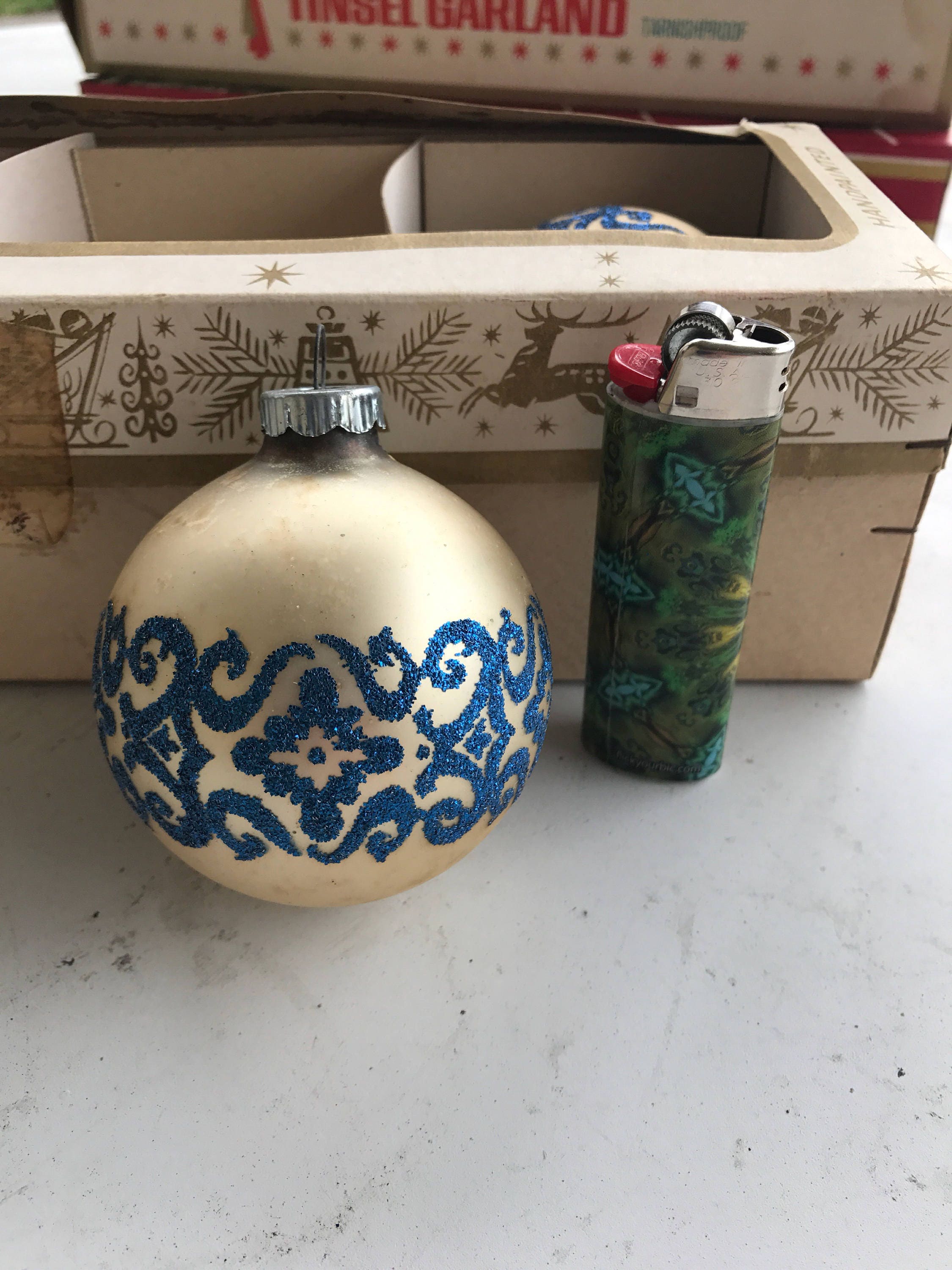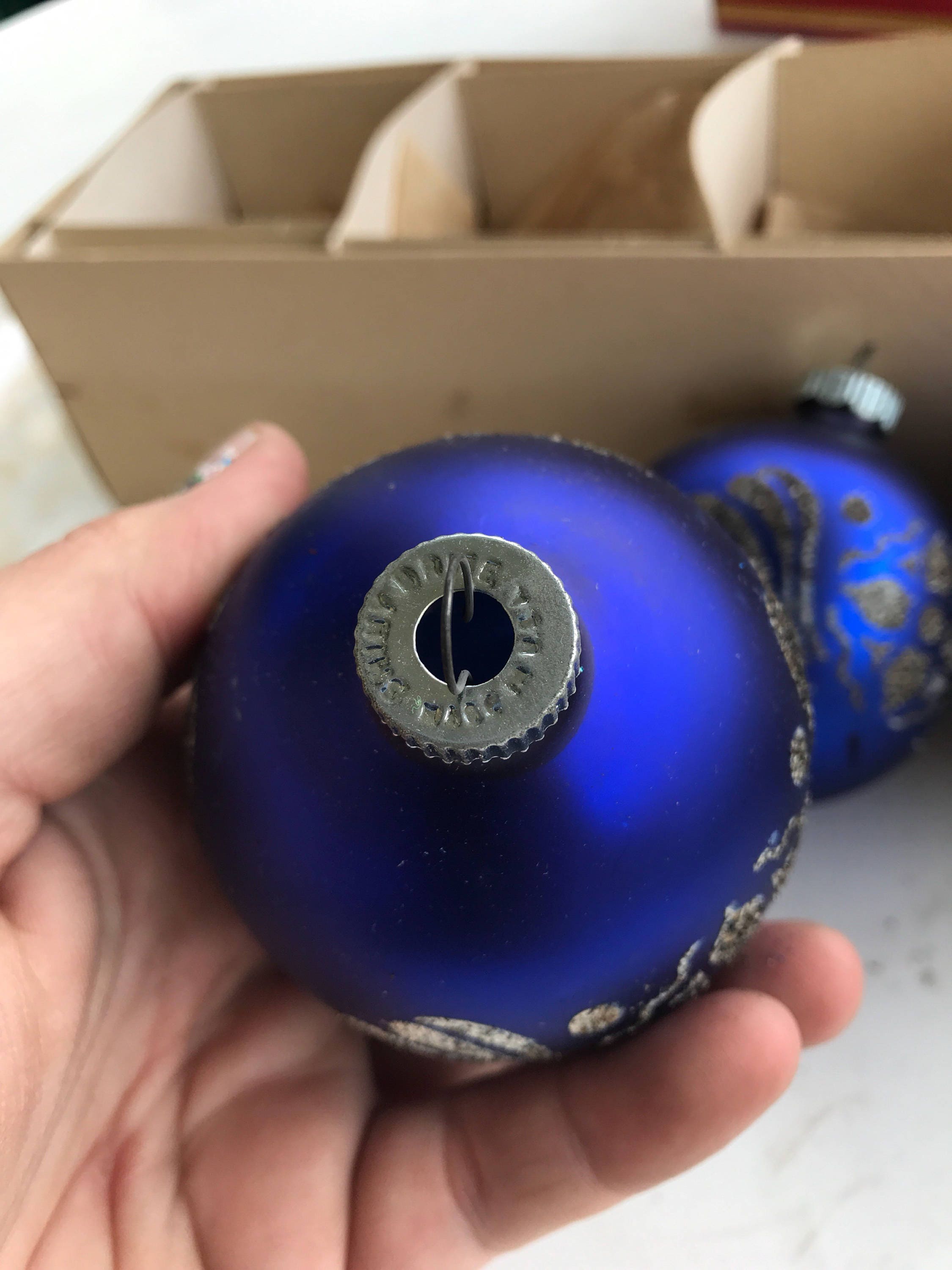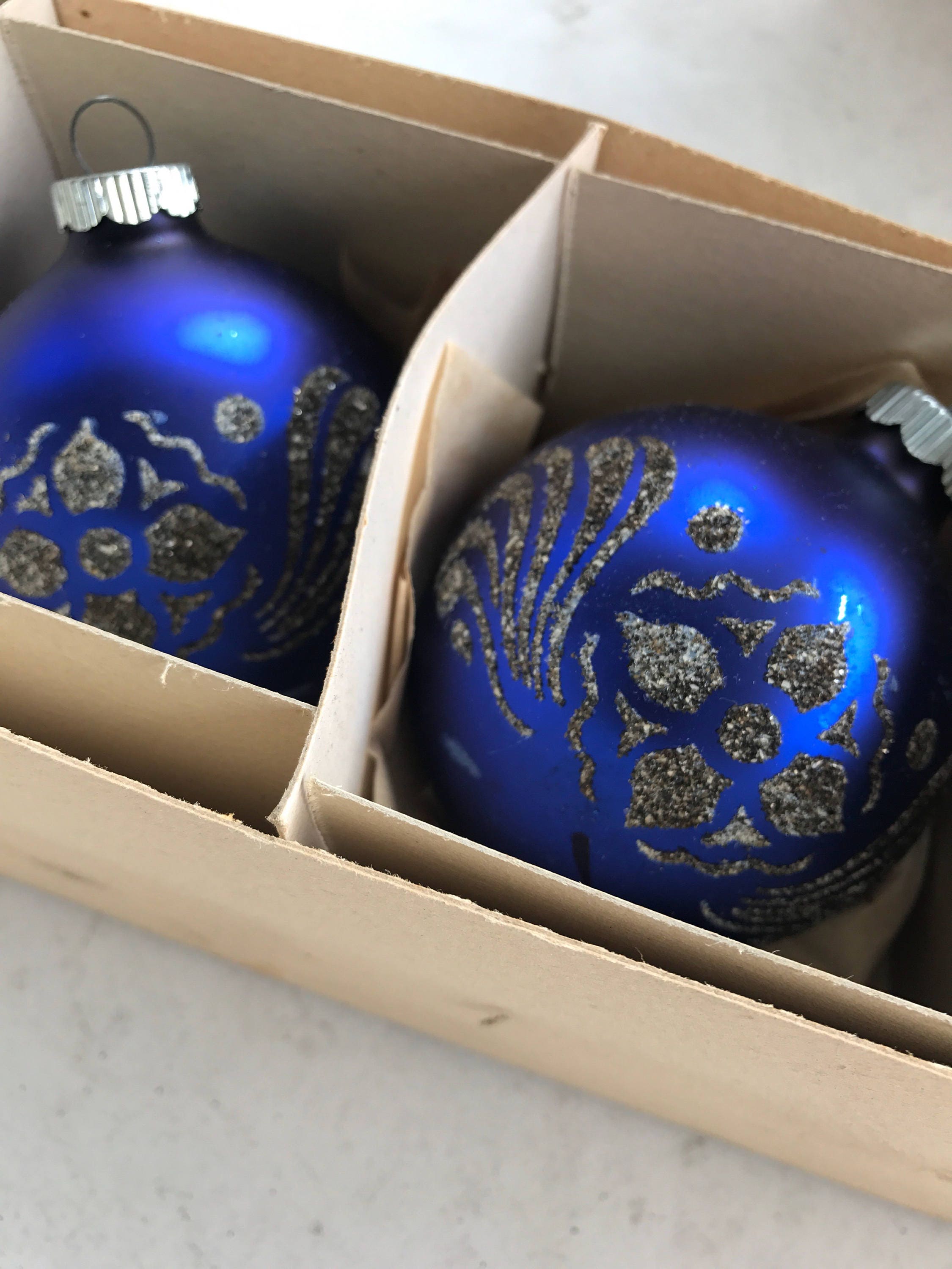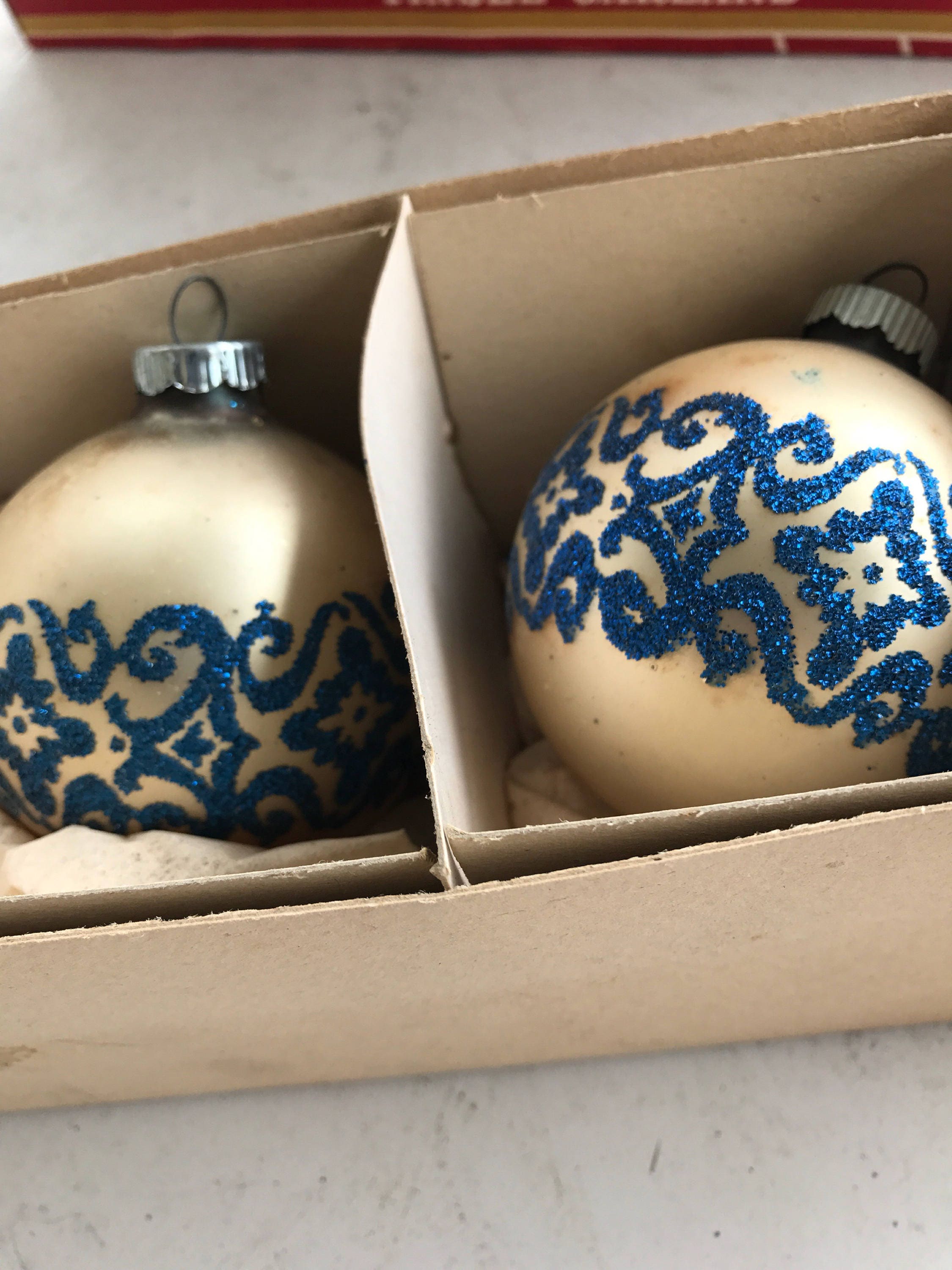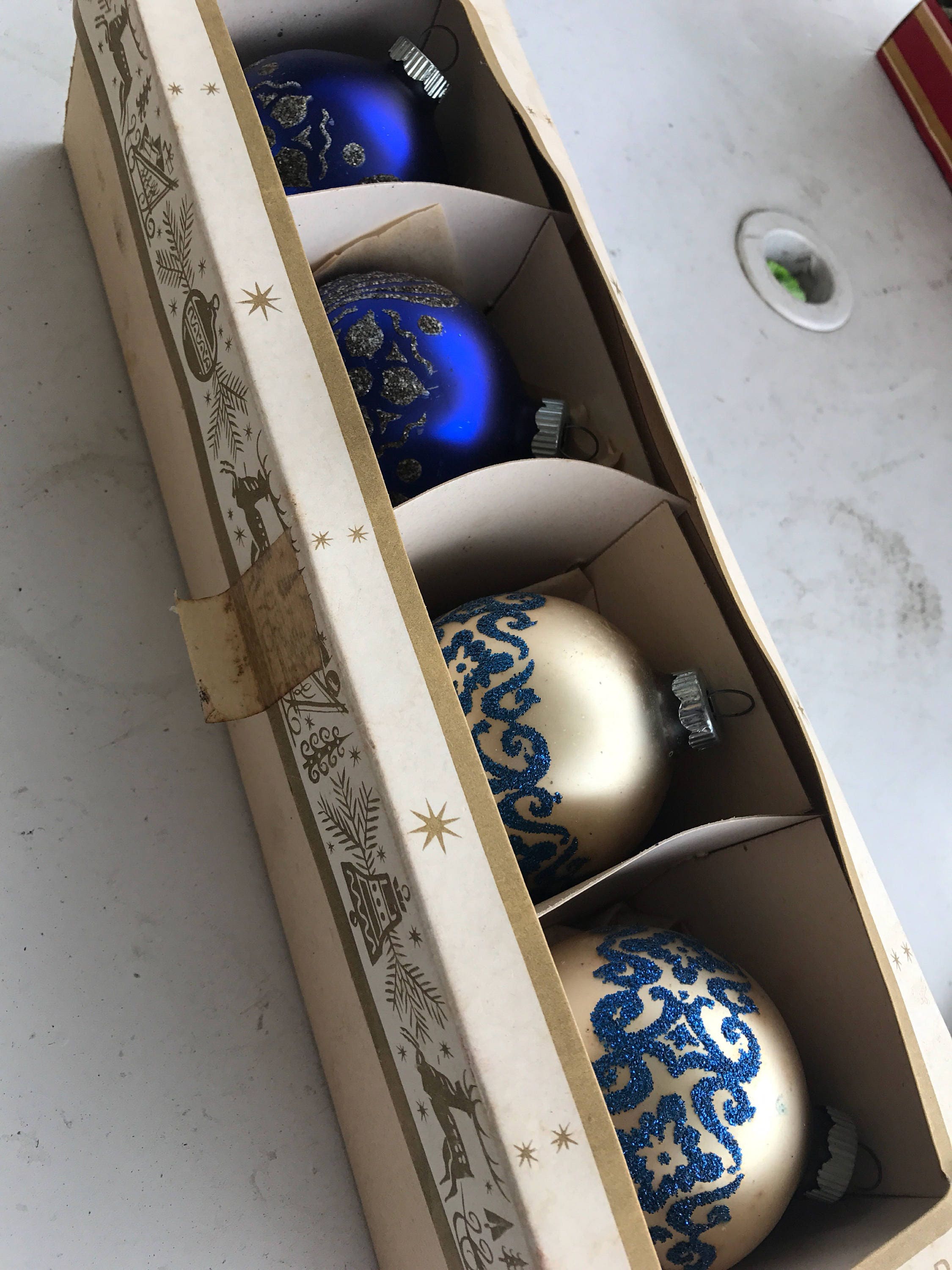 This is a lovely set of 4 large Shiny Brite ornaments in box. They are vintage so they've picked up a natural patina over the years as well as lost some of the glitter. I believe they can be cleaned up some but I'm leaving that up to their new owners!
