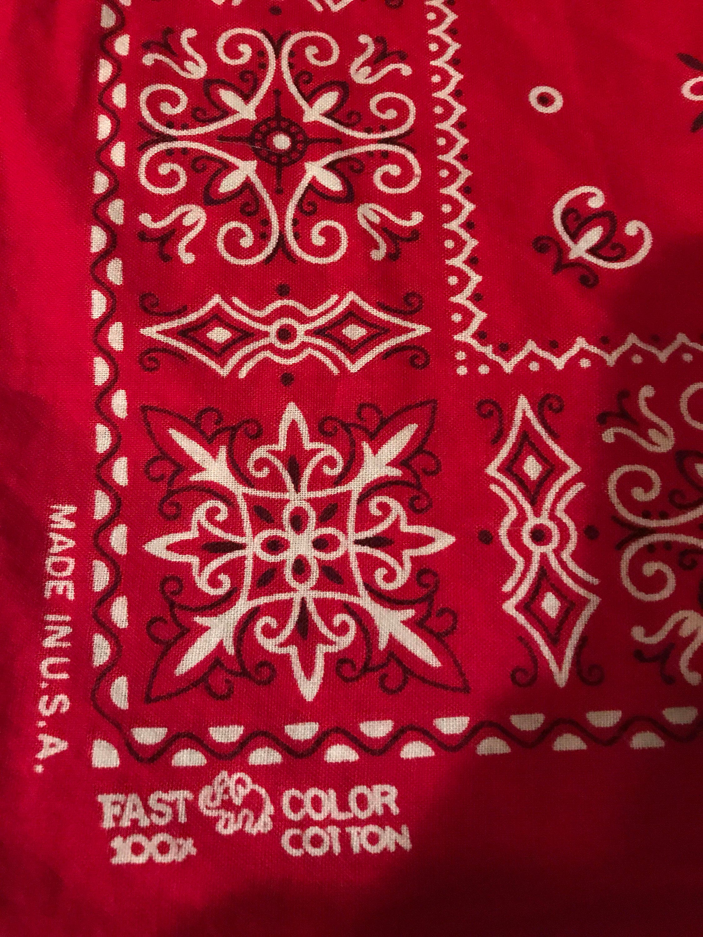I love this bandana! All Cotton Fastcolor Genuine Made in the USA, Crafted With Pride red and white bandana. It's so soft and worn in but in very good vintage condition. Wonderful pattern as well! We have three of these!