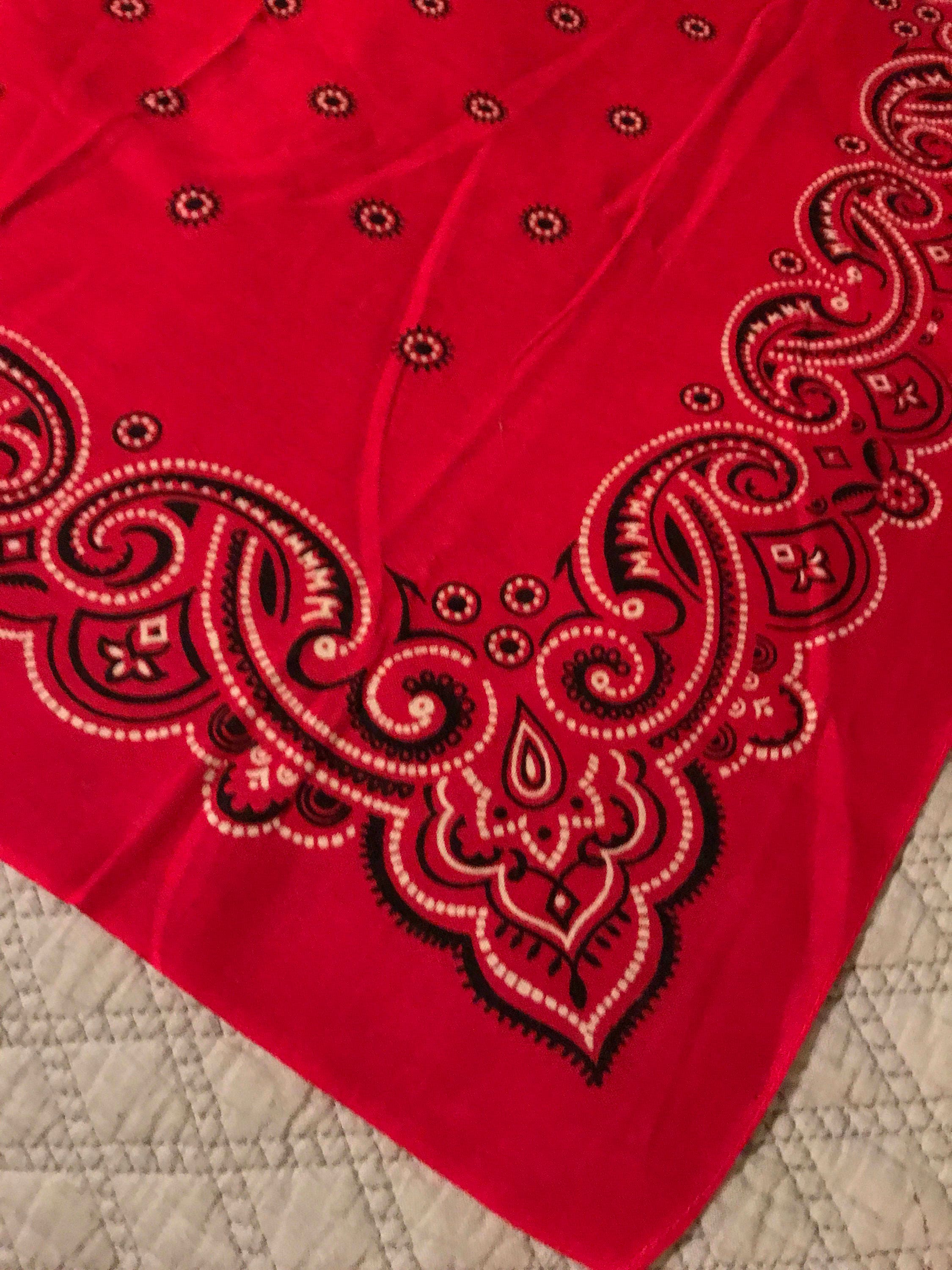 I love this bandana! All Cotton Washfast Colors Genuine, 100% Cotton red and white bandana. It's so soft and worn in but in good vintage condition. Wonderful pattern as well!