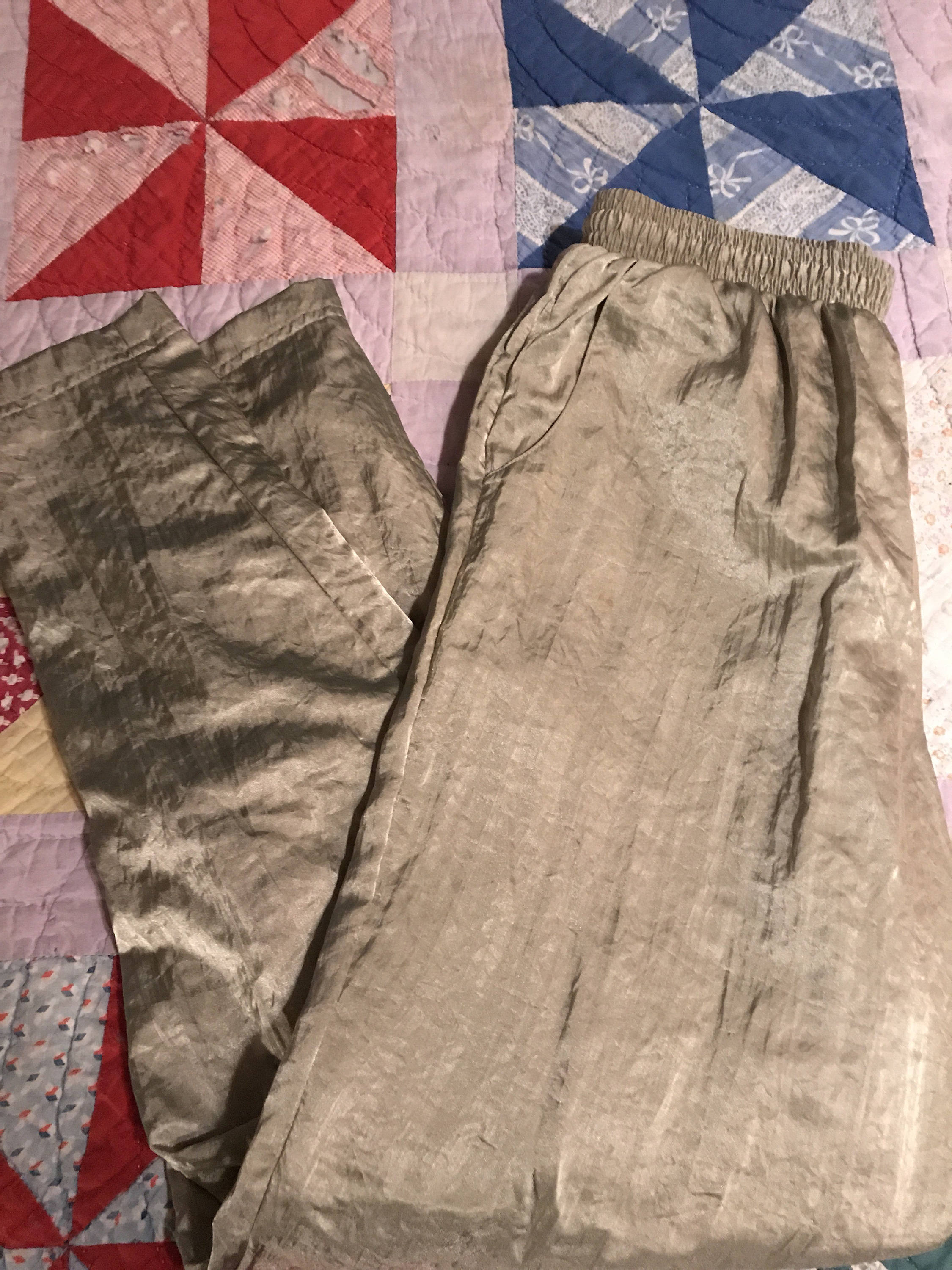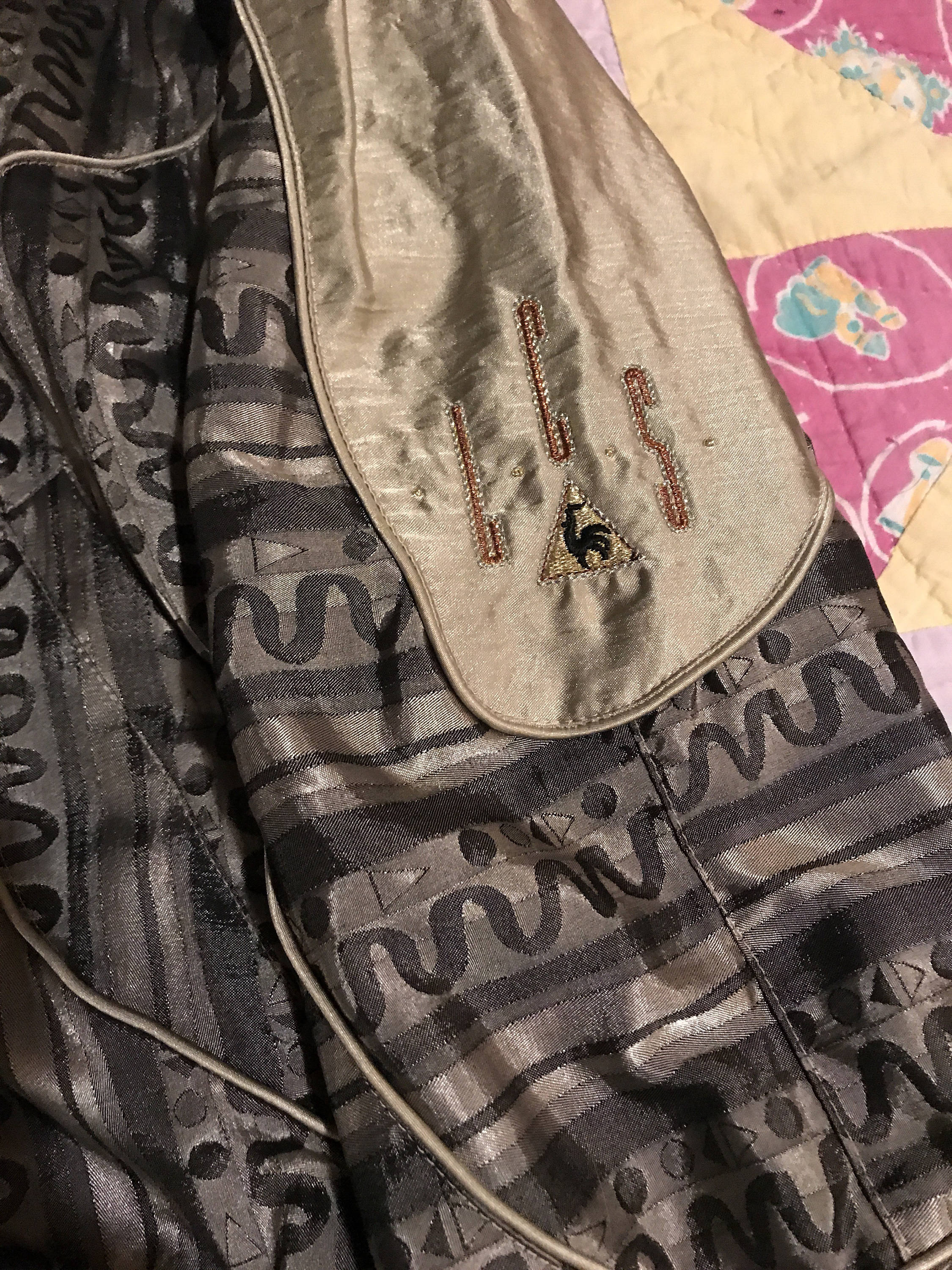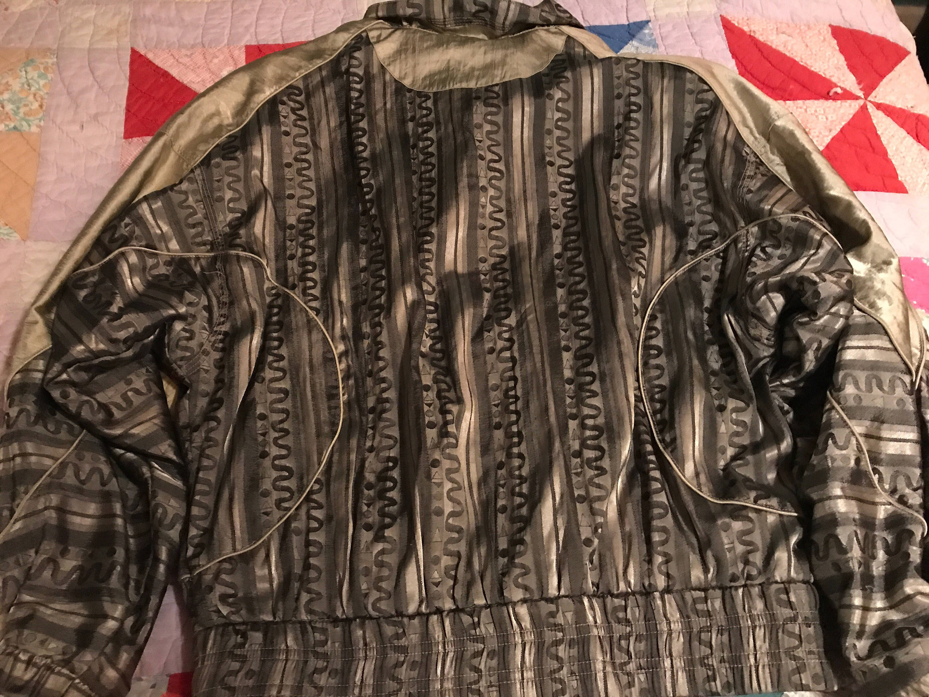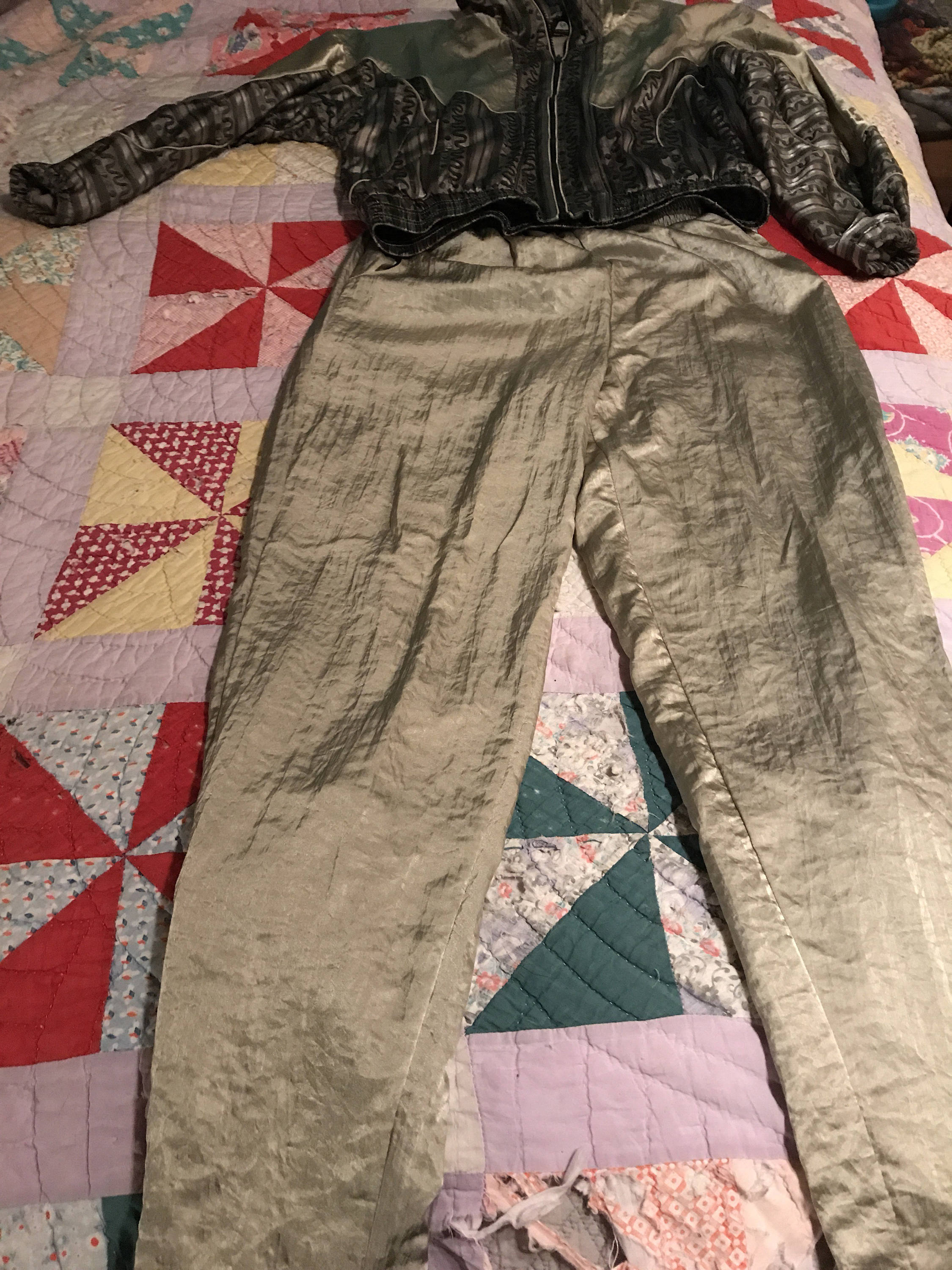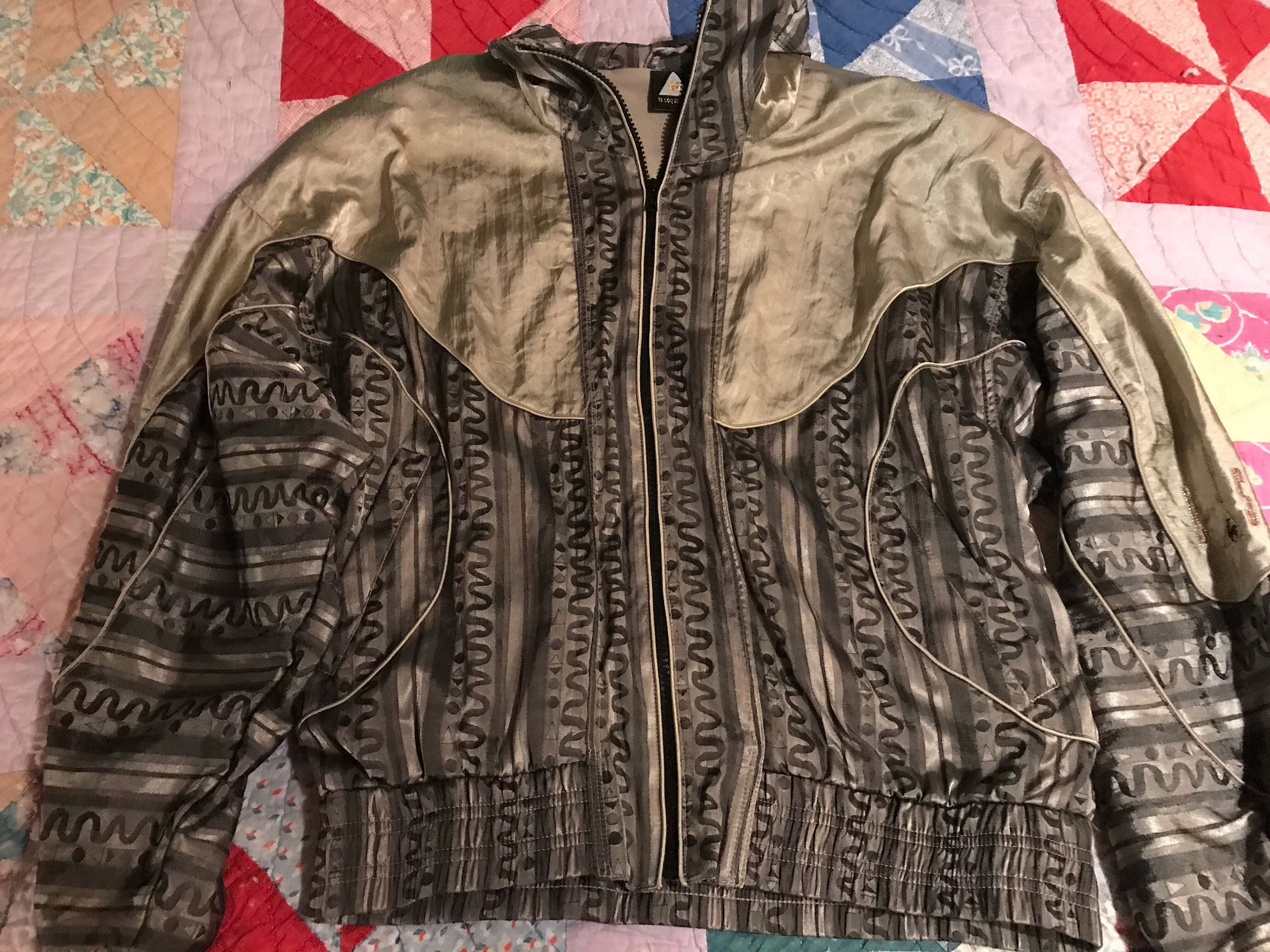 This is a super cool 80's silver and gray track suit. This is absolutely awesome! It is in great vintage condition. The pants have zippers at the bottom of each leg, the zipper on the jacket works Wells it’s very soft and shiny too! Removable shoulder pads