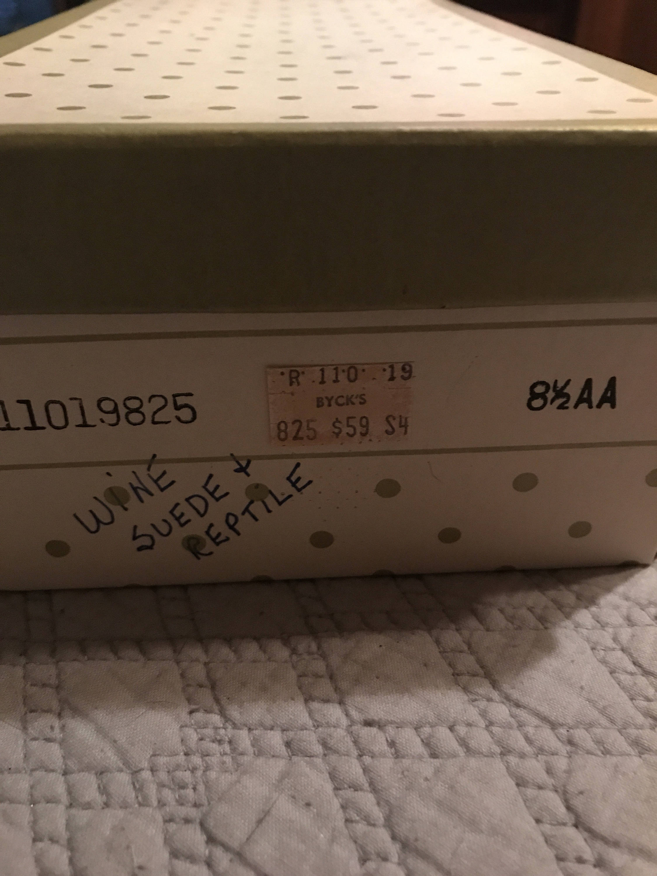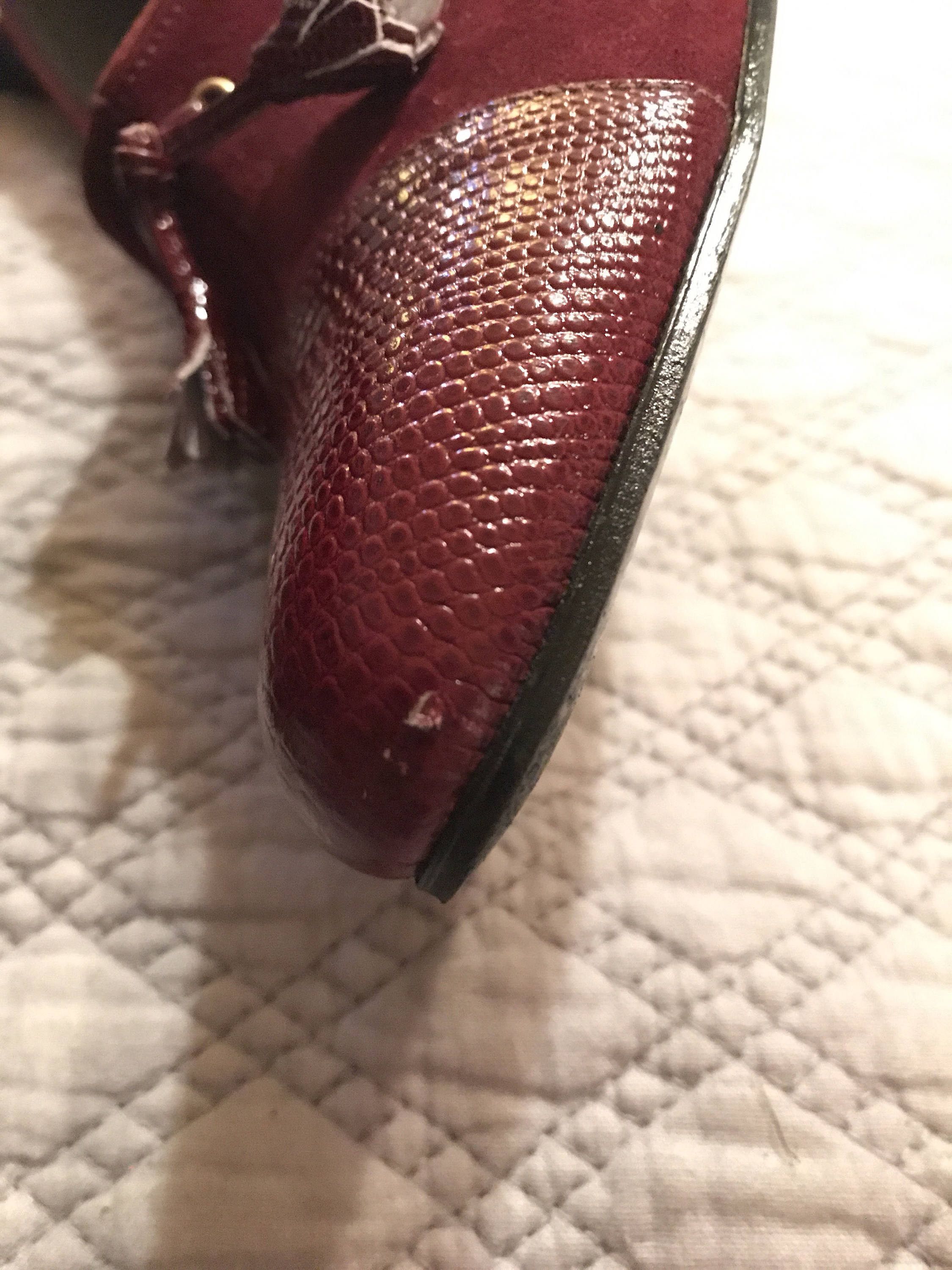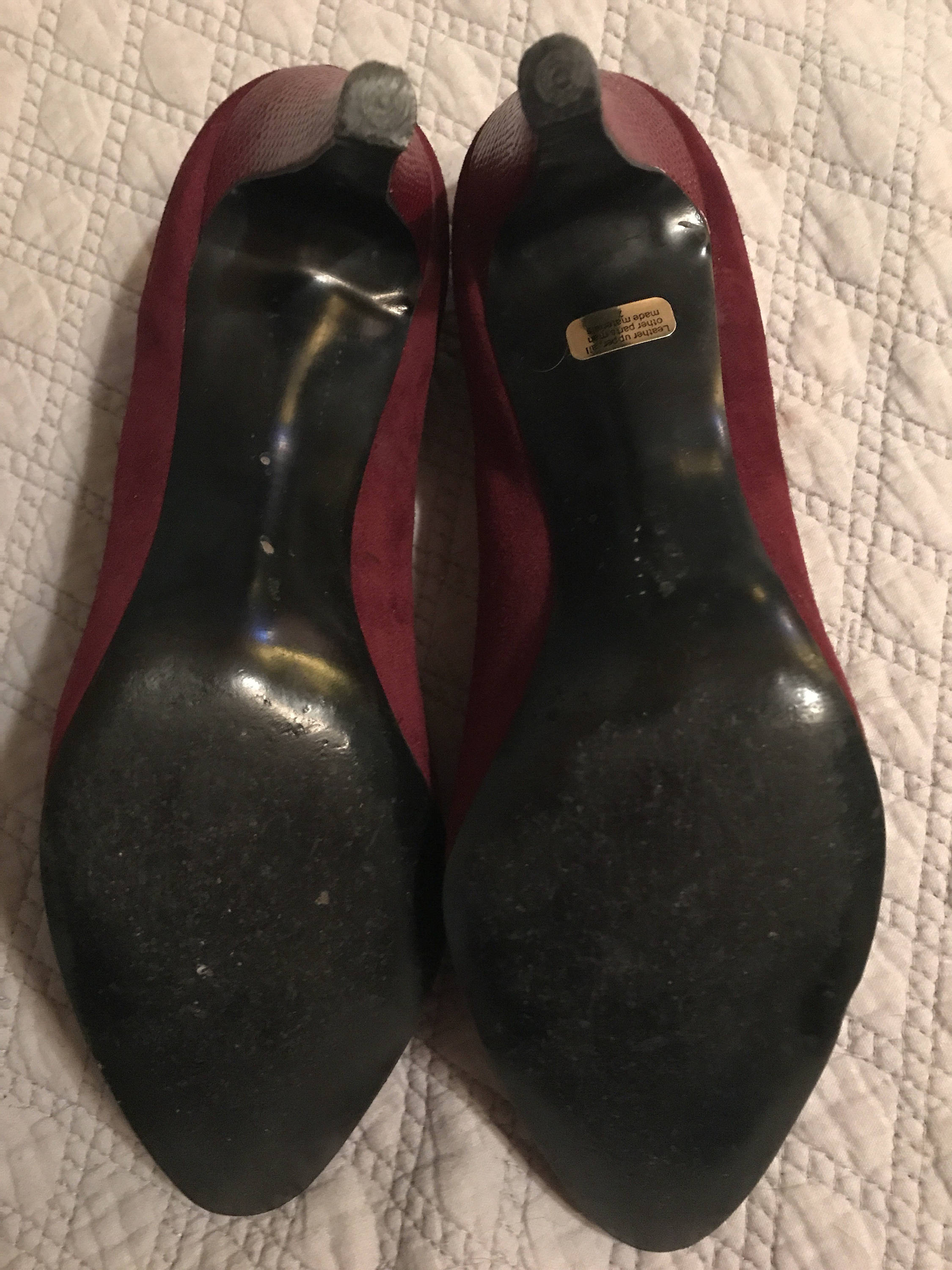 These red suede shoes are gorgeous! I’m in love with them. Just really pretty and they may be 50 years old they look as if they just stepped from a magazine. They are in good vintage condition, one tiny little nick on the toe of the left shoe, (see last photo). They are a dark deep red suede leather toe and heel. I love the looks of these heels.