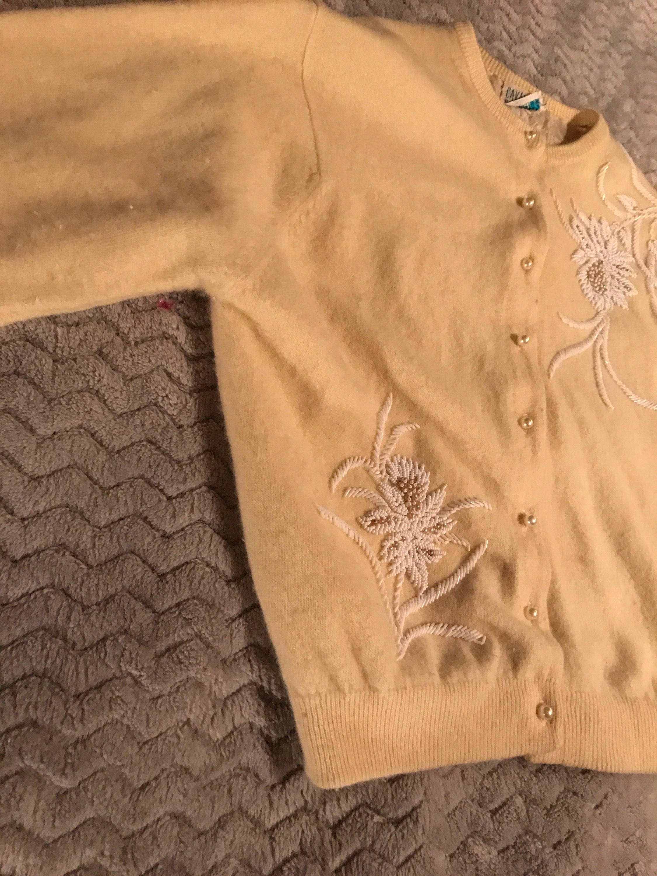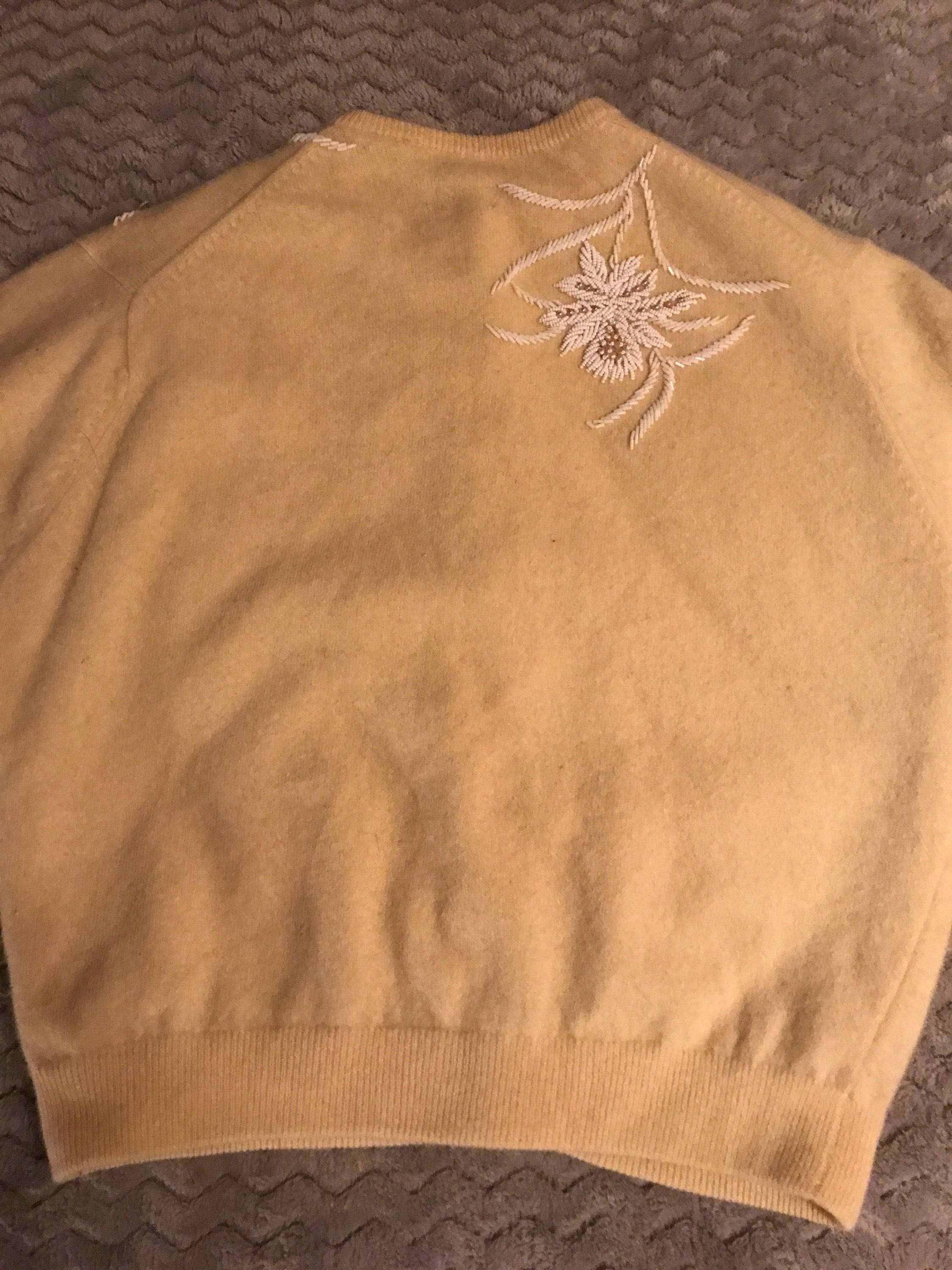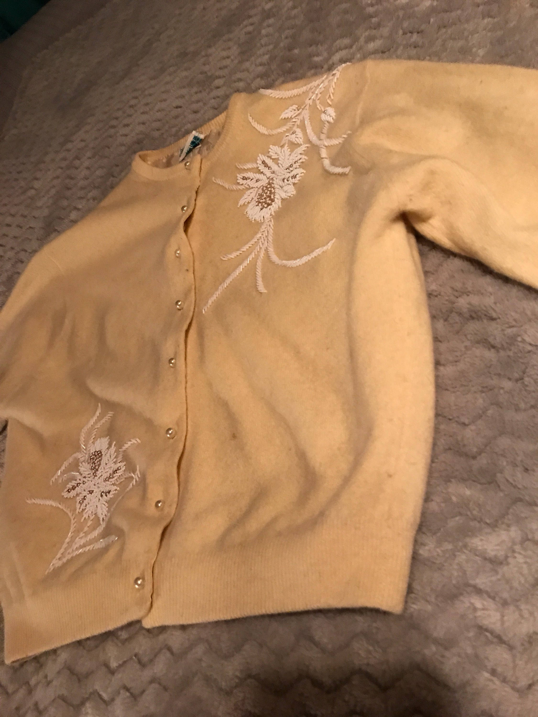 This is a gorgeous 1950's sweater! Embellished with beautiful pearls and white beads. It's a beautiful off white color with satin lining. There is no size tag, but it is quite small. It’s in fair vintage condition, the last photos show 3 tiny holes and a smudge on the sweater. Not a deal breaker but it could be better! Price is reflective of condition.